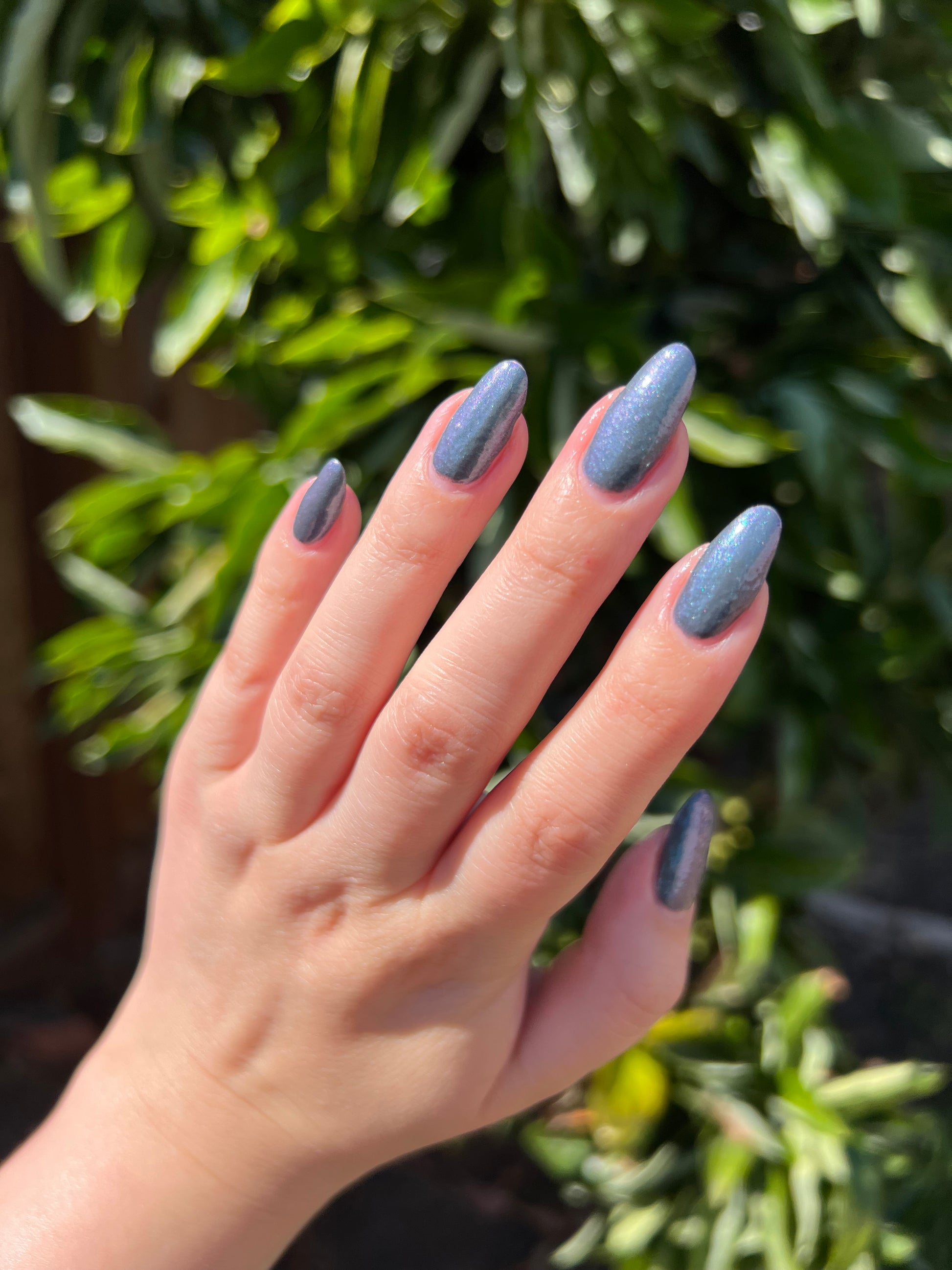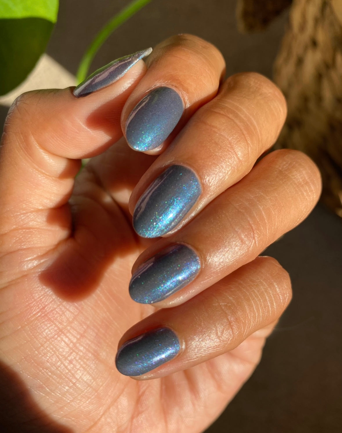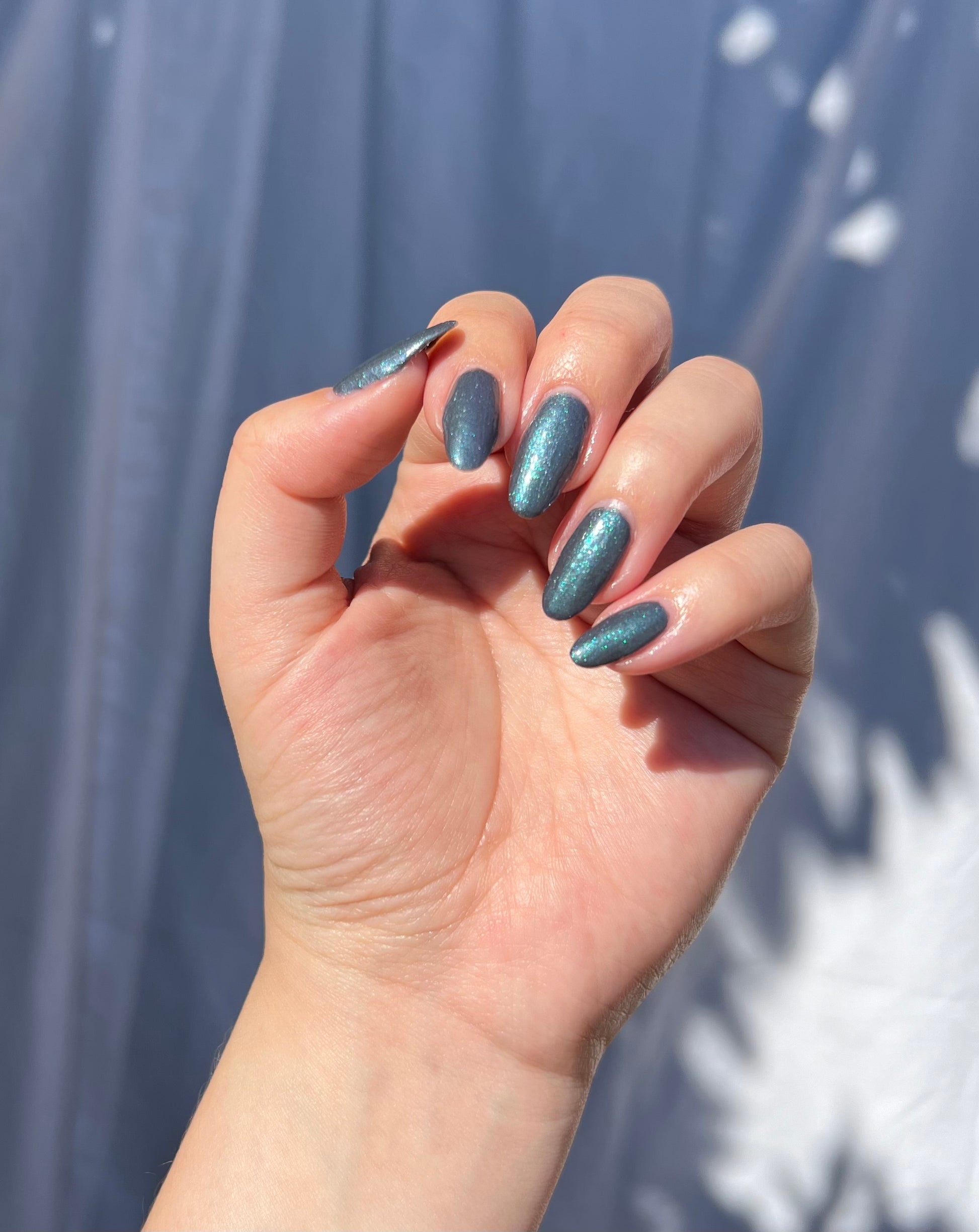 Another Day In The PNW is a dusky deep slate blue with green shimmers. This shade will transport you into an enchanted rainforest. The green shimmers are sure to have you mesmerized.