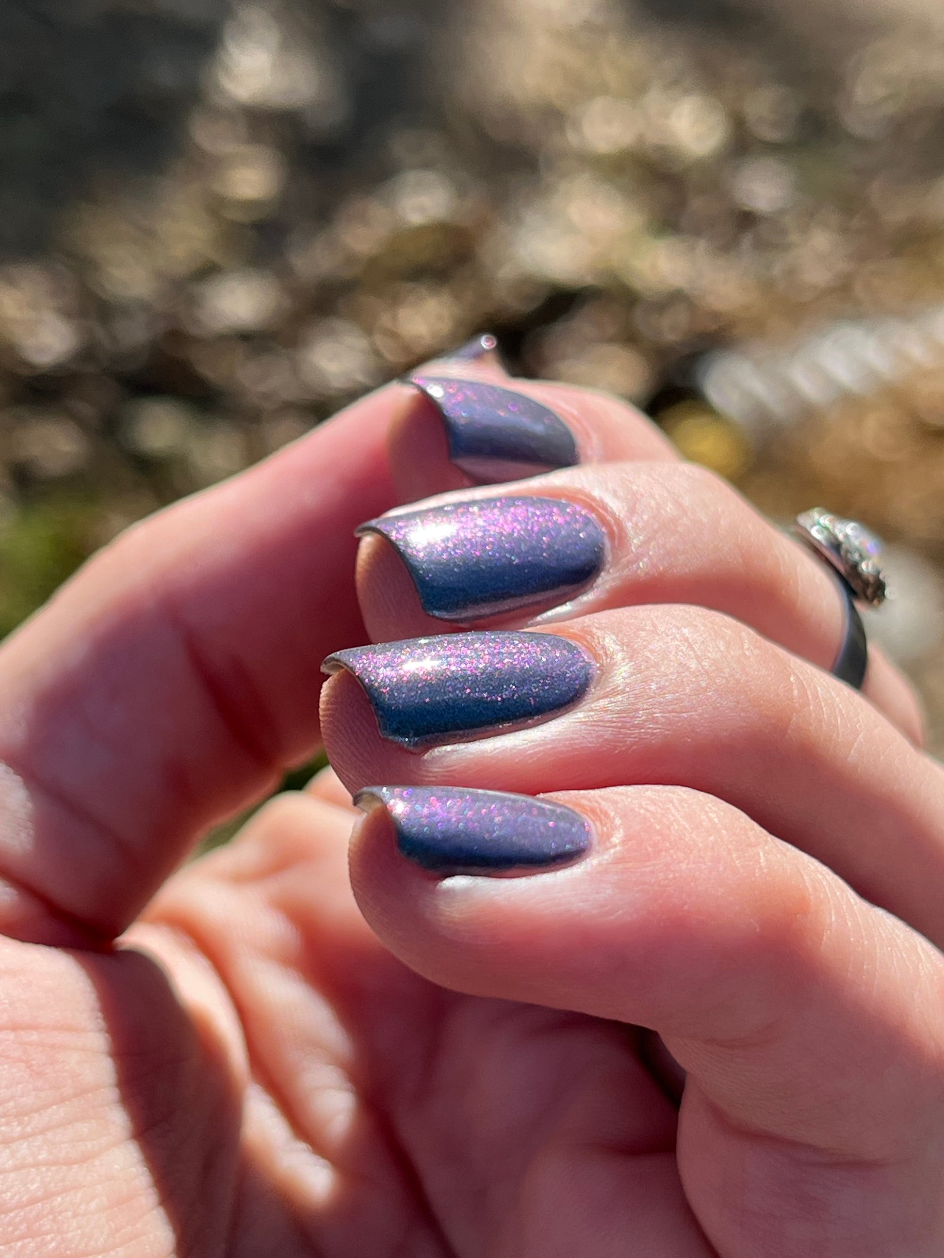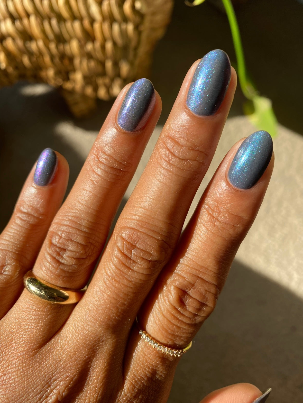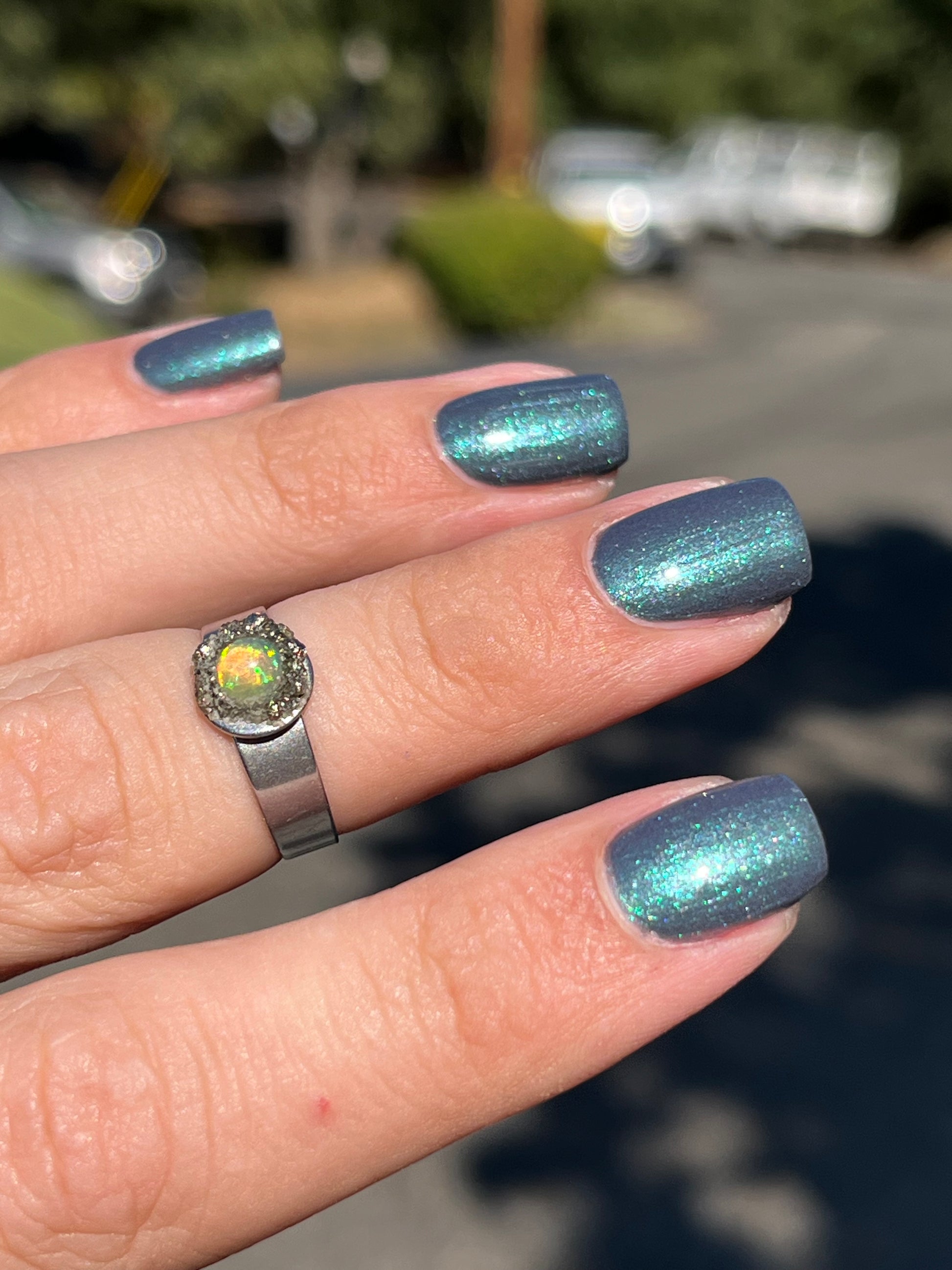 Another Day In The PNW is a dusky deep slate blue with green shimmers. This shade will transport you into an enchanted rainforest. The green shimmers are sure to have you mesmerized.