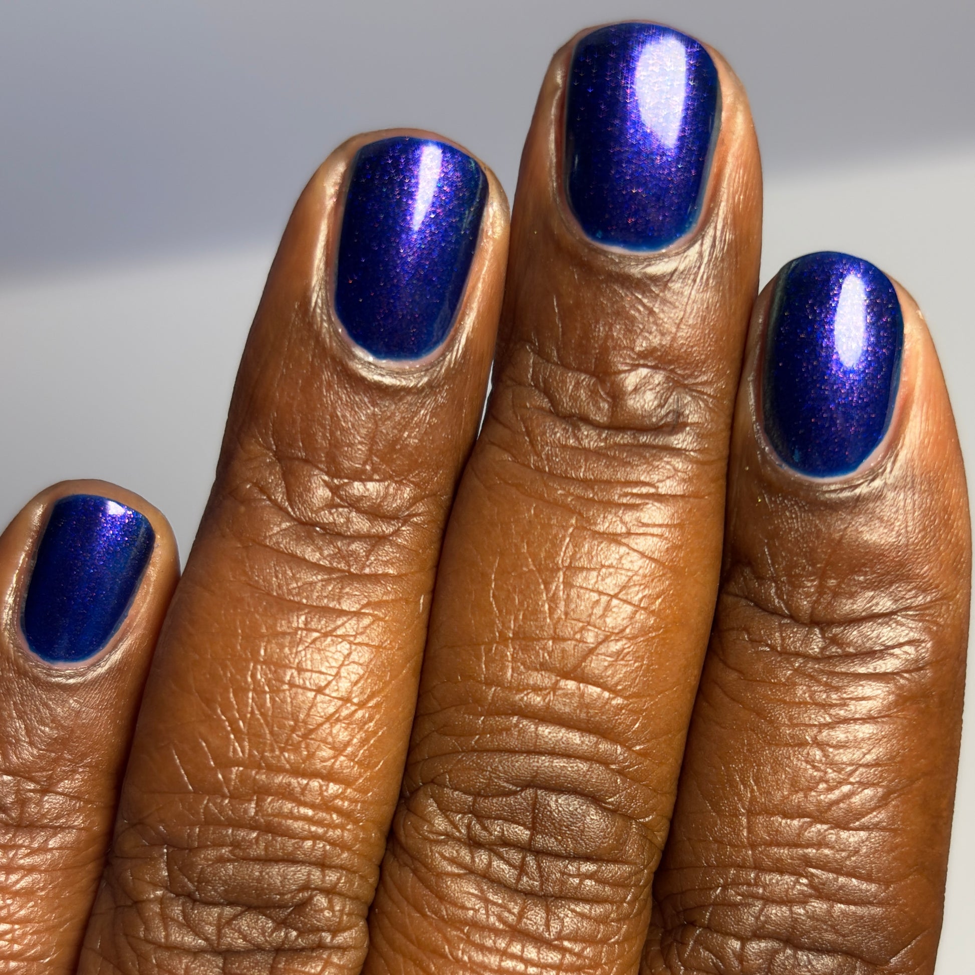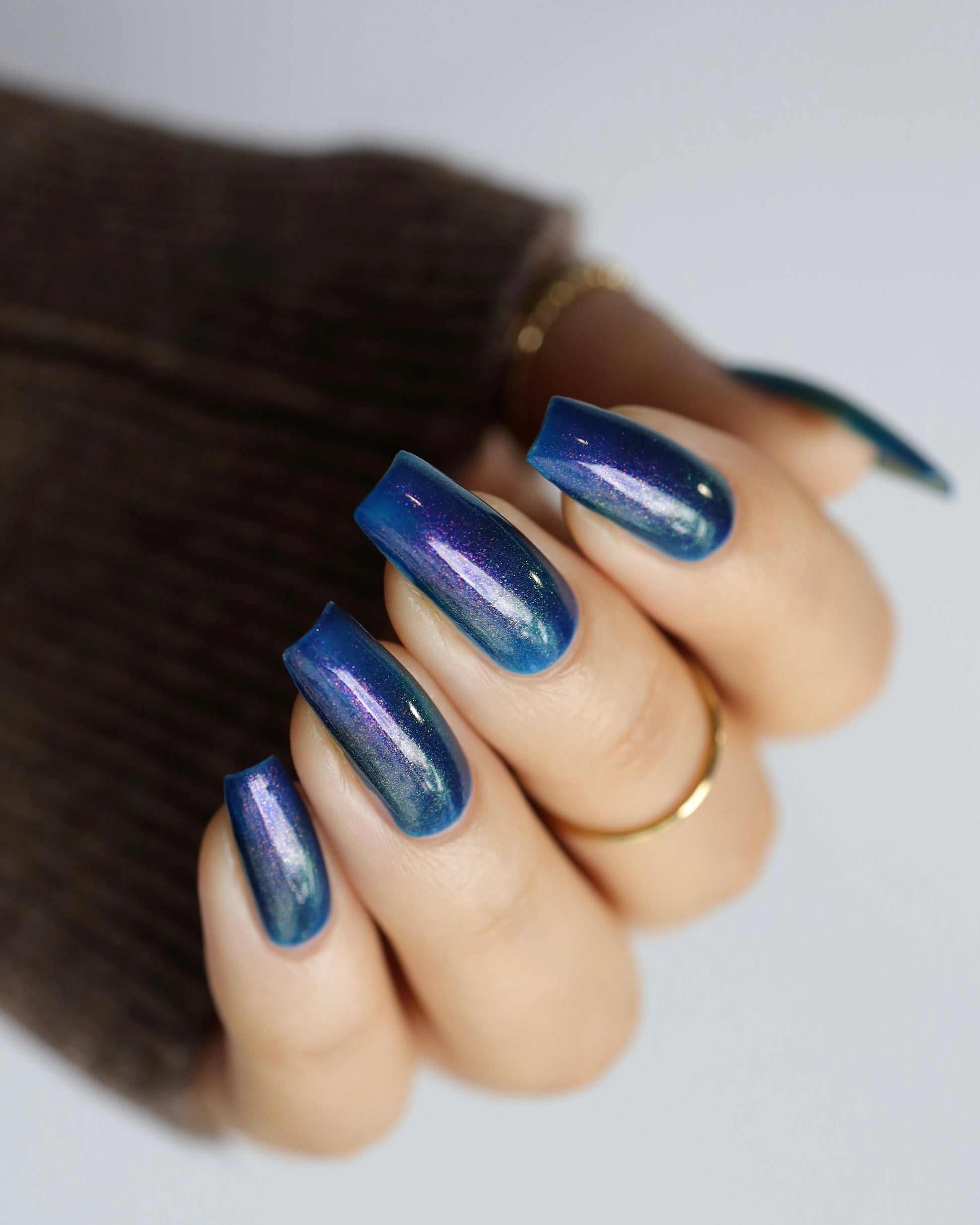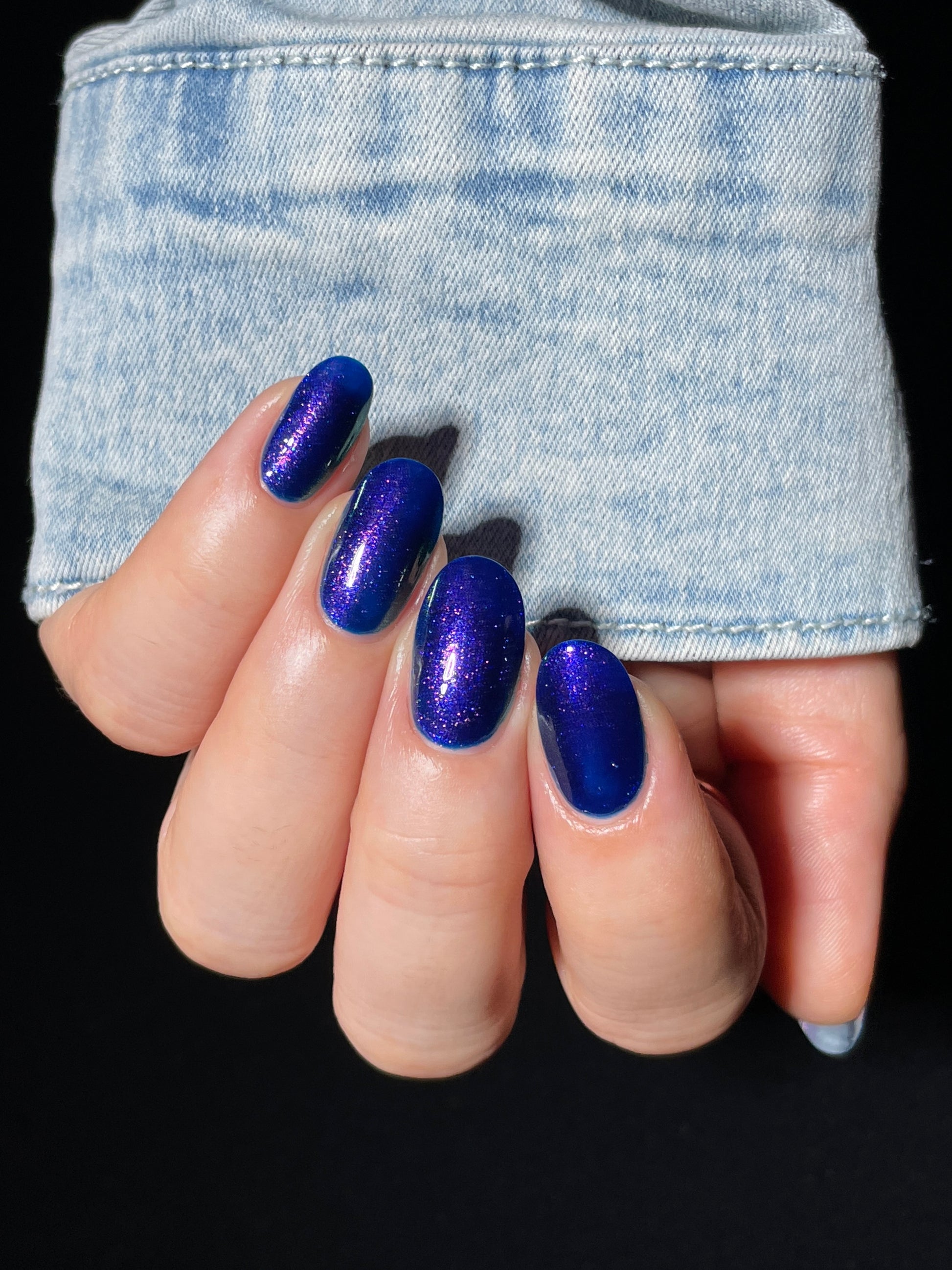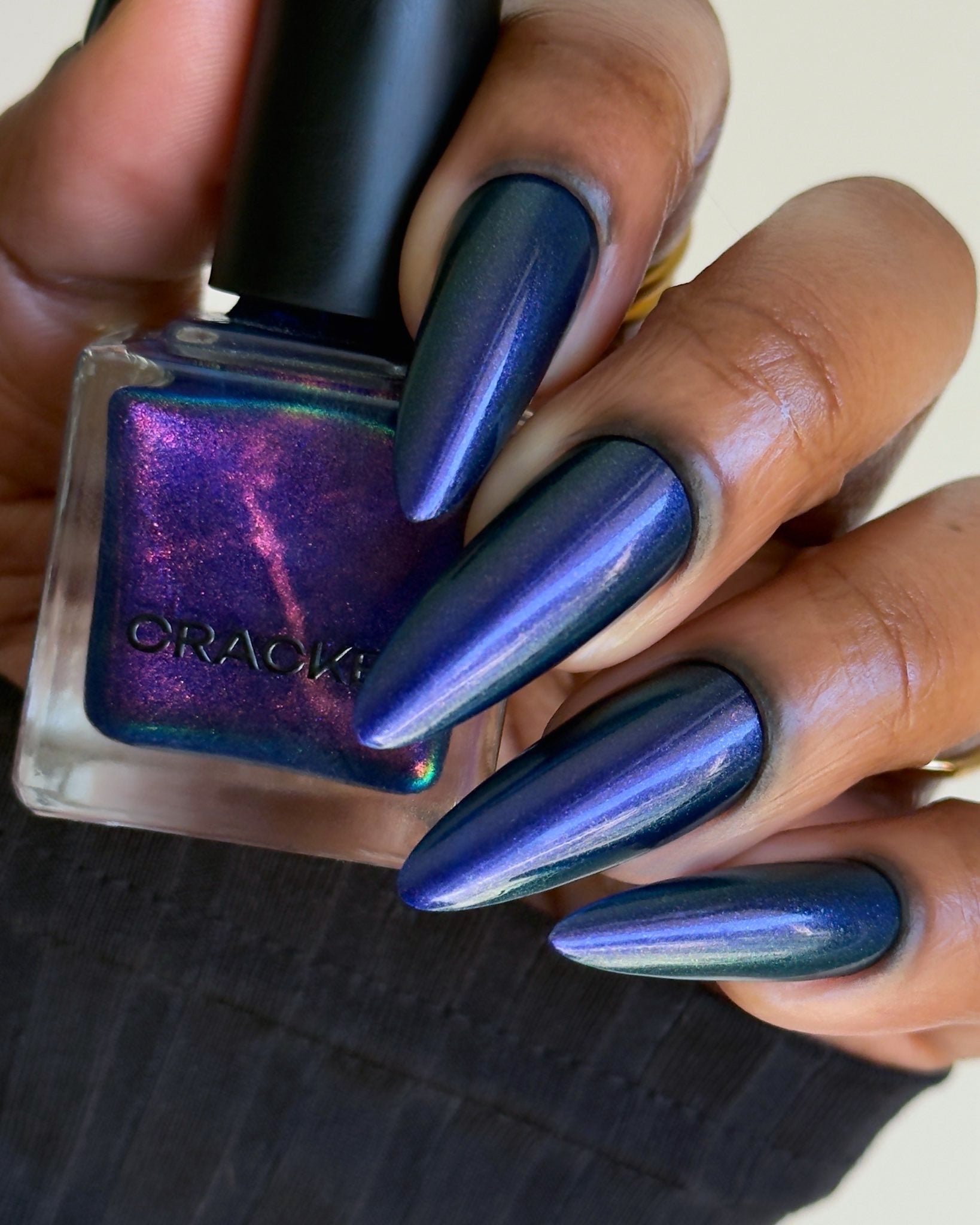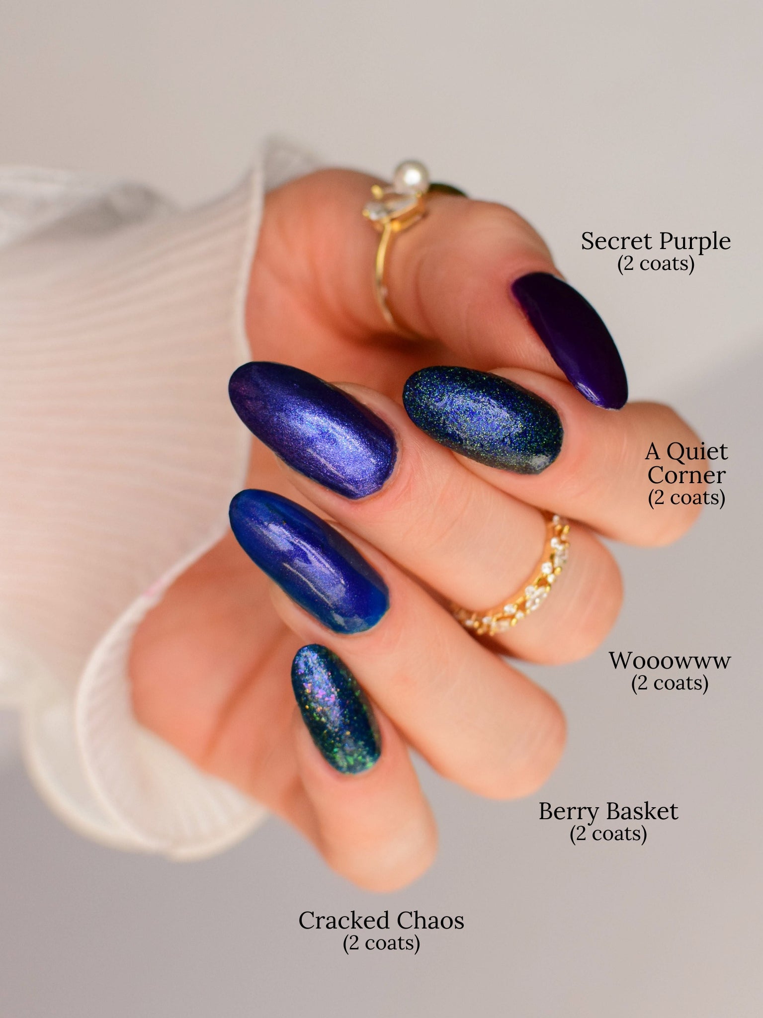Dive into the magic of late fall with this deep blue crelly with purple and orange shimmers. Berry Basket is a moody, mesmerizing polish that feels like it encapsulates the magic of this season. It's the perfect companion for crisp nights and festive days.