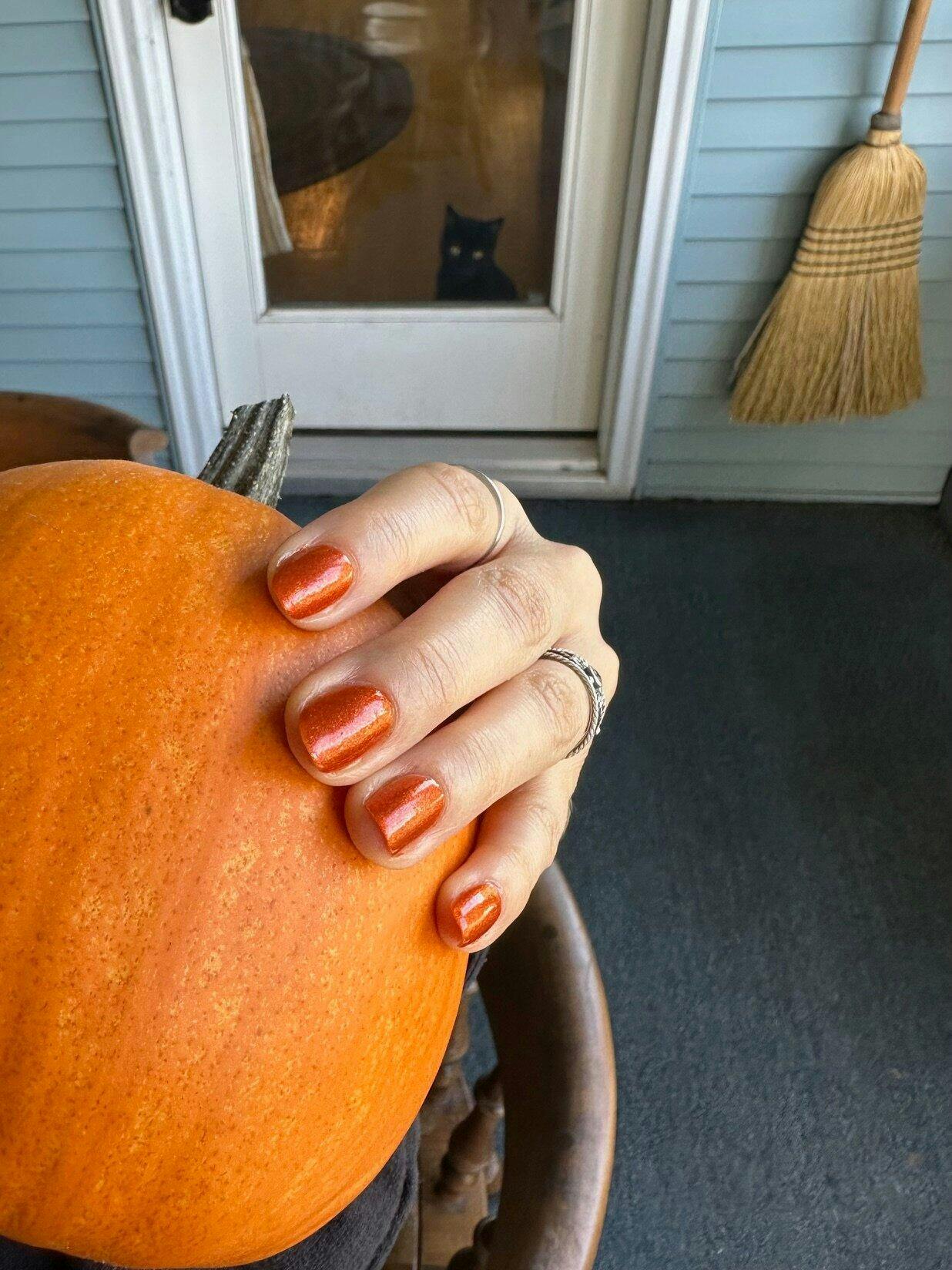It's orange, but so pretty! I'm an orange hater and well, this polish is the exception. It's pumpkiny in the best shimmery way. Cracked managed to make a flattering orange! I bought this to be my sole Halloween orange & can't wait to do some jack-o-lantern nail art using this as the background. (Photobomb by my black cat, giving some nice witchy vibes along with the porch broom, lol.)