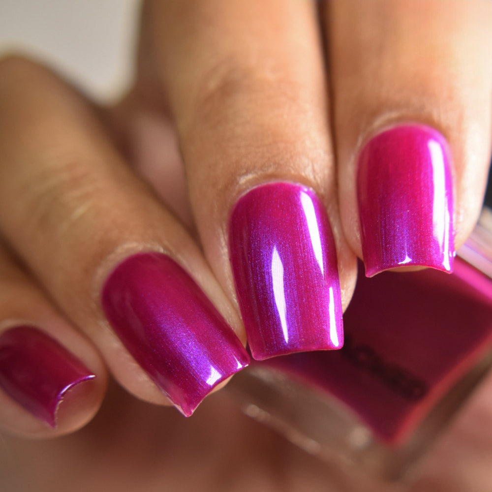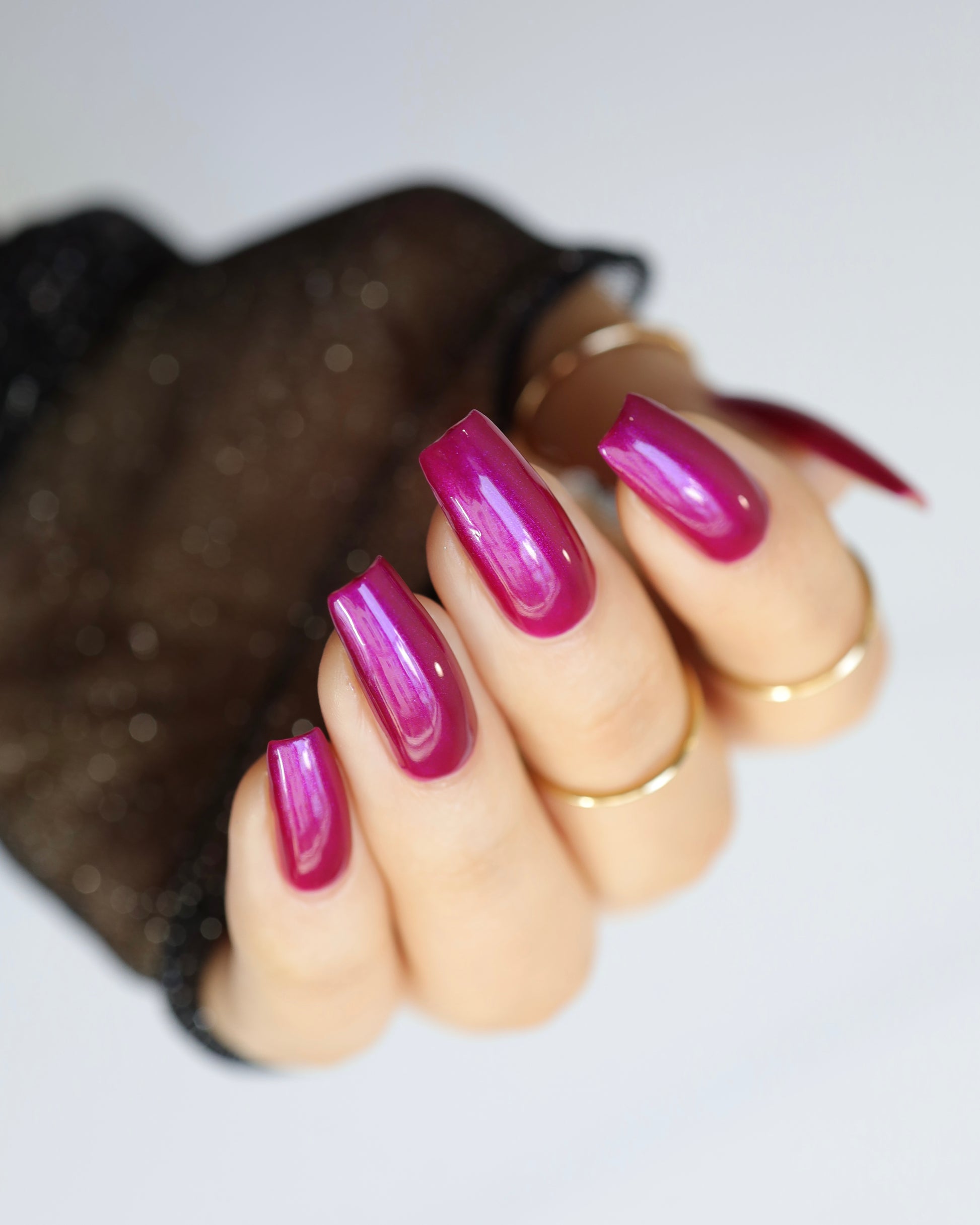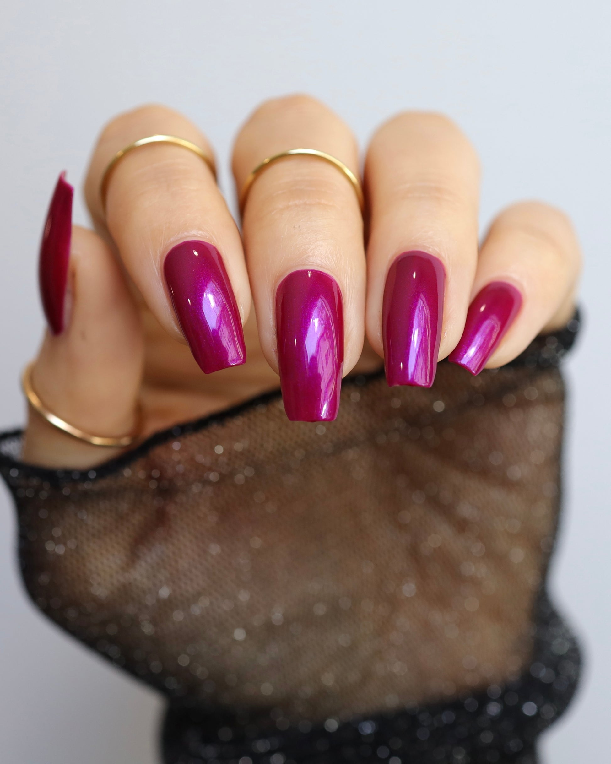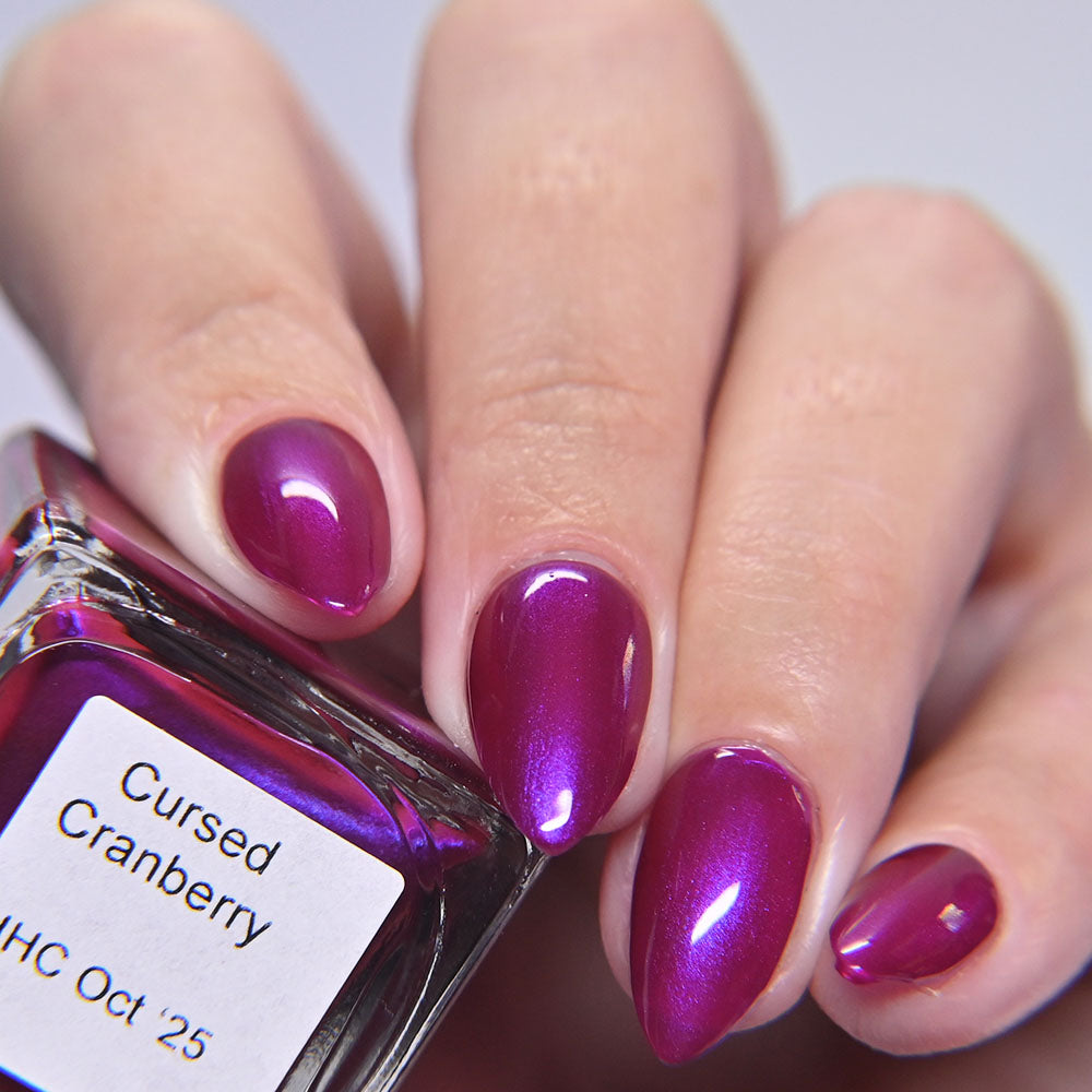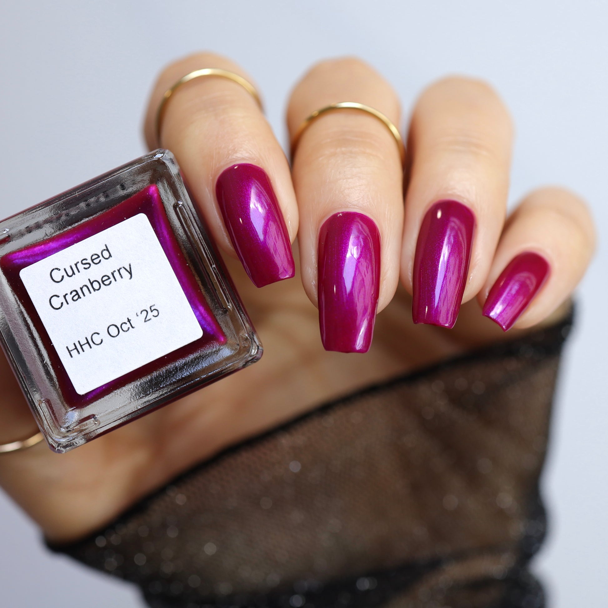 Every holiday table has that one dish the cranberry sauce everyone insists on making, but it barely gets touched. We took that idea and gave it a glow-up. Cursed Cranberry is a rich, buildable magenta cranberry jelly laced with fine purple aurora pigments that catch the light like a secret waiting to be discovered. Deep, juicy, and full of dimension, this shade goes from a sheer kiss of color to a bold, jammy manicure with extra coats. It’s playful, and guaranteed to get more attention than the forgotten bowl at dinner.