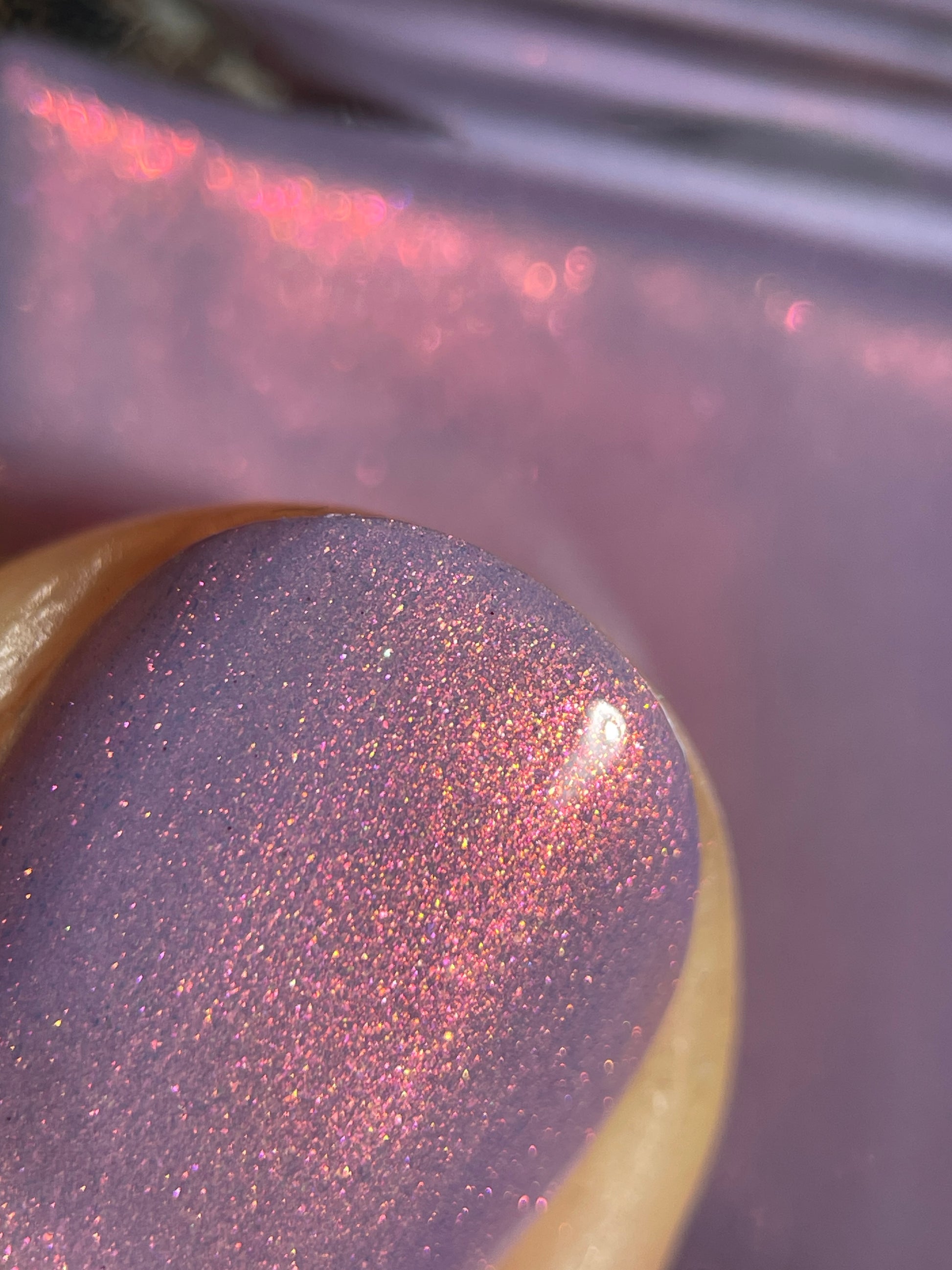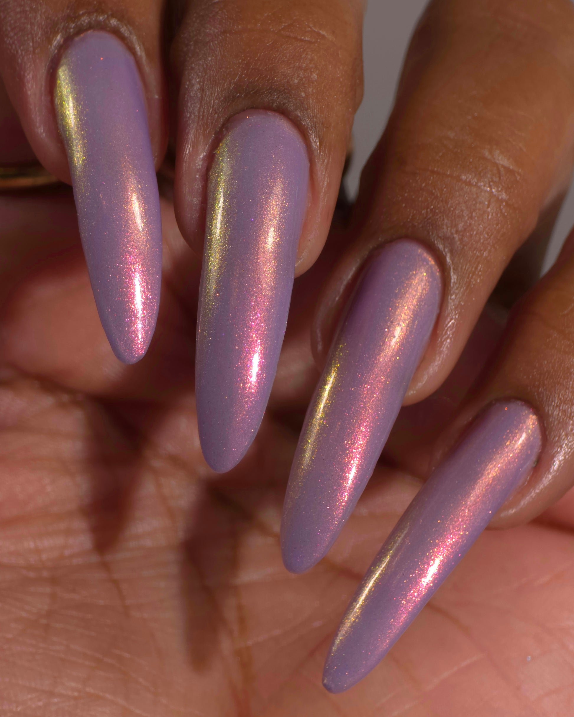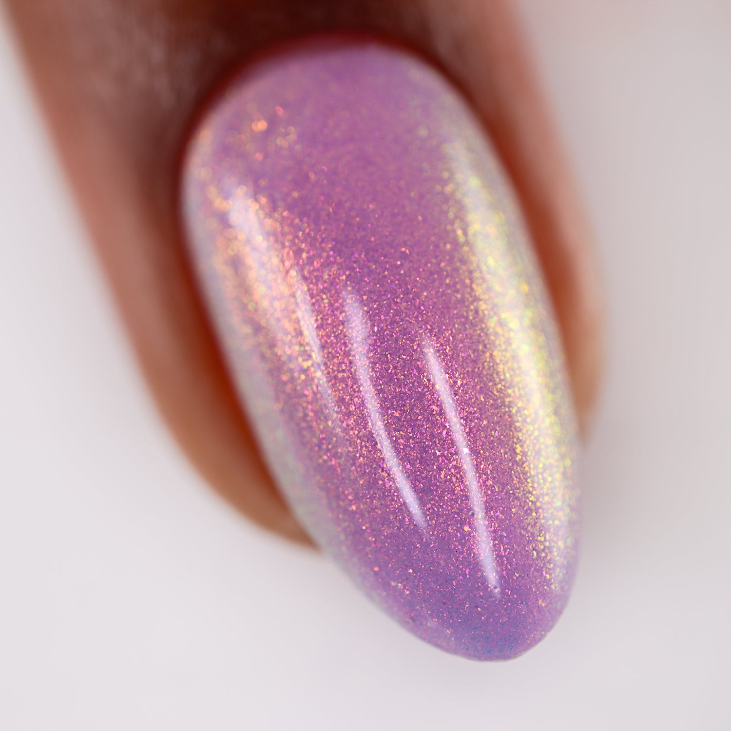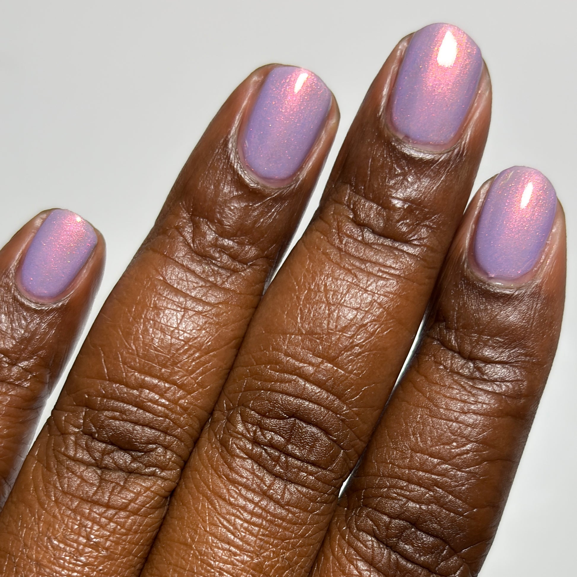 Frolicking In The Fields is a soft daydream come to life. This delicate lavender shade is lit up with pink and orange aurora pigments, while gold to green shifting shimmers dance like sunlight through wildflowers. Inspired by wandering minds, slow moments, and the magic of stopping to smell the blooms, this polish is your invitation to pause, play, and get lost in the beauty around you