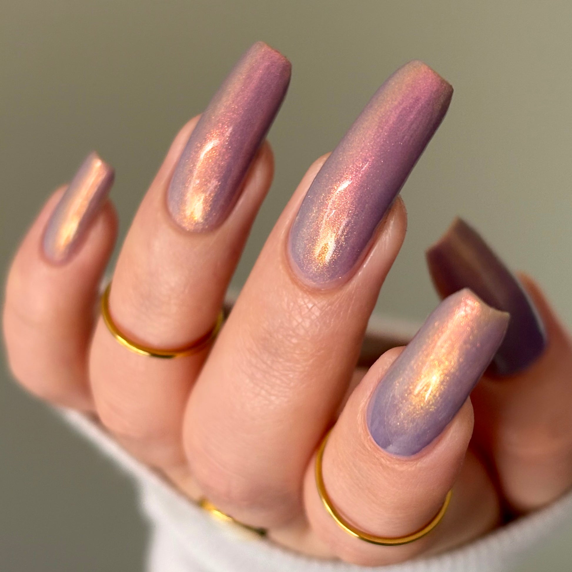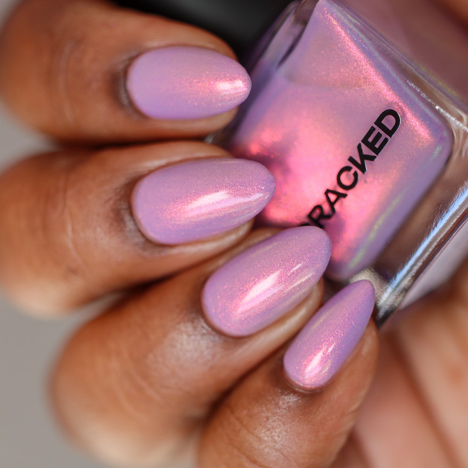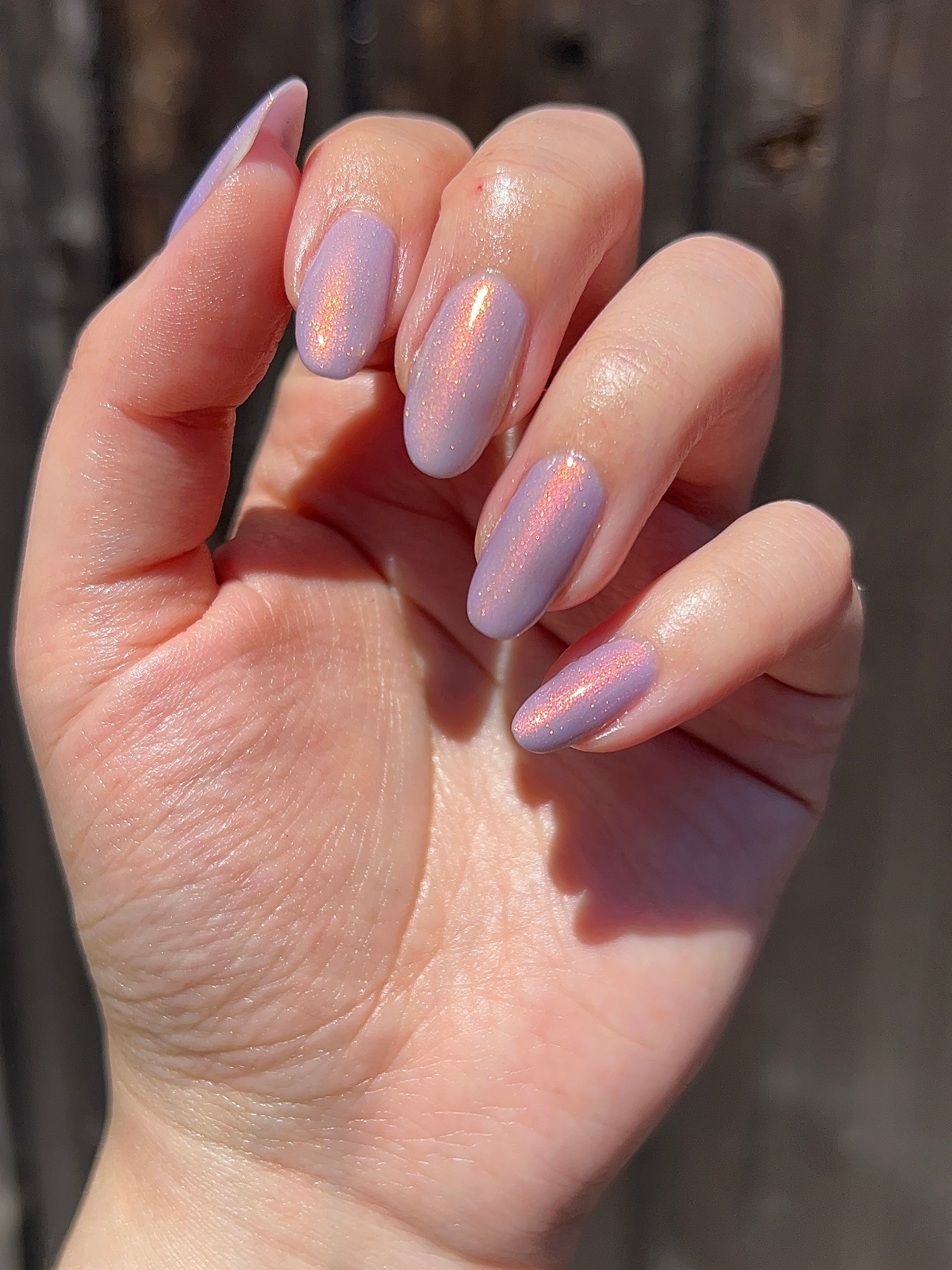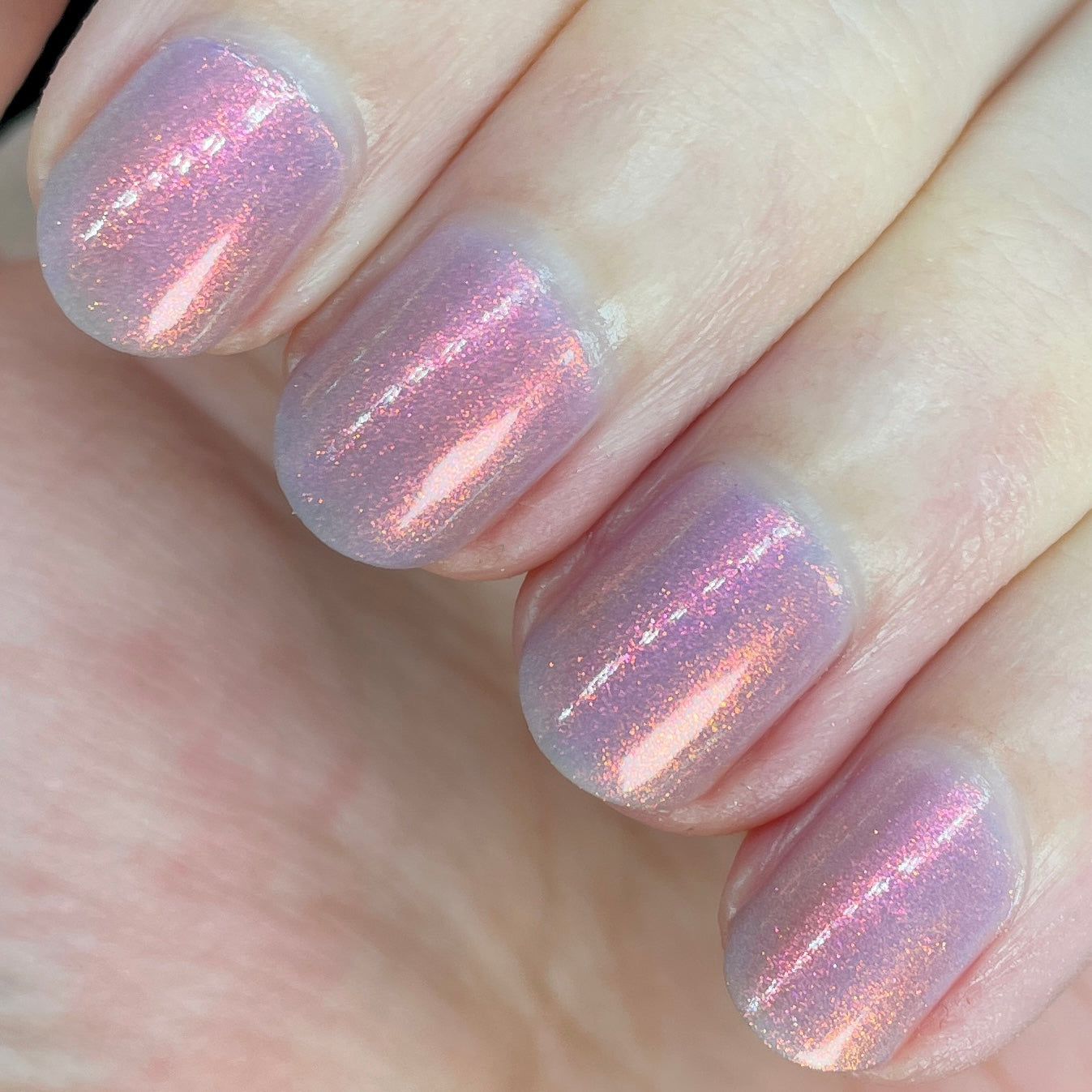 Frolicking In The Fields is a soft daydream come to life. This delicate lavender shade is lit up with pink and orange aurora pigments, while gold to green shifting shimmers dance like sunlight through wildflowers. Inspired by wandering minds, slow moments, and the magic of stopping to smell the blooms, this polish is your invitation to pause, play, and get lost in the beauty around you
