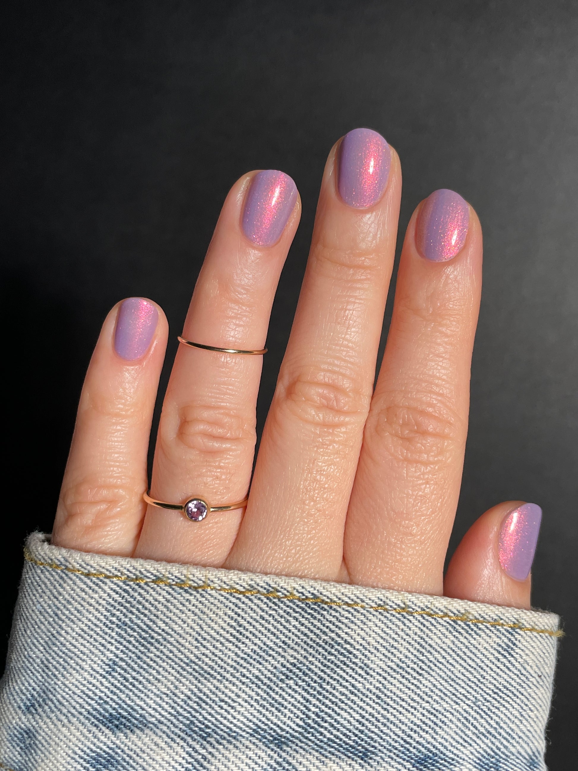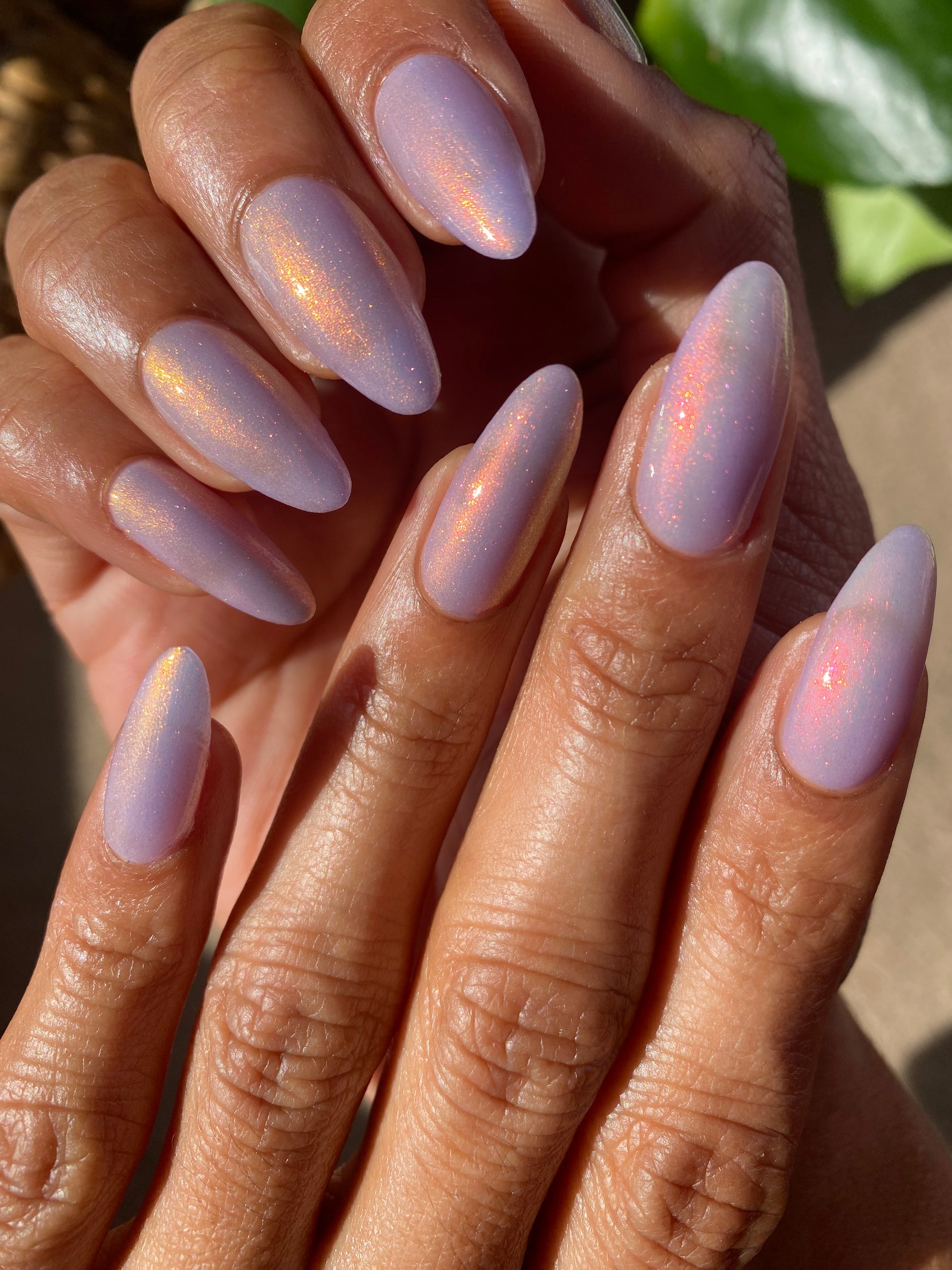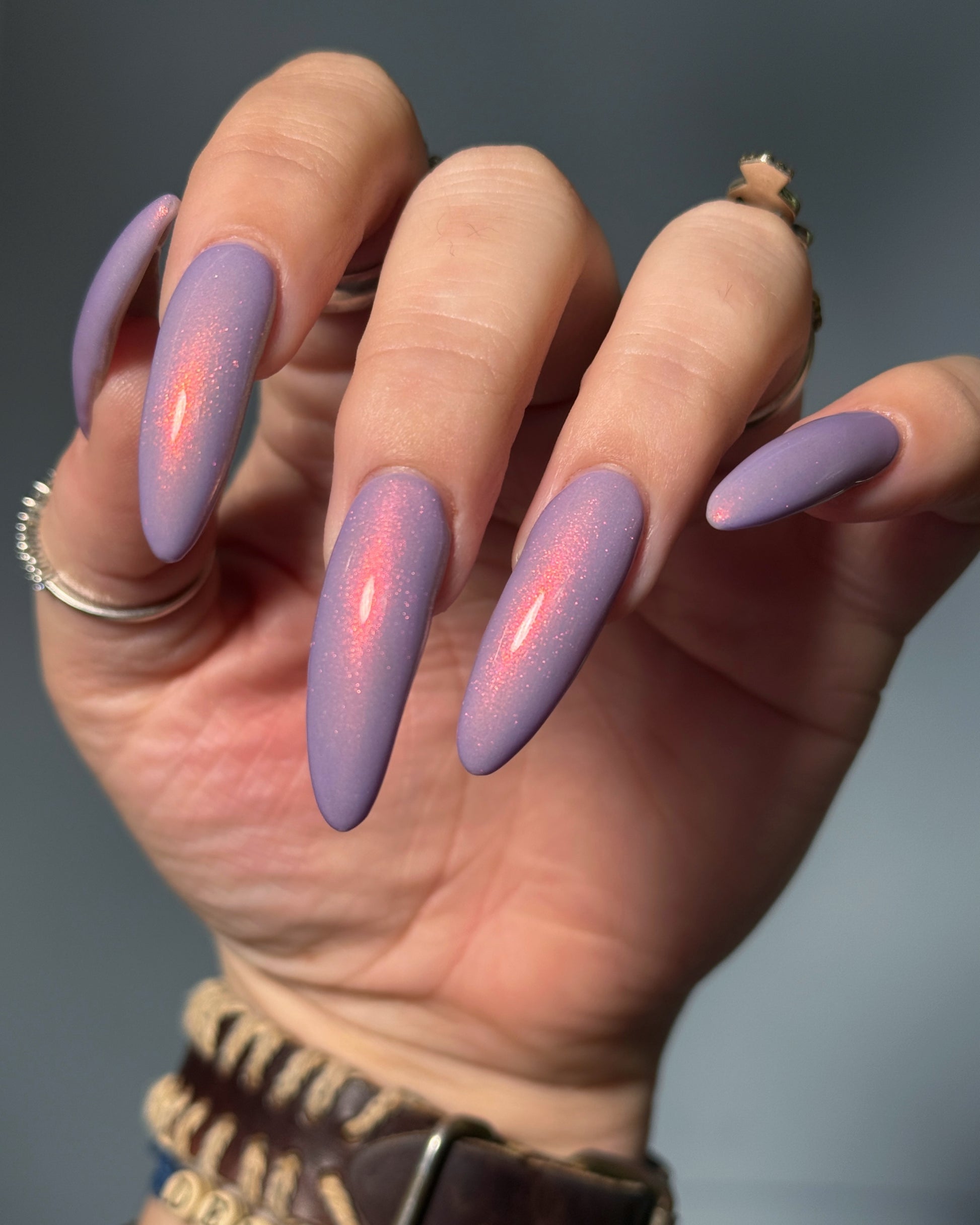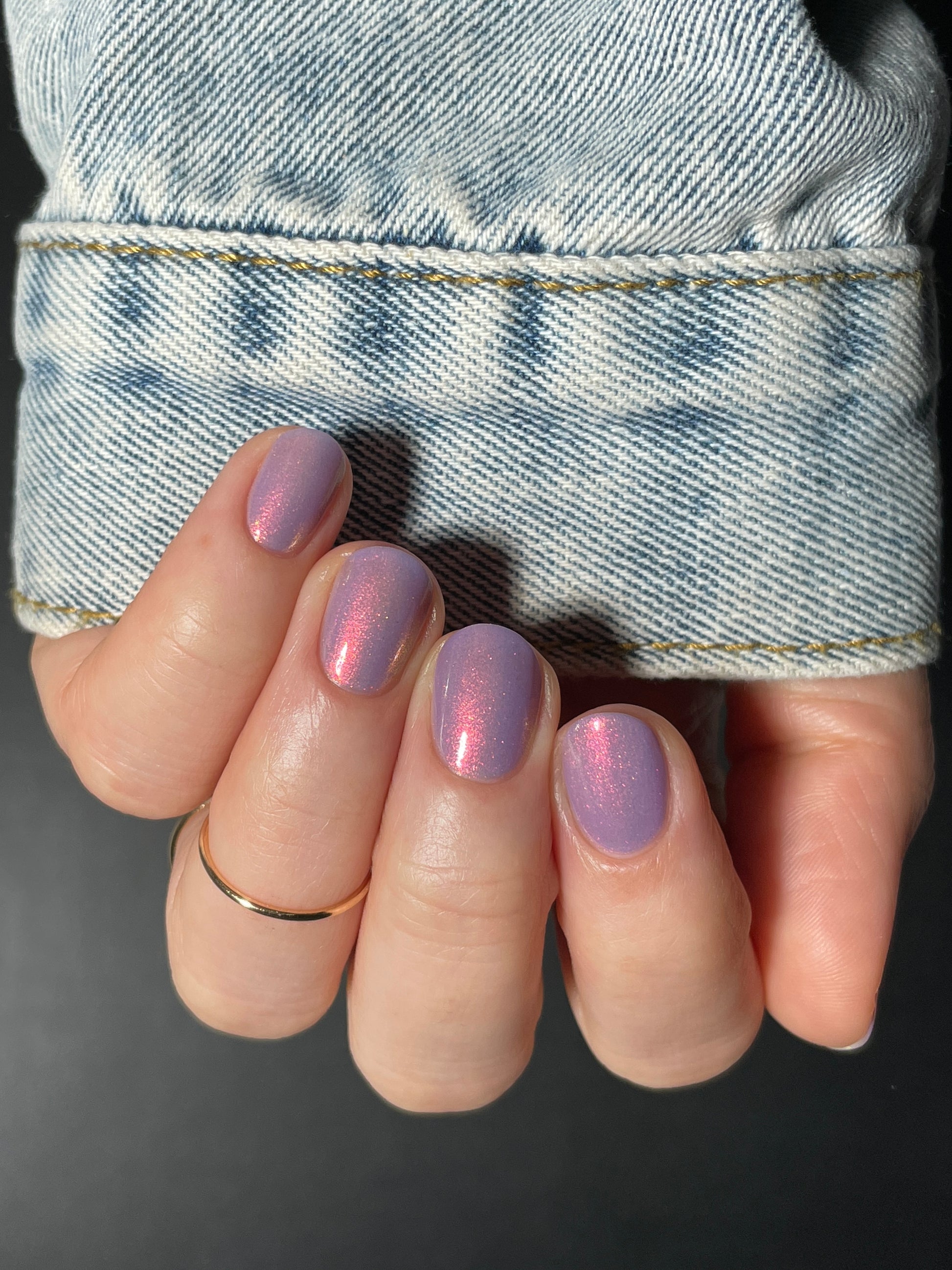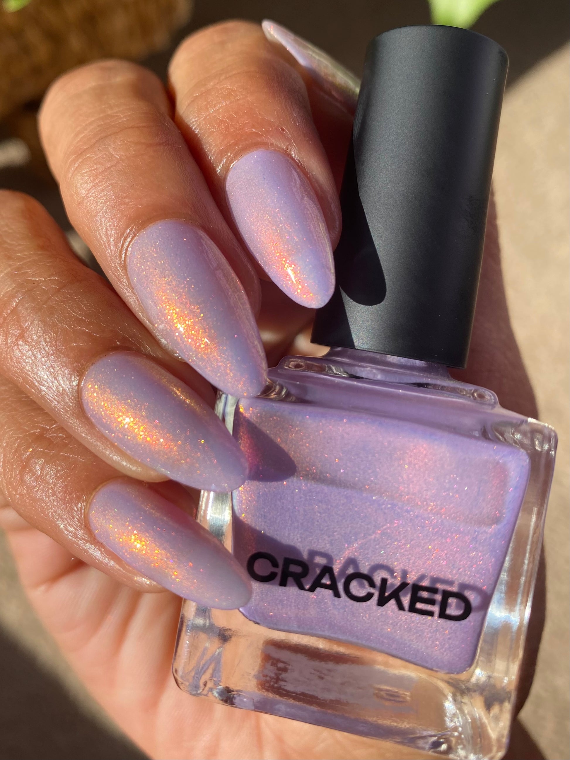 Frolicking In The Fields is a soft daydream come to life. This delicate lavender shade is lit up with pink and orange aurora pigments, while gold to green shifting shimmers dance like sunlight through wildflowers. Inspired by wandering minds, slow moments, and the magic of stopping to smell the blooms, this polish is your invitation to pause, play, and get lost in the beauty around you