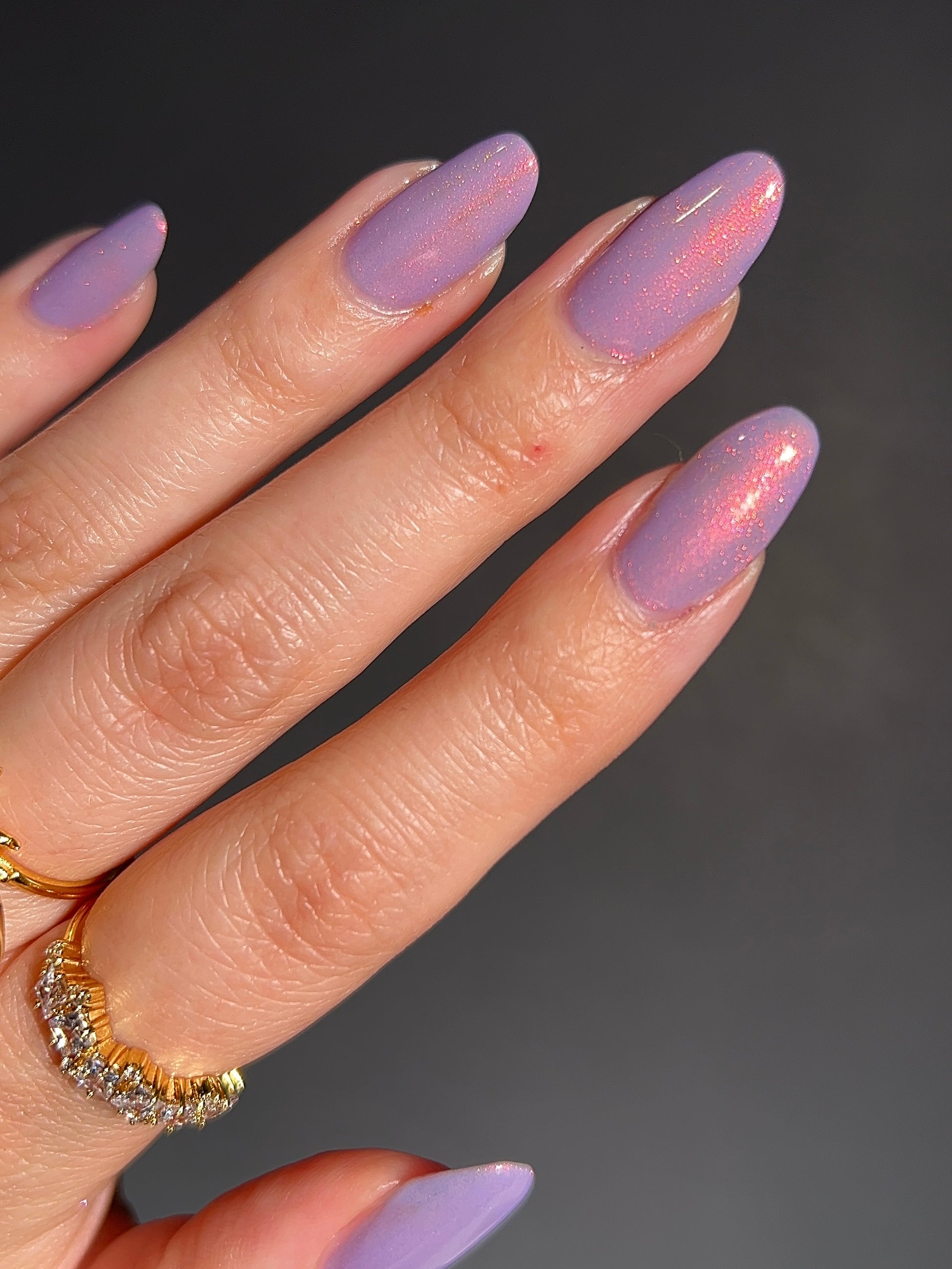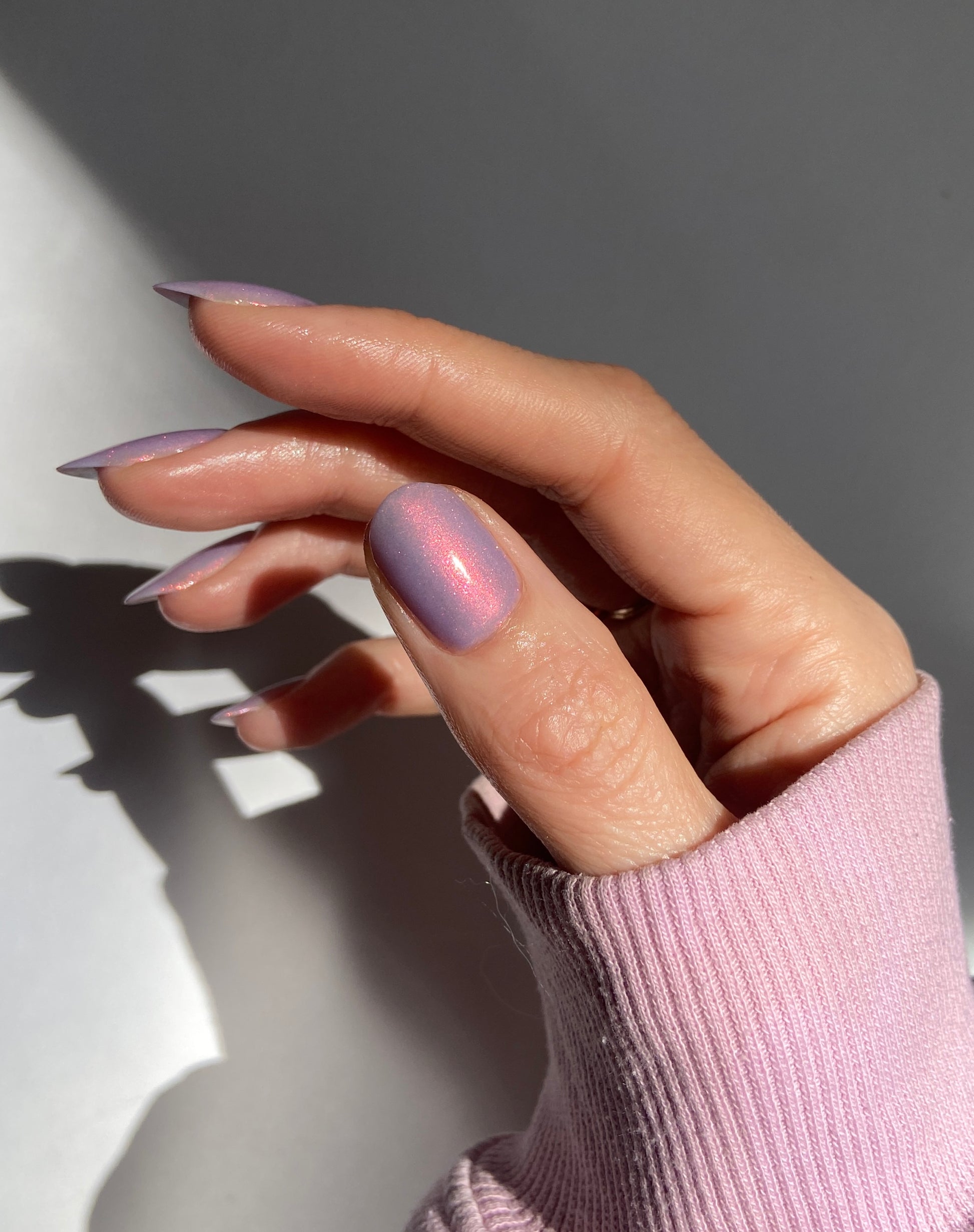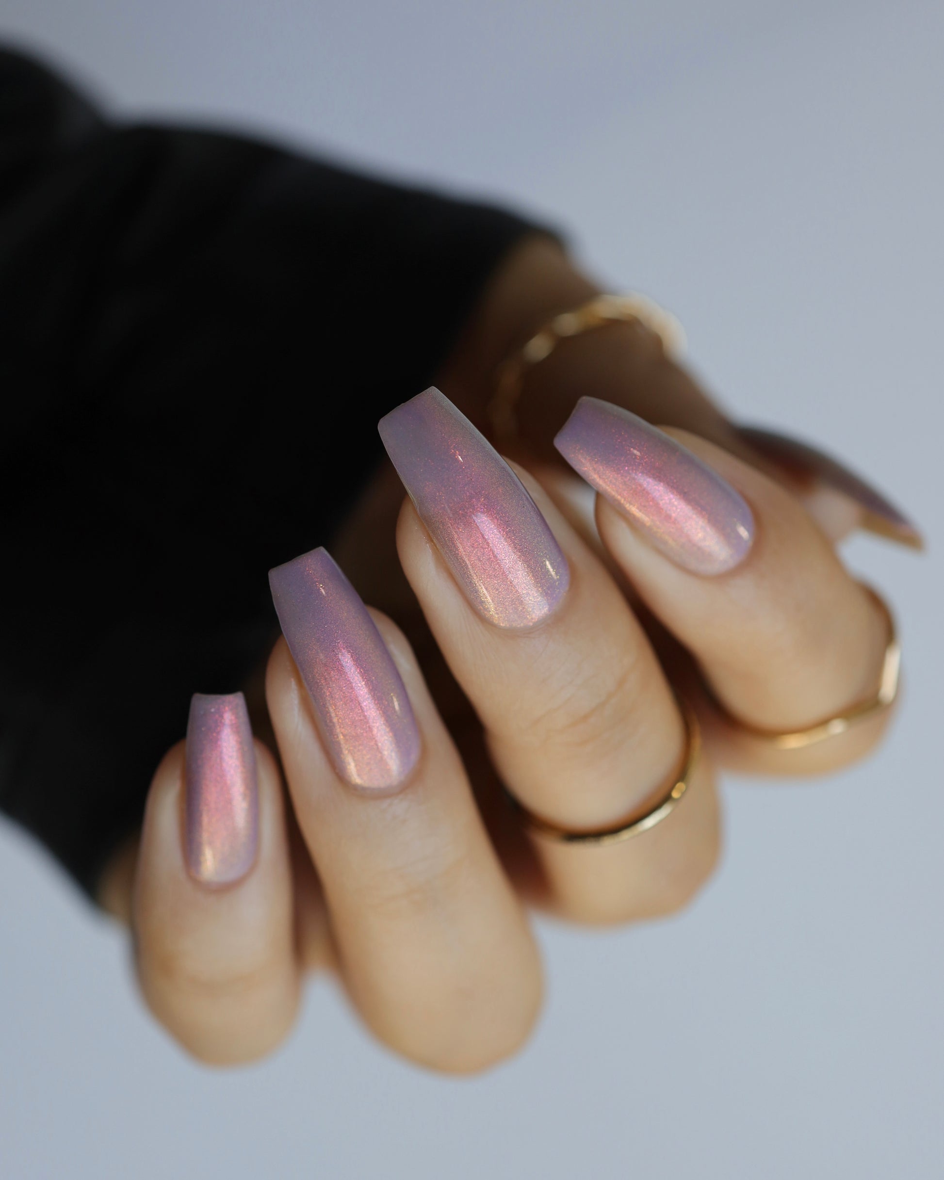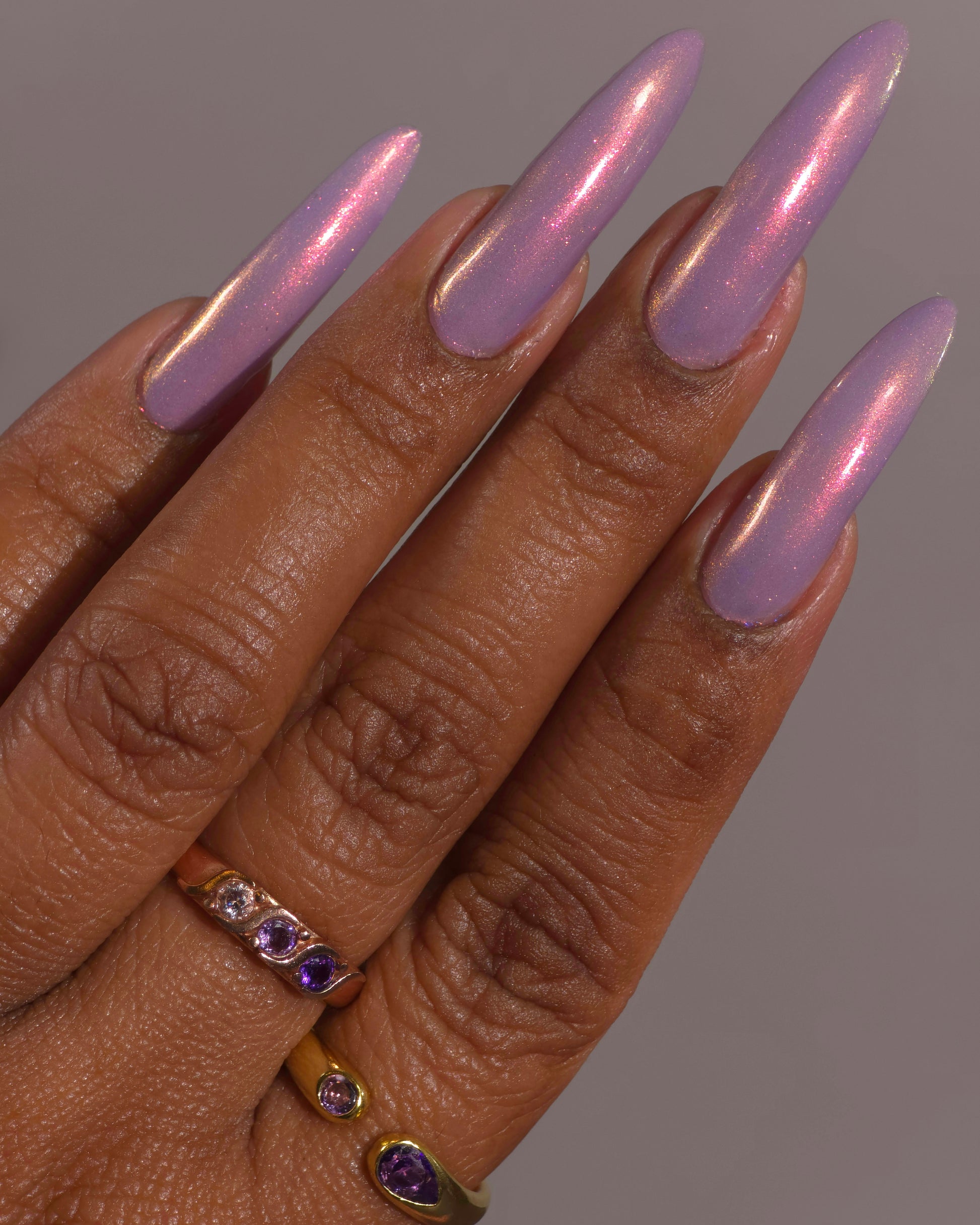 Frolicking In The Fields is a soft daydream come to life. This delicate lavender shade is lit up with pink and orange aurora pigments, while gold to green shifting shimmers dance like sunlight through wildflowers. Inspired by wandering minds, slow moments, and the magic of stopping to smell the blooms, this polish is your invitation to pause, play, and get lost in the beauty around you