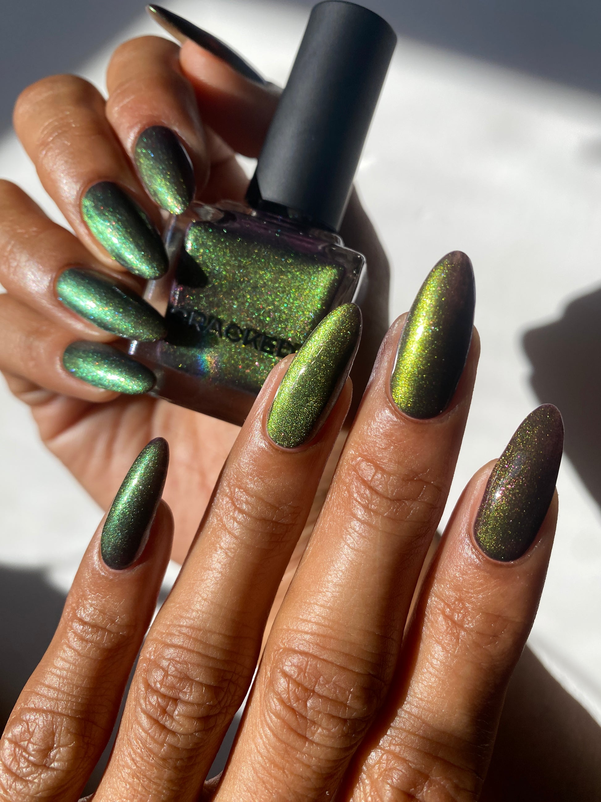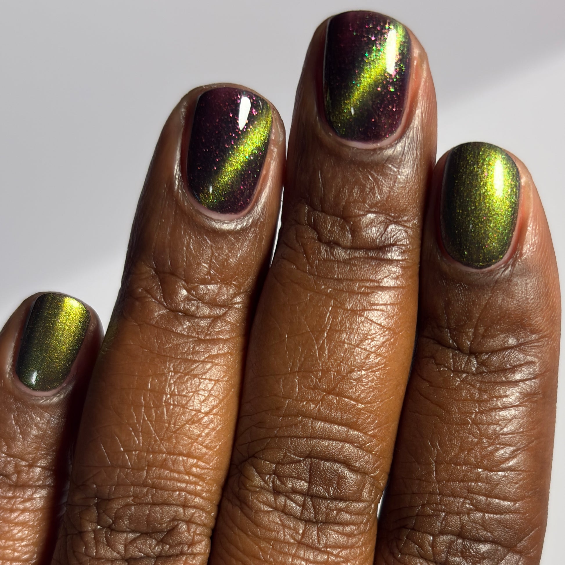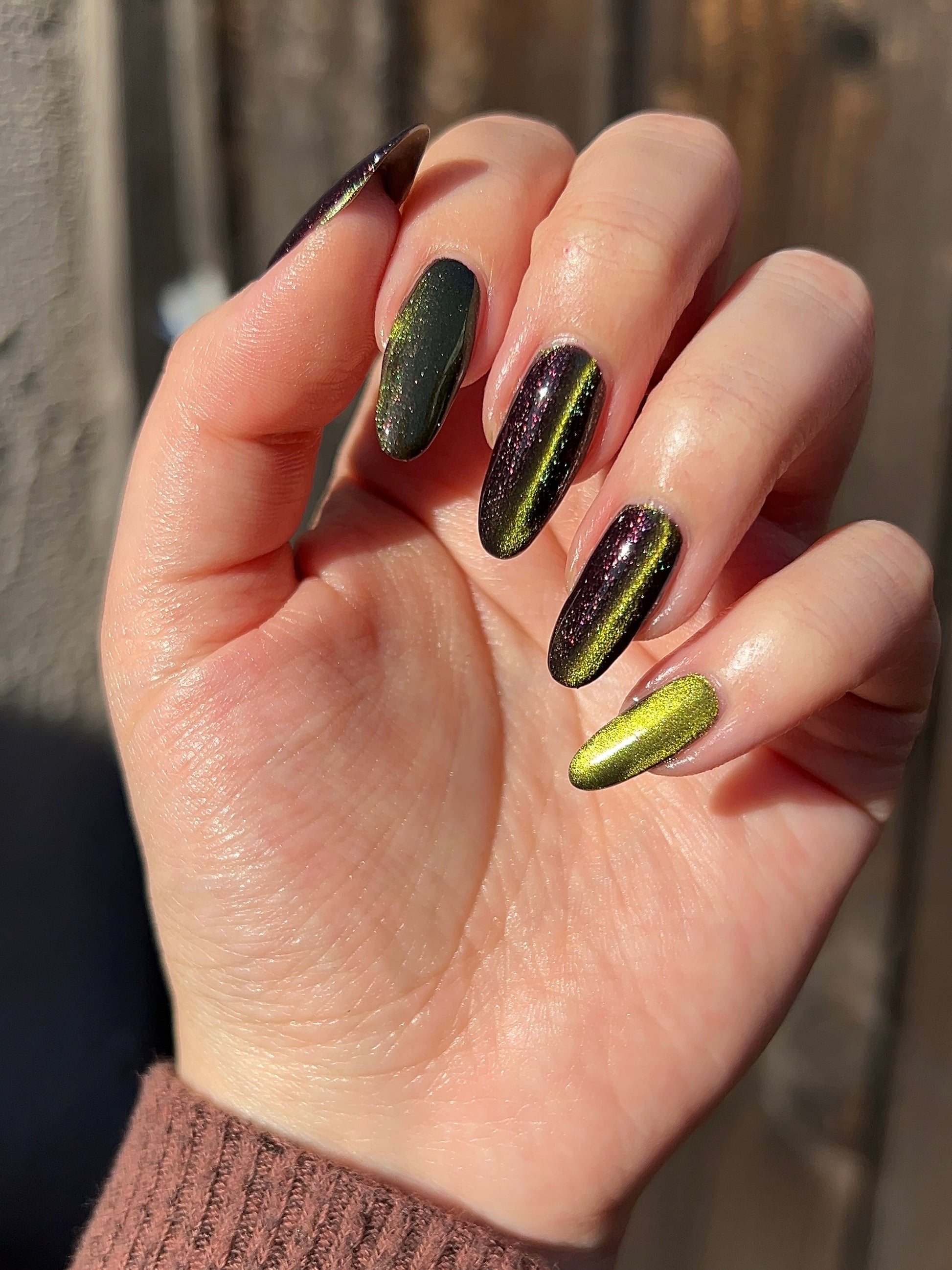 Gherkin is a purple with muddy green magnetic pigments and flecks of pink shimmers. This isn't your average green! It's meant to be seen!