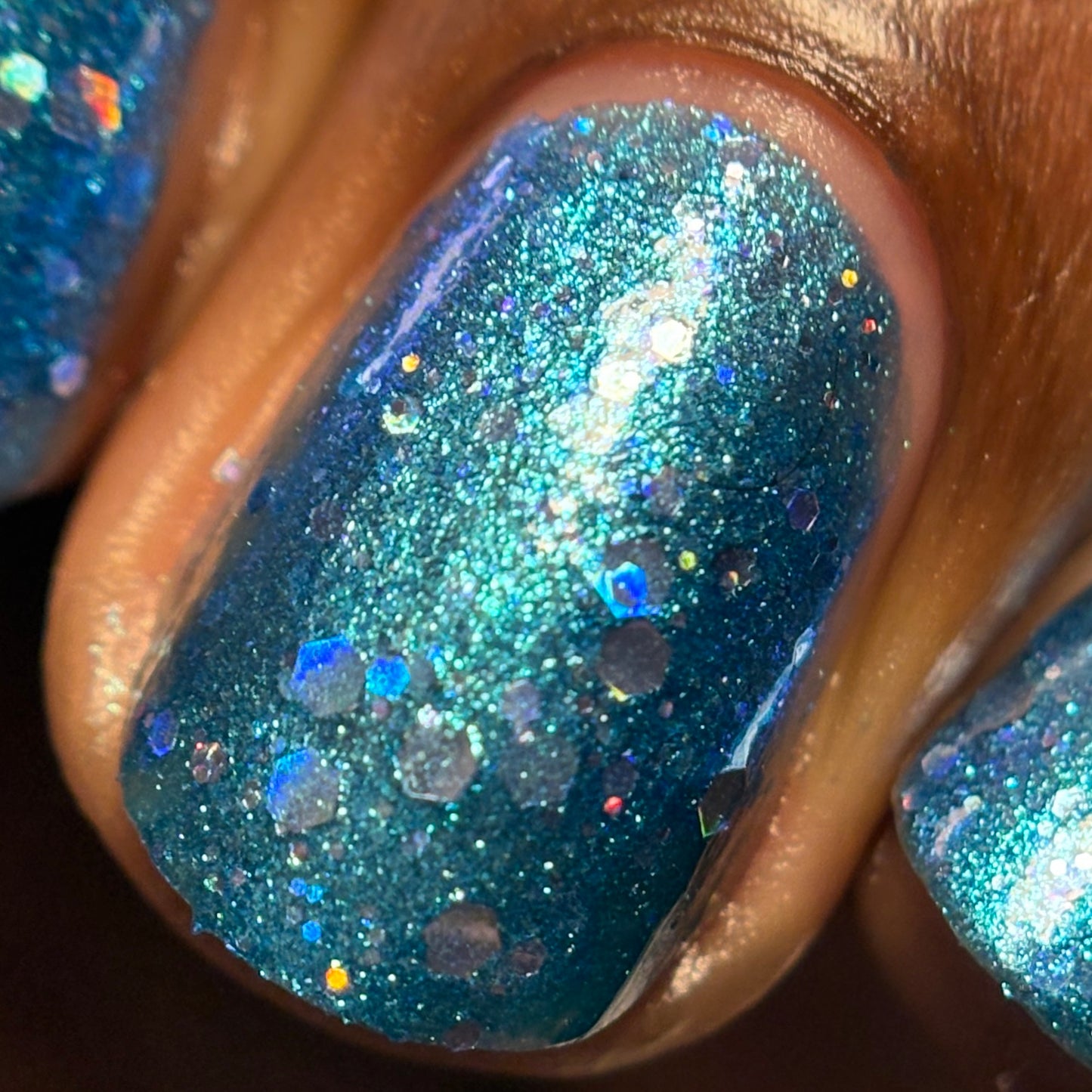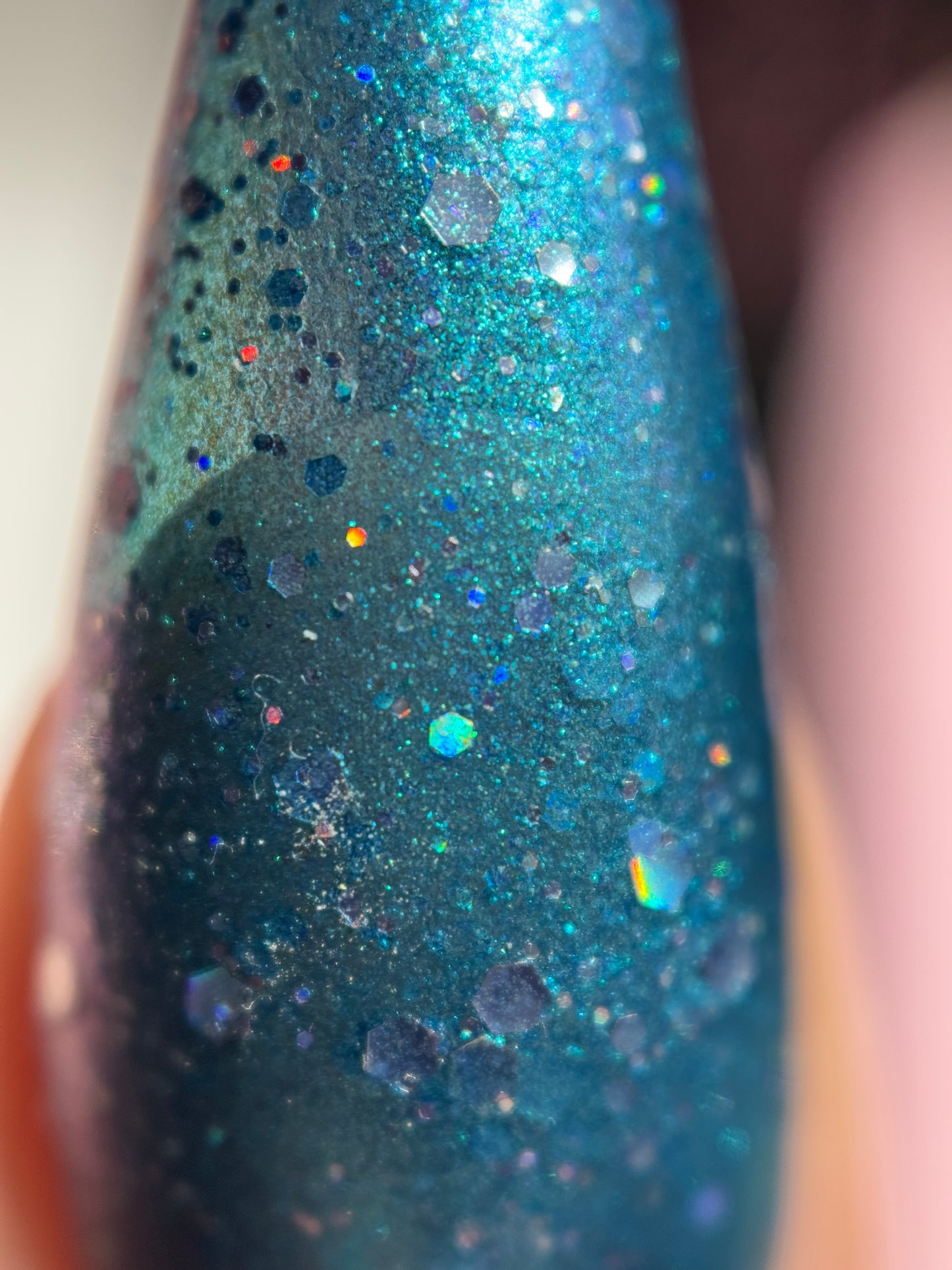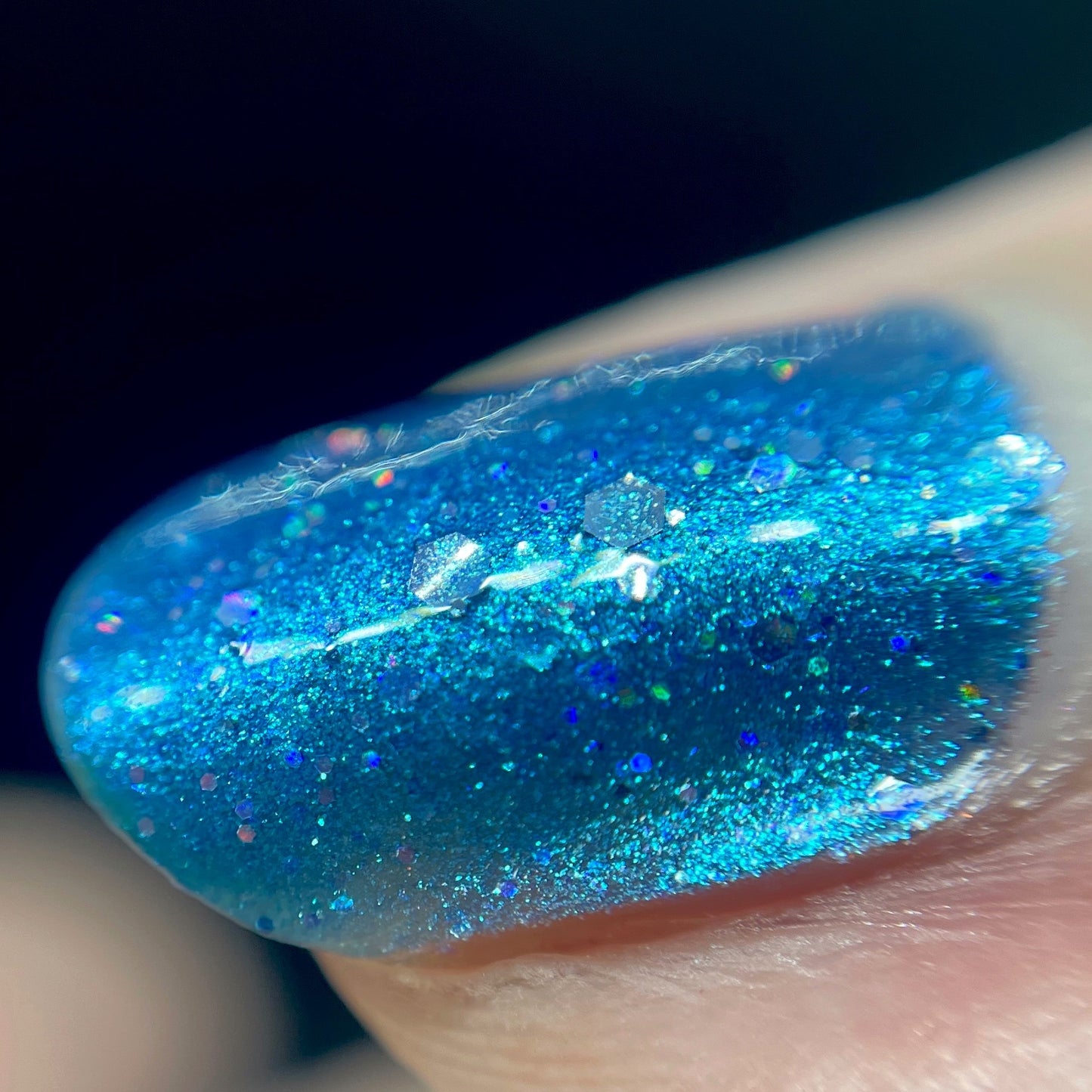 Continuing our journey down the indie rabbit hole, Guided Light is your shimmering compass through the dark and wondrous unknown. This deep teal stunner is lit from within by silver holographic glitters, catching the light like stars on the path ahead.