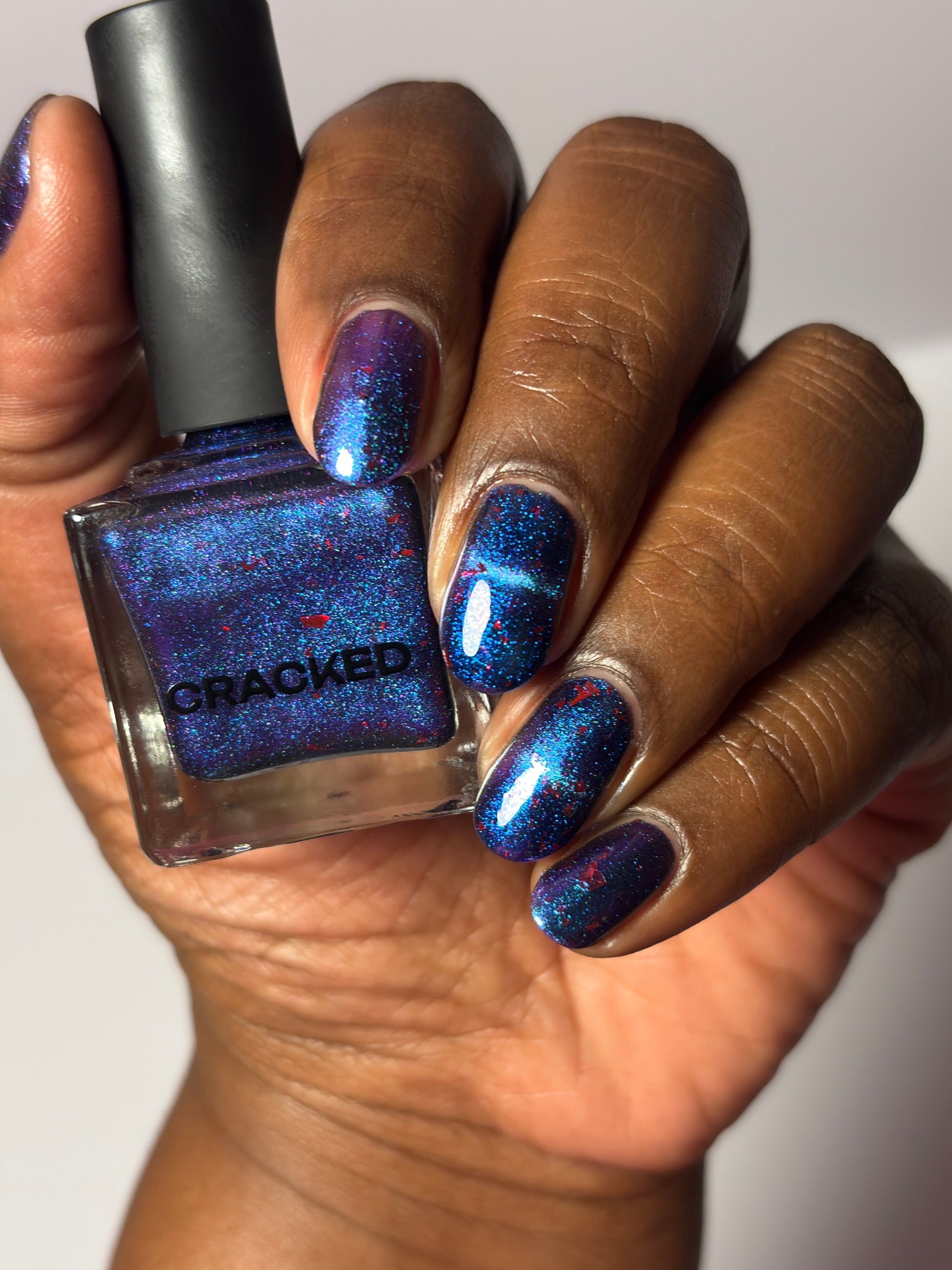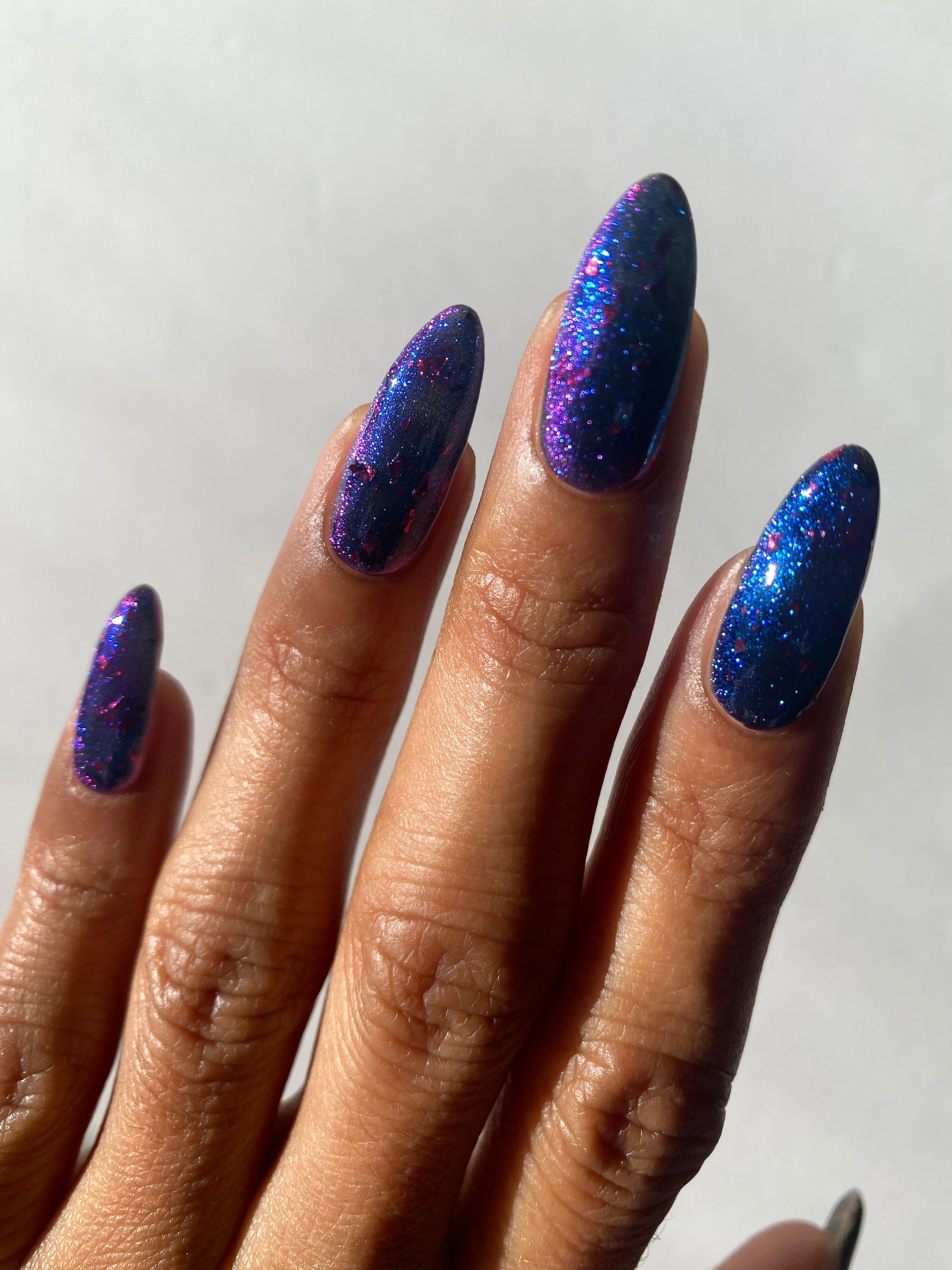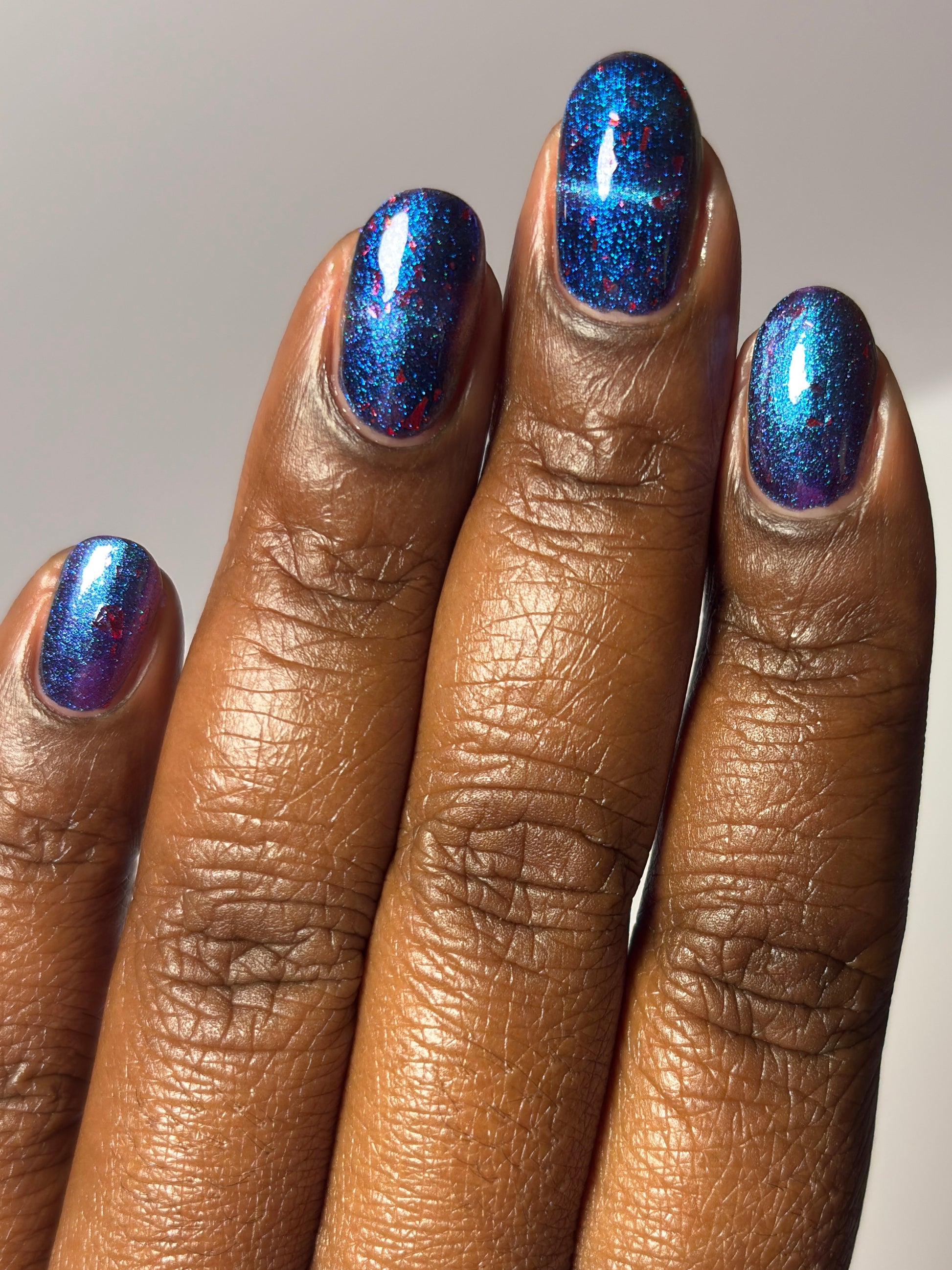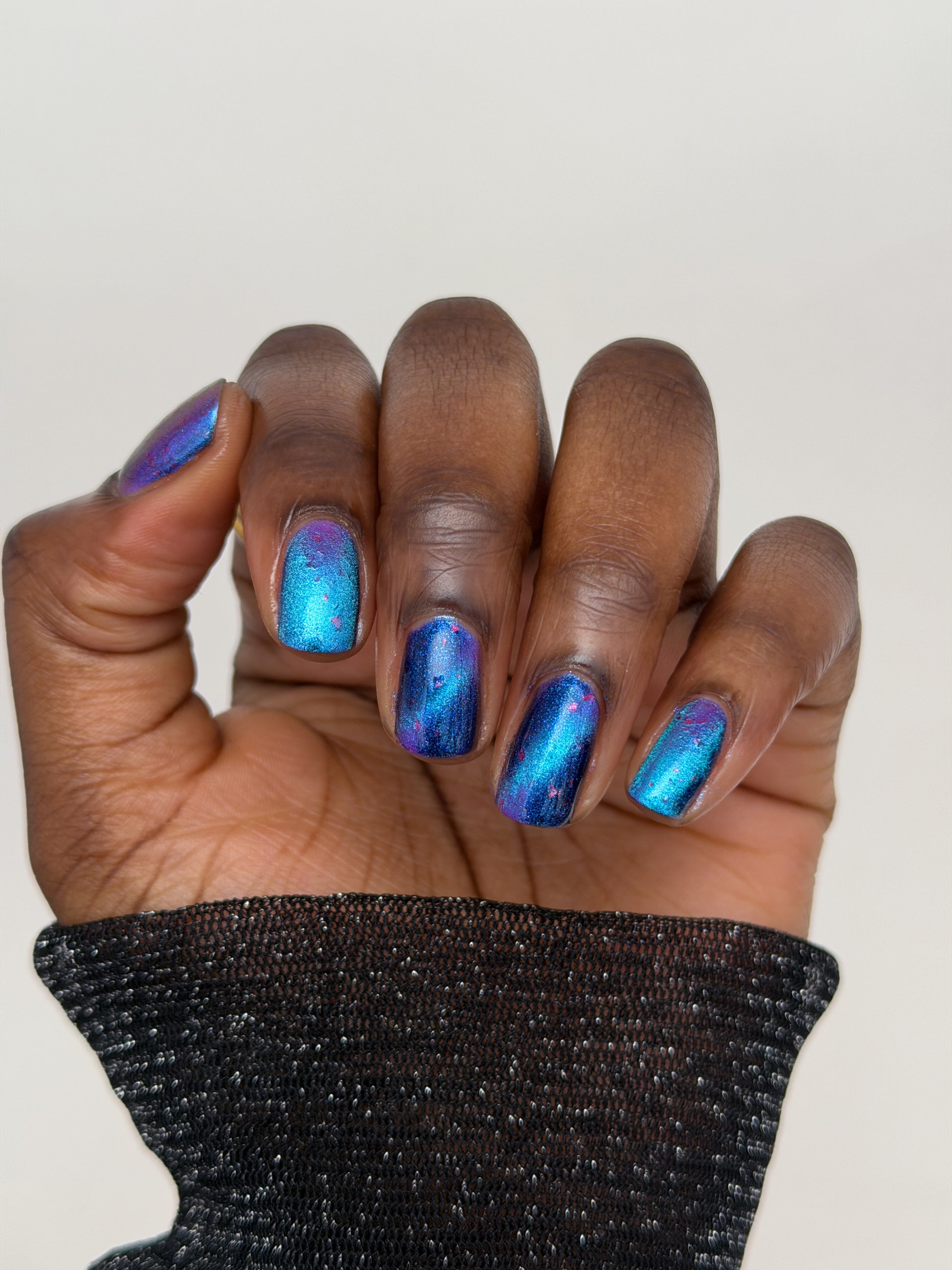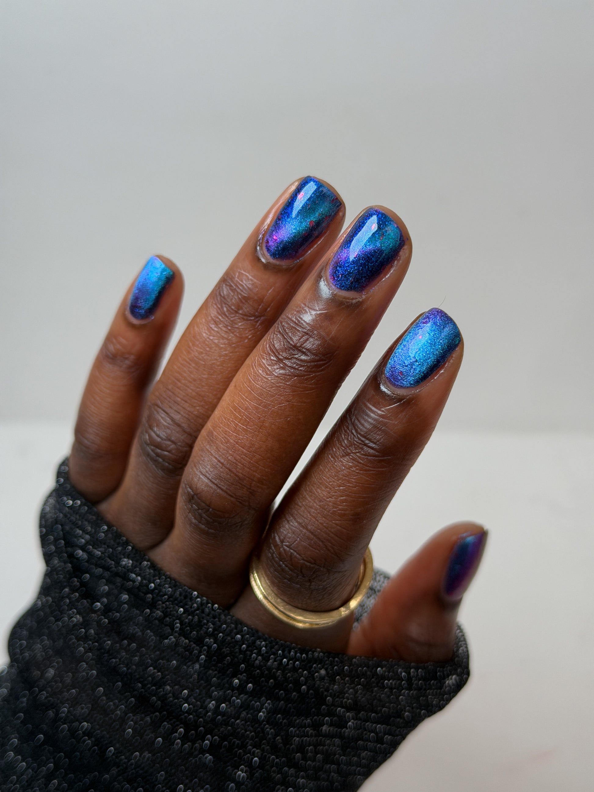 Head Above Water is a blue jelly that captures the quiet tension of relationships that never quite warm up. Inspired by the feeling of trying to stay afloat when it’s not you, it’s the weather. When your emotions are overwhelmed and your brain is flooded with thoughts. Cool blue magnetic pigments drift beneath the surface while sharp red shard glitters flash like warning signs you almost ignored. This shade mirrors the emotional chill of the isolation we sometimes find ourselves in and the strength it takes to keep your head above water anyway.