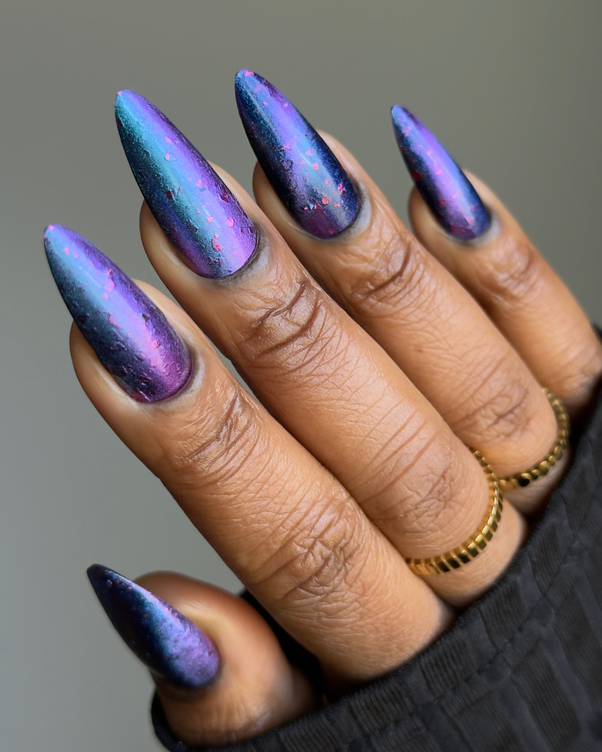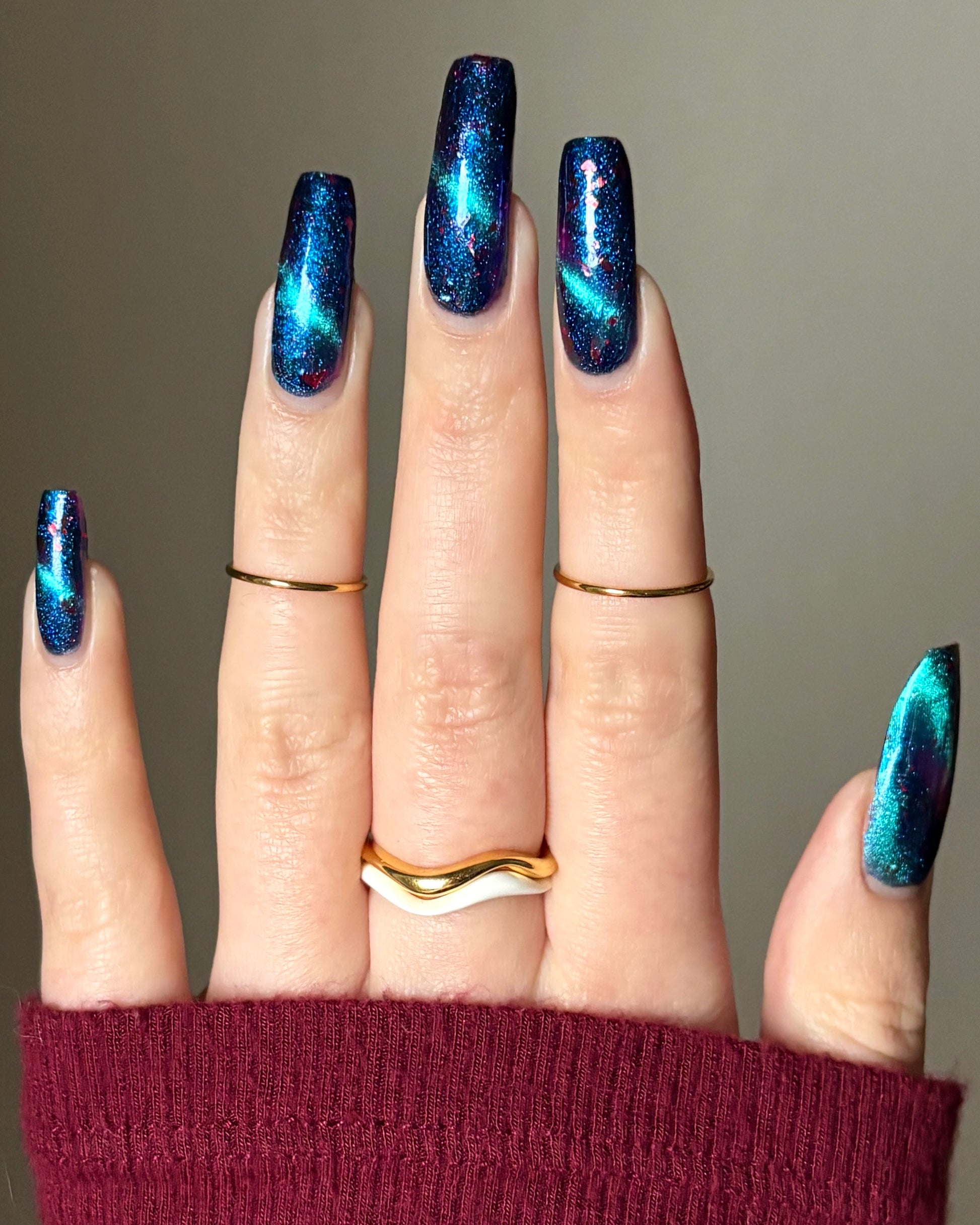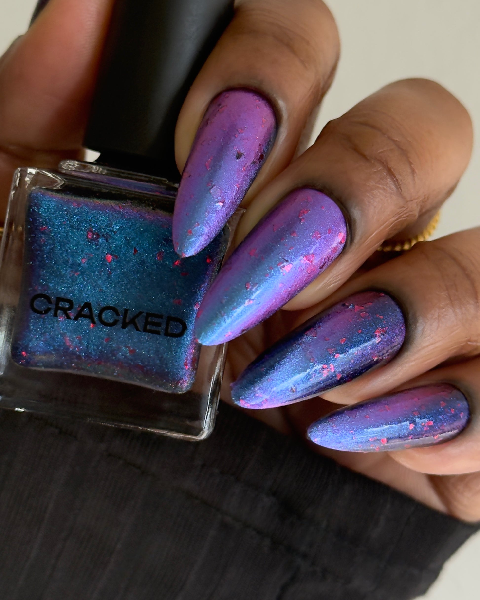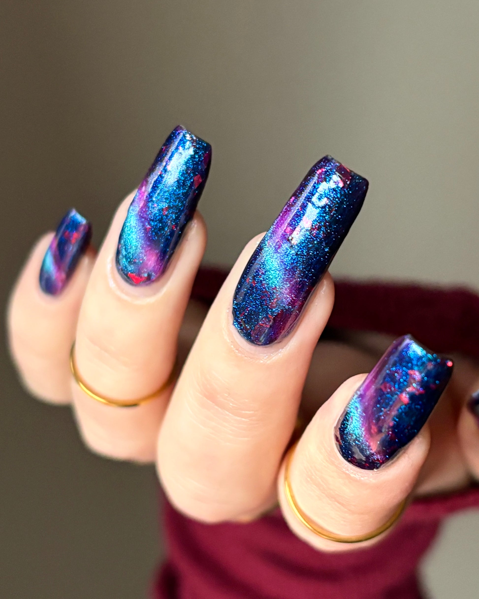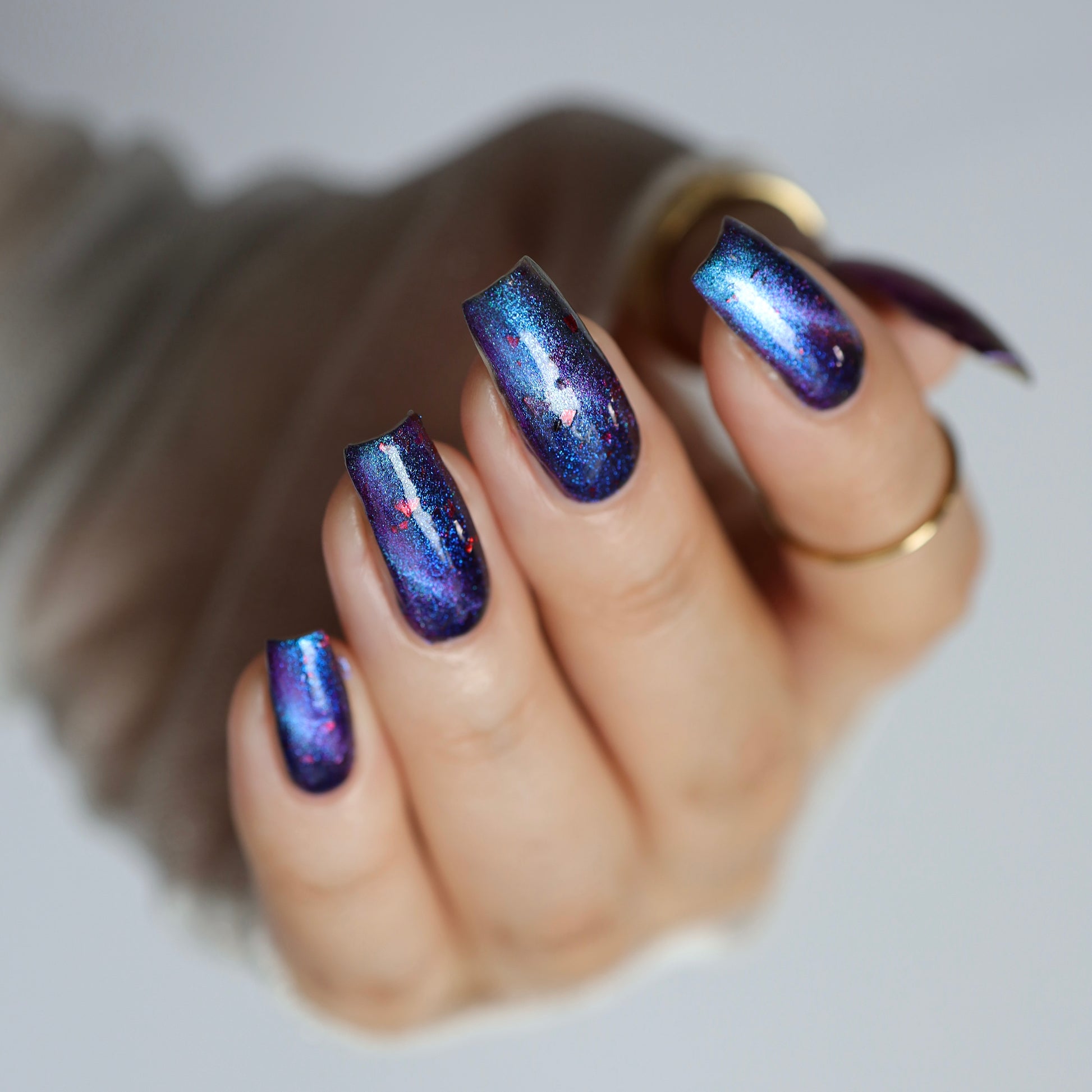 Head Above Water is a blue jelly that captures the quiet tension of relationships that never quite warm up. Inspired by the feeling of trying to stay afloat when it’s not you, it’s the weather. When your emotions are overwhelmed and your brain is flooded with thoughts. Cool blue magnetic pigments drift beneath the surface while sharp red shard glitters flash like warning signs you almost ignored. This shade mirrors the emotional chill of the isolation we sometimes find ourselves in and the strength it takes to keep your head above water anyway.