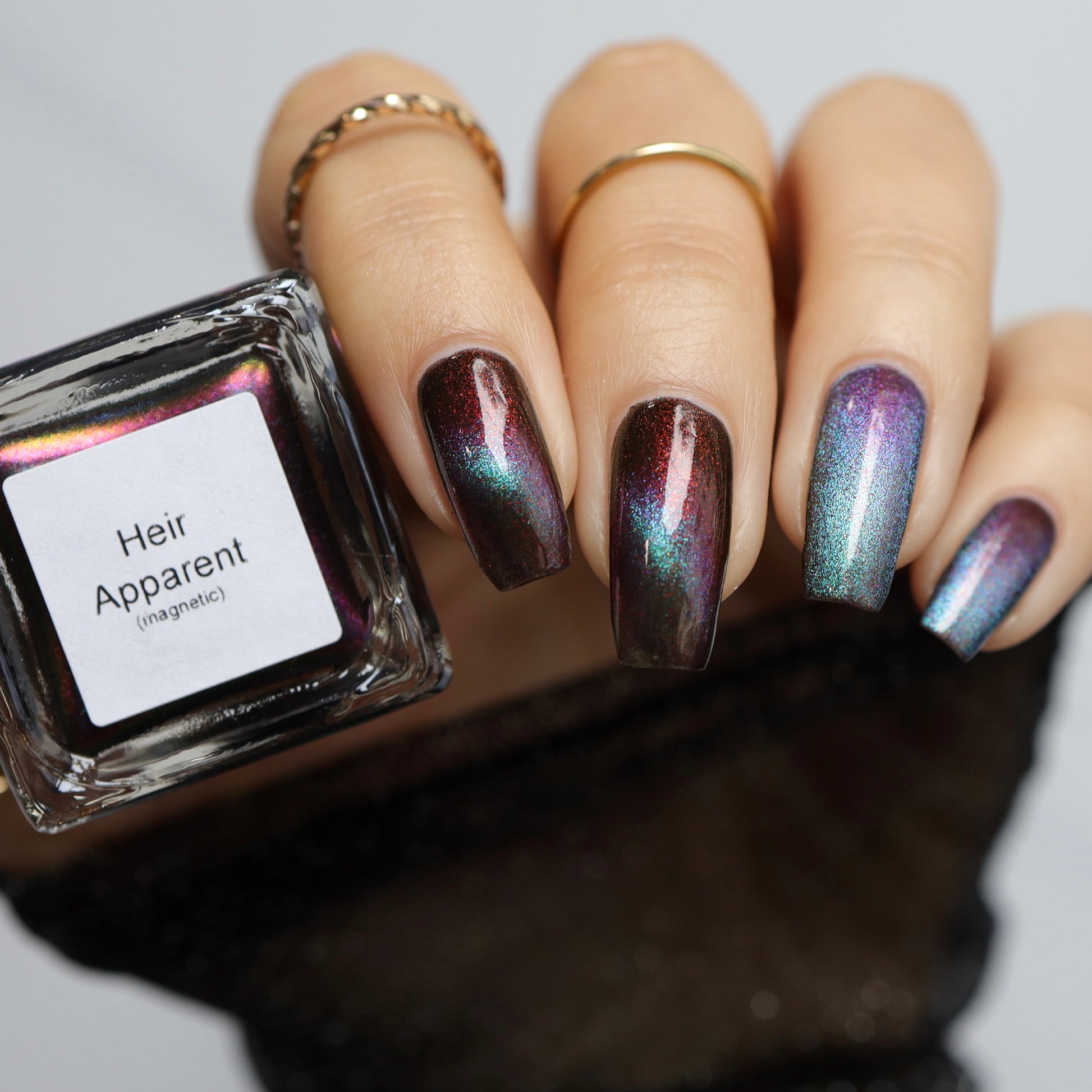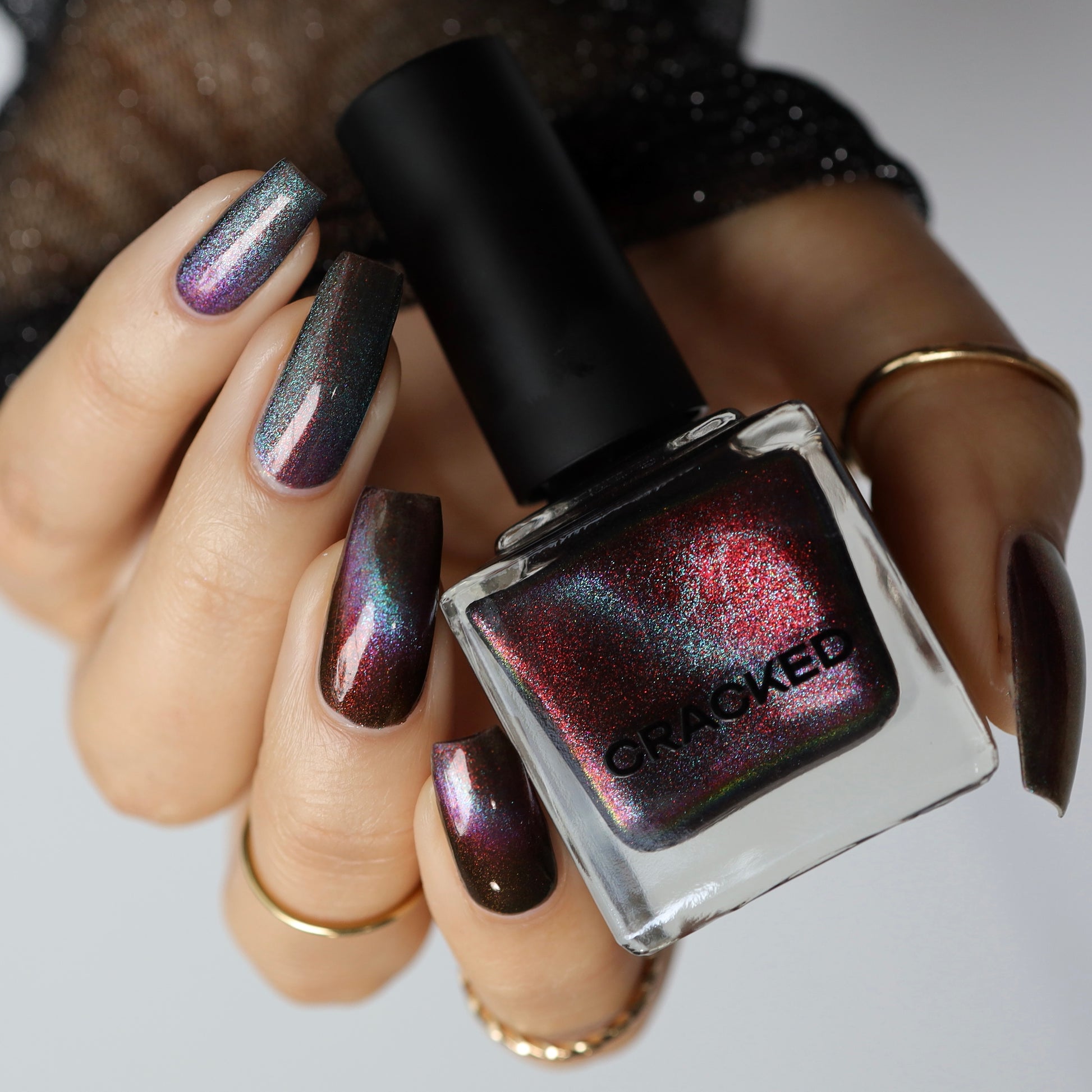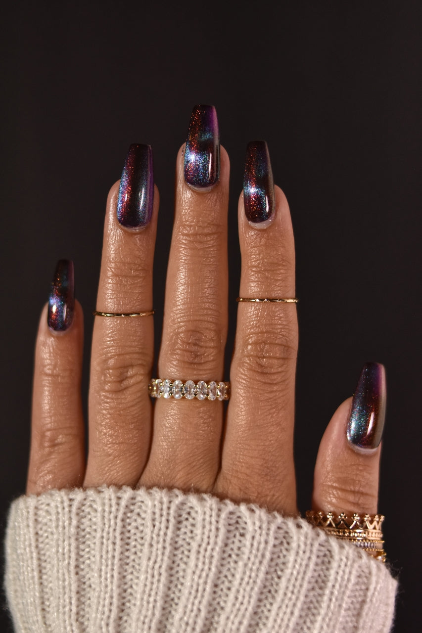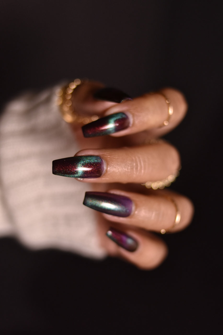 Our limited edition Jewel of the Ball turned heads. Heir Apparent is here to steal the spotlight. This rich red base glows with a regal shimmer, igniting under teal-to-purple magnetic pigments that shift like velvet curtains on a grand stage. A true showstopper, Heir Apparent is our crown jewel for Cracked Polish’s 2nd anniversary because we had to go all out for this milestone. Drenched in luxury, dripping in drama, and designed to reign supreme in your collection, this is the shade you’ll reach for when only the most powerful polish will do.