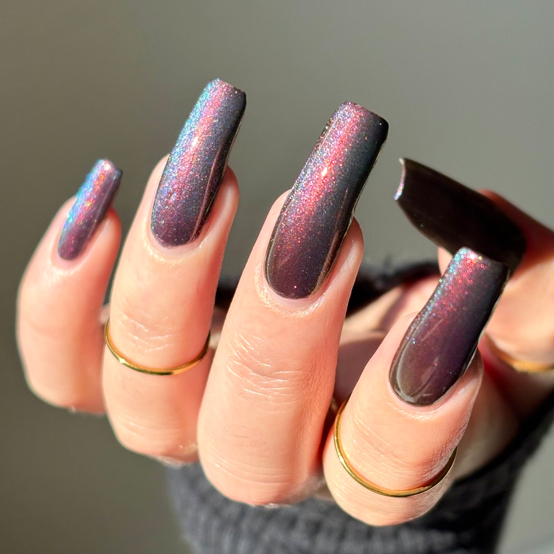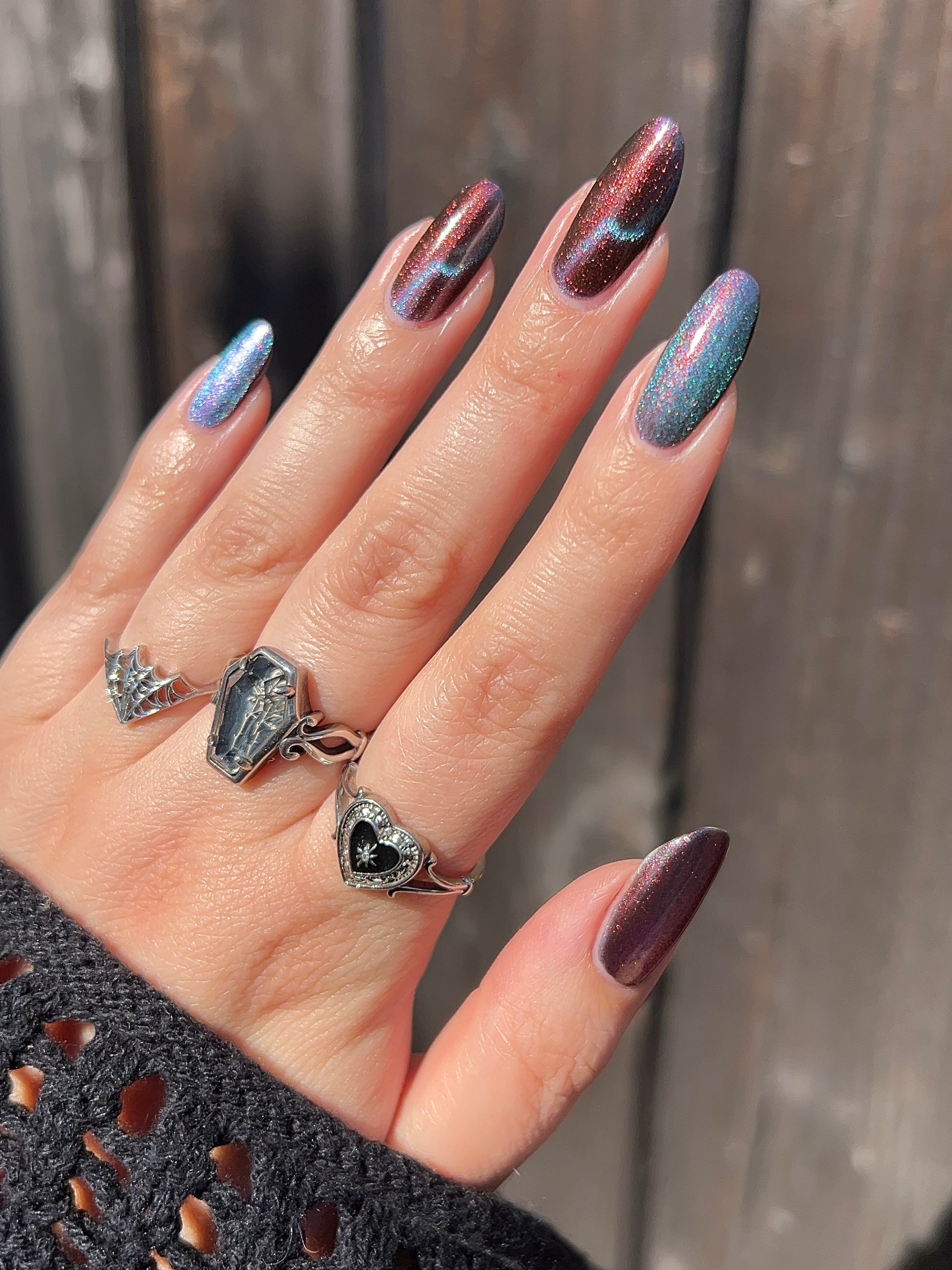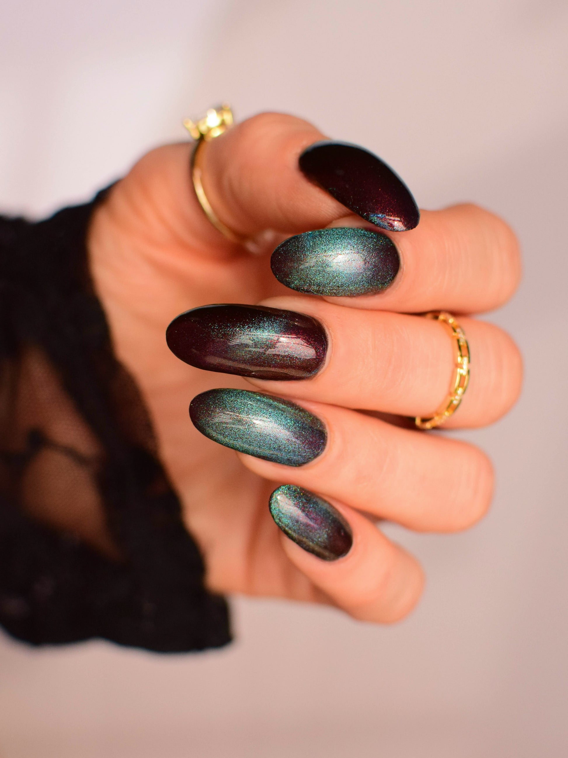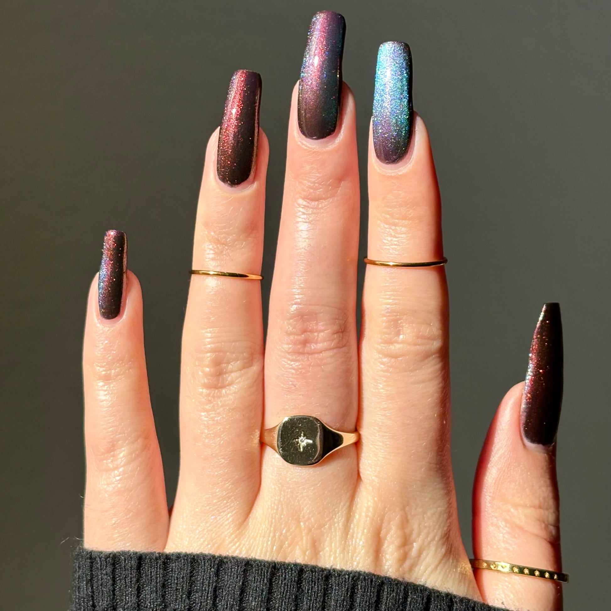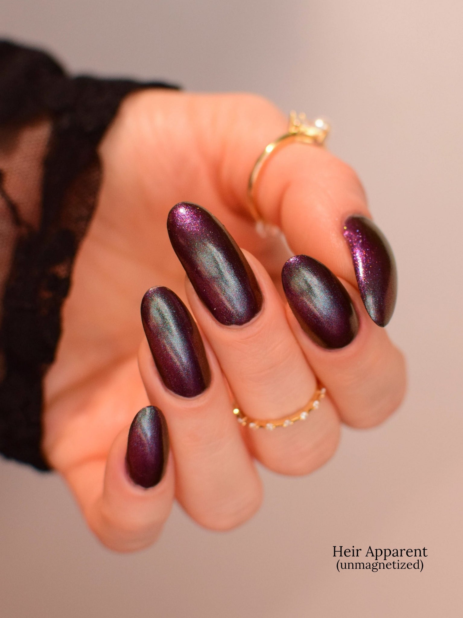 Our limited edition Jewel of the Ball turned heads. Heir Apparent is here to steal the spotlight. This rich red base glows with a regal shimmer, igniting under teal-to-purple magnetic pigments that shift like velvet curtains on a grand stage. A true showstopper, Heir Apparent is our crown jewel for Cracked Polish’s 2nd anniversary because we had to go all out for this milestone. Drenched in luxury, dripping in drama, and designed to reign supreme in your collection, this is the shade you’ll reach for when only the most powerful polish will do.