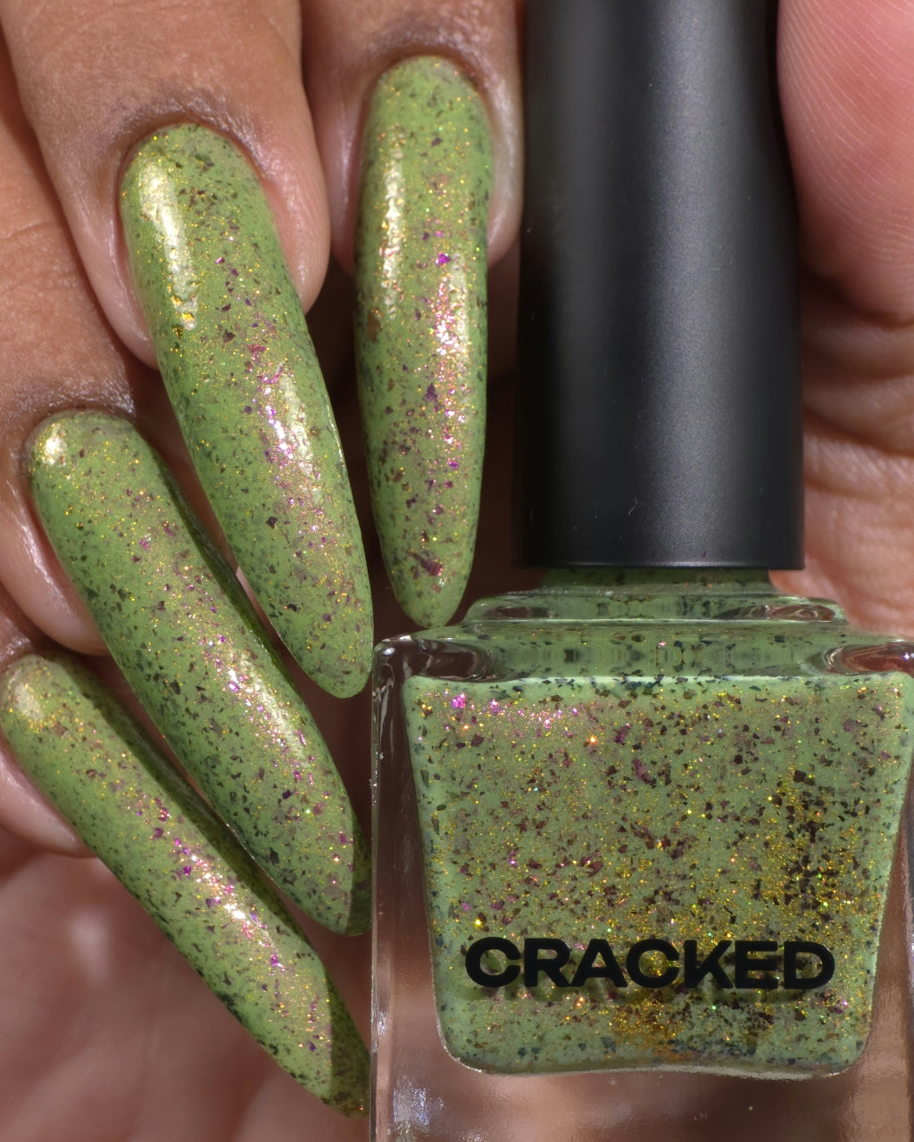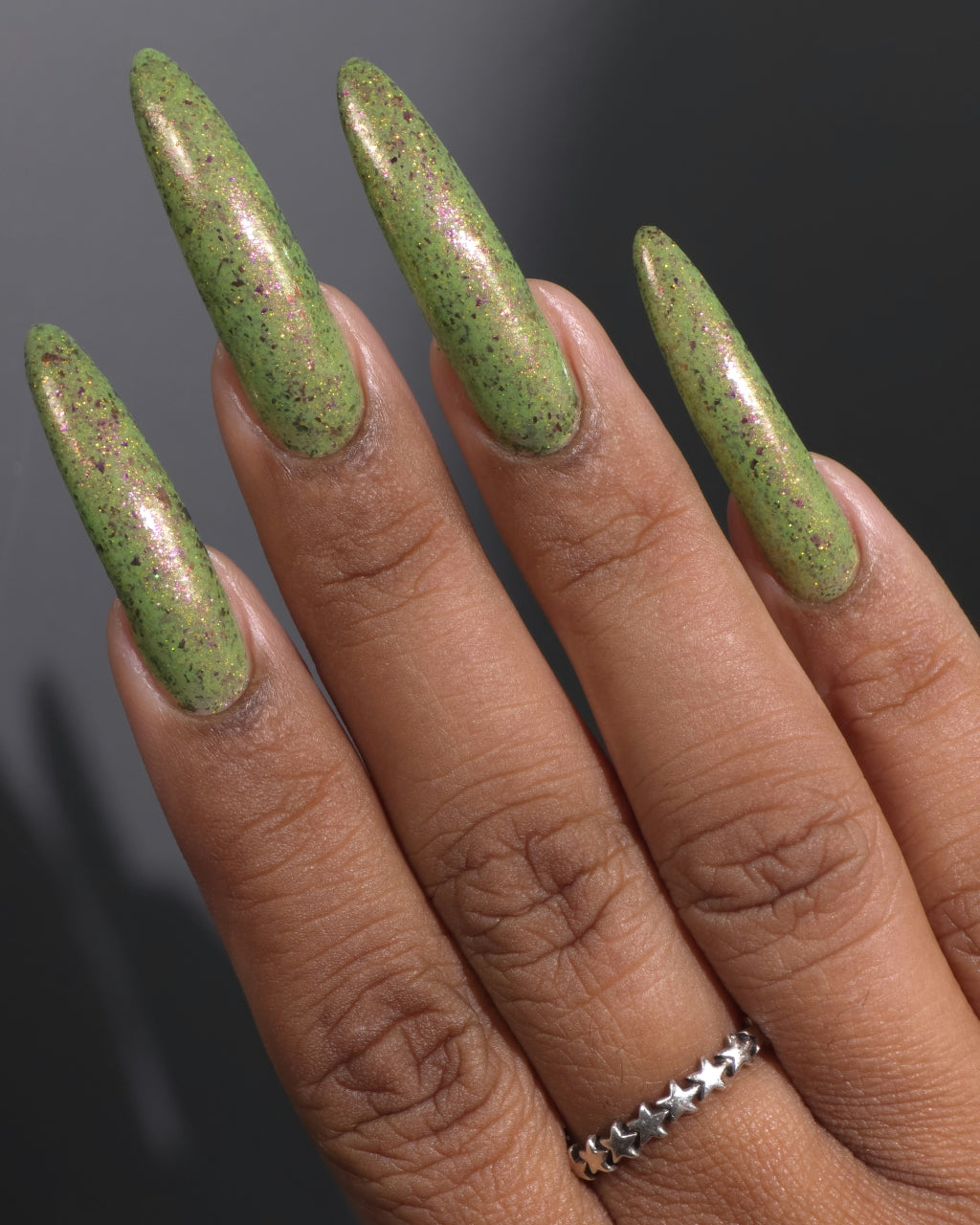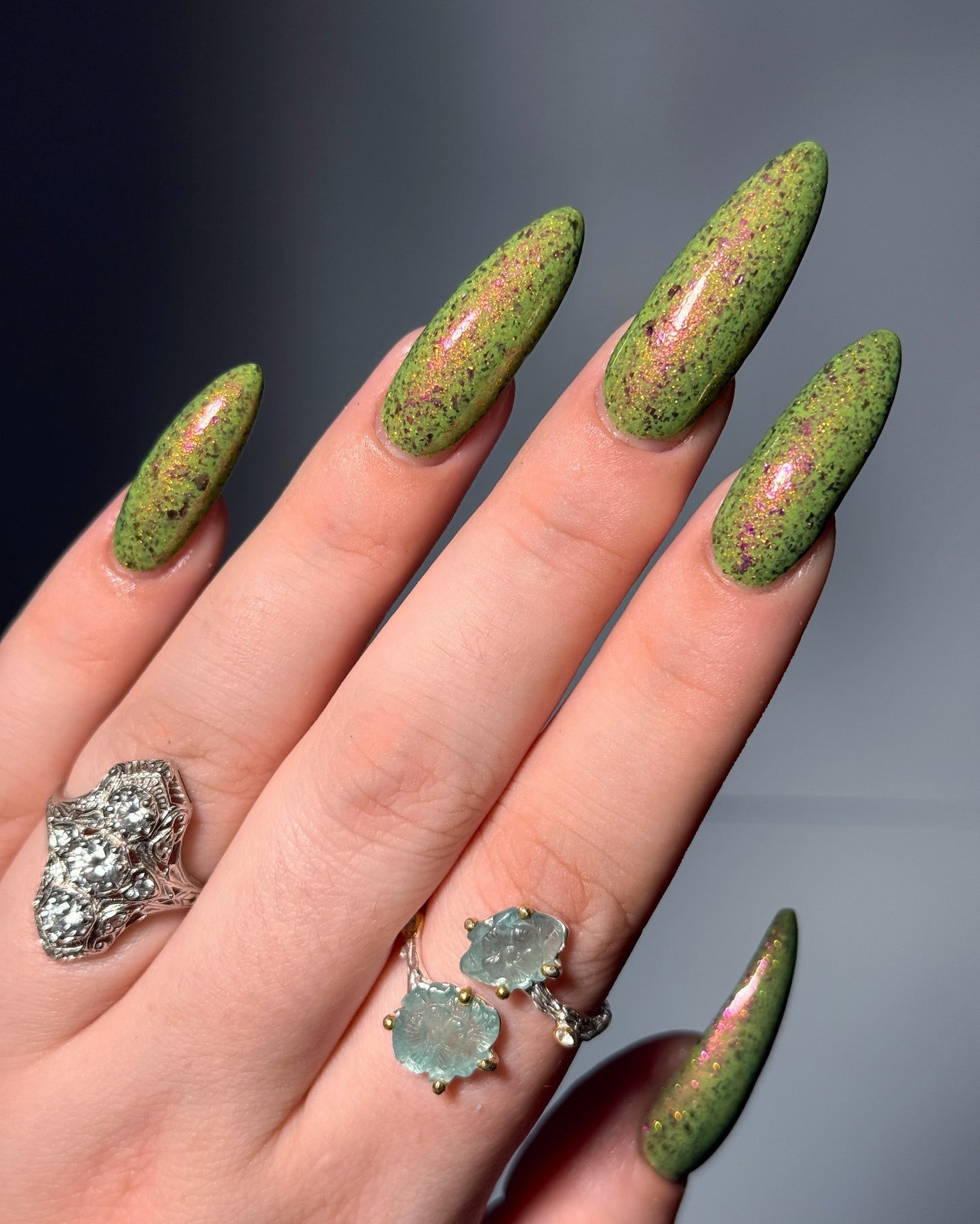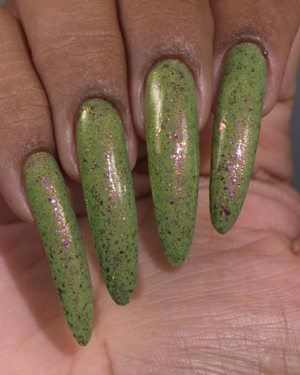 Bow before the king of my flakey polish era! Lord of the Greens reigns supreme in a lush apple-green base, brimming with green, gold, and magenta flakes that shift like enchanted forest light. Orange-to-gold shimmers crown each nail with a radiant gleam, giving every swipe a touch of magic. You already know I love making green polishes and this one is my full embrace of the flakey fantasy. Bold, vibrant, and impossible to ignore, this is a sovereign shade fit for any polish throne.