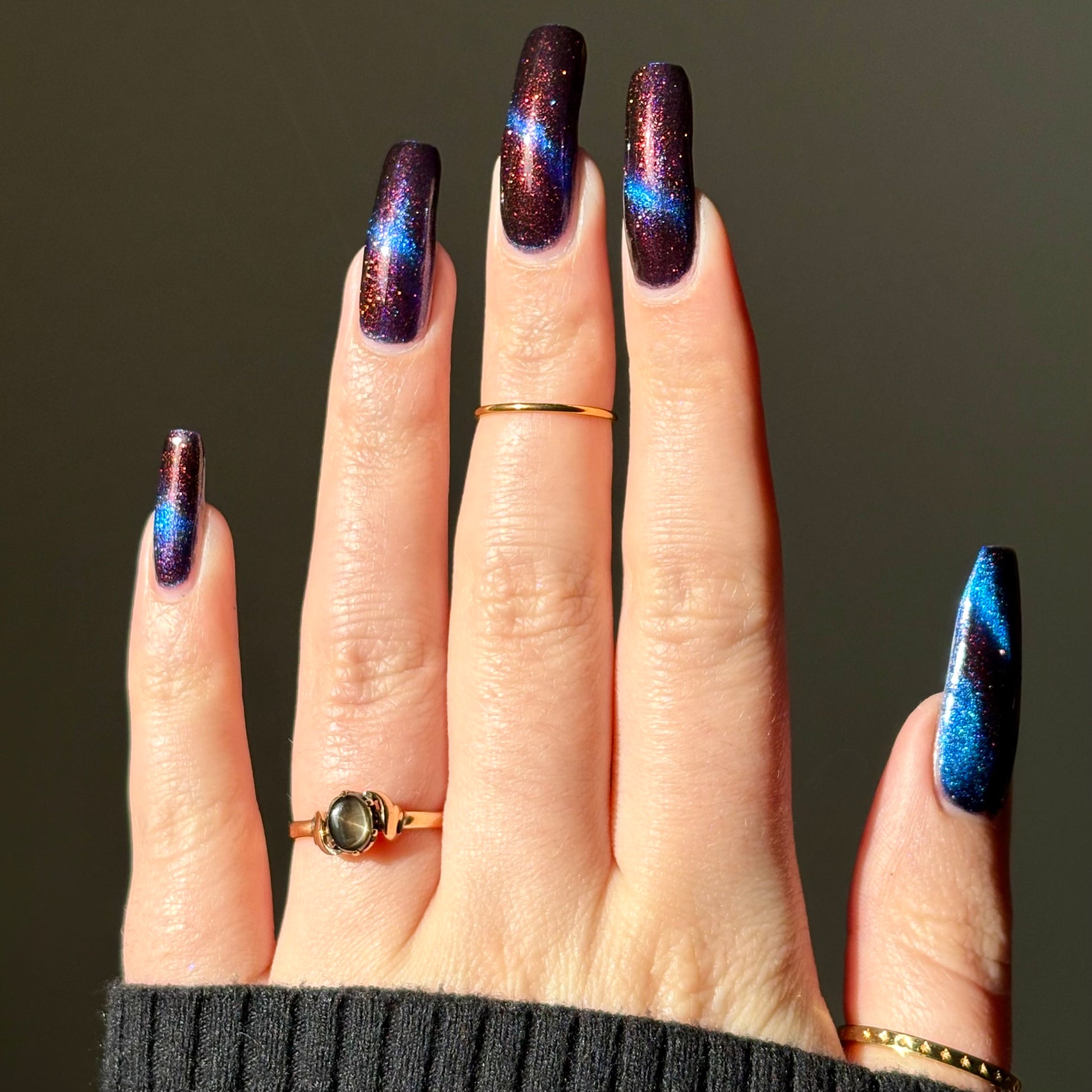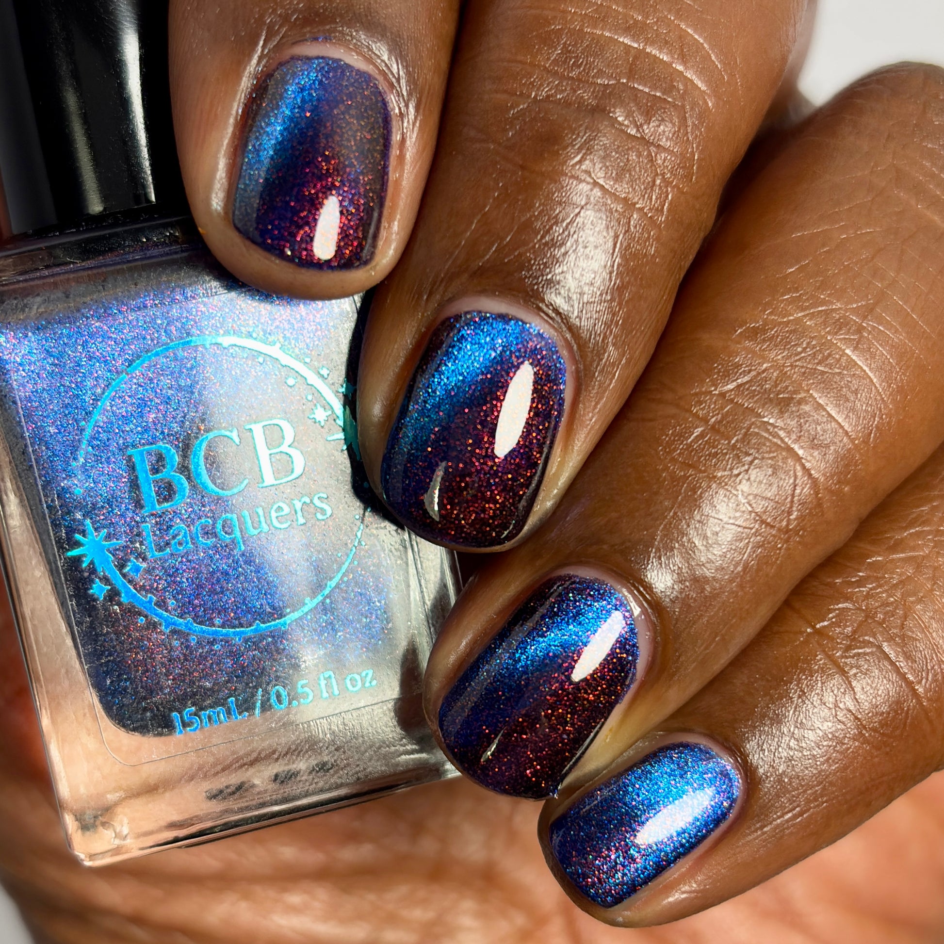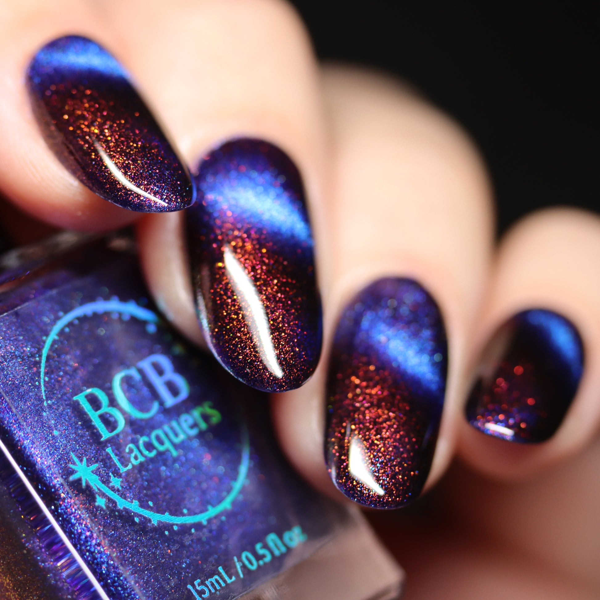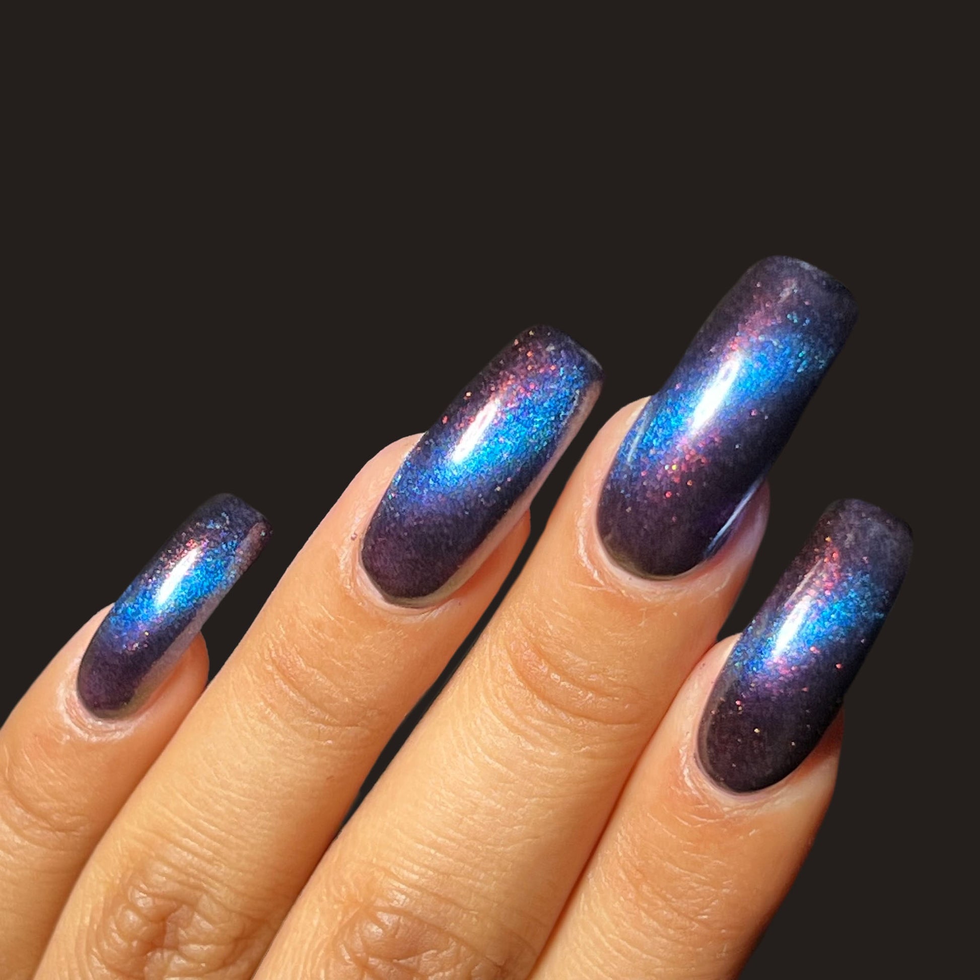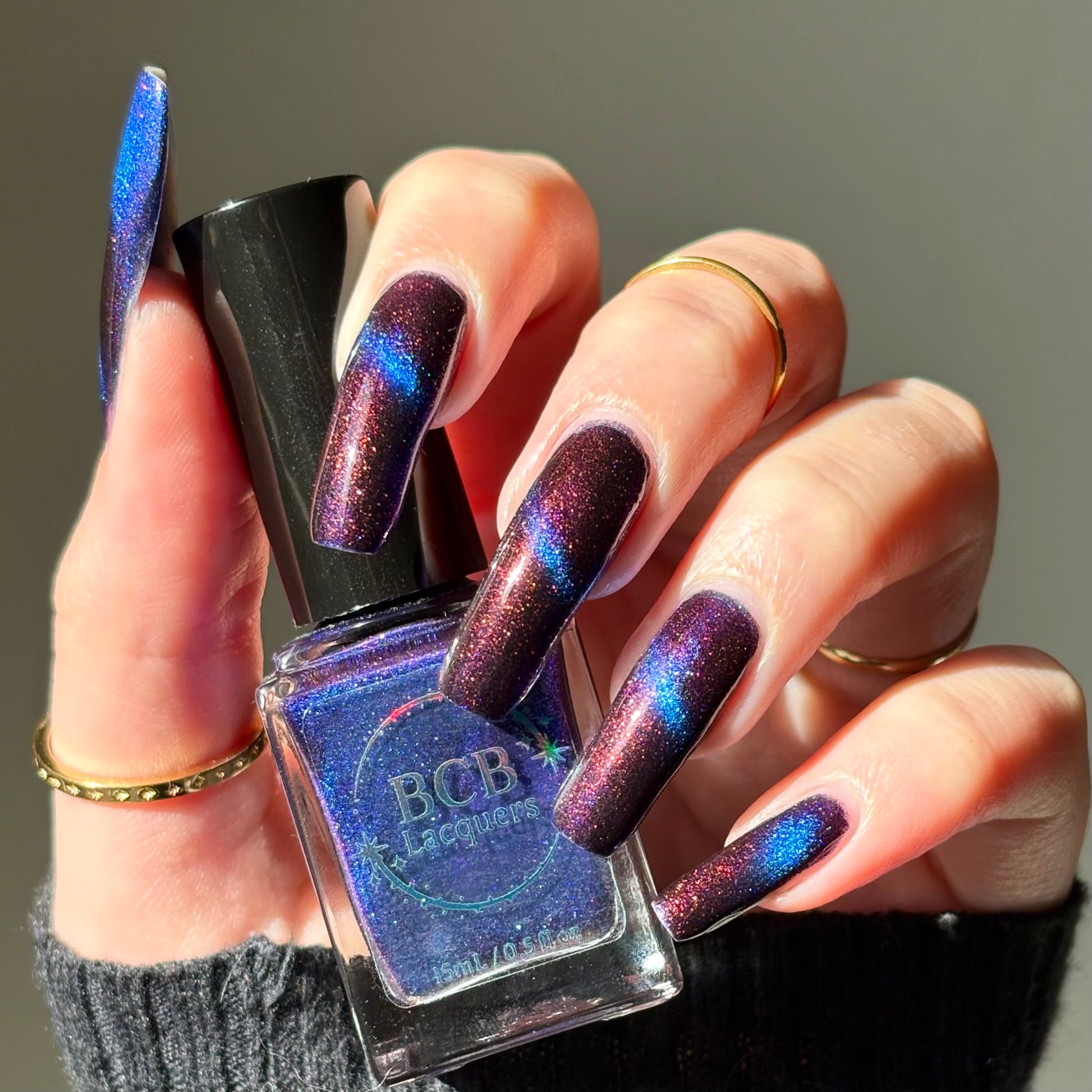 Nightshade by BCB Lacquer is a spellbinding addition to The Coven Trio, brewed for those who prefer their magic a little darker. A deep purple base sets the stage while a blue to purple multichrome magnetic pull shifts and bends with the light, creating a hypnotic, otherworldly effect. Threads of red, orange, gold, and green shifting shimmer weave through the shade, giving it an unmistakable spooky Halloween undertone.