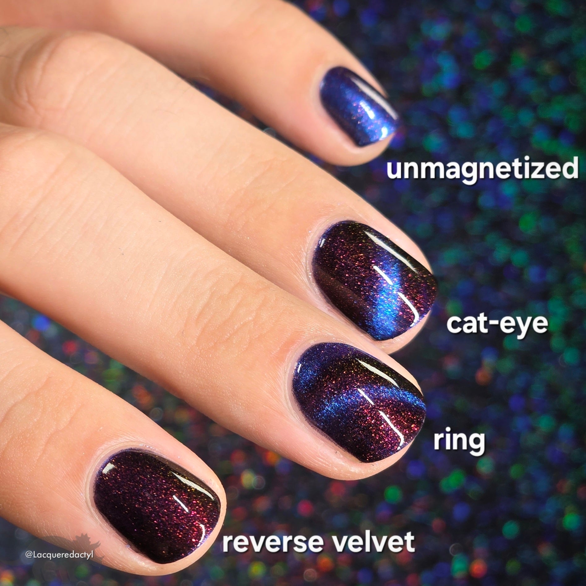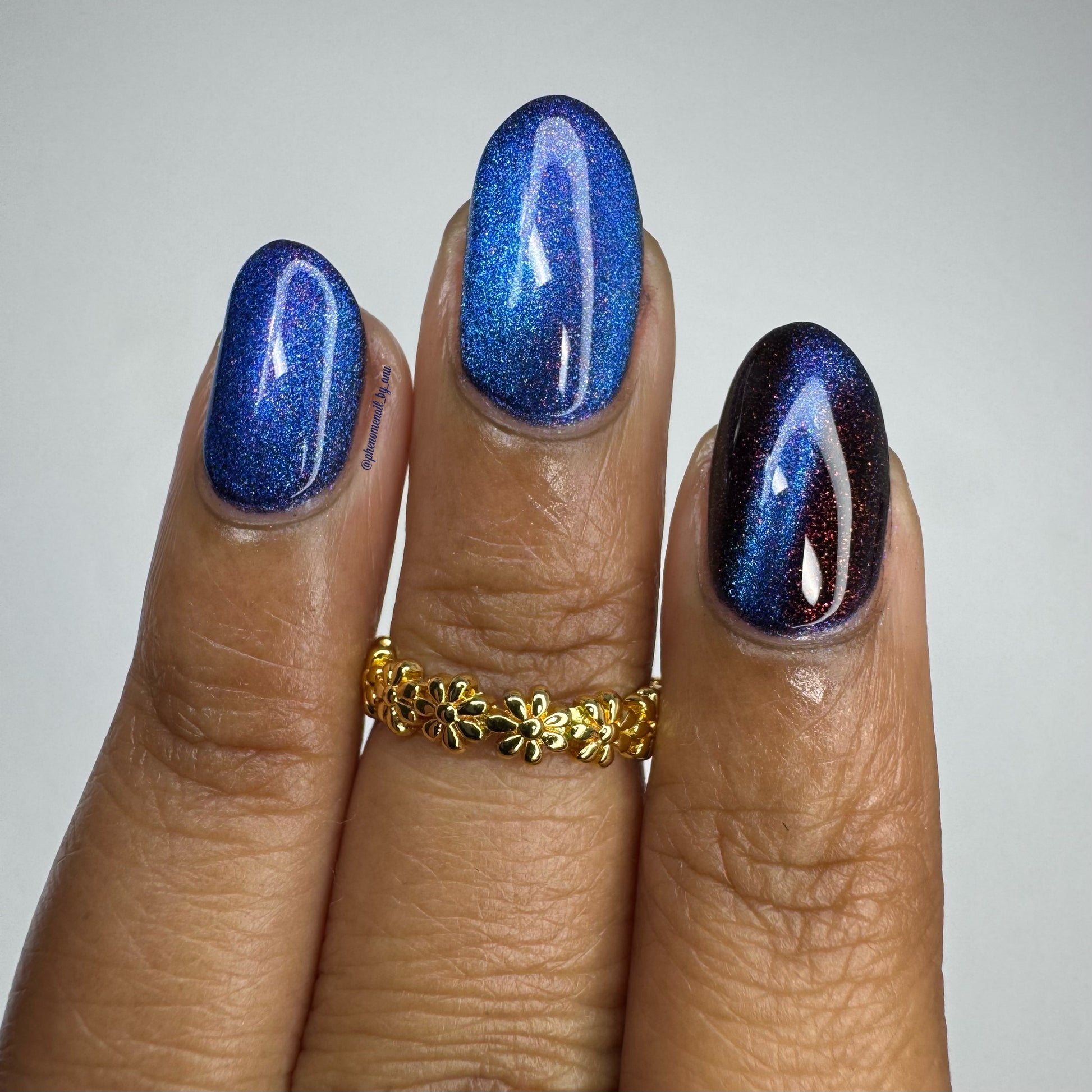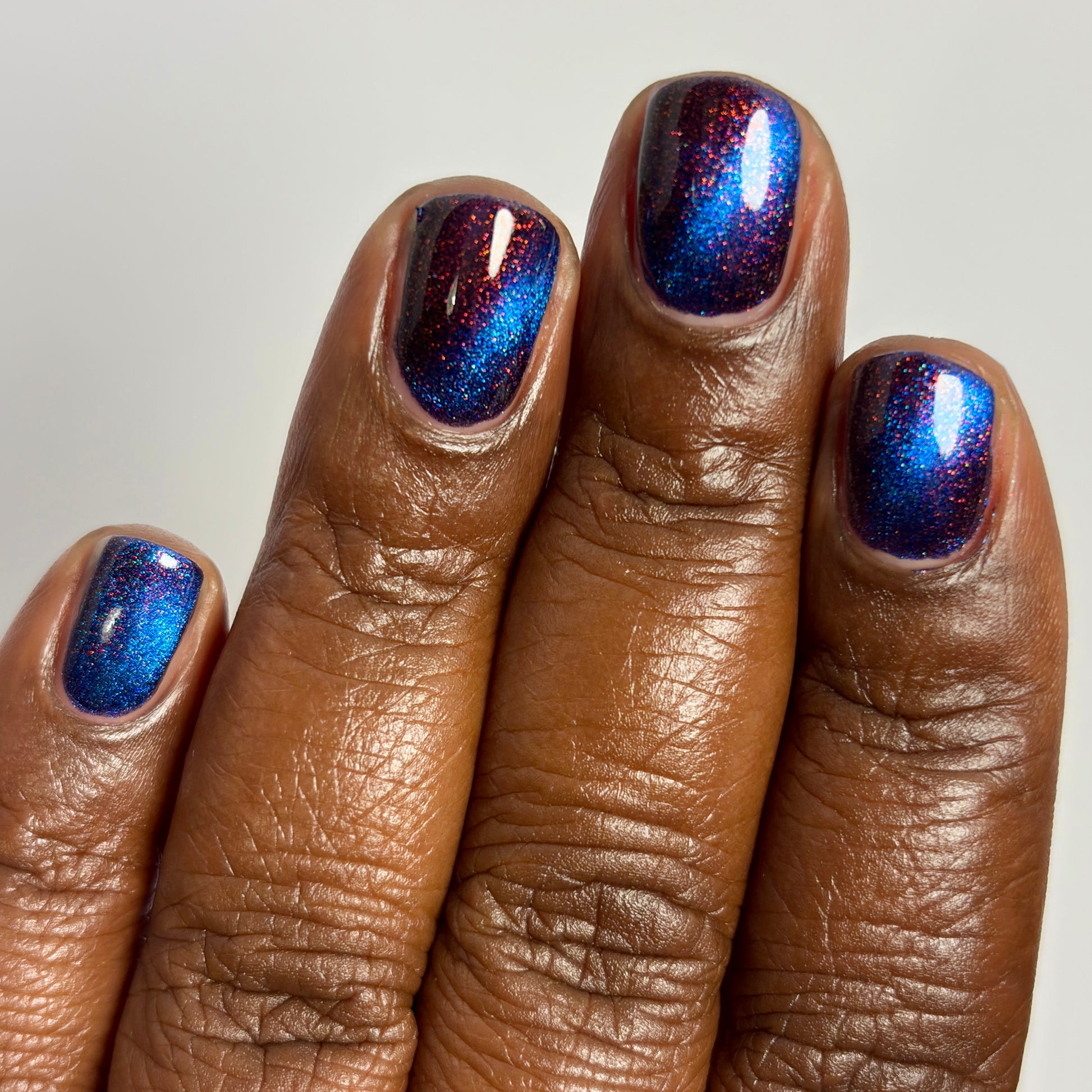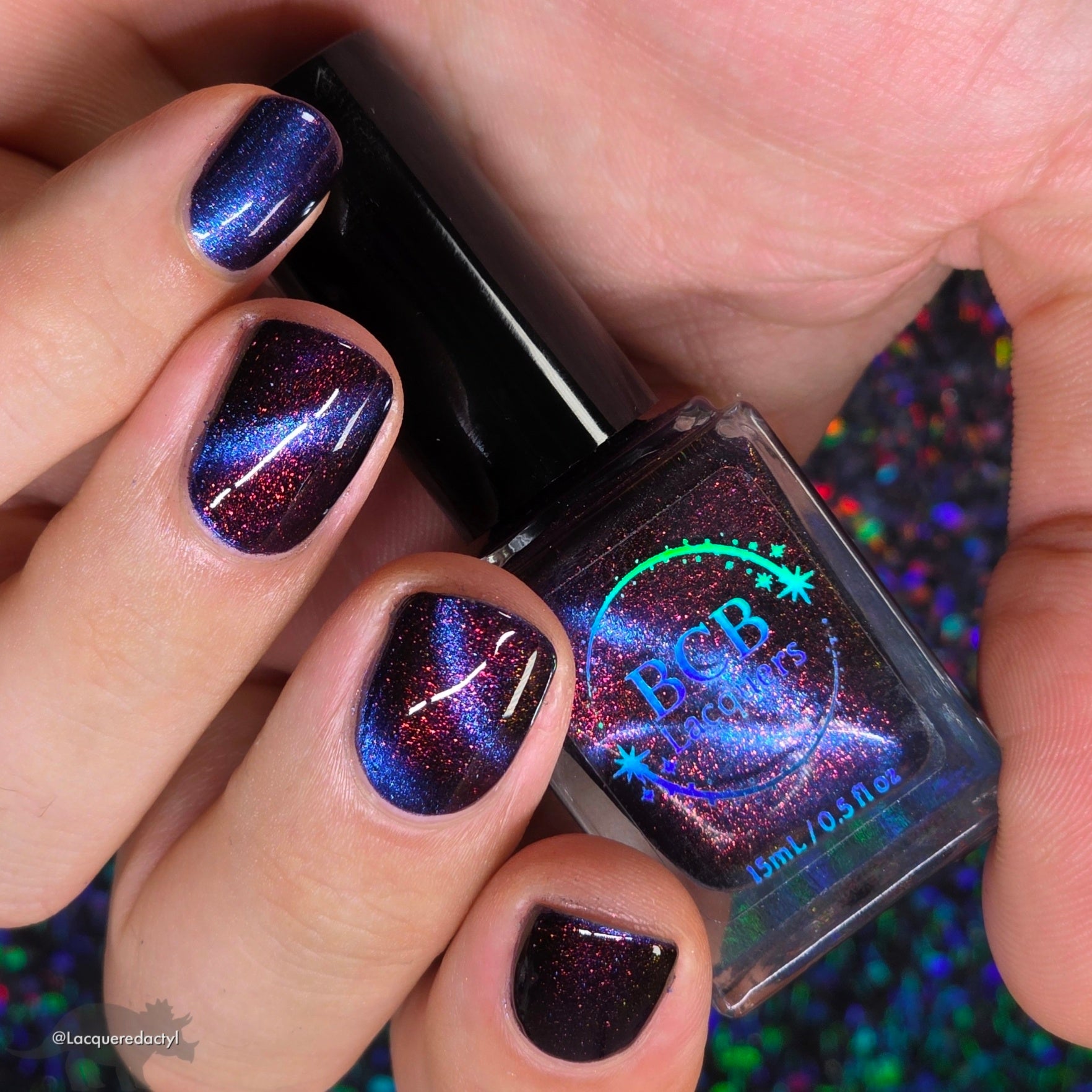 Nightshade by BCB Lacquer is a spellbinding addition to The Coven Trio, brewed for those who prefer their magic a little darker. A deep purple base sets the stage while a blue to purple multichrome magnetic pull shifts and bends with the light, creating a hypnotic, otherworldly effect. Threads of red, orange, gold, and green shifting shimmer weave through the shade, giving it an unmistakable spooky Halloween undertone.