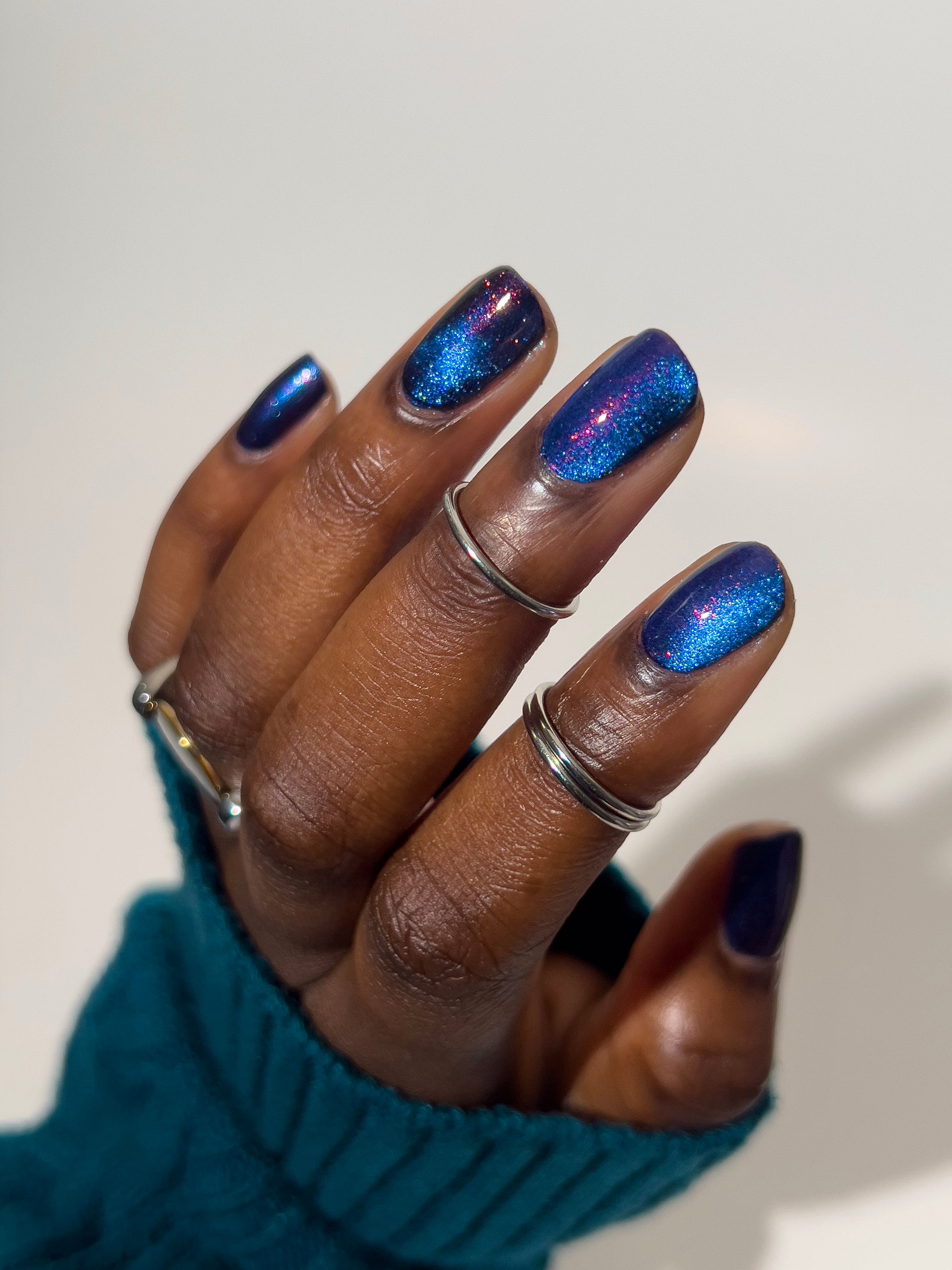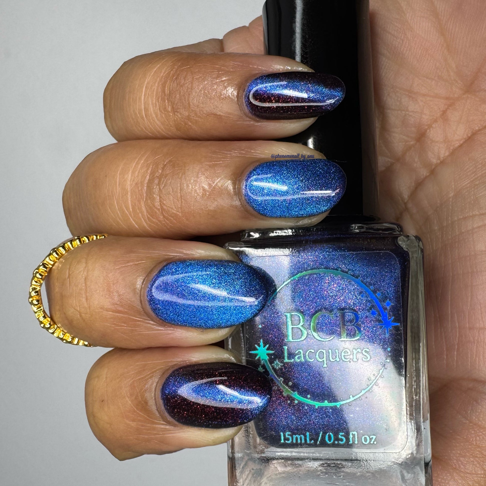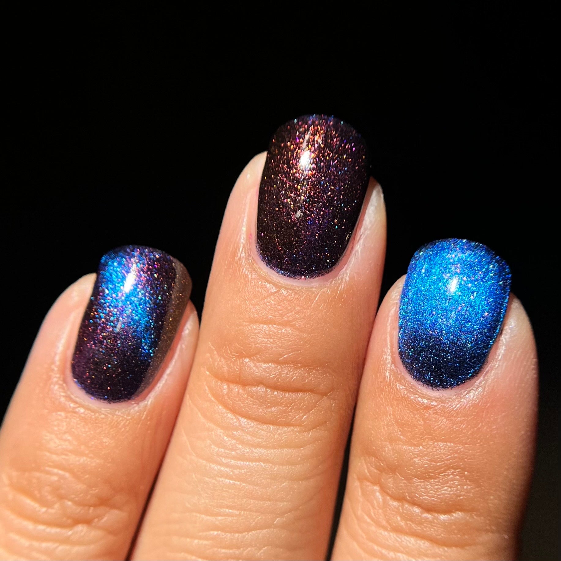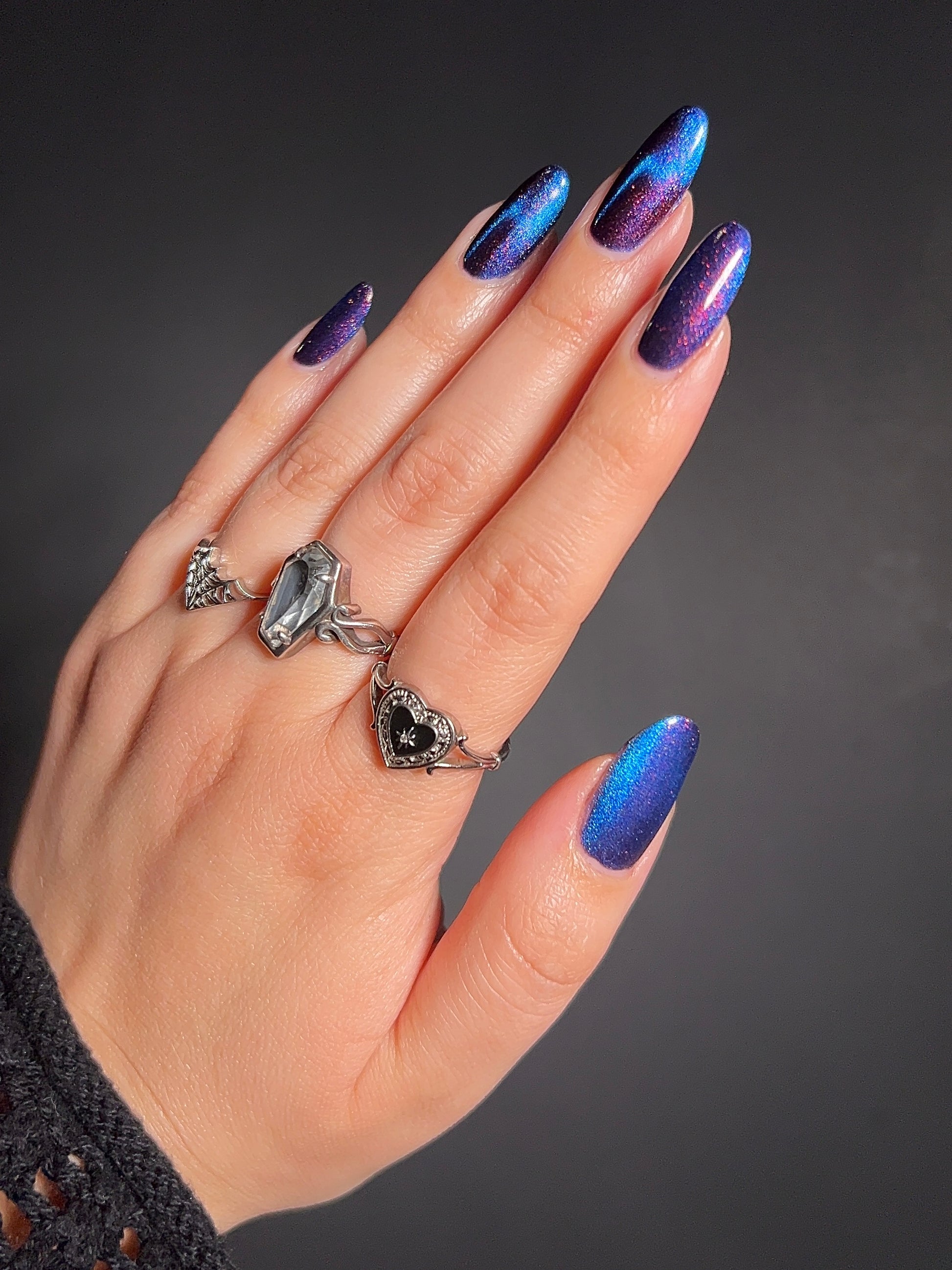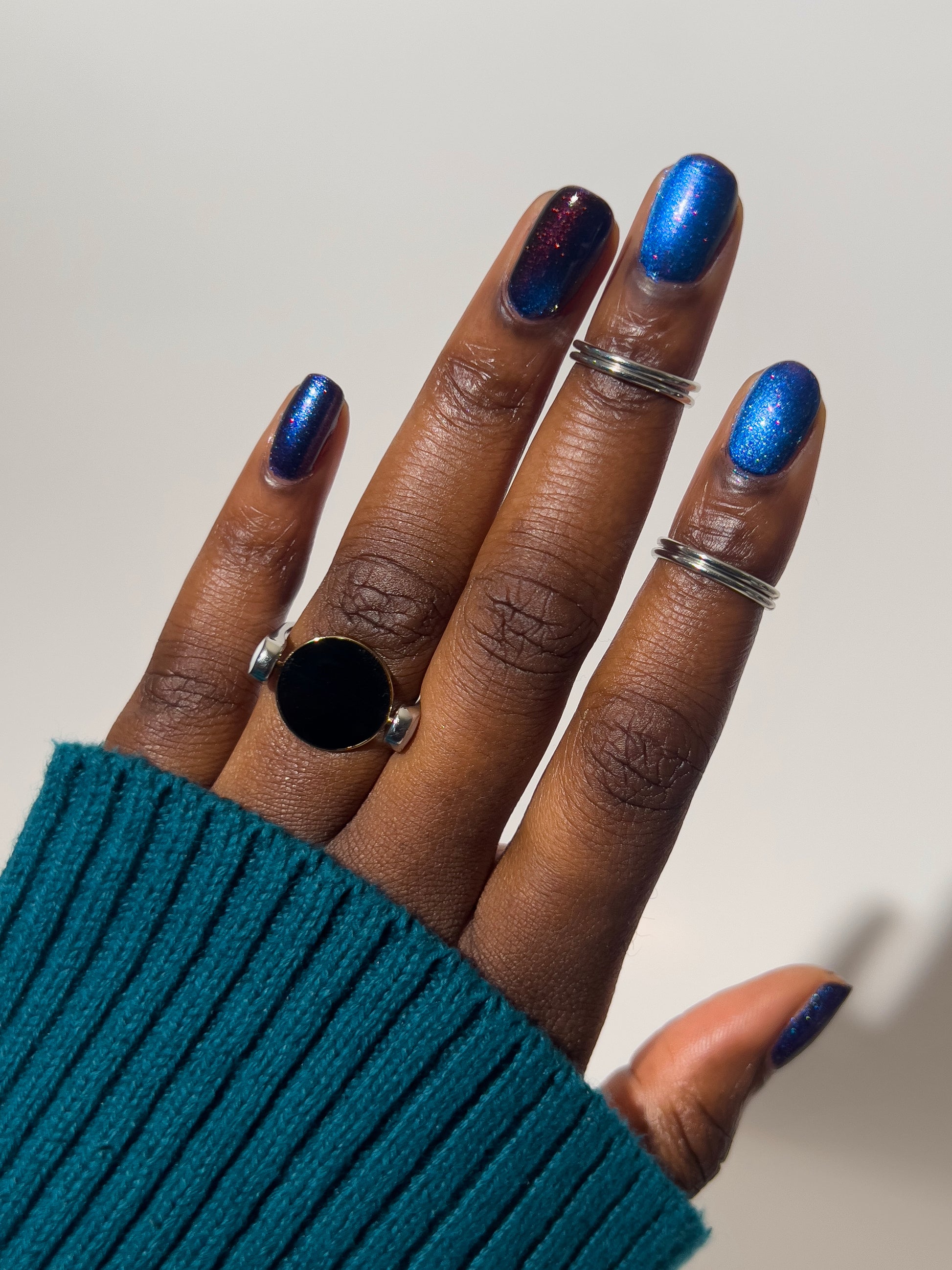 Nightshade by BCB Lacquer is a spellbinding addition to The Coven Trio, brewed for those who prefer their magic a little darker. A deep purple base sets the stage while a blue to purple multichrome magnetic pull shifts and bends with the light, creating a hypnotic, otherworldly effect. Threads of red, orange, gold, and green shifting shimmer weave through the shade, giving it an unmistakable spooky Halloween undertone.