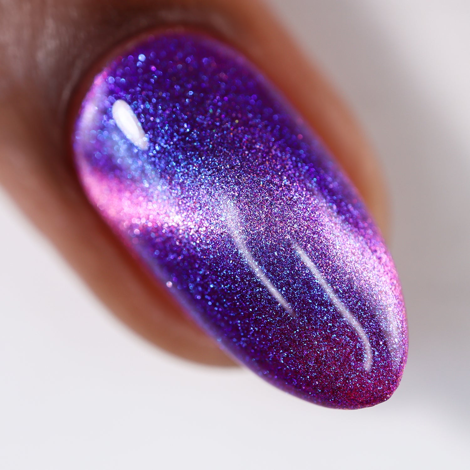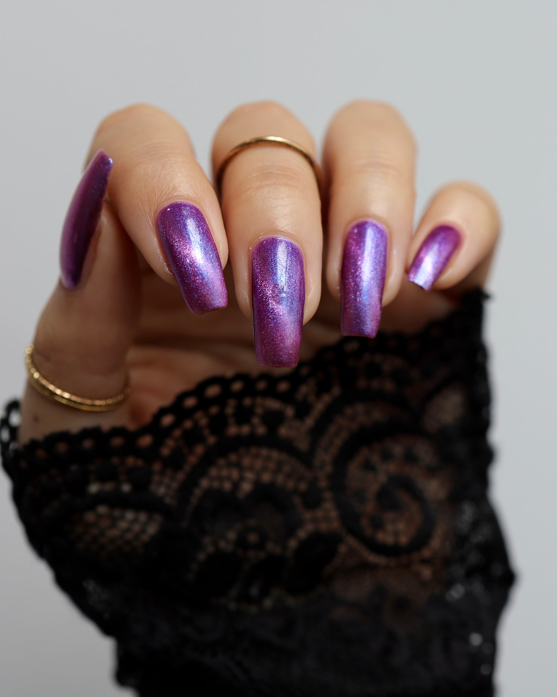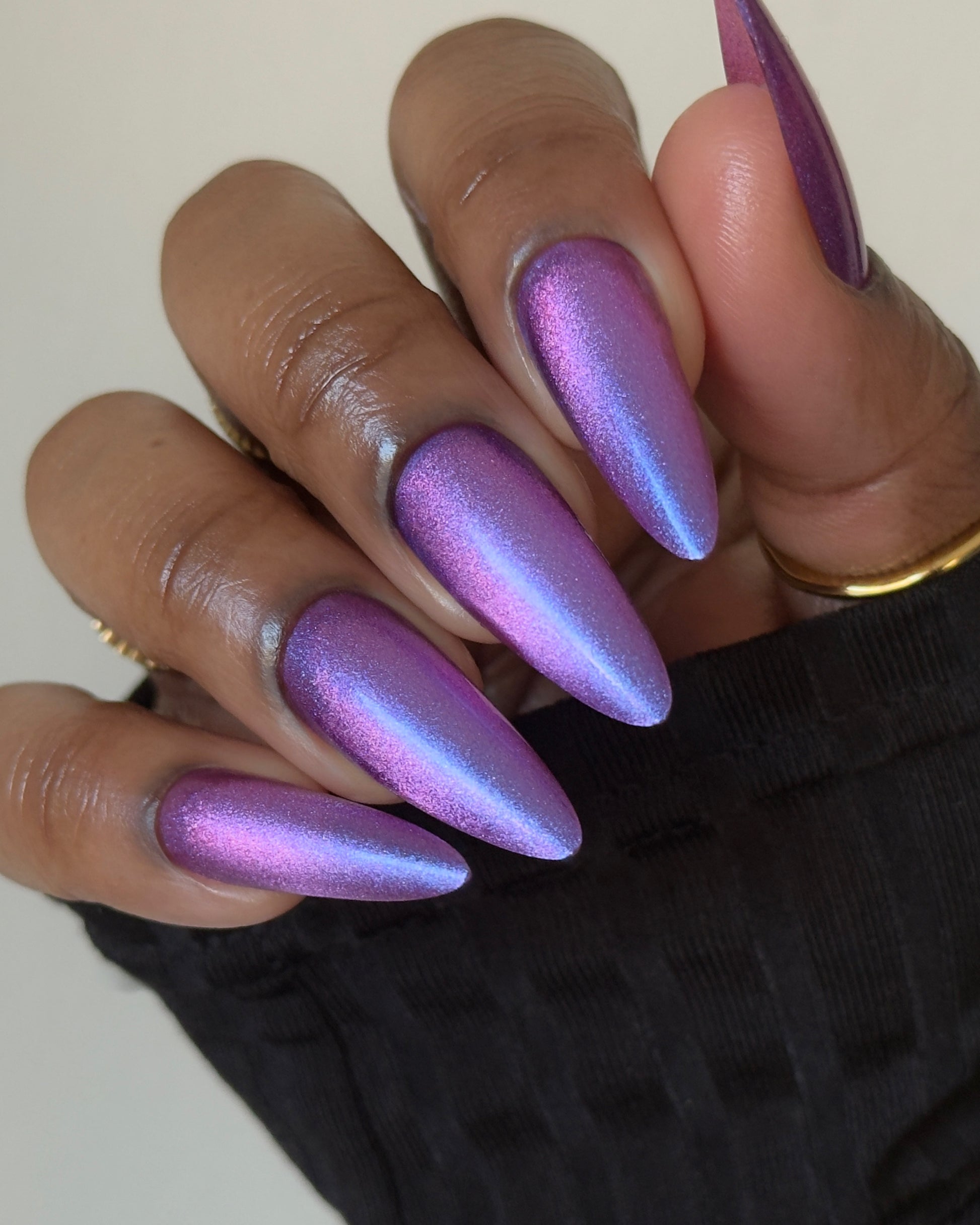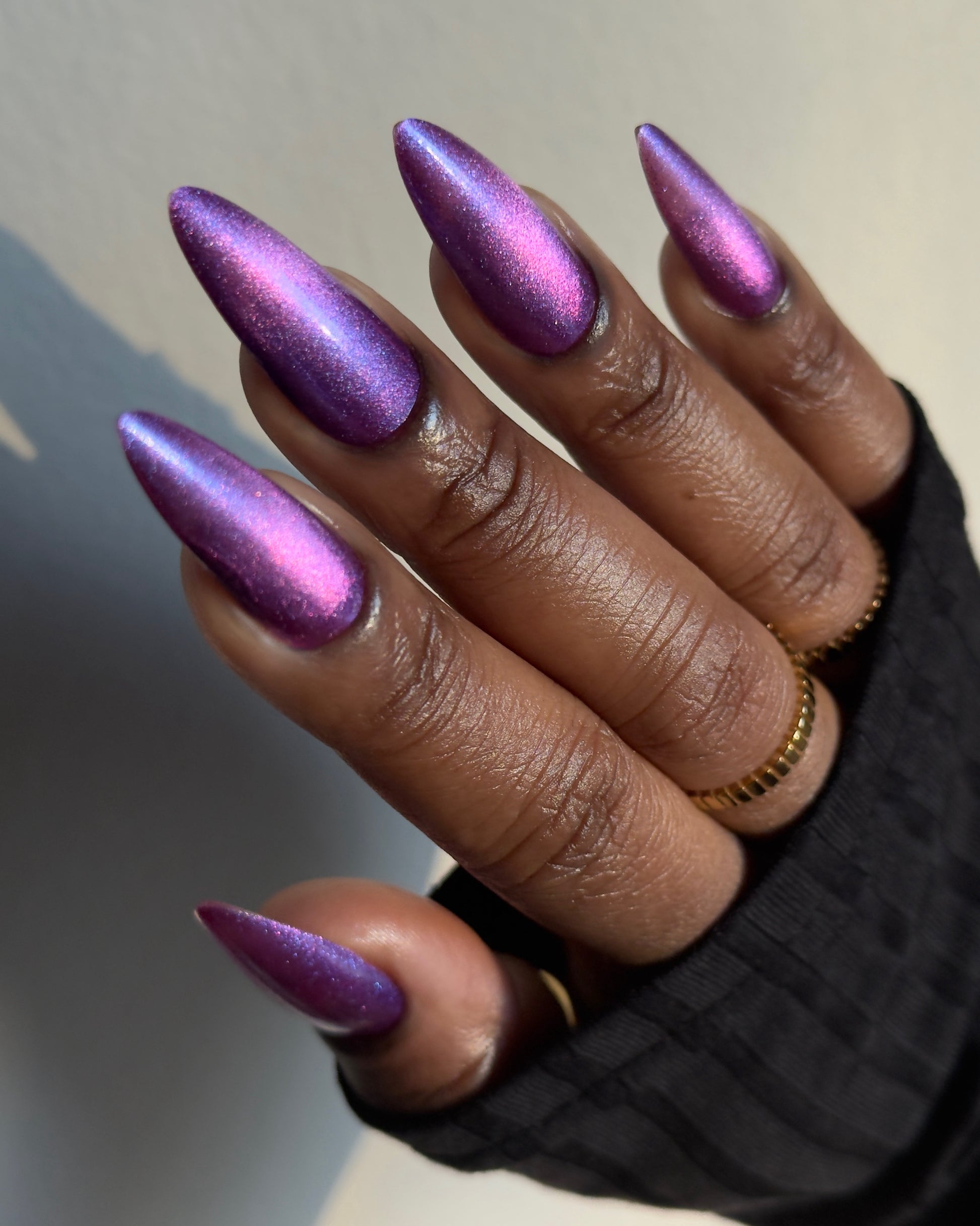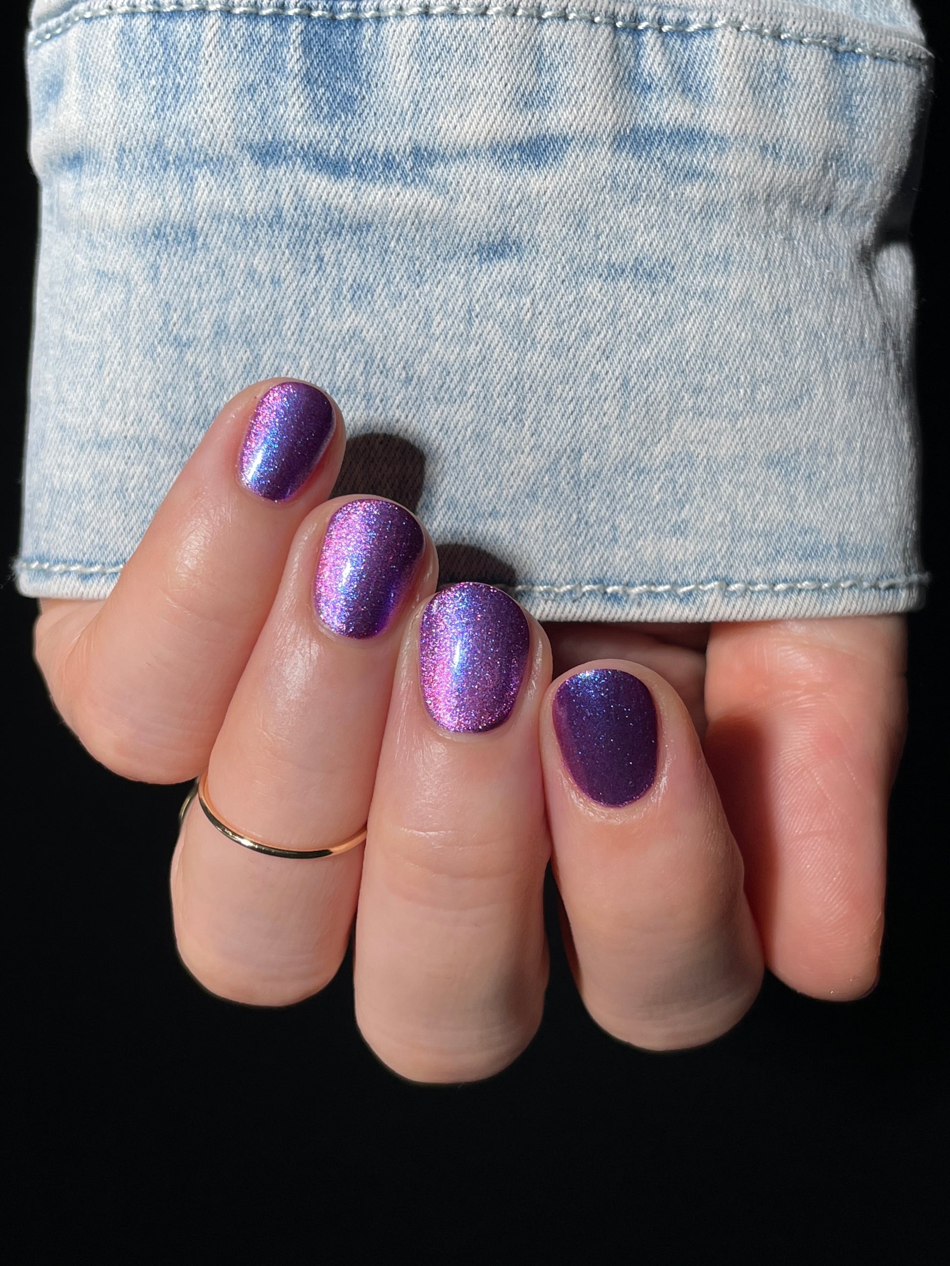No Reservations is a blurple base lit up with glowing blue aurora shimmers and soft pink magnetic pigments that shift and flirt with the light. Inspired by that all-too-familiar moment of walking into a restaurant starving, only to find it completely jam packed. This shade is a little chaotic, a little dramatic, and totally relatable. The cool blue glow and warm pink pull create a push-and-pull effect on the nails that feels spontaneous and unplanned, but somehow still works beautifully. A reminder that even when you should’ve planned better, things can still turn out pretty great.