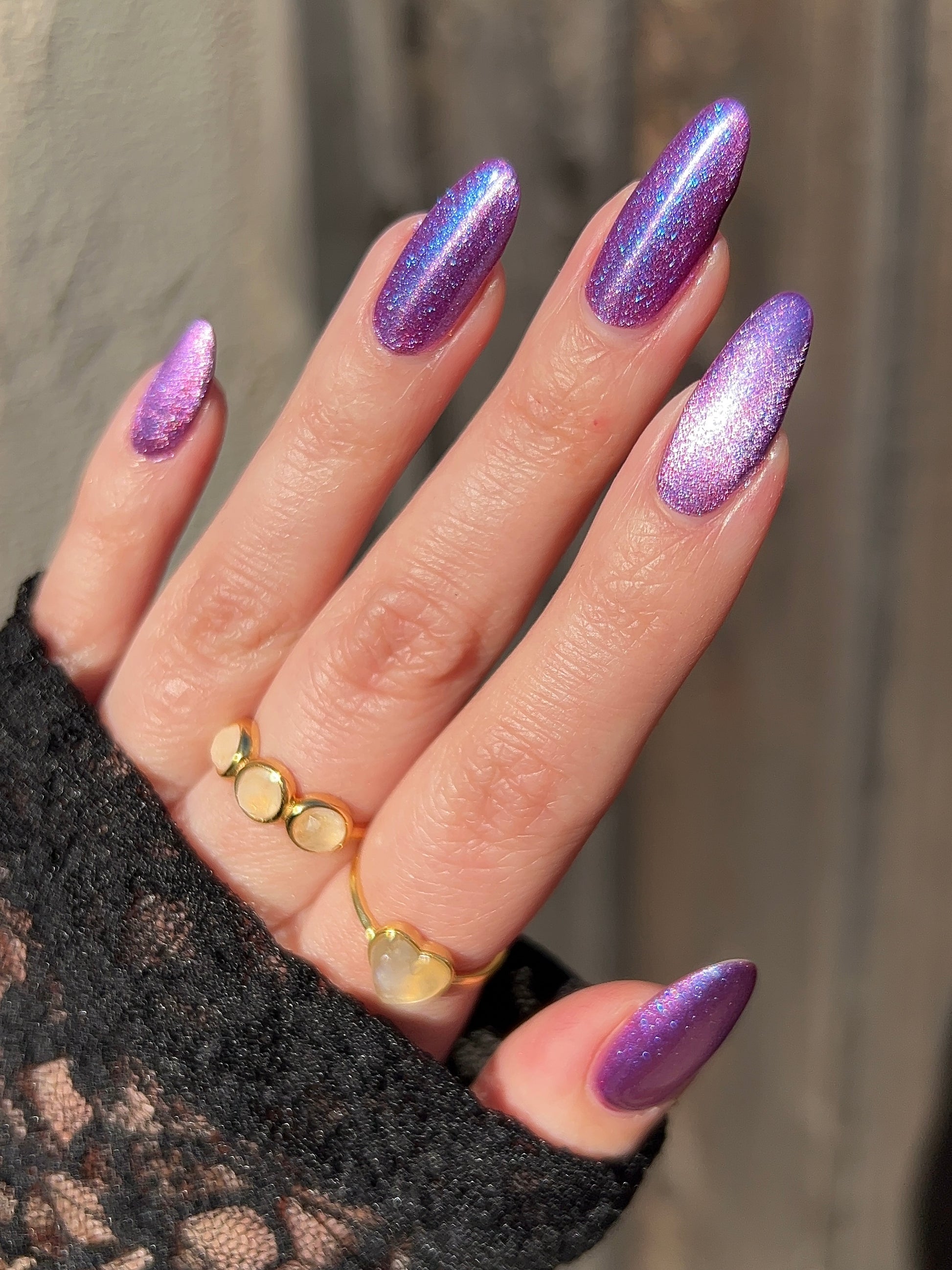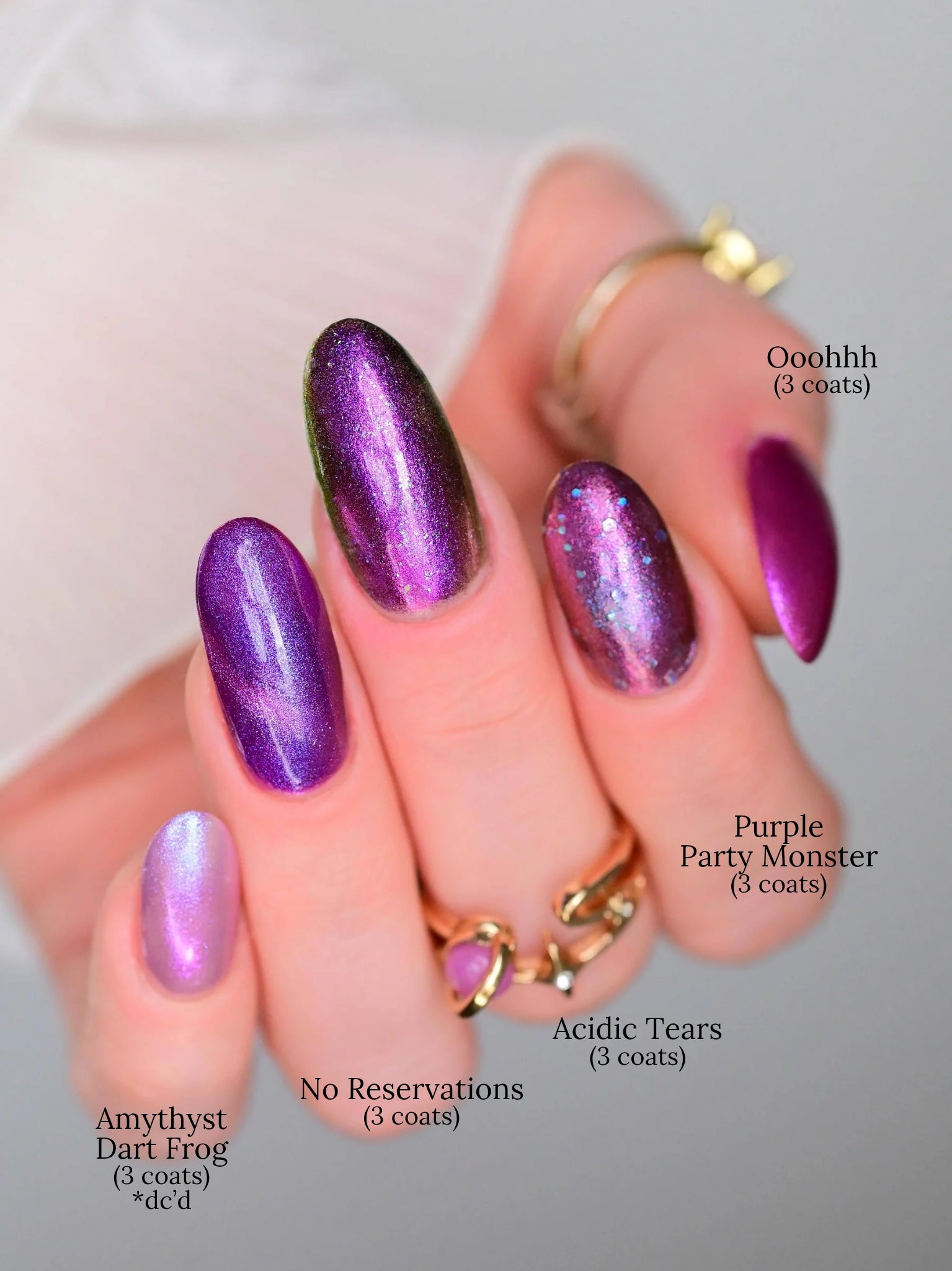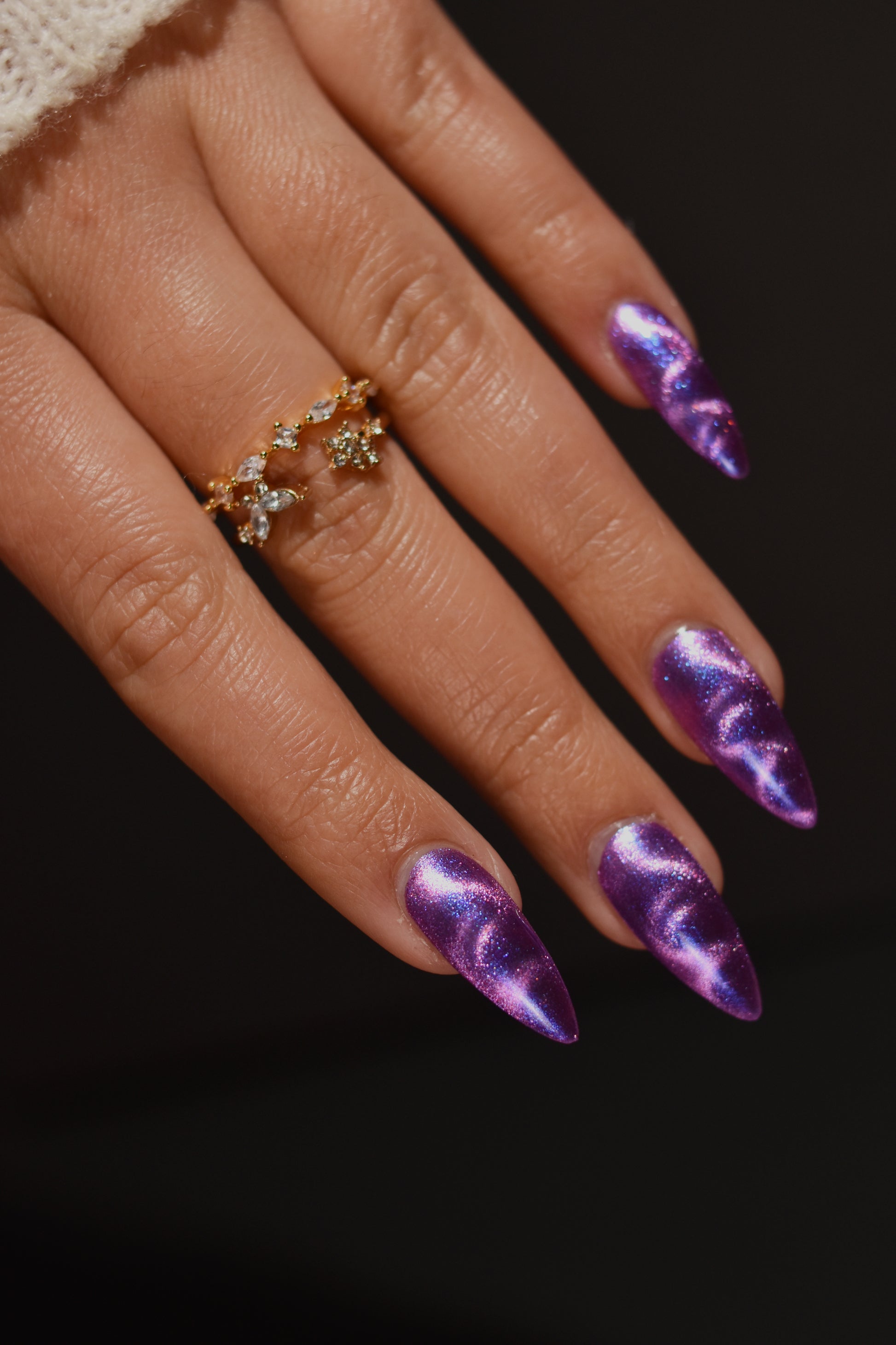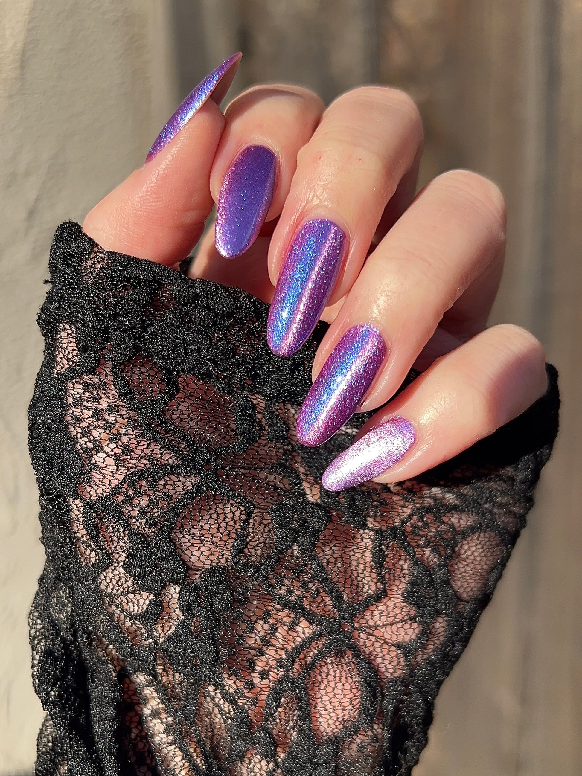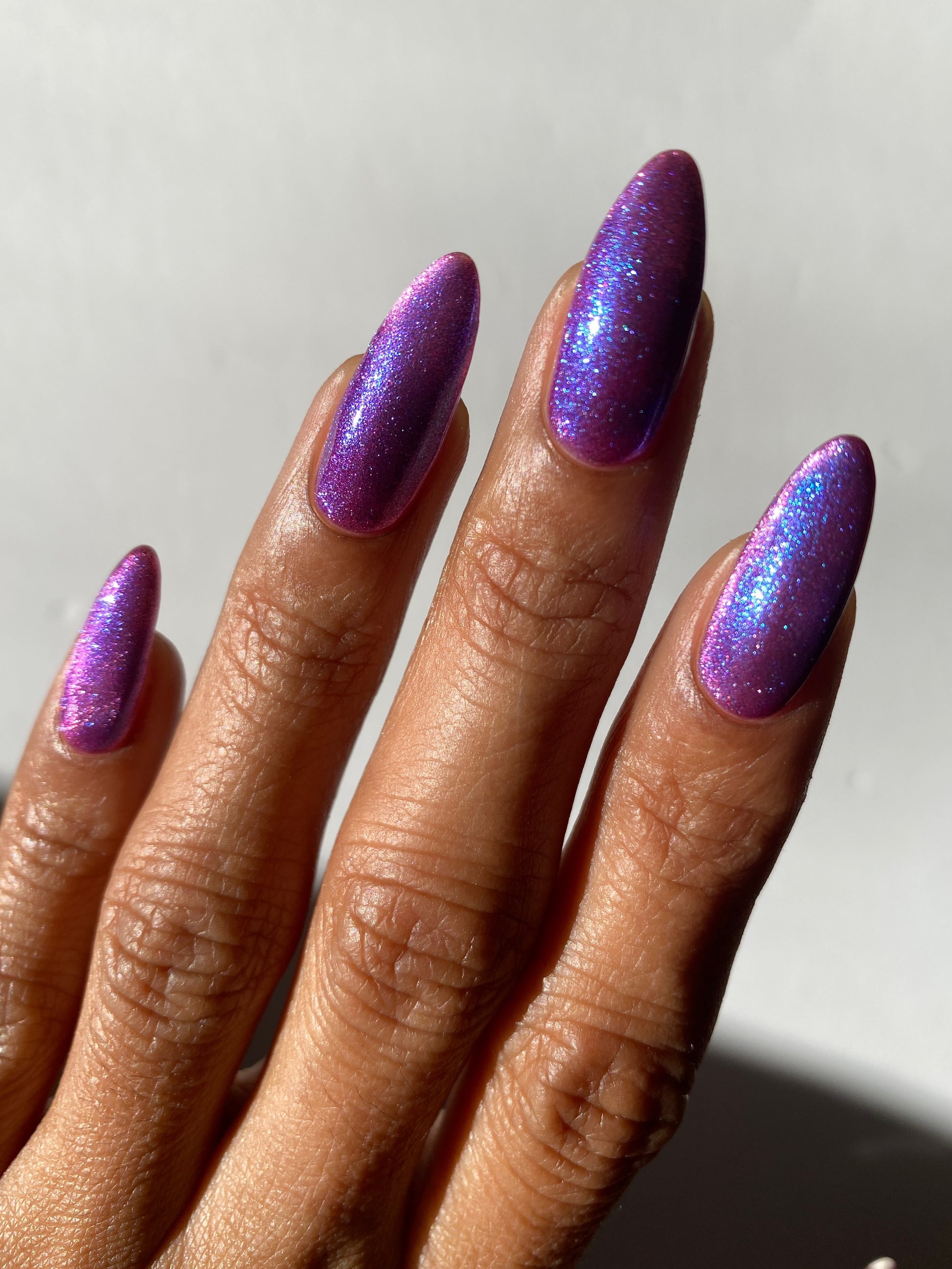 No Reservations is a blurple base lit up with glowing blue aurora shimmers and soft pink magnetic pigments that shift and flirt with the light. Inspired by that all-too-familiar moment of walking into a restaurant starving, only to find it completely jam packed. This shade is a little chaotic, a little dramatic, and totally relatable. The cool blue glow and warm pink pull create a push-and-pull effect on the nails that feels spontaneous and unplanned, but somehow still works beautifully. A reminder that even when you should’ve planned better, things can still turn out pretty great.