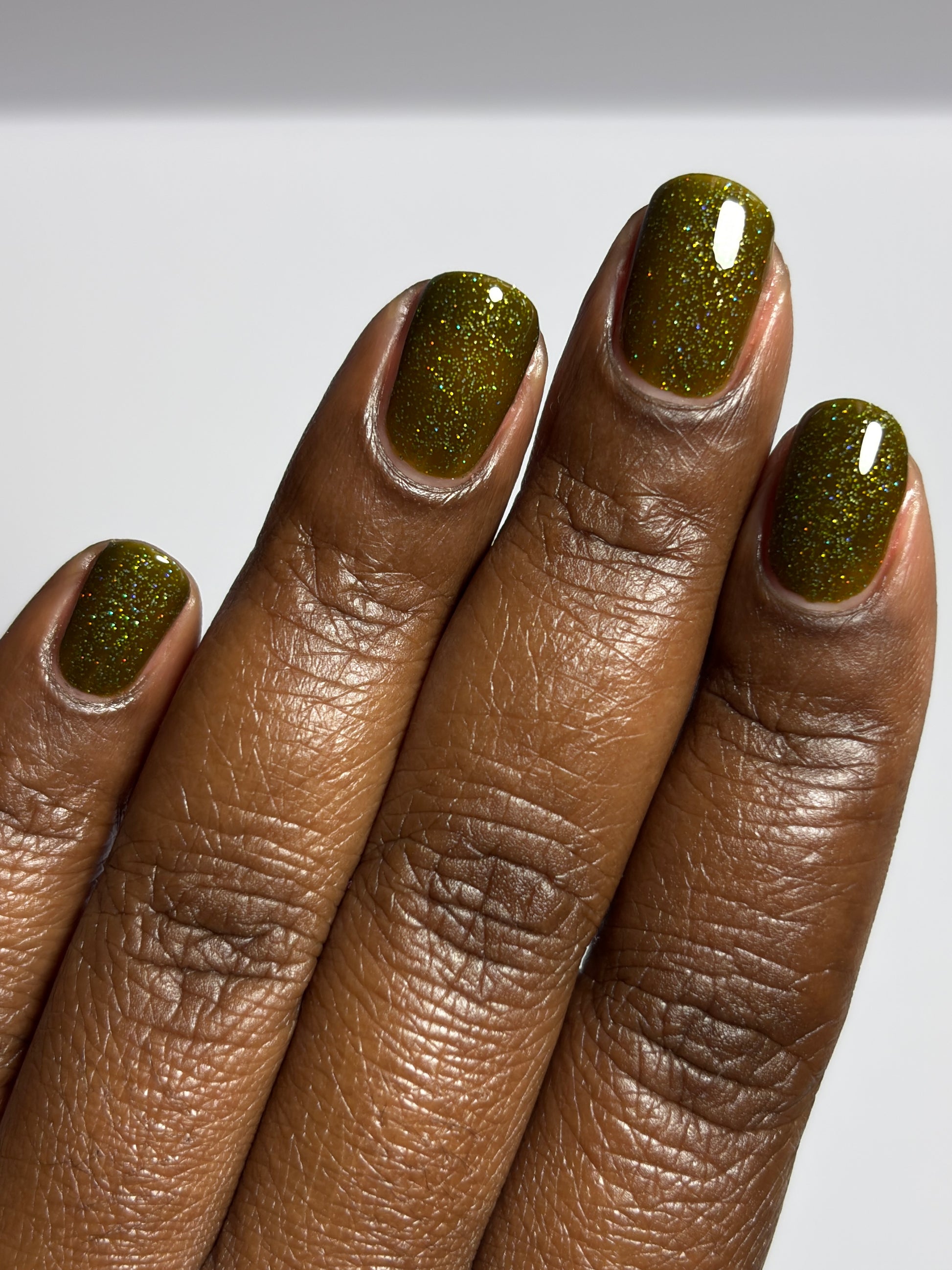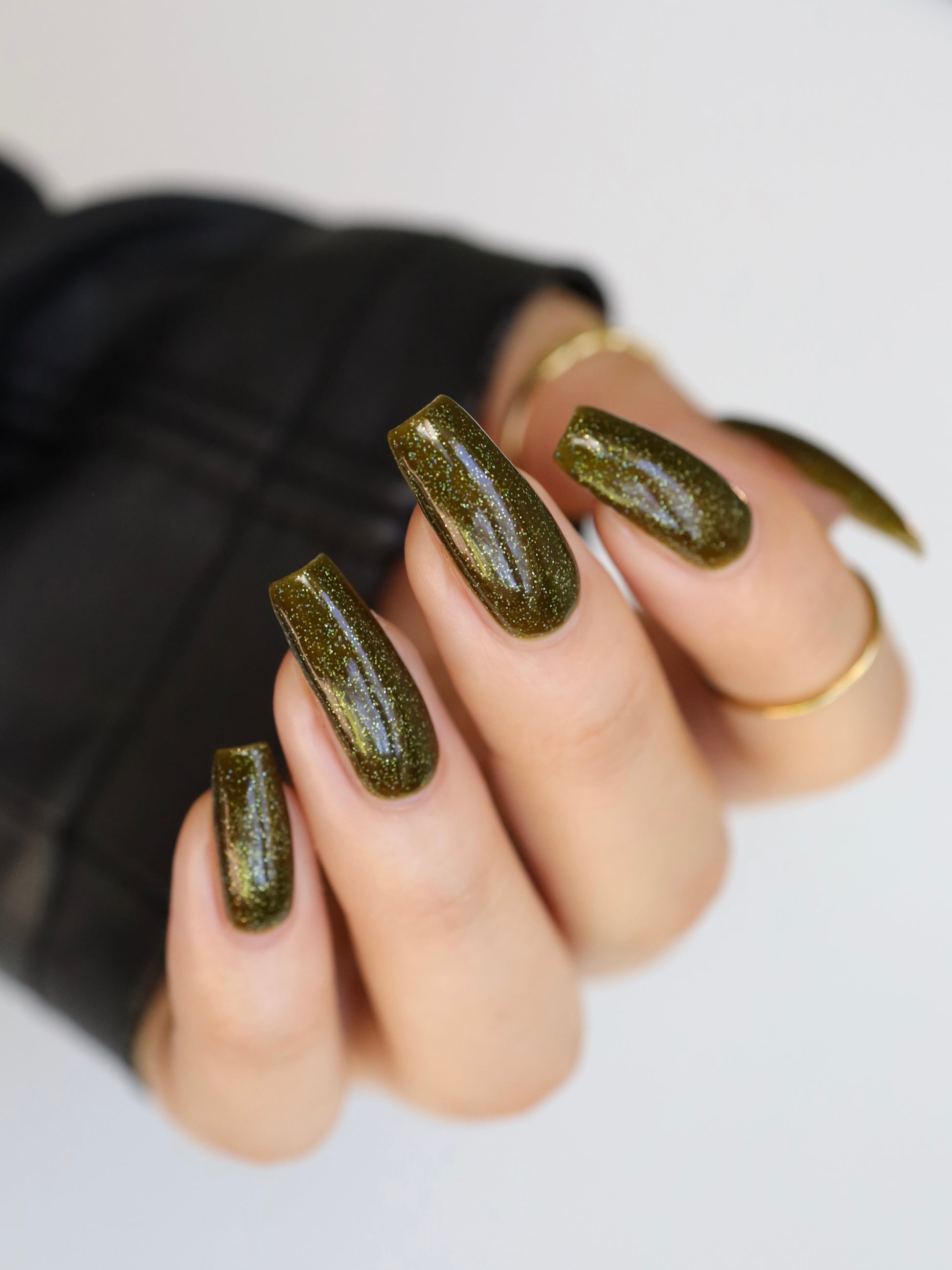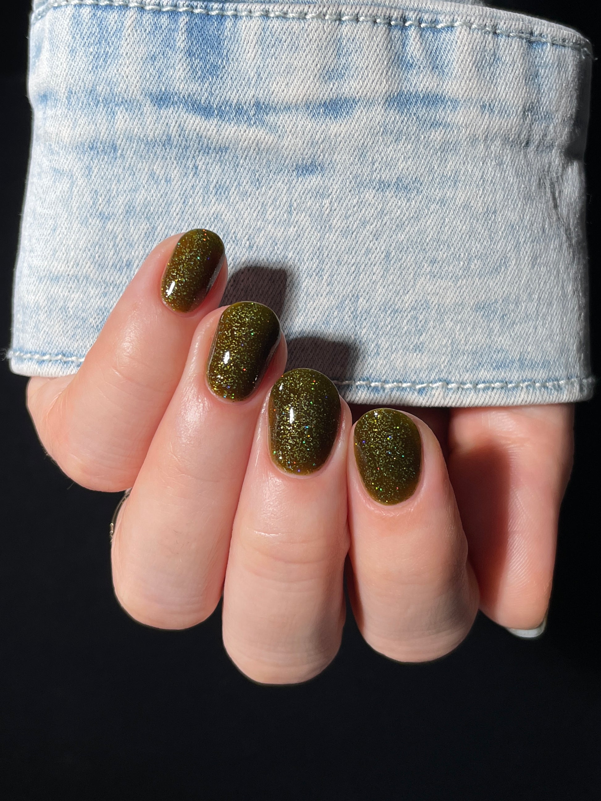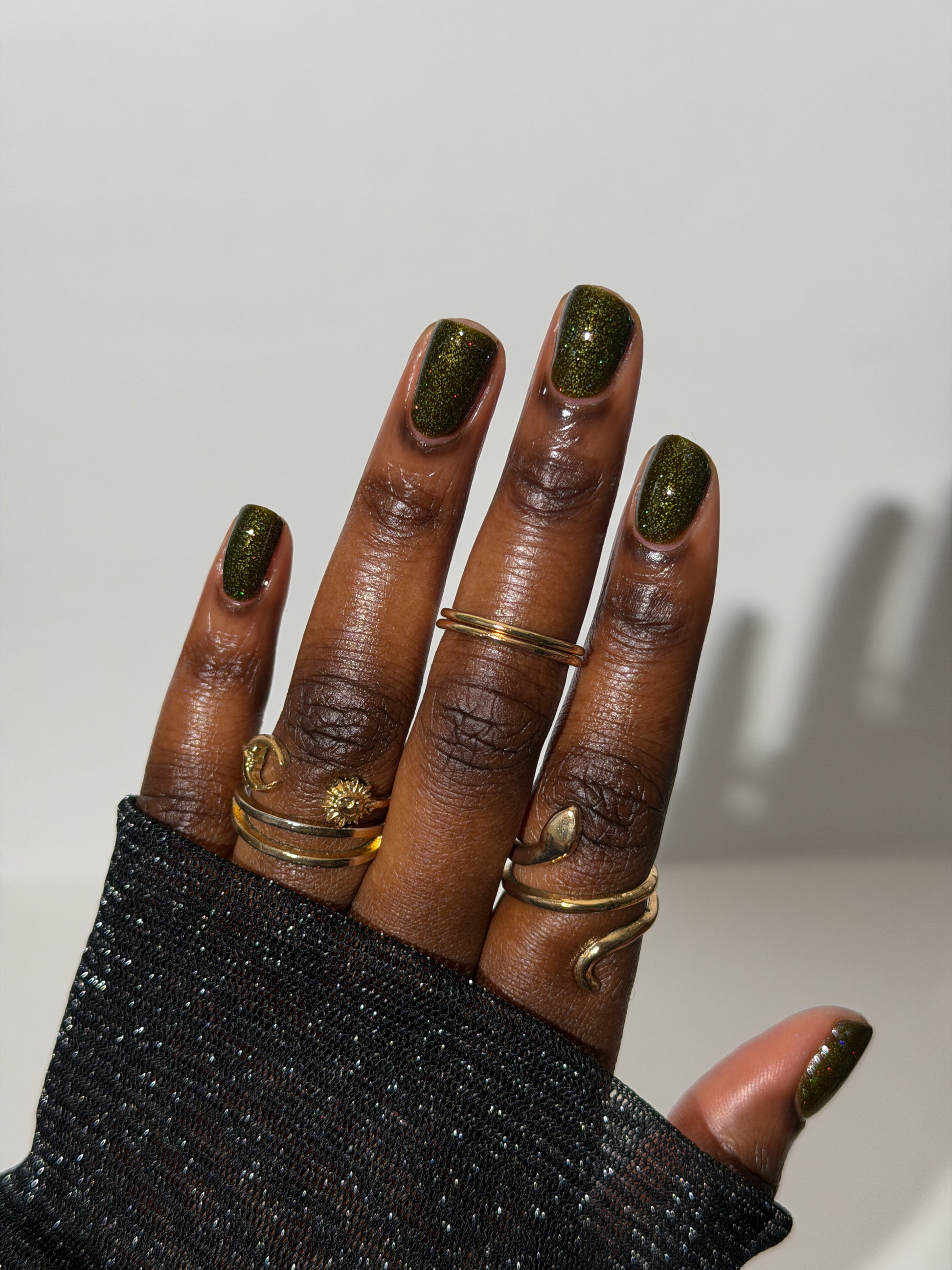 That one song you just can't get out of your head and play On Repeat again and again. This olive green jelly pulls you in the same way, layered with green holographic dancing glitters like a chorus you can’t shake. Our jelly glitters are a little addictive, and endlessly wearable, especially if green is your comfort color like it is our founders. This is the kind of shade you reach for without thinking, because it just feels right every single time.