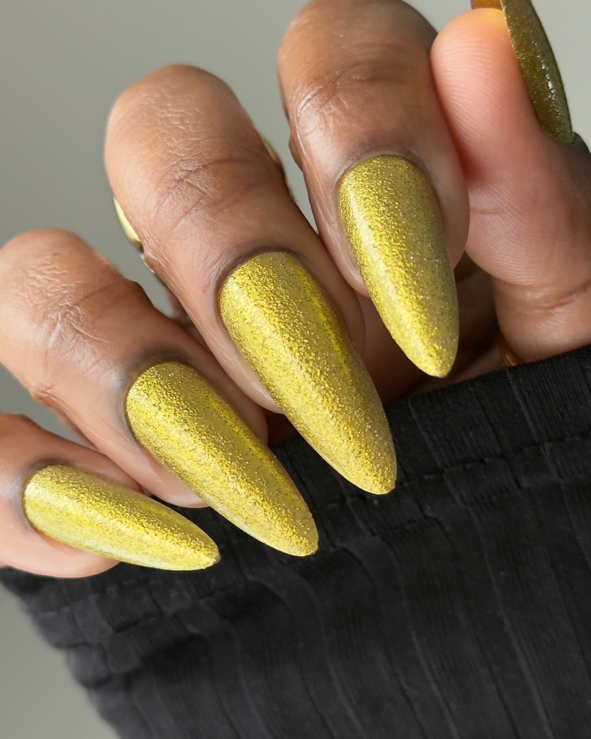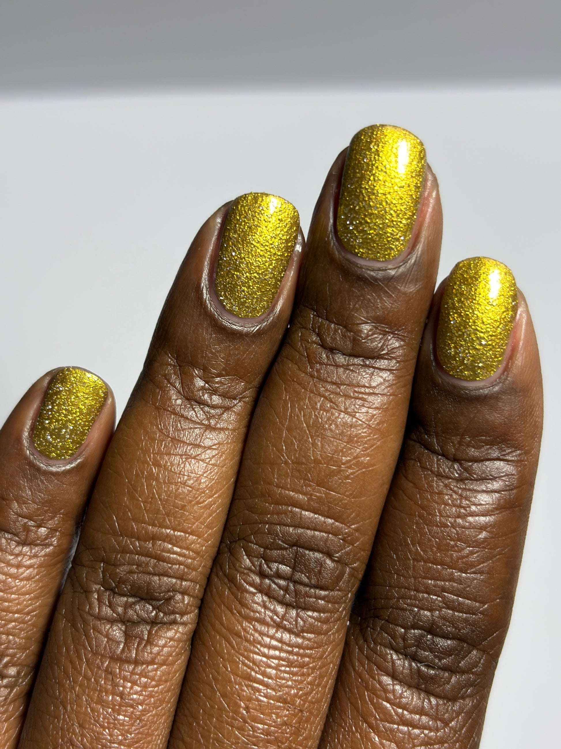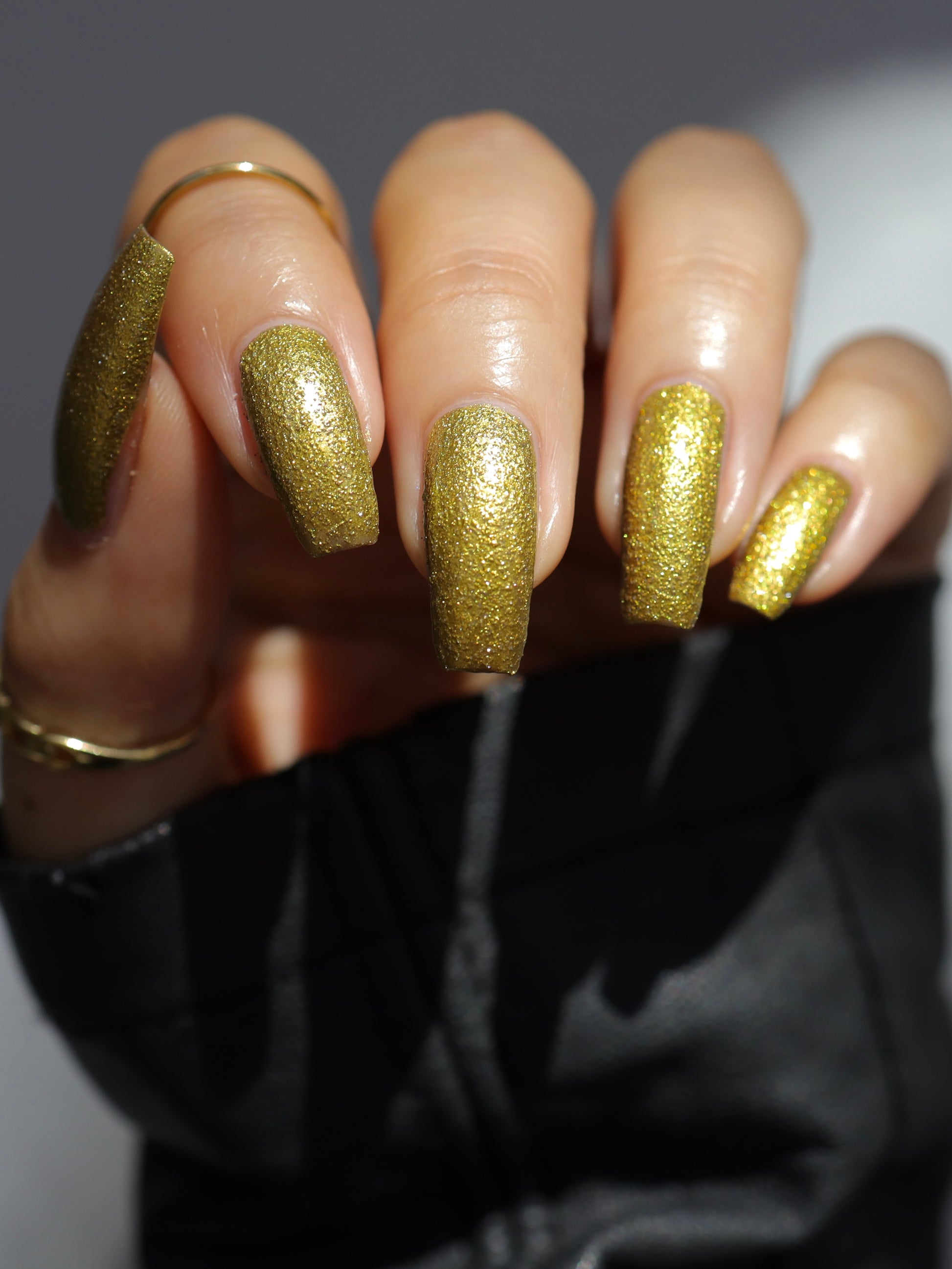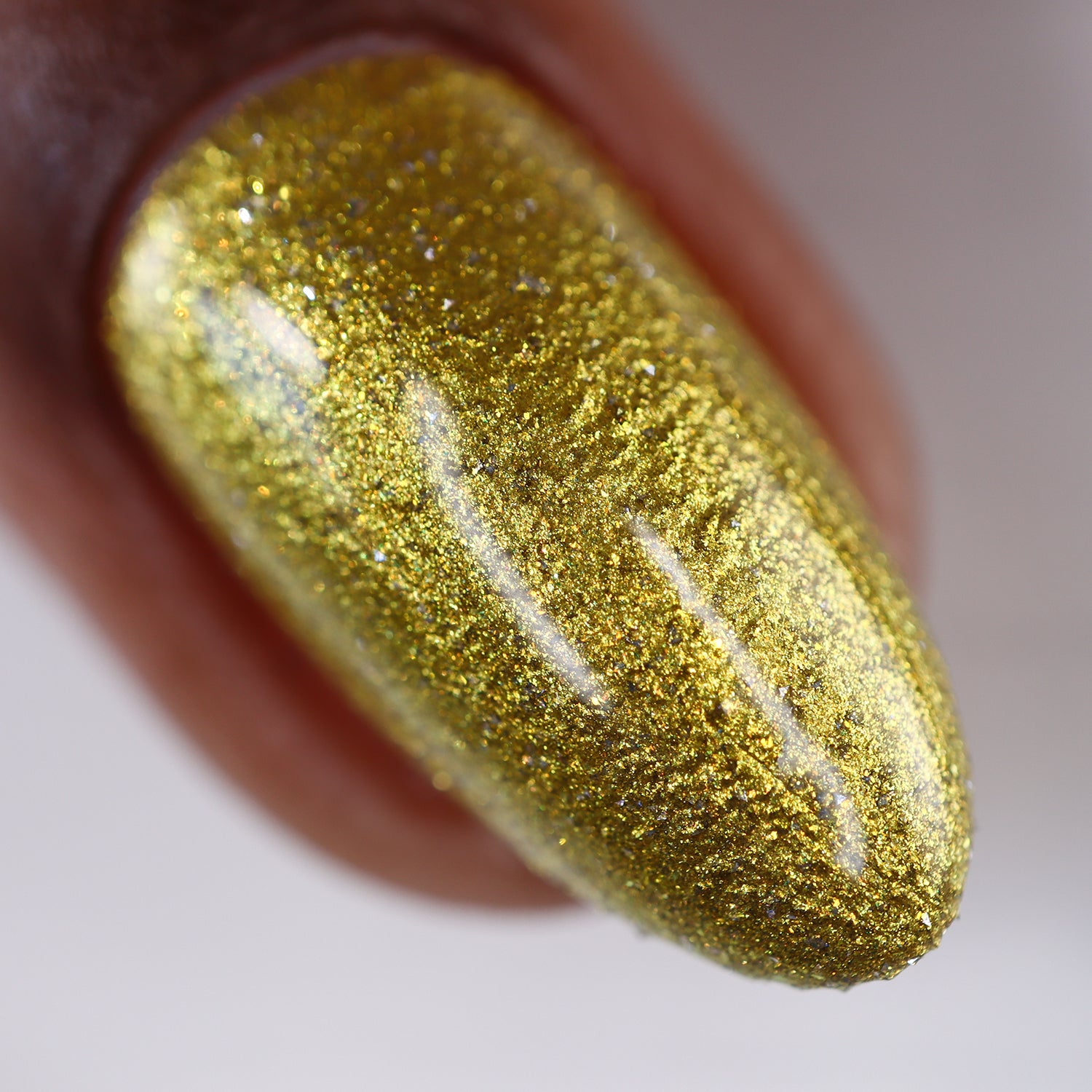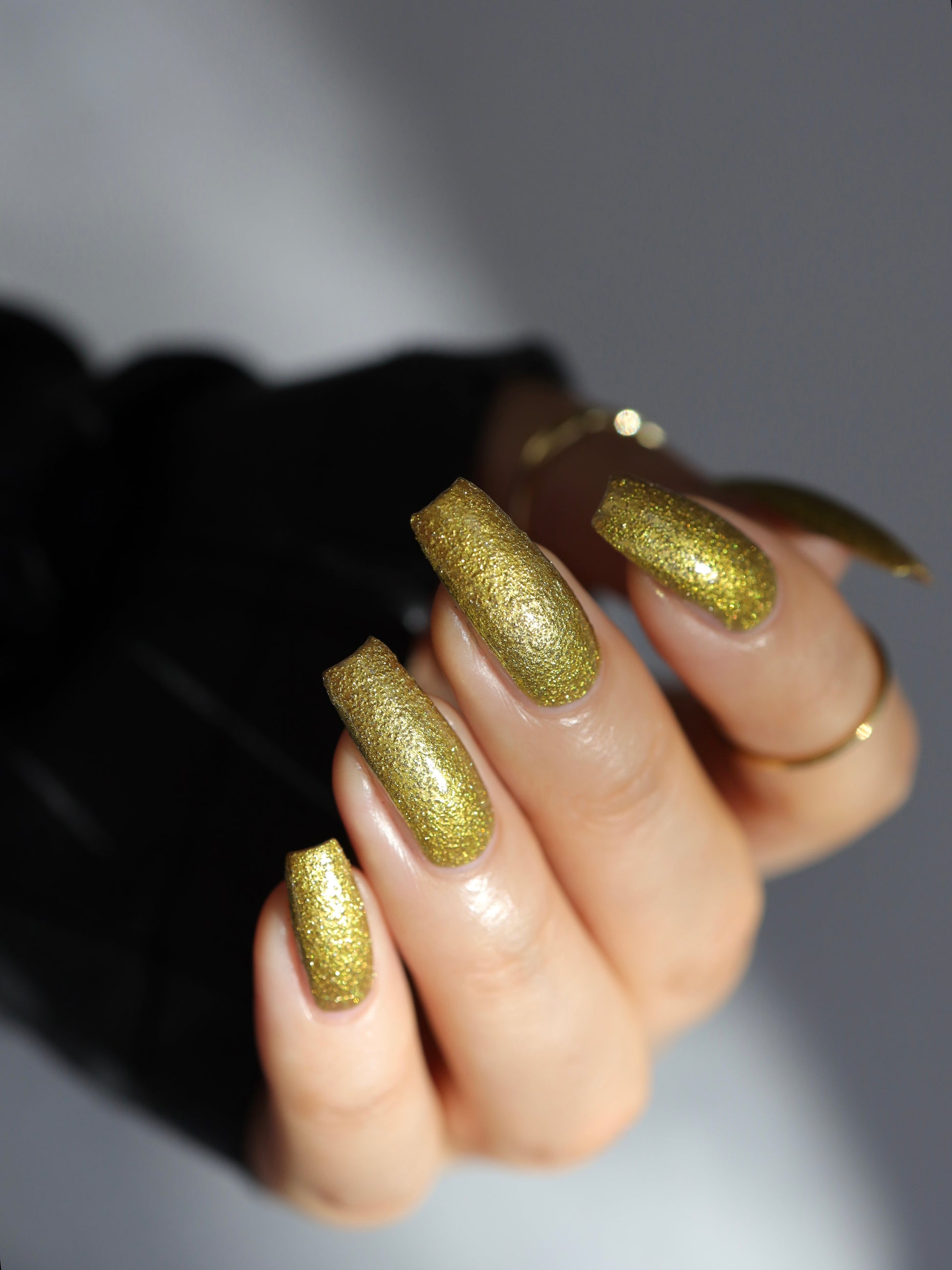 Orchestra Pit is a deep, grungy green drenched in molten gold, lit from within by flashes of reflective glitter that catch like stage lights in motion. This shade hums with quiet intensity, layered and complex, like the swell of strings, the breath of brass, and the pulse of percussion rising together under a conductor’s hand. This shade is intentionally textured and builds into a powerful manicure.