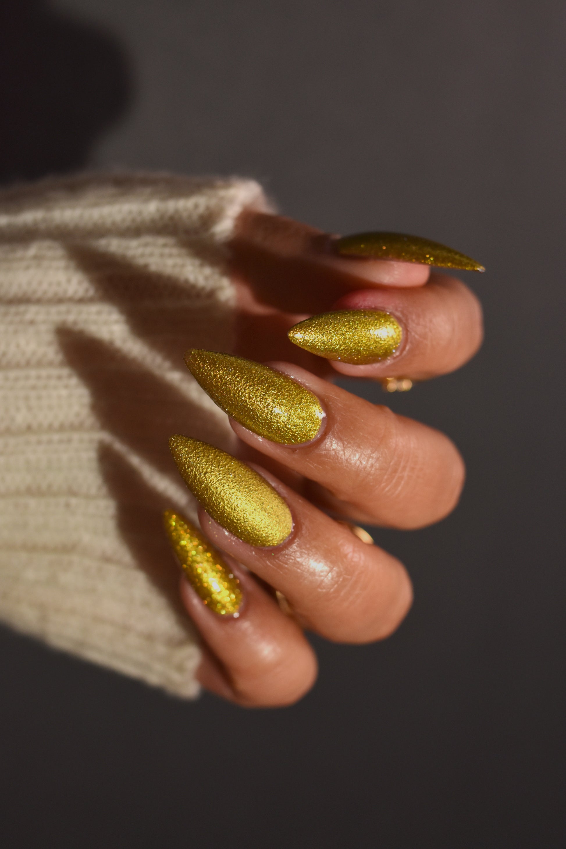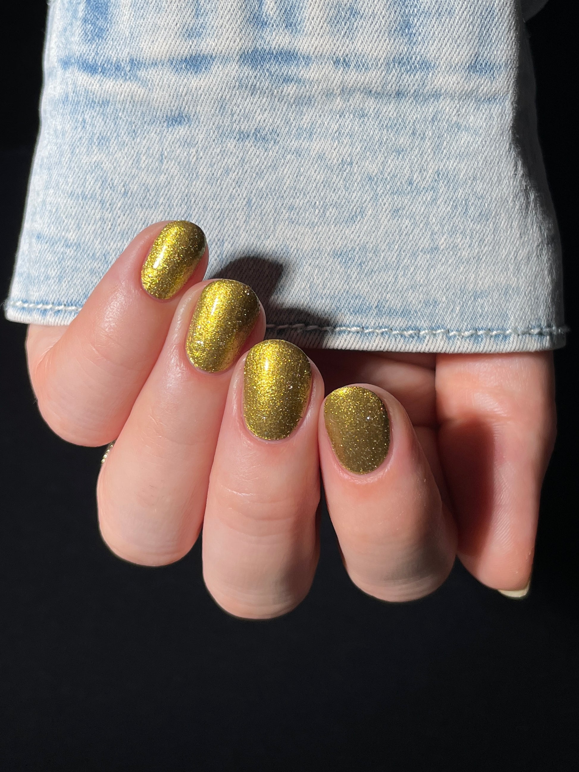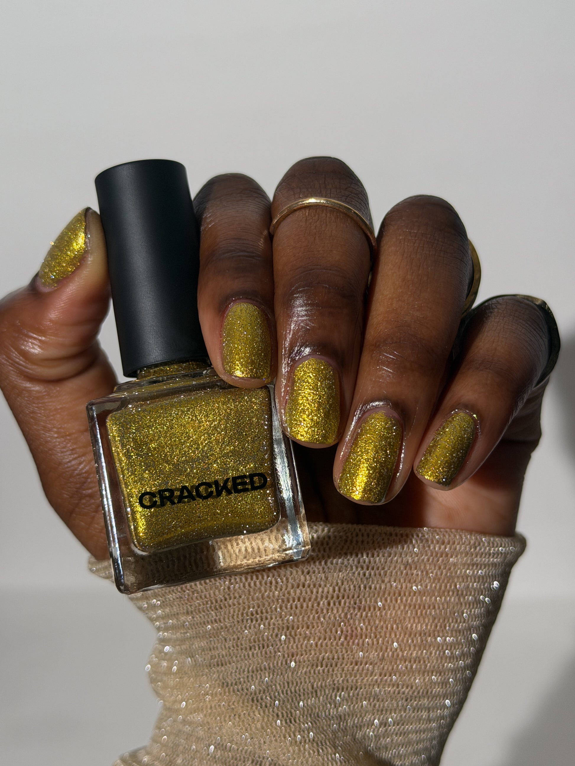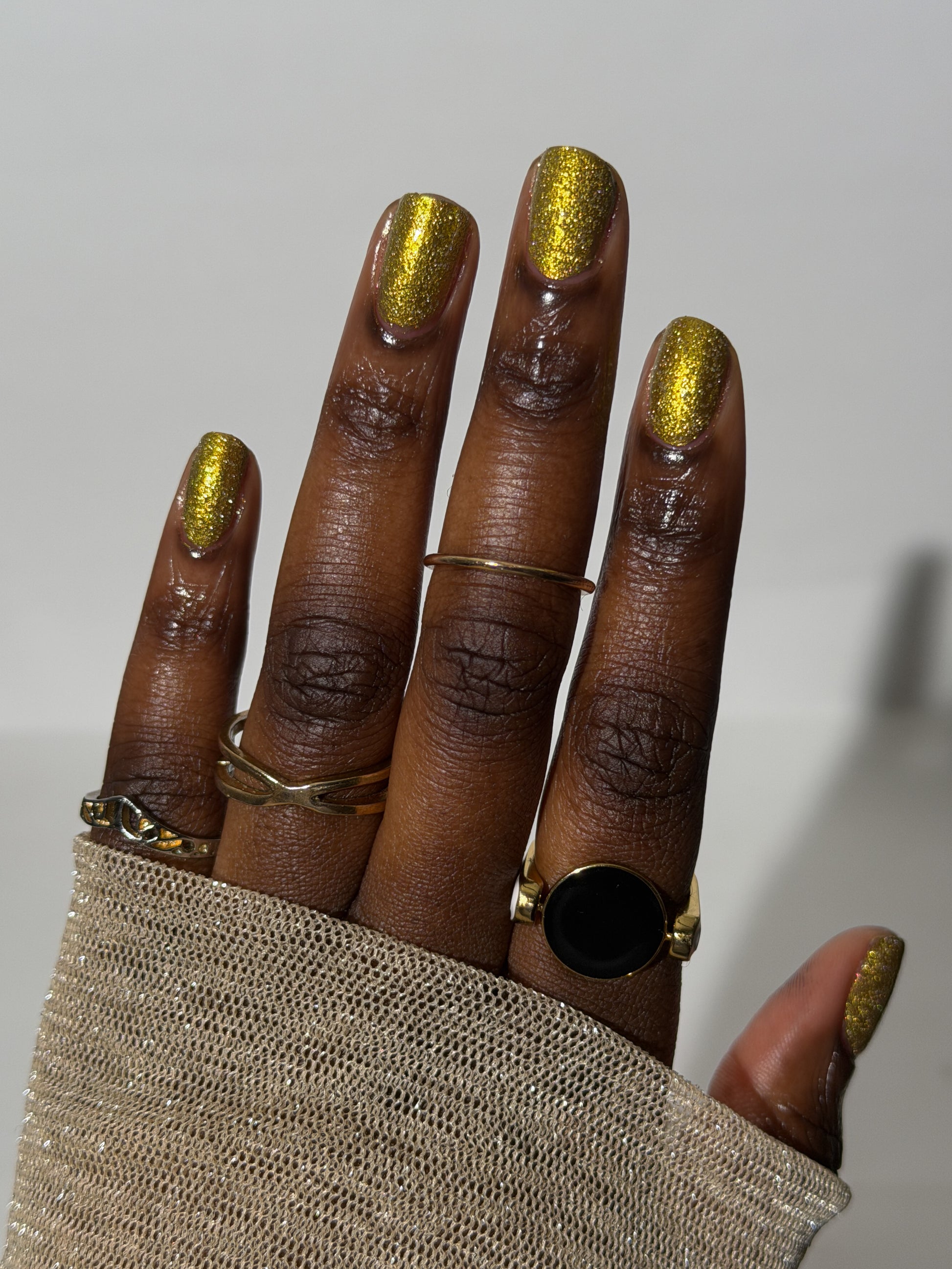 Orchestra Pit is a deep, grungy green drenched in molten gold, lit from within by flashes of reflective glitter that catch like stage lights in motion. This shade hums with quiet intensity, layered and complex, like the swell of strings, the breath of brass, and the pulse of percussion rising together under a conductor’s hand. This shade is intentionally textured and builds into a powerful manicure.