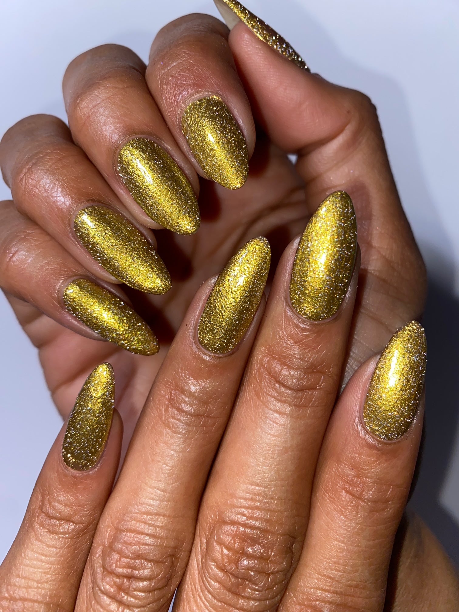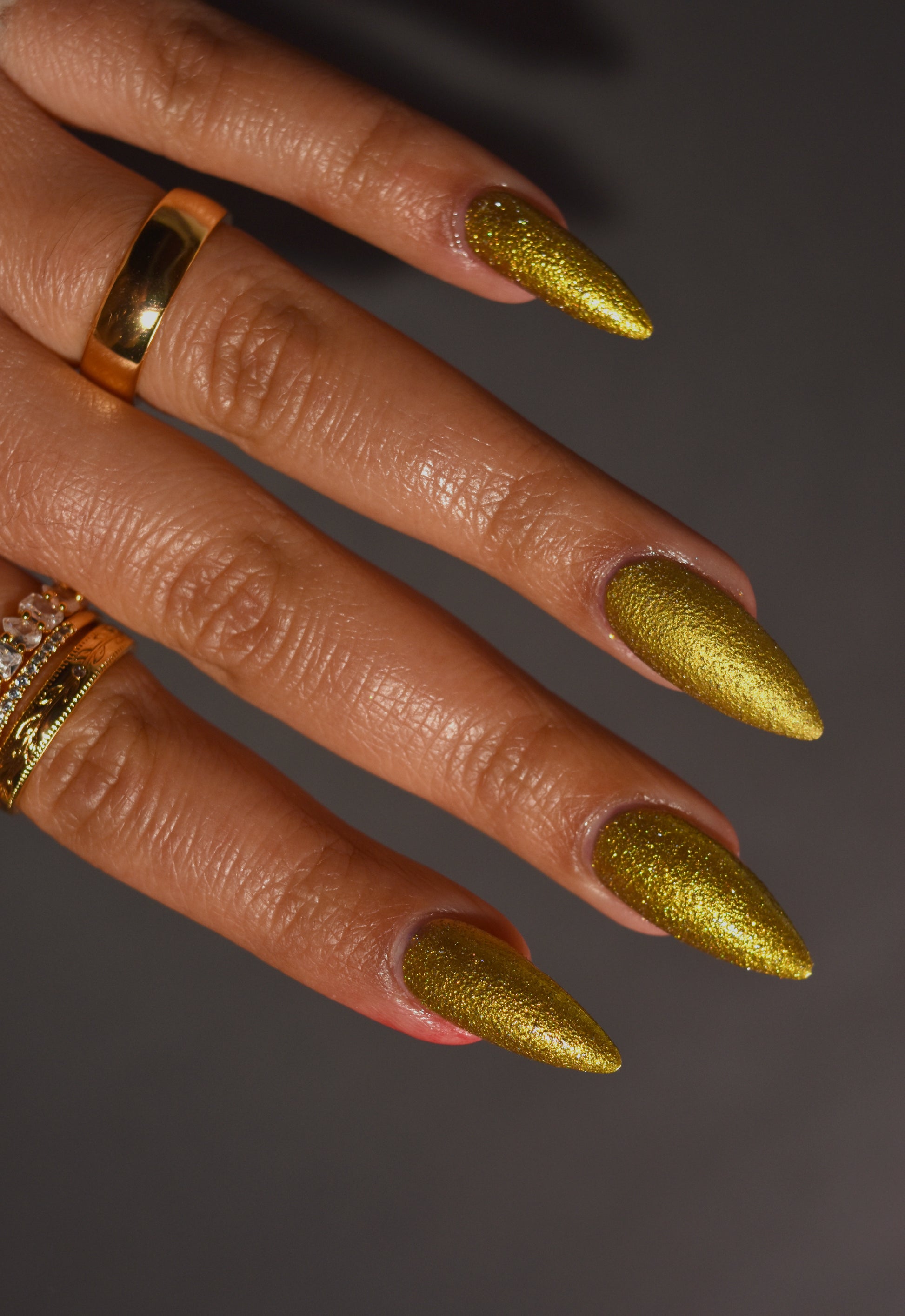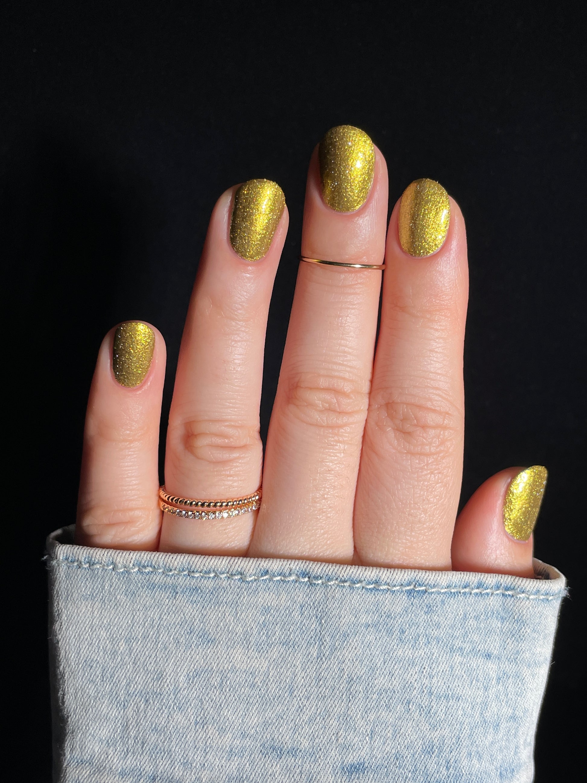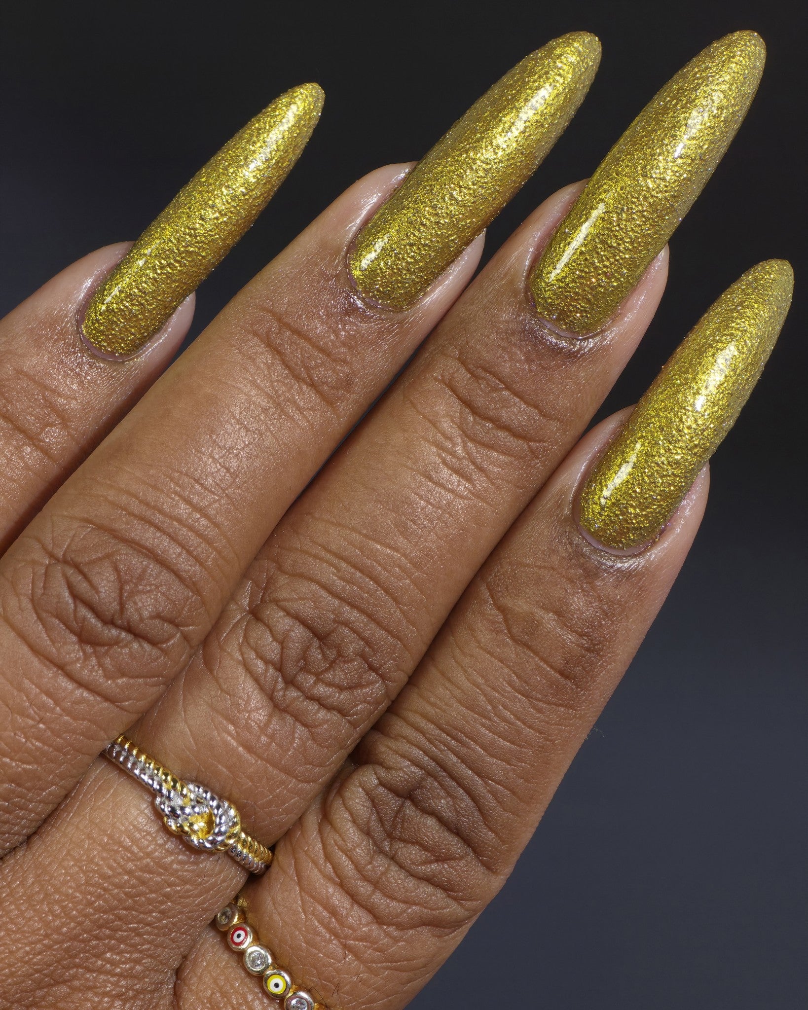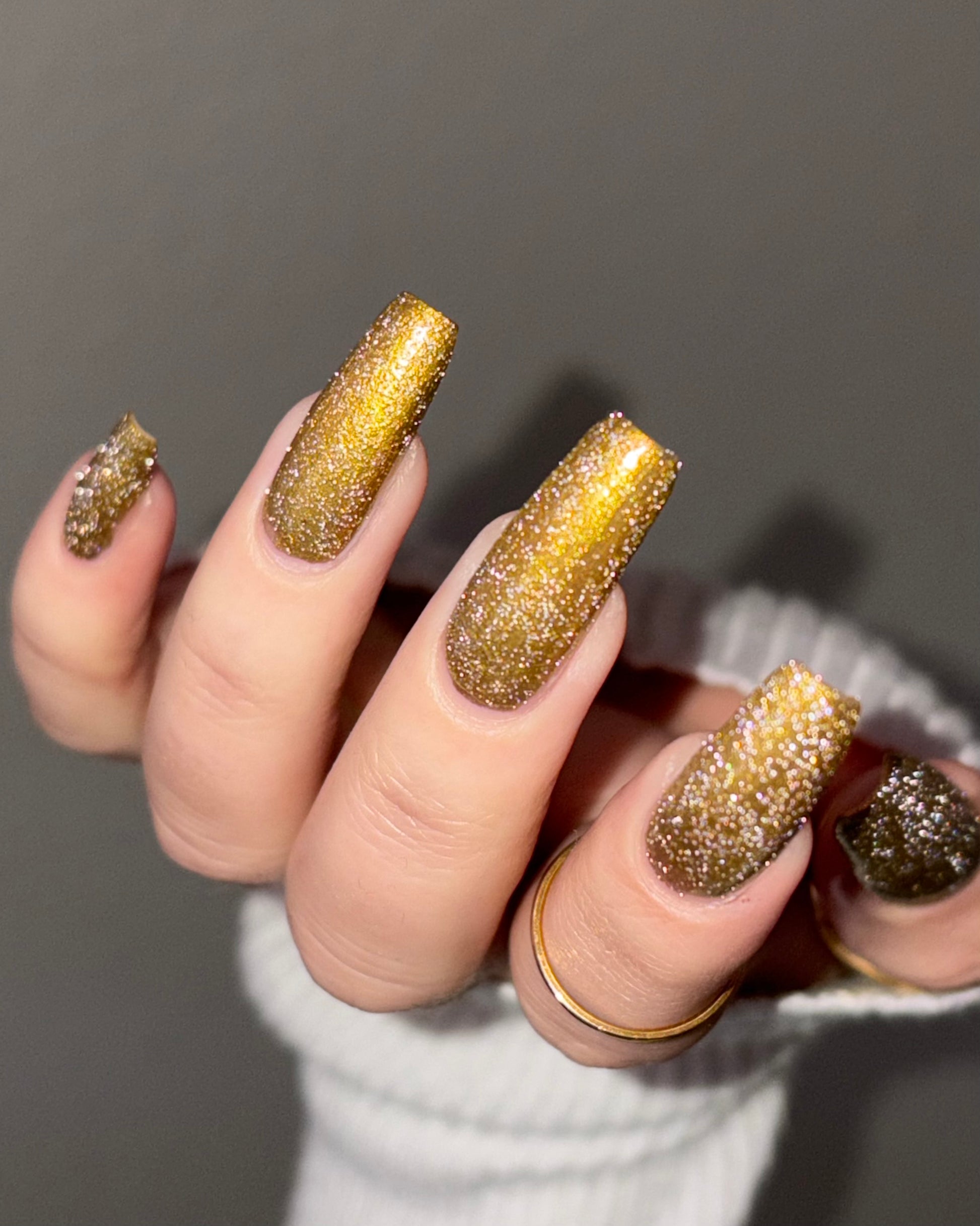 Orchestra Pit is a deep, grungy green drenched in molten gold, lit from within by flashes of reflective glitter that catch like stage lights in motion. This shade hums with quiet intensity, layered and complex, like the swell of strings, the breath of brass, and the pulse of percussion rising together under a conductor’s hand. This shade is intentionally textured and builds into a powerful manicure.