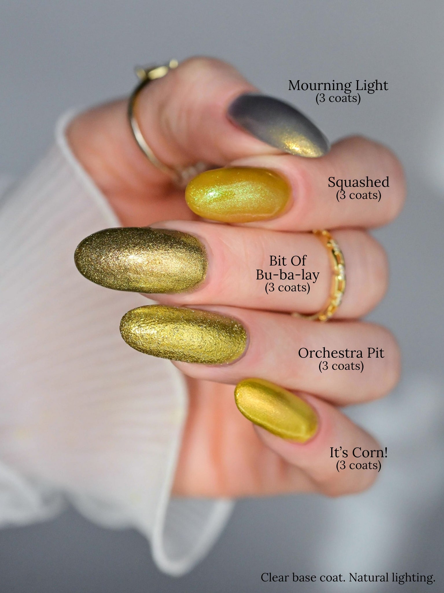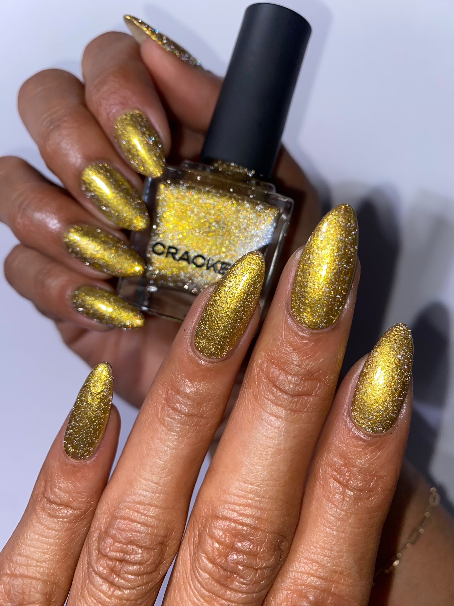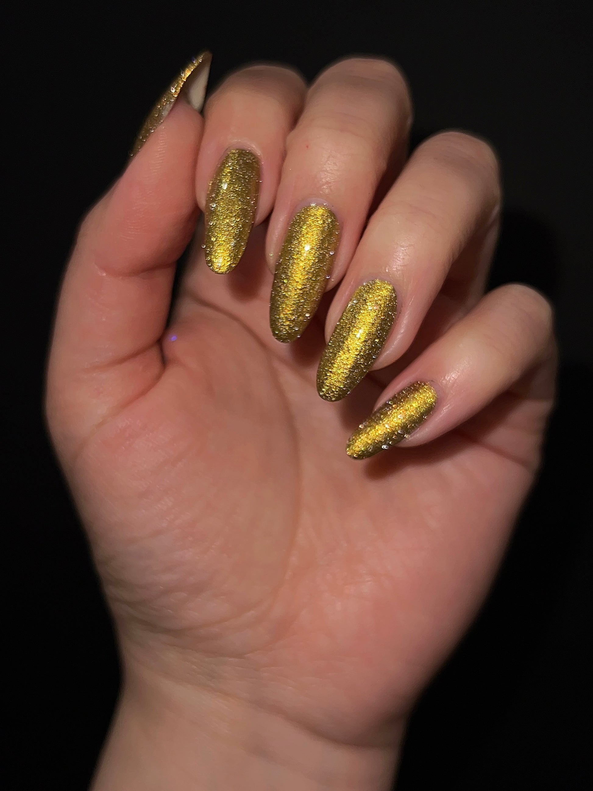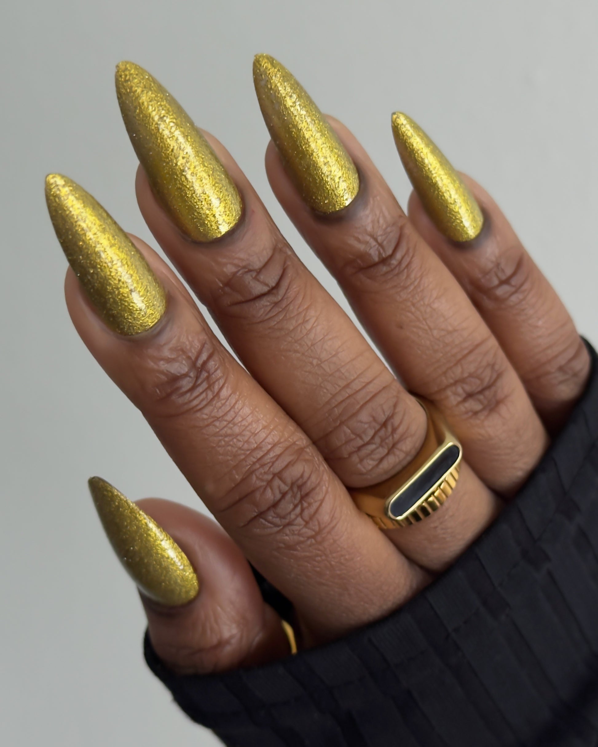 Orchestra Pit is a deep, grungy green drenched in molten gold, lit from within by flashes of reflective glitter that catch like stage lights in motion. This shade hums with quiet intensity, layered and complex, like the swell of strings, the breath of brass, and the pulse of percussion rising together under a conductor’s hand. This shade is intentionally textured and builds into a powerful manicure.