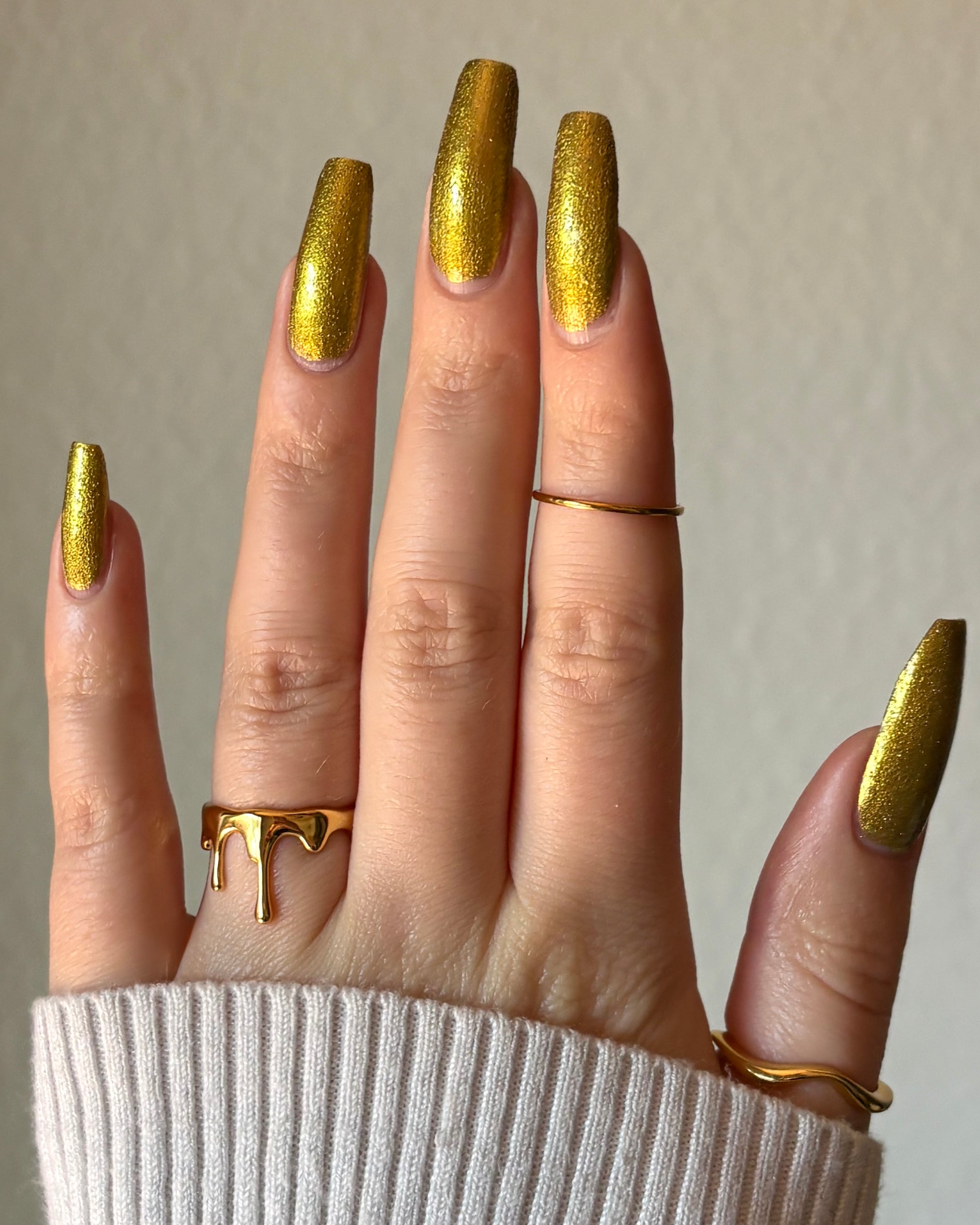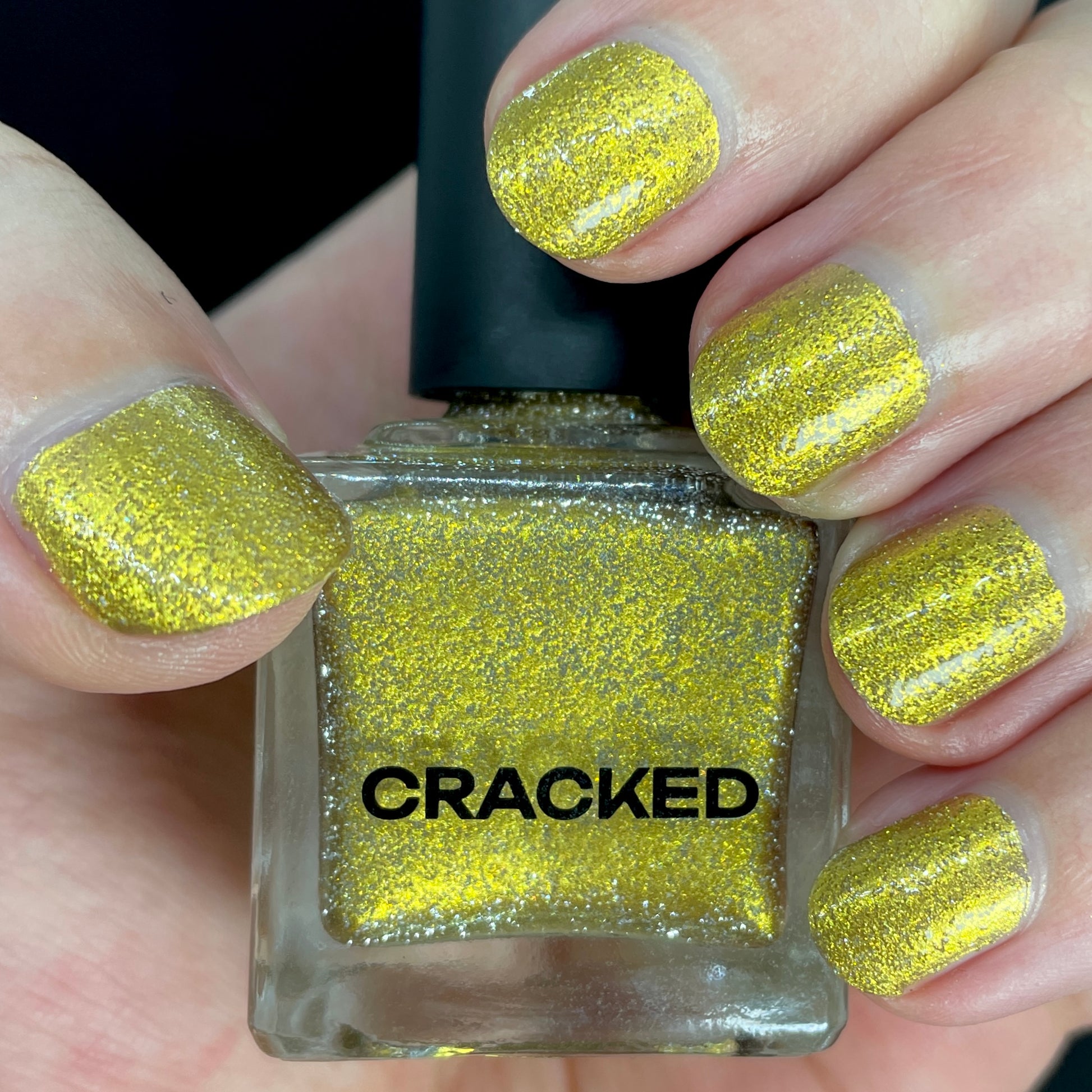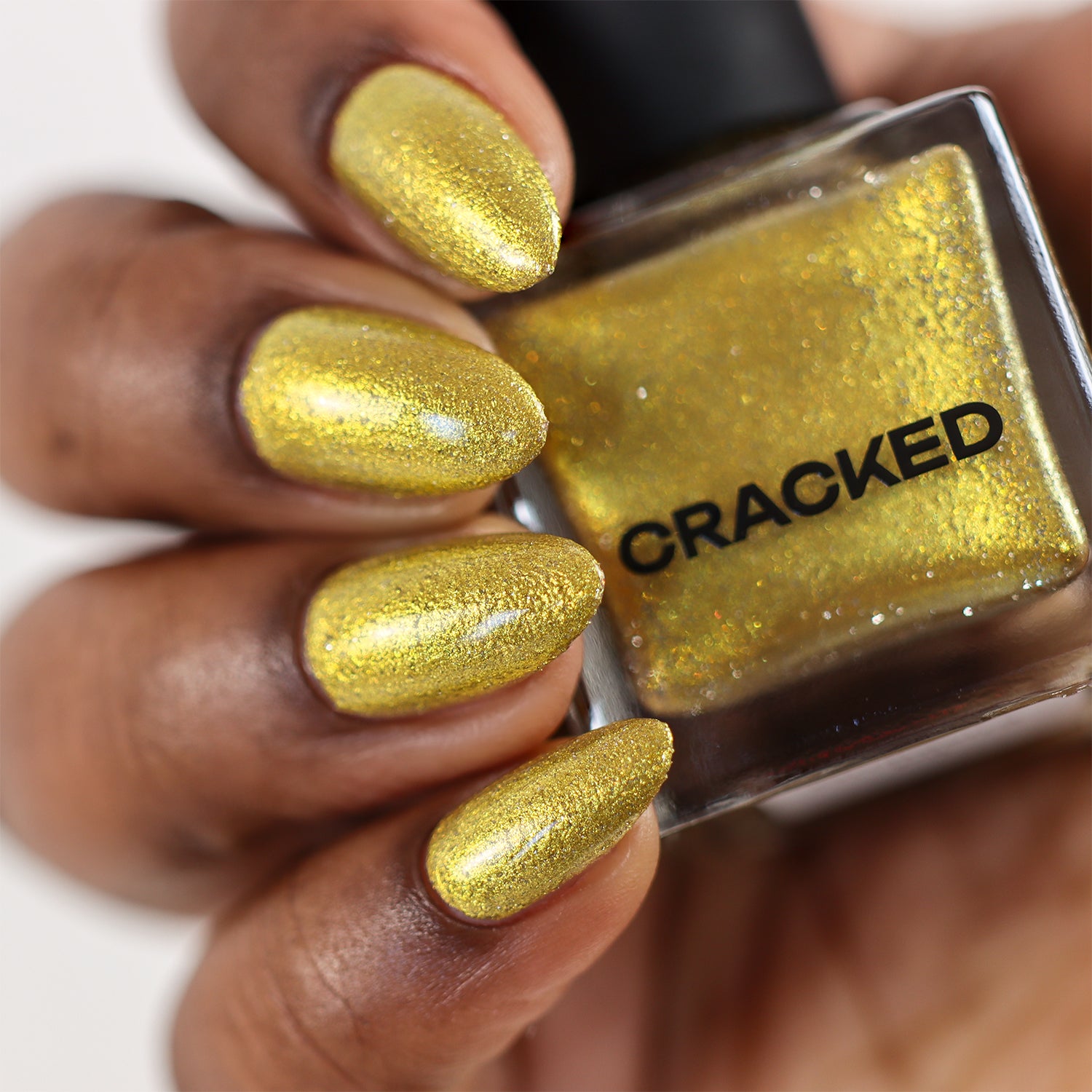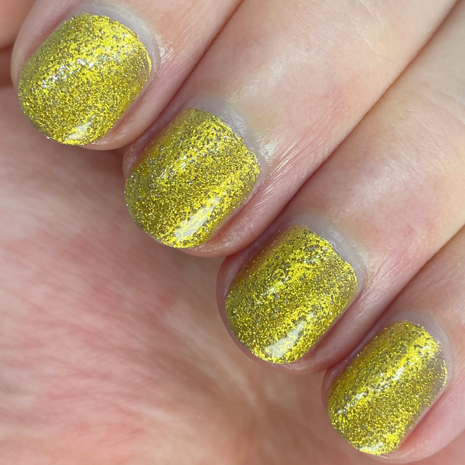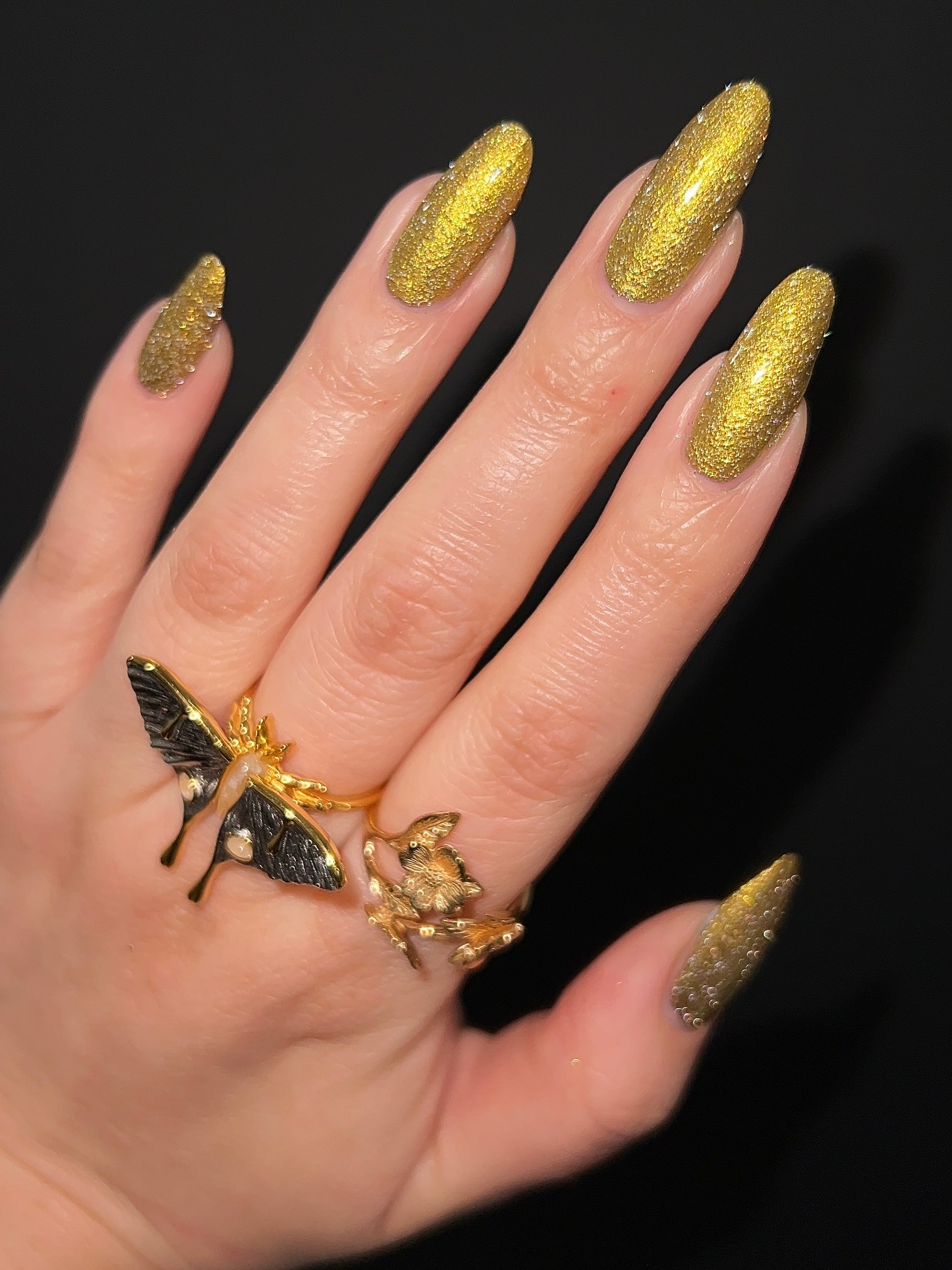 Orchestra Pit is a deep, grungy green drenched in molten gold, lit from within by flashes of reflective glitter that catch like stage lights in motion. This shade hums with quiet intensity, layered and complex, like the swell of strings, the breath of brass, and the pulse of percussion rising together under a conductor’s hand. This shade is intentionally textured and builds into a powerful manicure.