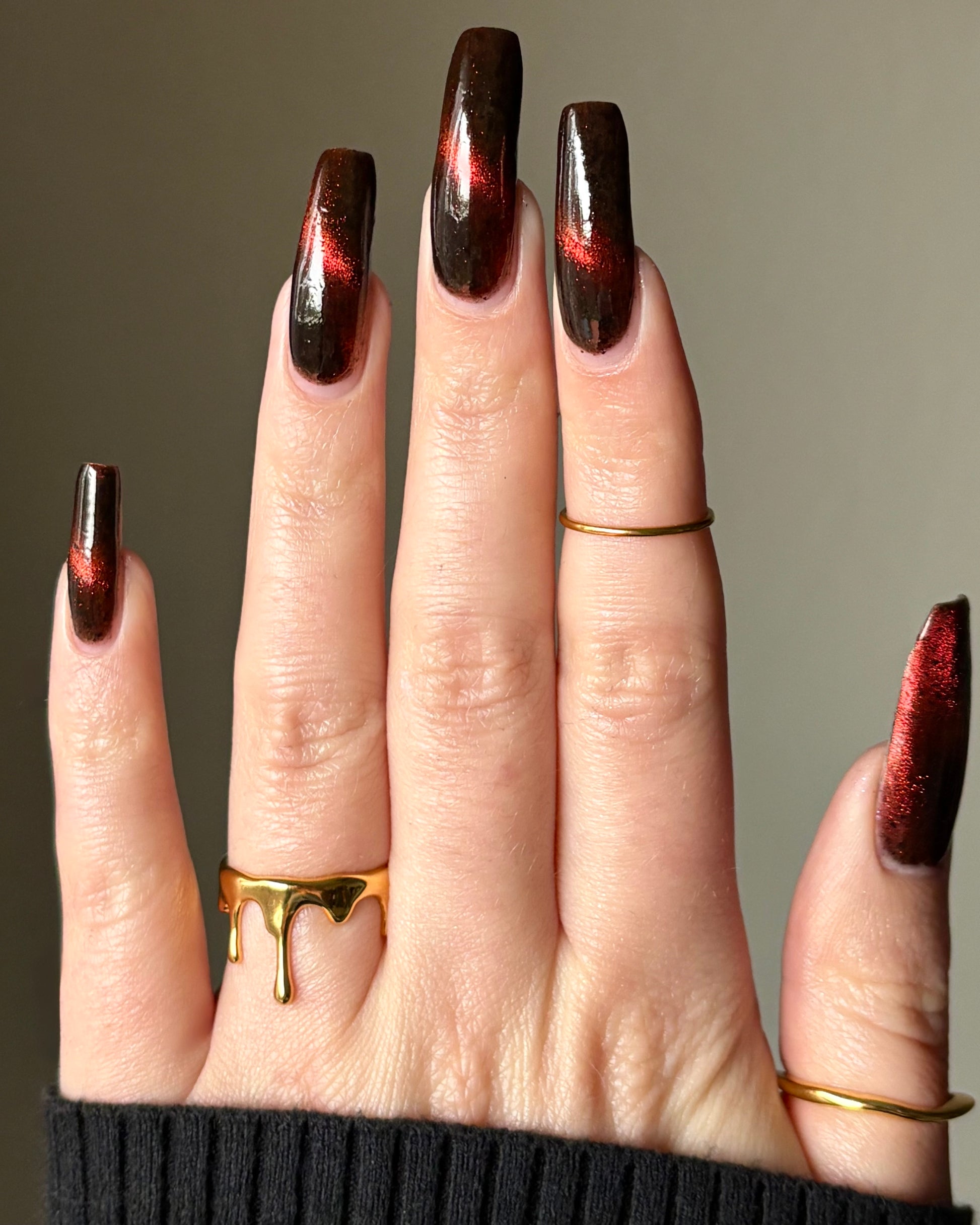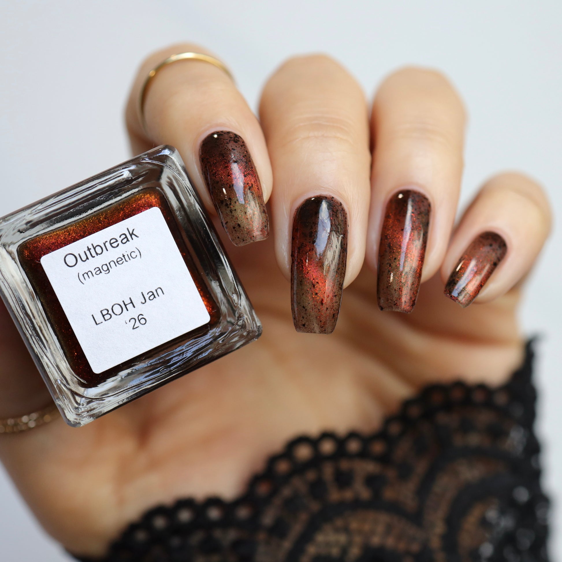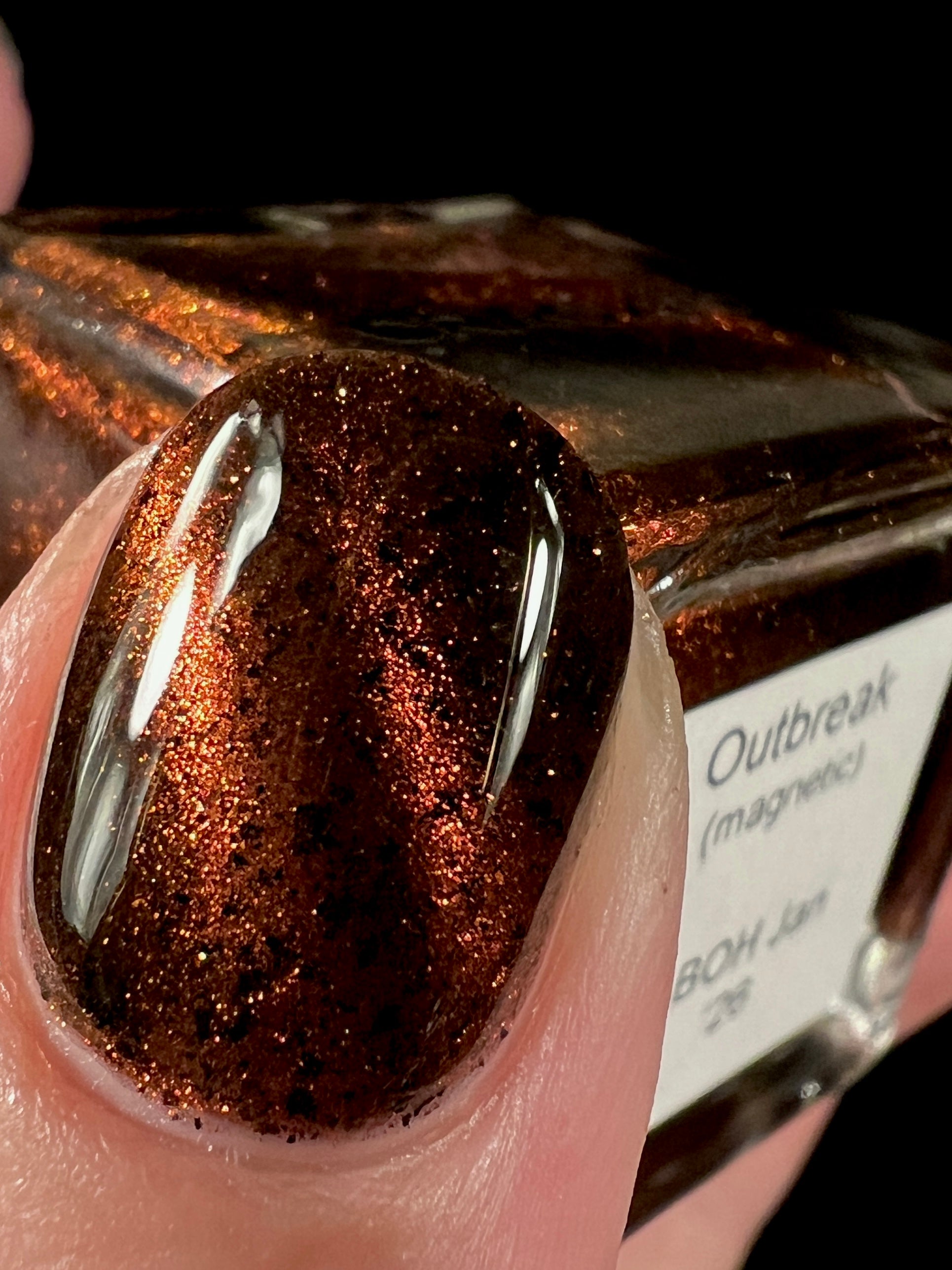 Outbreak is where the infection begins. Inspired by the Resident Evil films, this black jelly base is ominous, scattered with black flakies that drift like debris in the dark. Red to orange magnetic pigments surge beneath the surface, glowing like a warning signal as you pull them into motion. Haunting, dangerous, and impossible to ignore, Outbreak is a slow-burn polish that feels alive on the nail. This shade is made exclusively for Little Box of Horrors, and once it takes hold, there’s no turning back