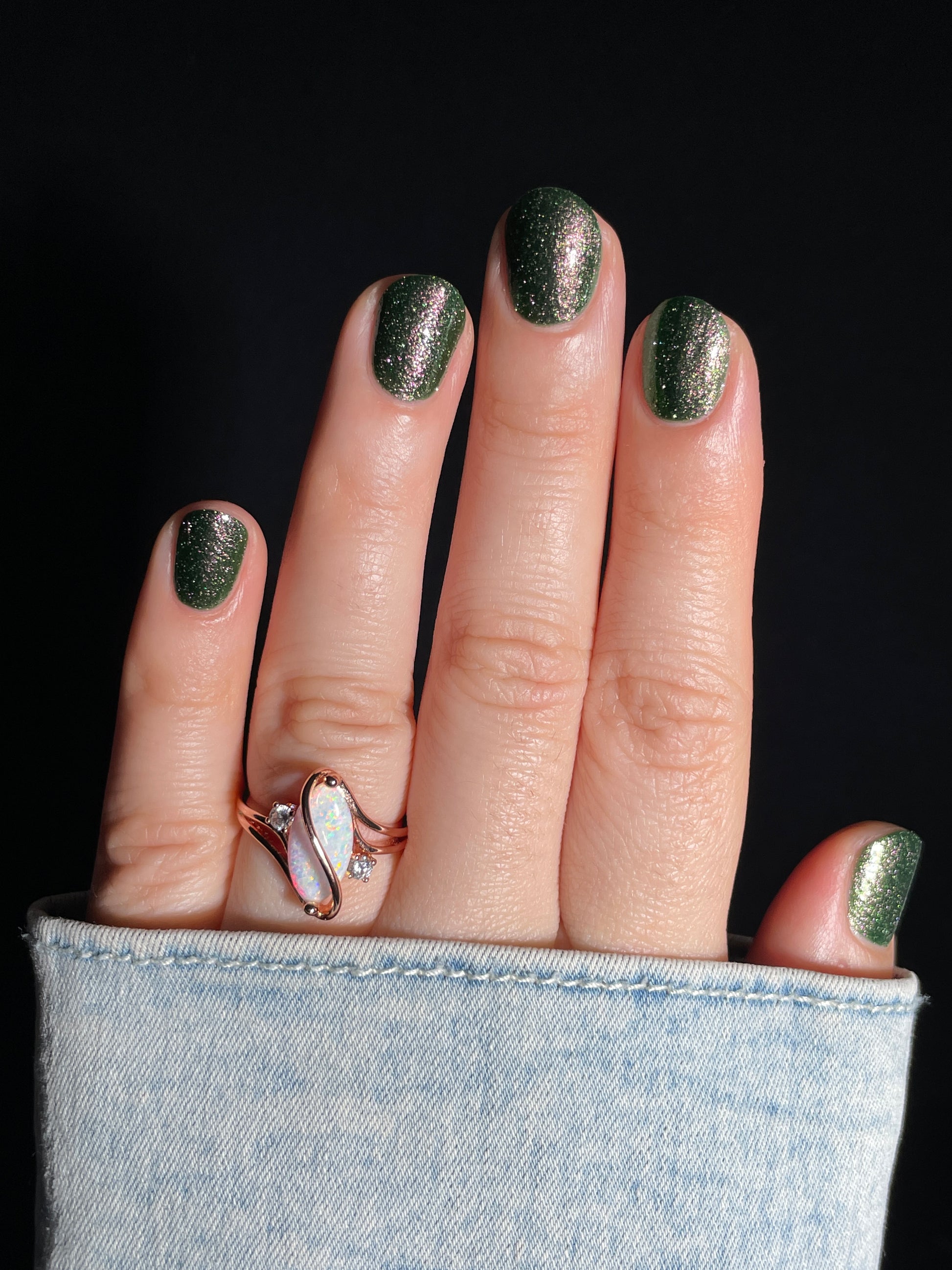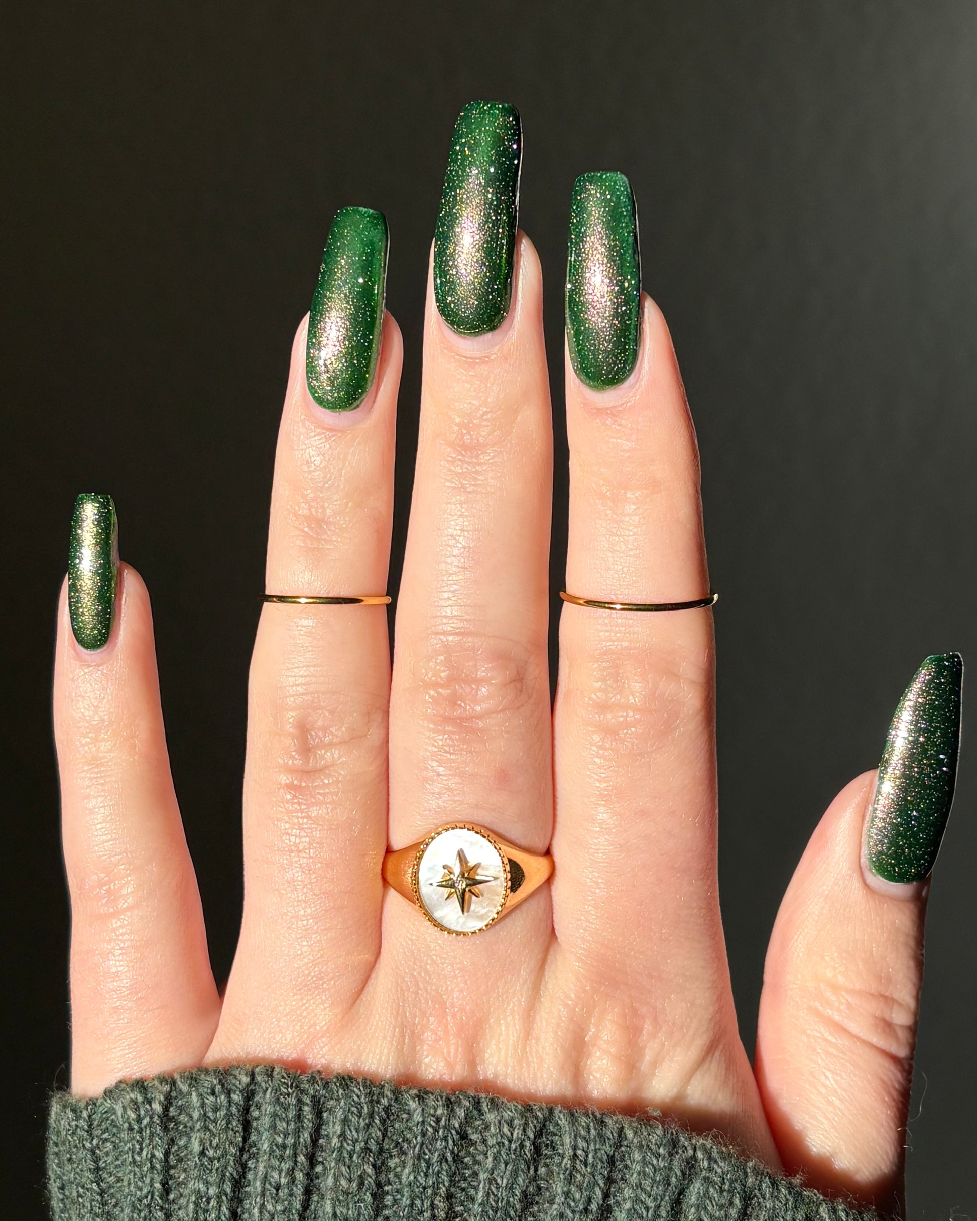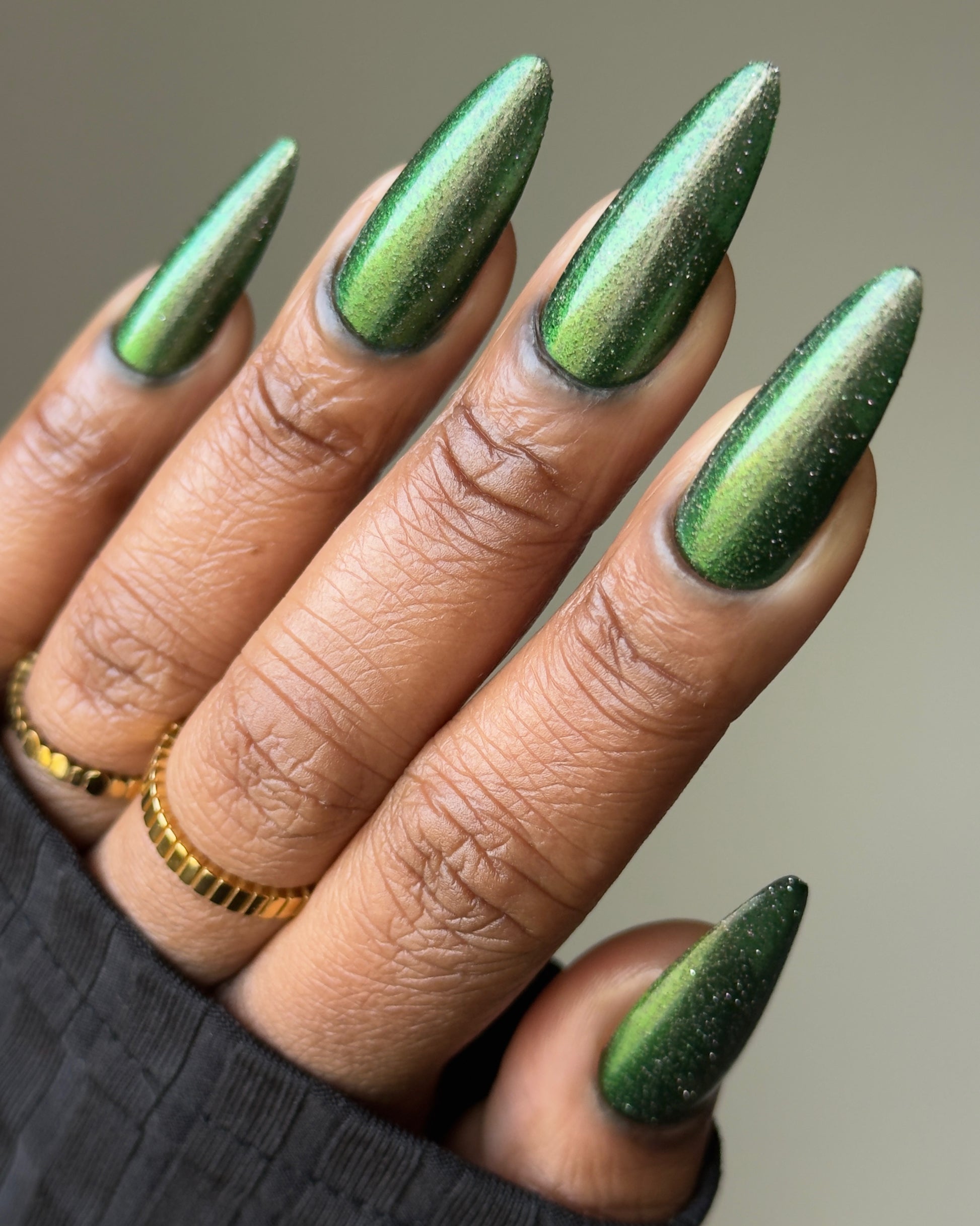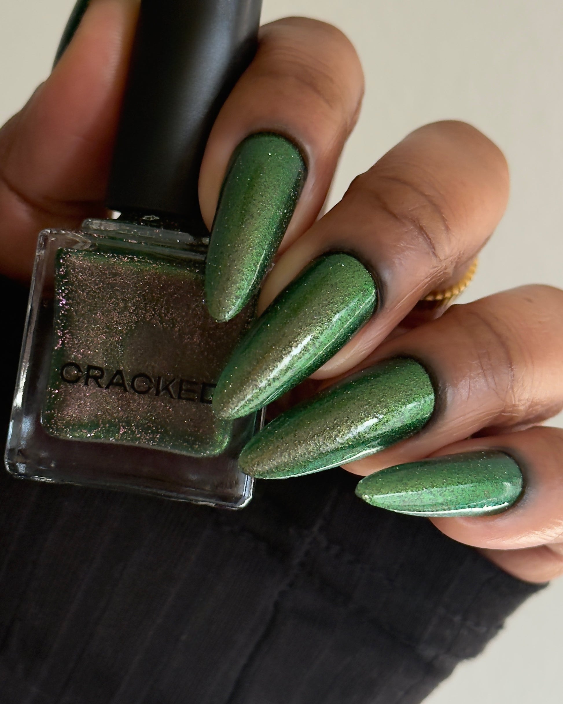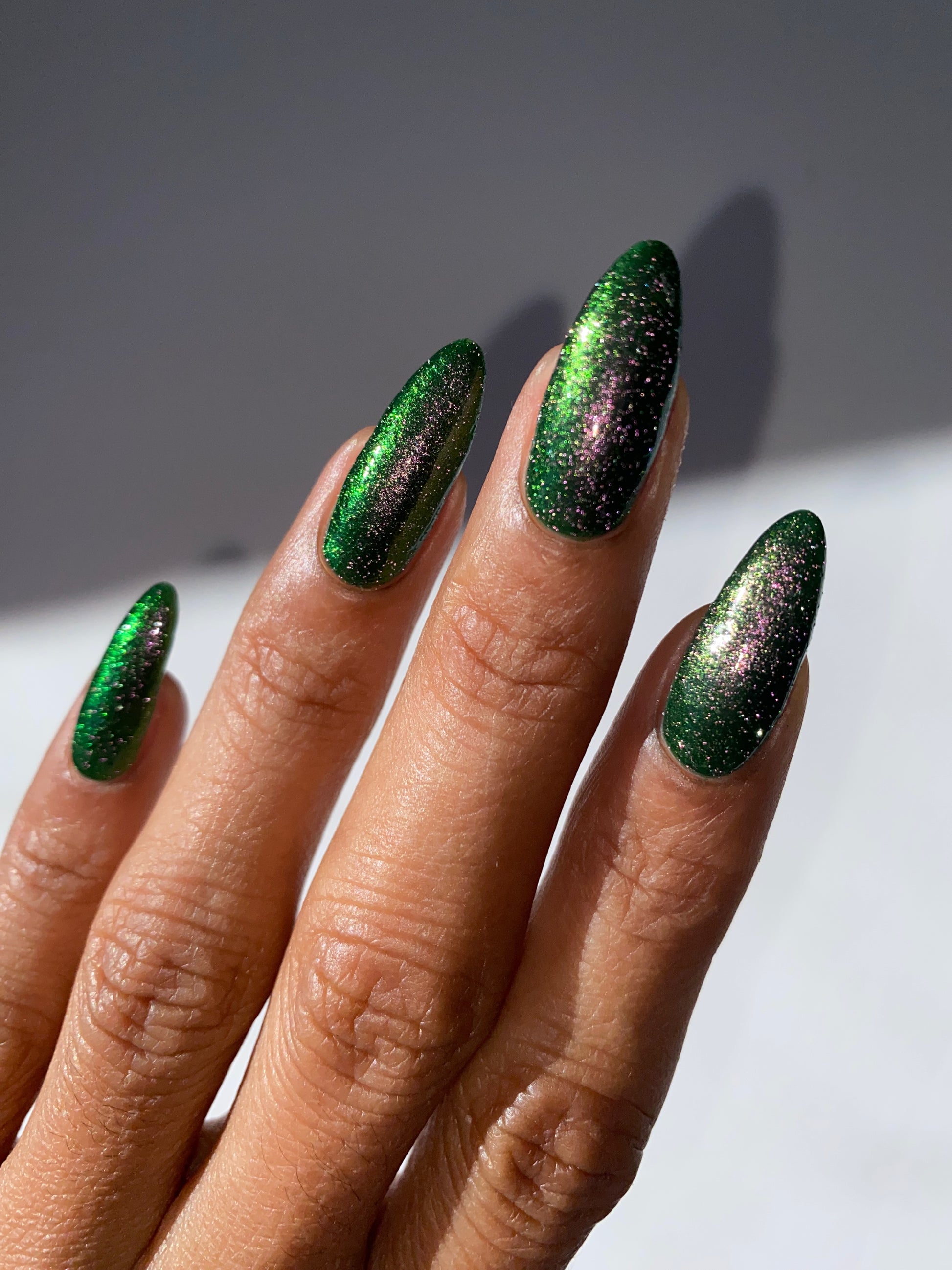 I see the shade Past, Present, Future making its way into your life. These months theme is Tarot and I instantly wanted to do a witchy vibe. This shade is a mysterious gray-green base with silver reflective glitters. Wear it, and you’ll swear you can hear the shuffle of fate… the past creeping behind you, the present tightening its grip, and the future waiting, patient and hungry, just beyond the next draw.