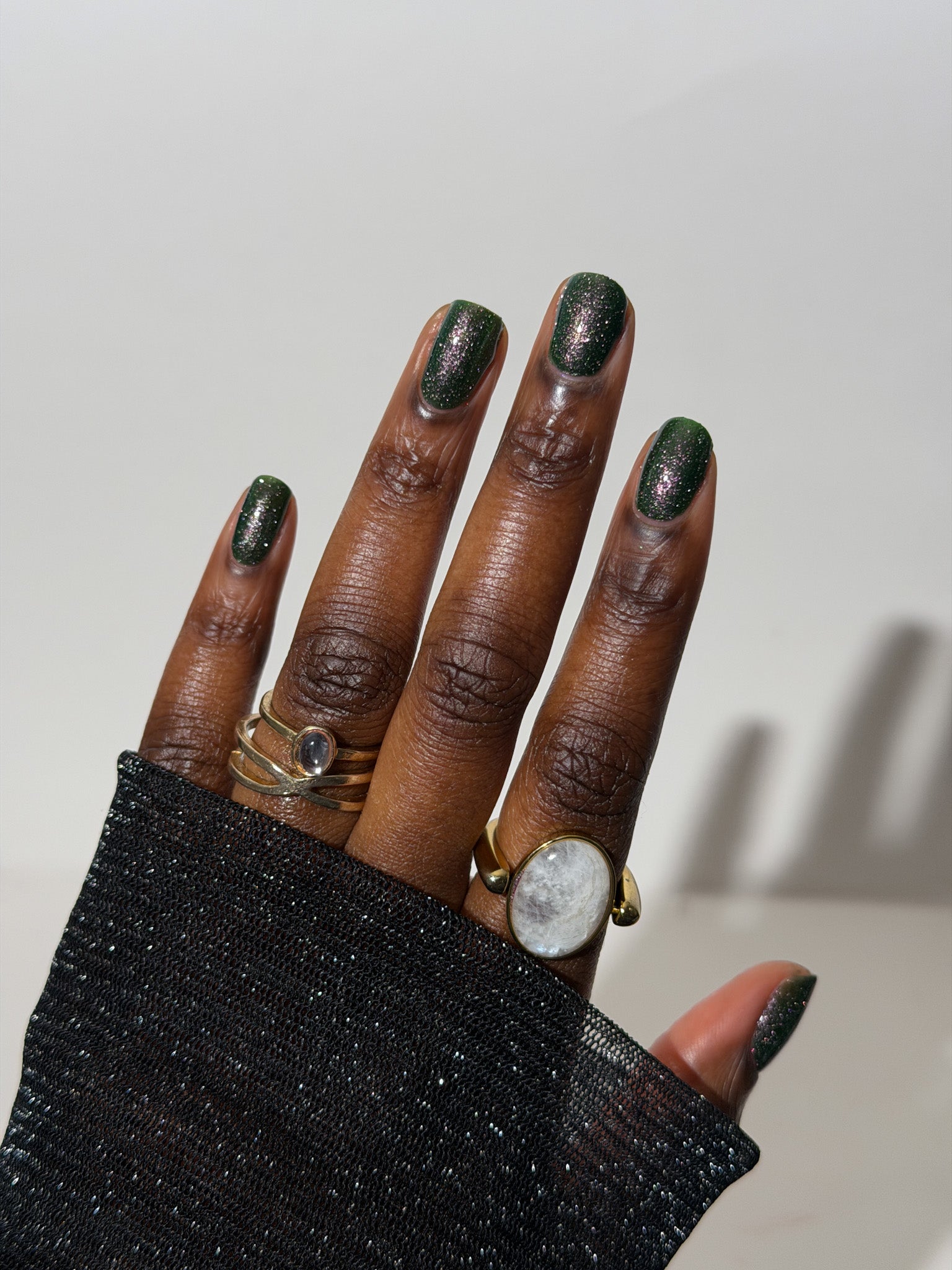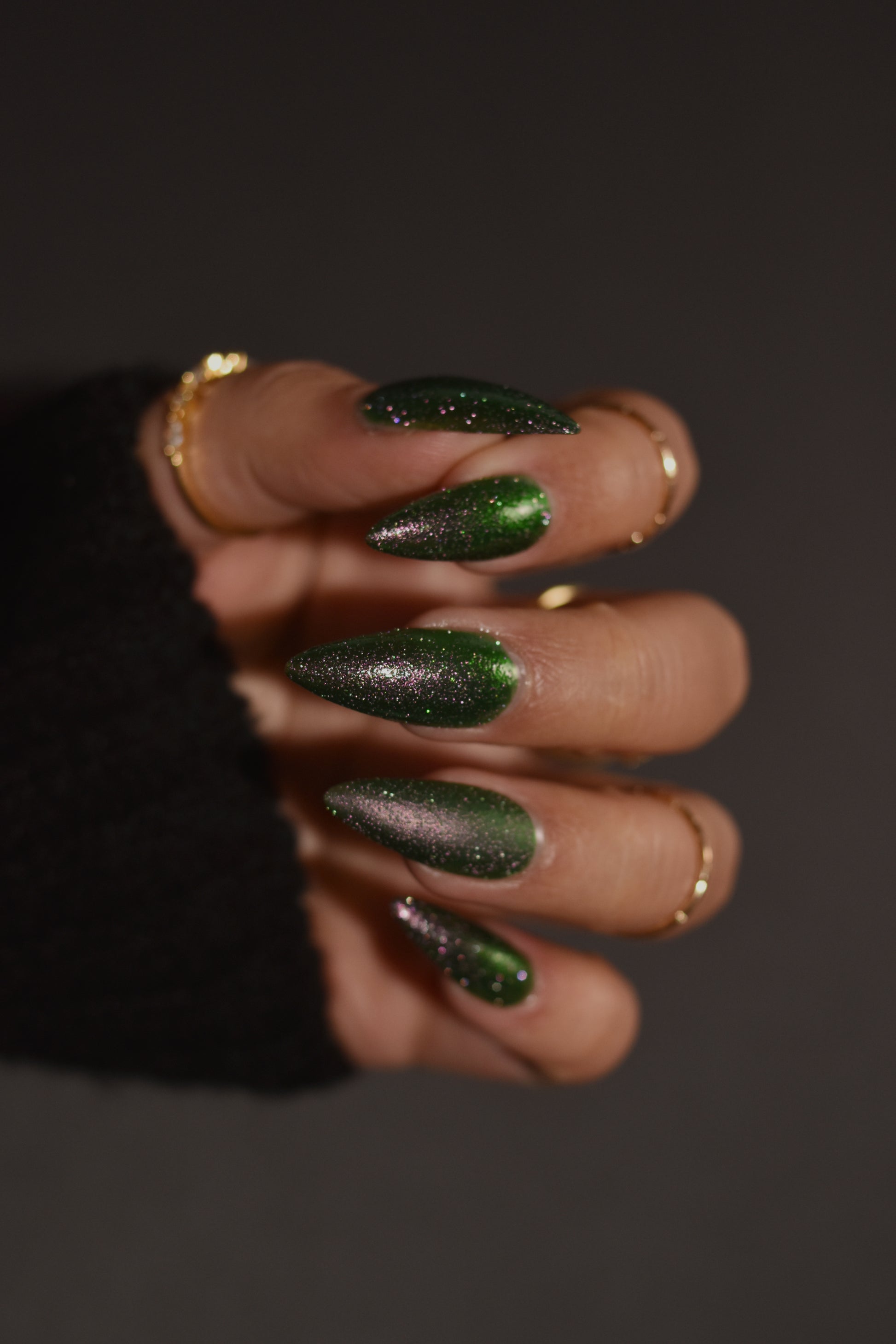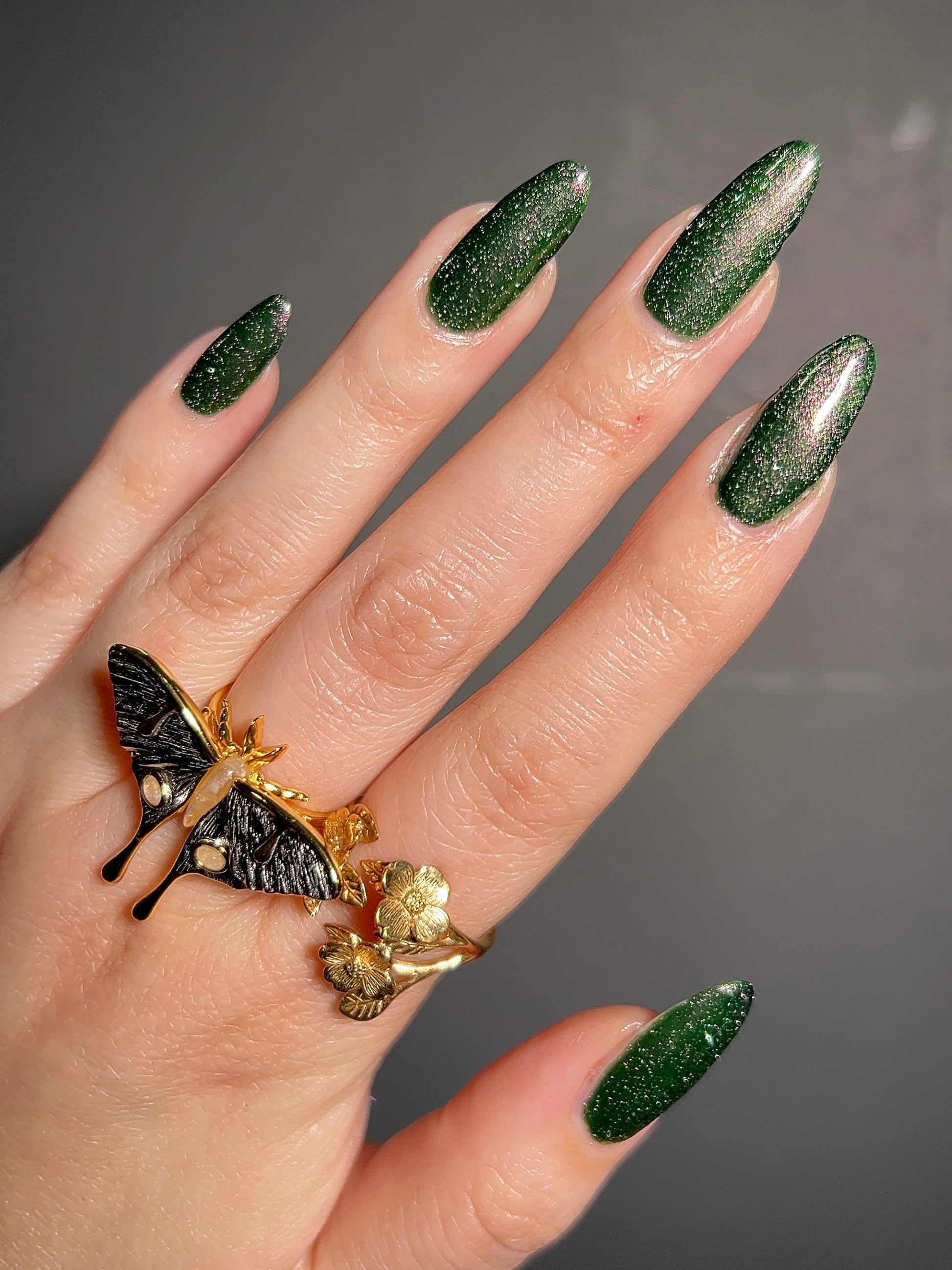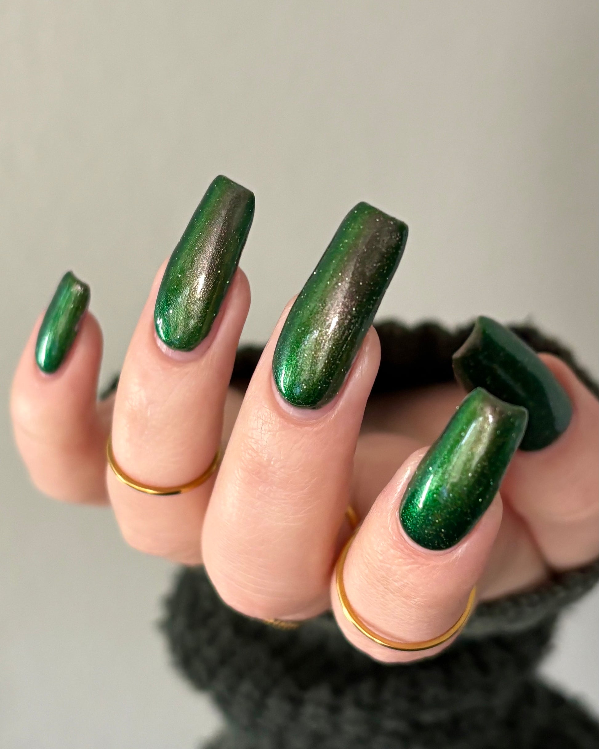 I see the shade Past, Present, Future making its way into your life. These months theme is Tarot and I instantly wanted to do a witchy vibe. This shade is a mysterious gray-green base with silver reflective glitters. Wear it, and you’ll swear you can hear the shuffle of fate… the past creeping behind you, the present tightening its grip, and the future waiting, patient and hungry, just beyond the next draw.