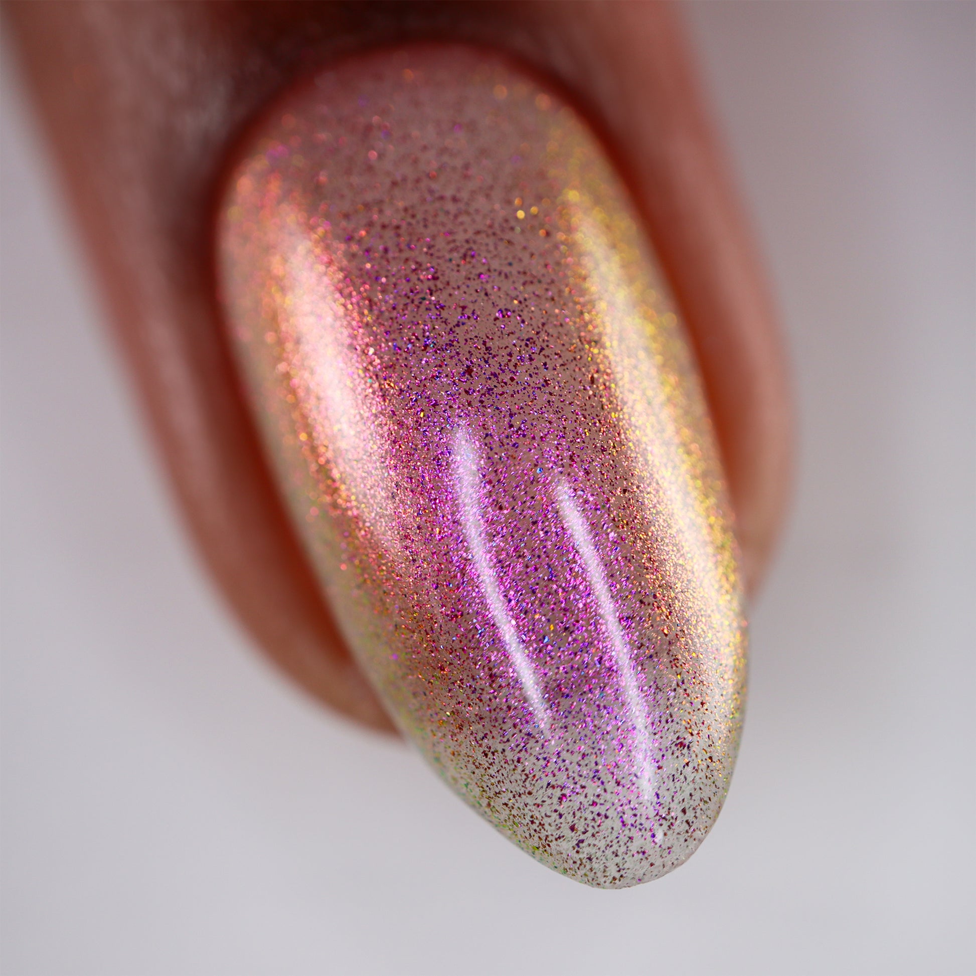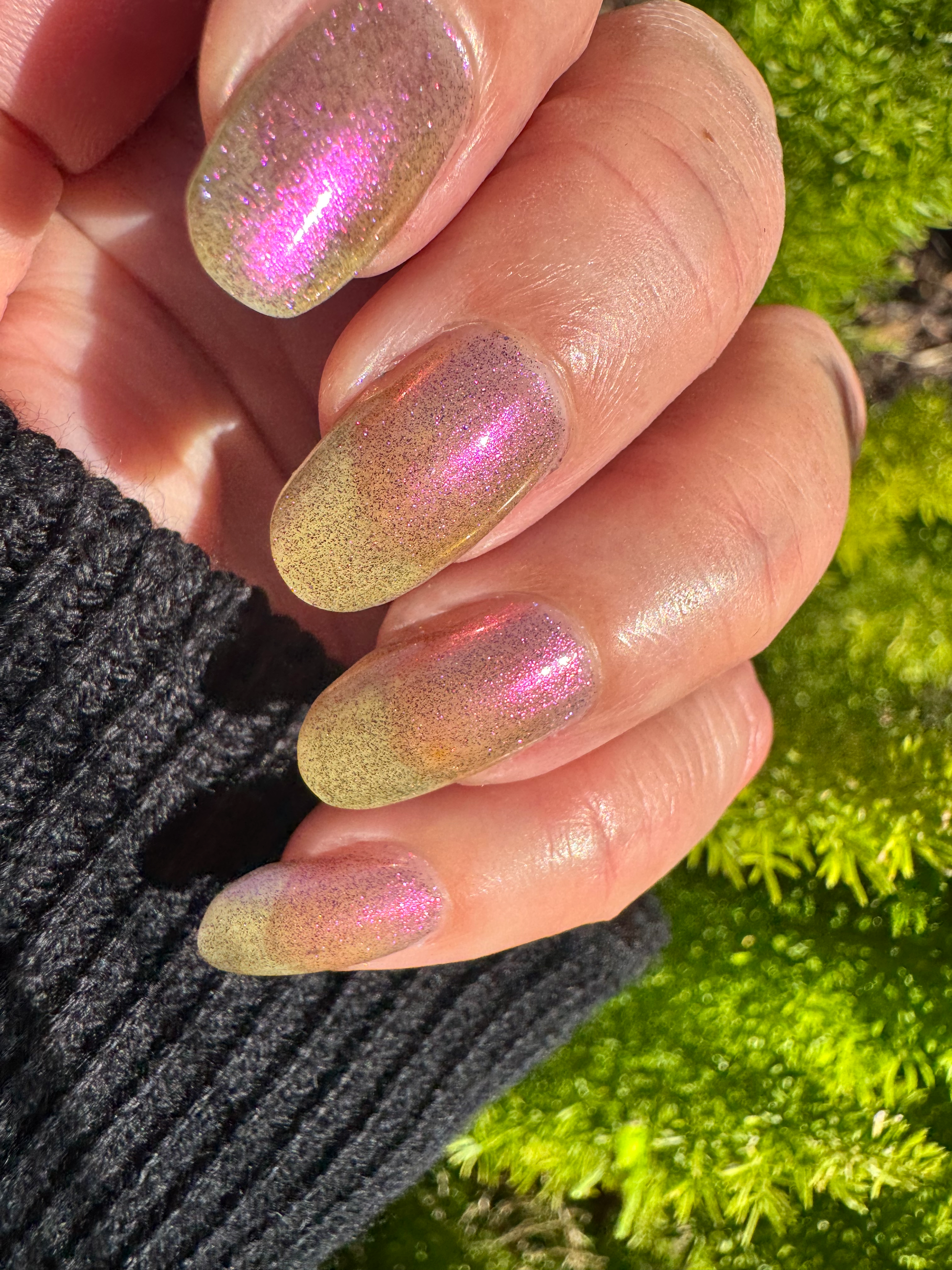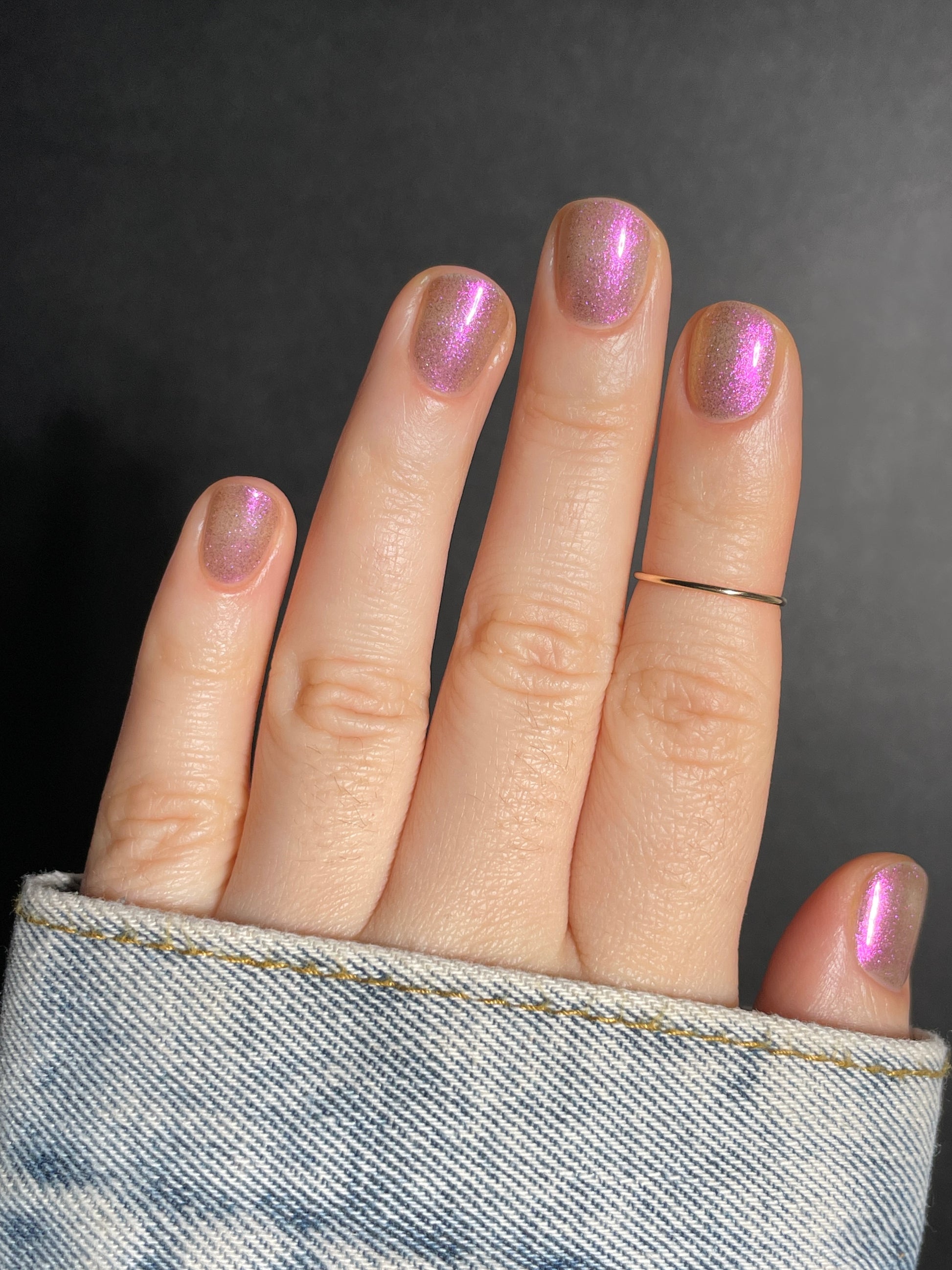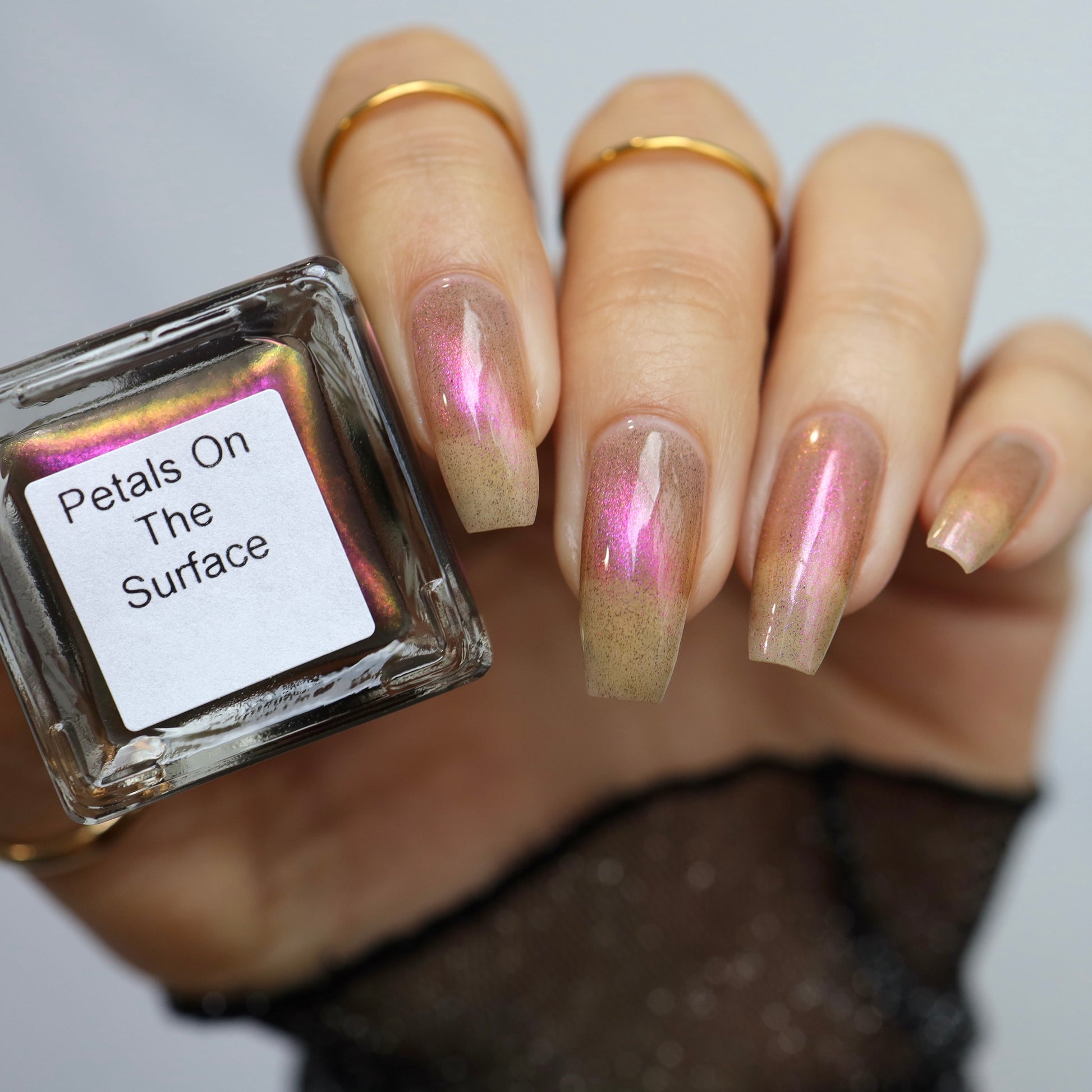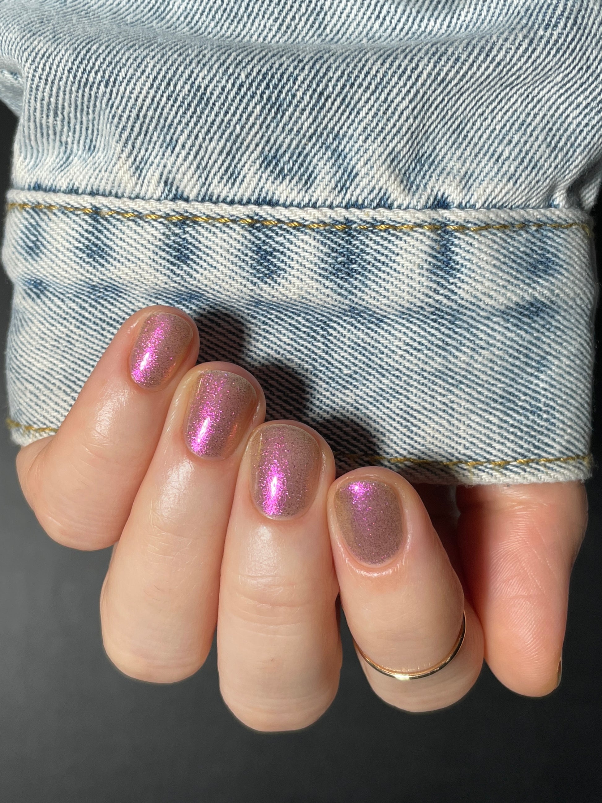 Petals On The Surface is a pink magnetic topper with a slight gold shift in extreme angles and a speckled peppery clear base. You’ll want to put this over everything, adding just the right amount of sparkle and magic to your favorite shades.