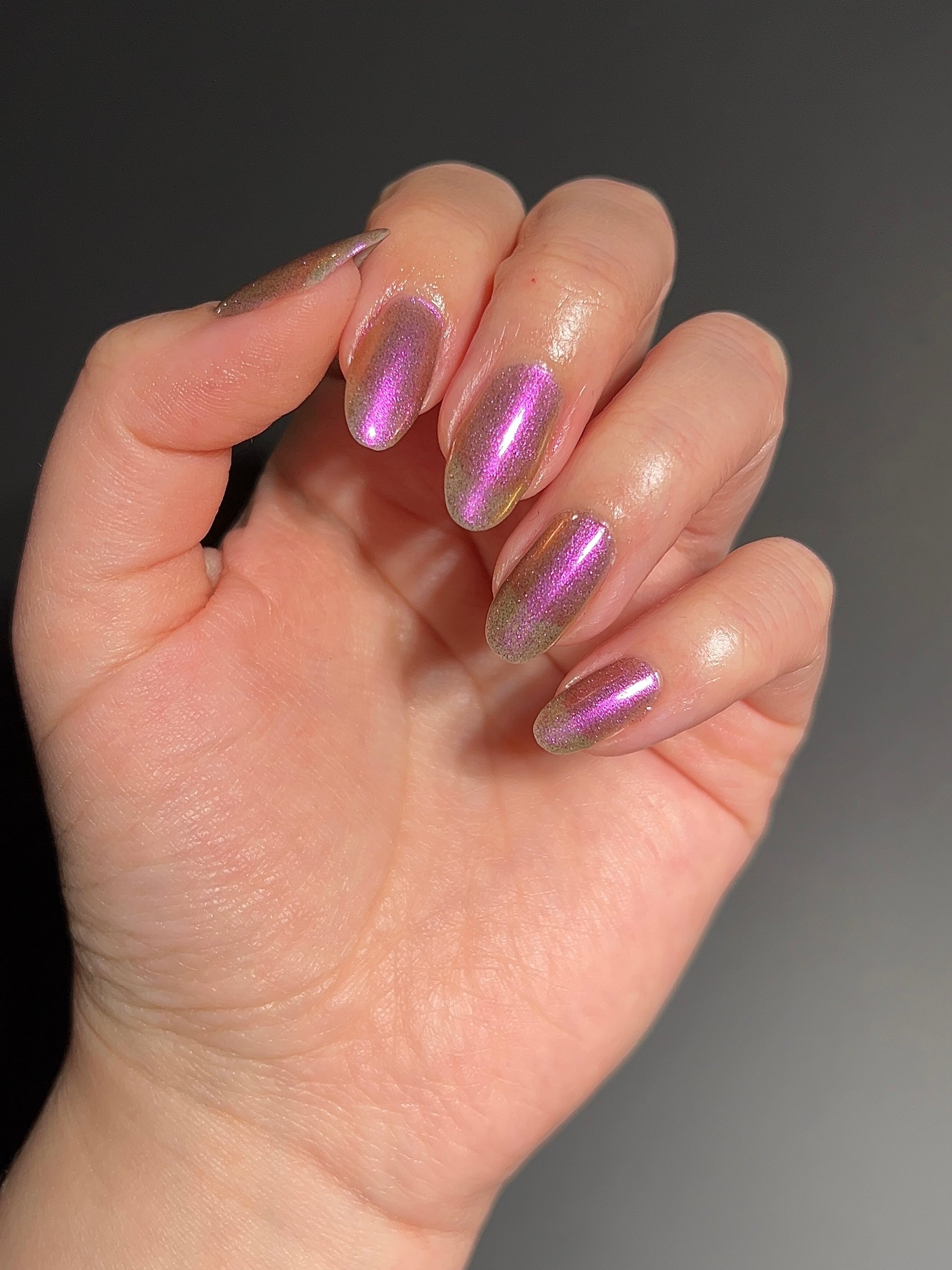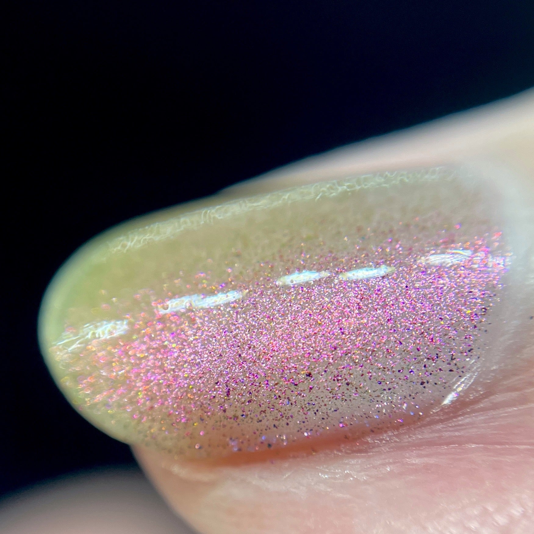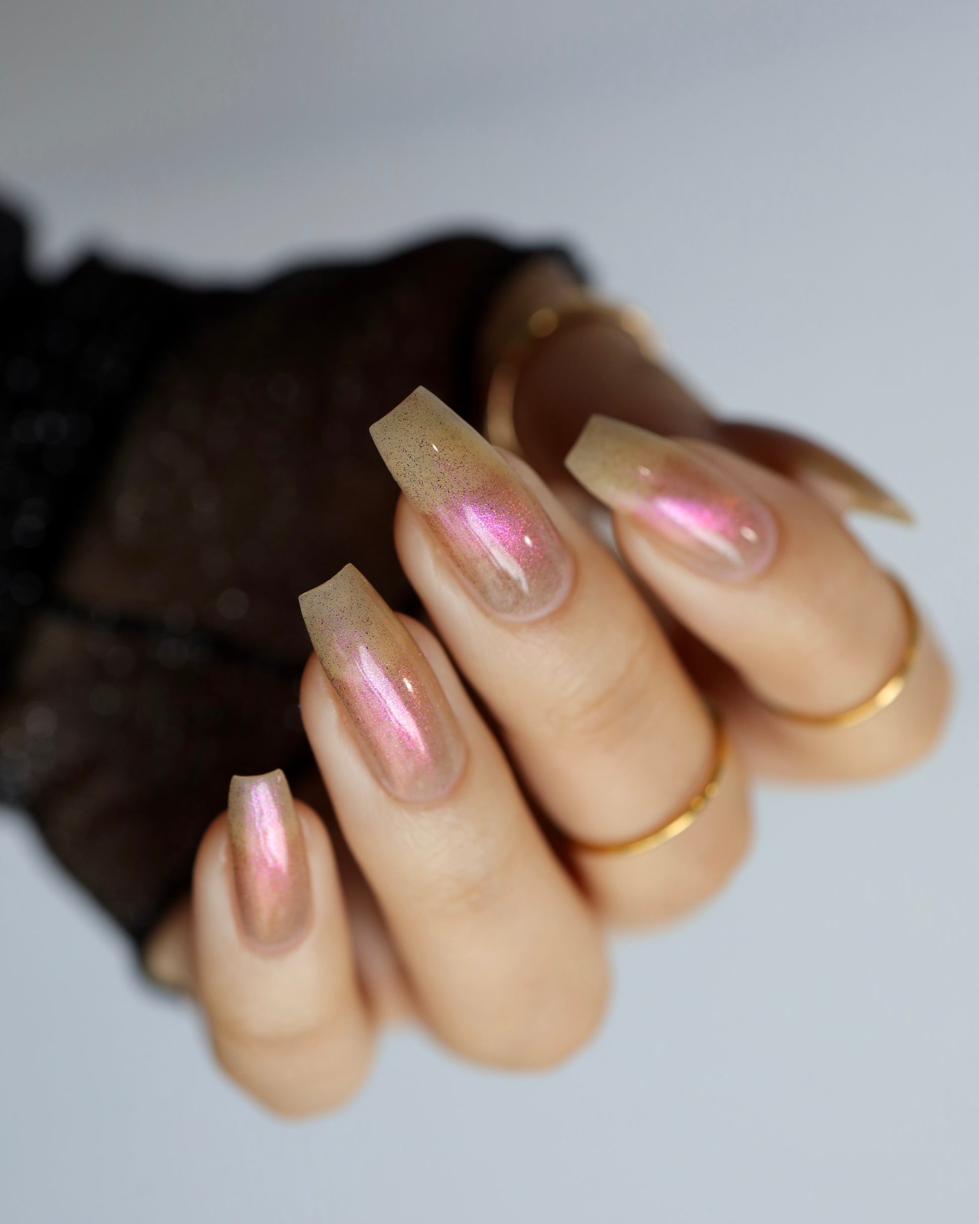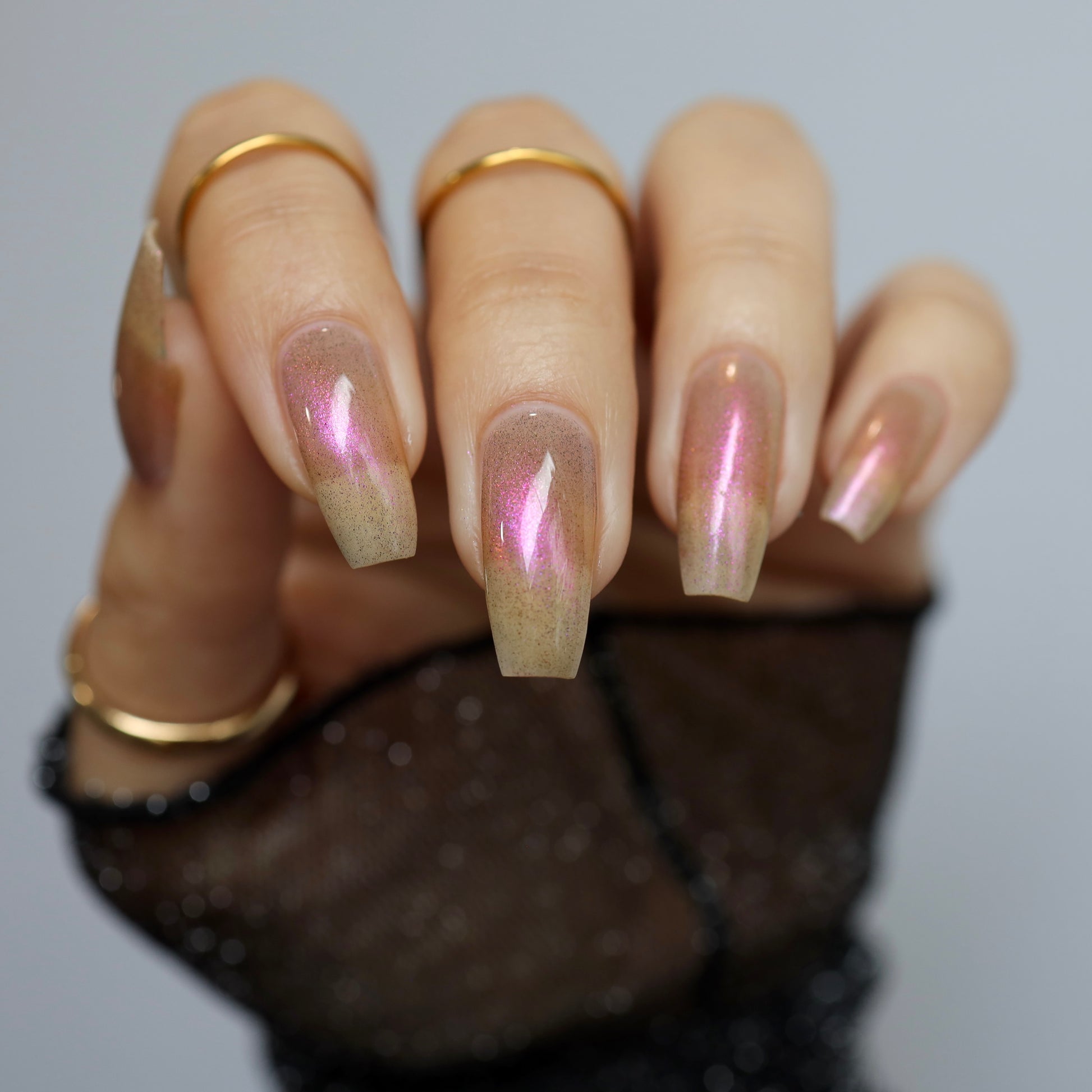 Petals On The Surface is a pink magnetic topper with a slight gold shift in extreme angles and a speckled peppery clear base. You’ll want to put this over everything, adding just the right amount of sparkle and magic to your favorite shades.