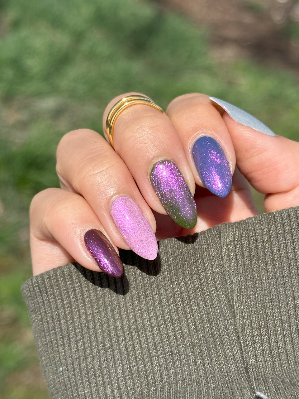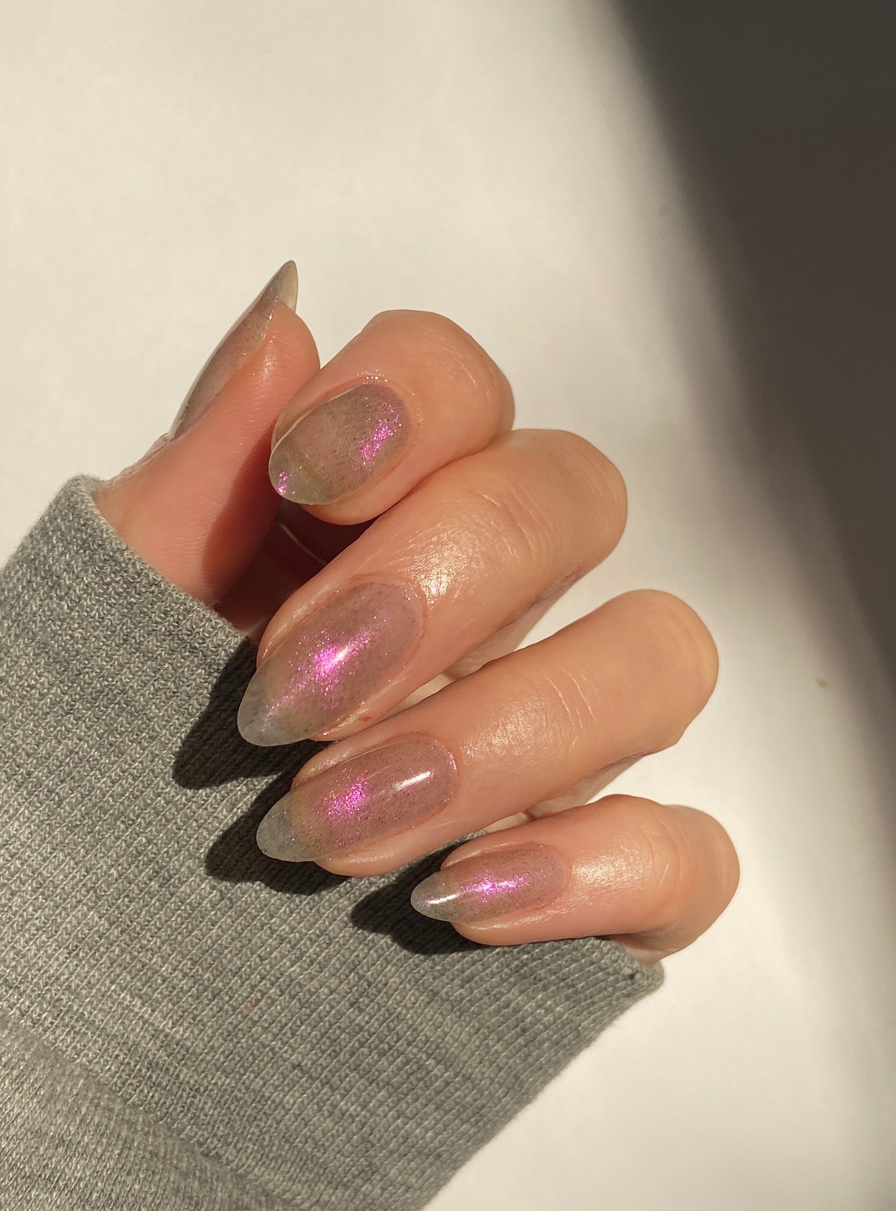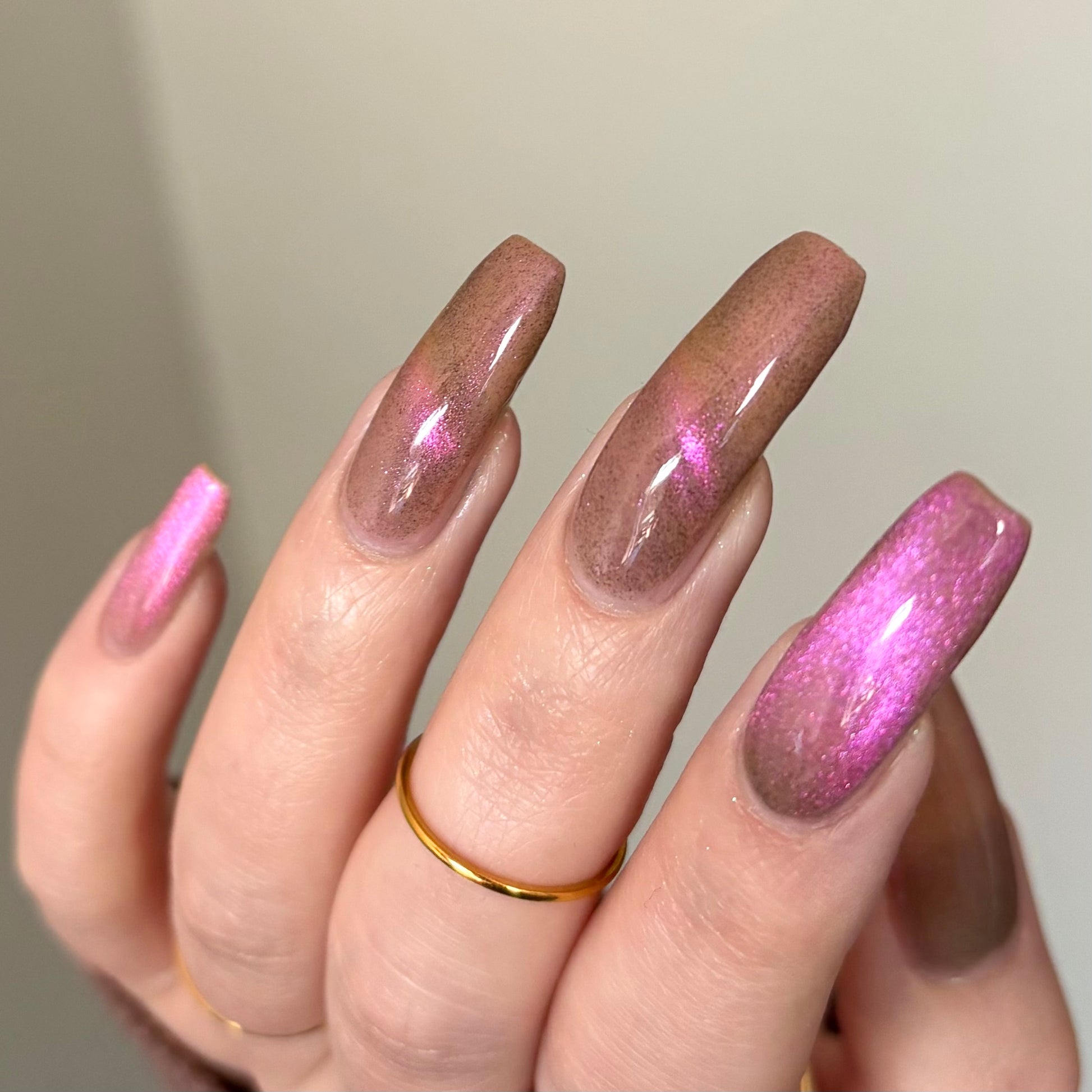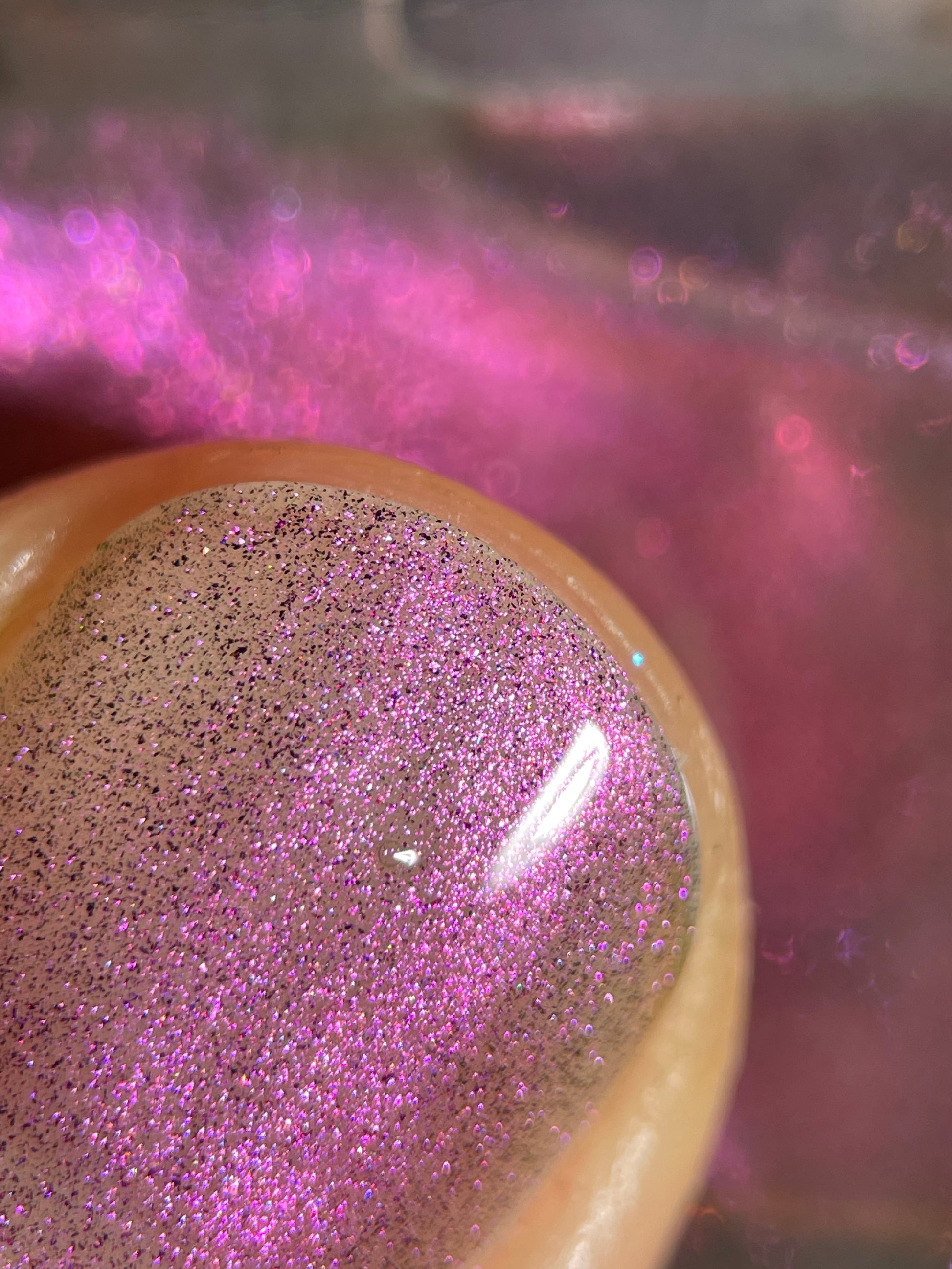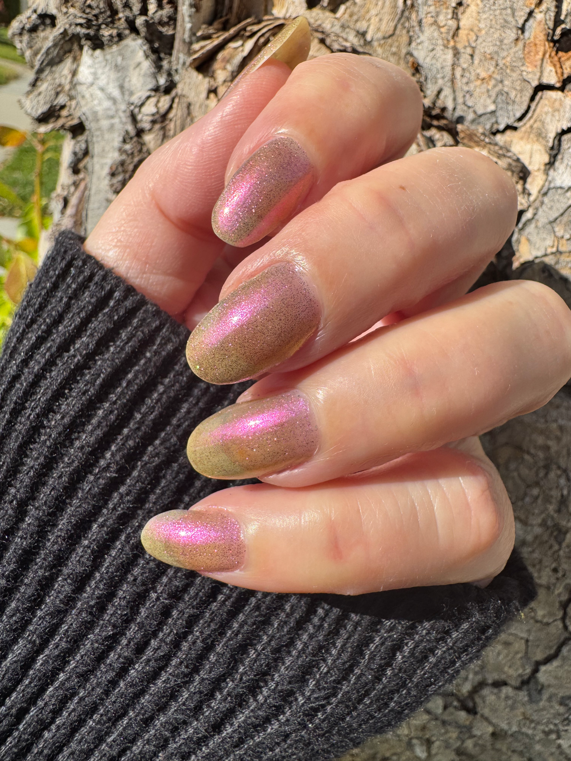 Petals On The Surface is a pink magnetic topper with a slight gold shift in extreme angles and a speckled peppery clear base. You’ll want to put this over everything, adding just the right amount of sparkle and magic to your favorite shades.
