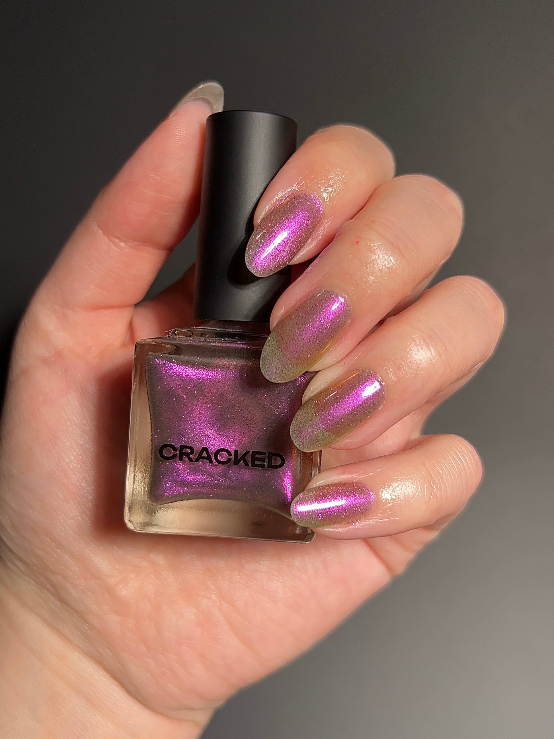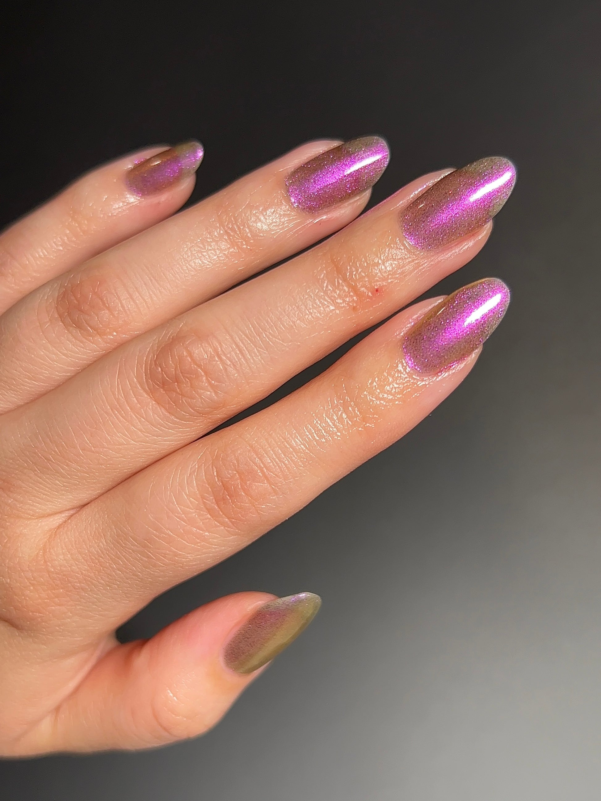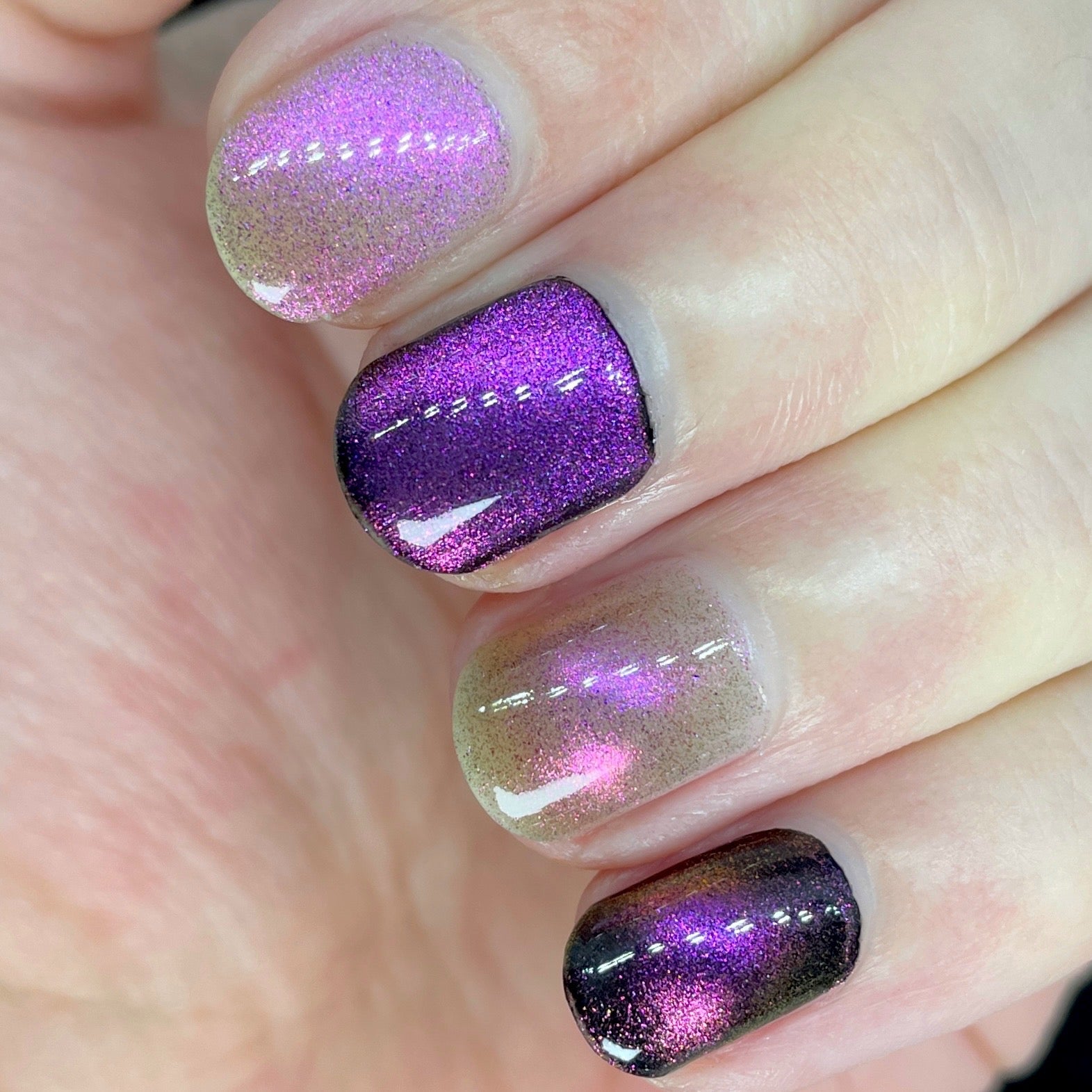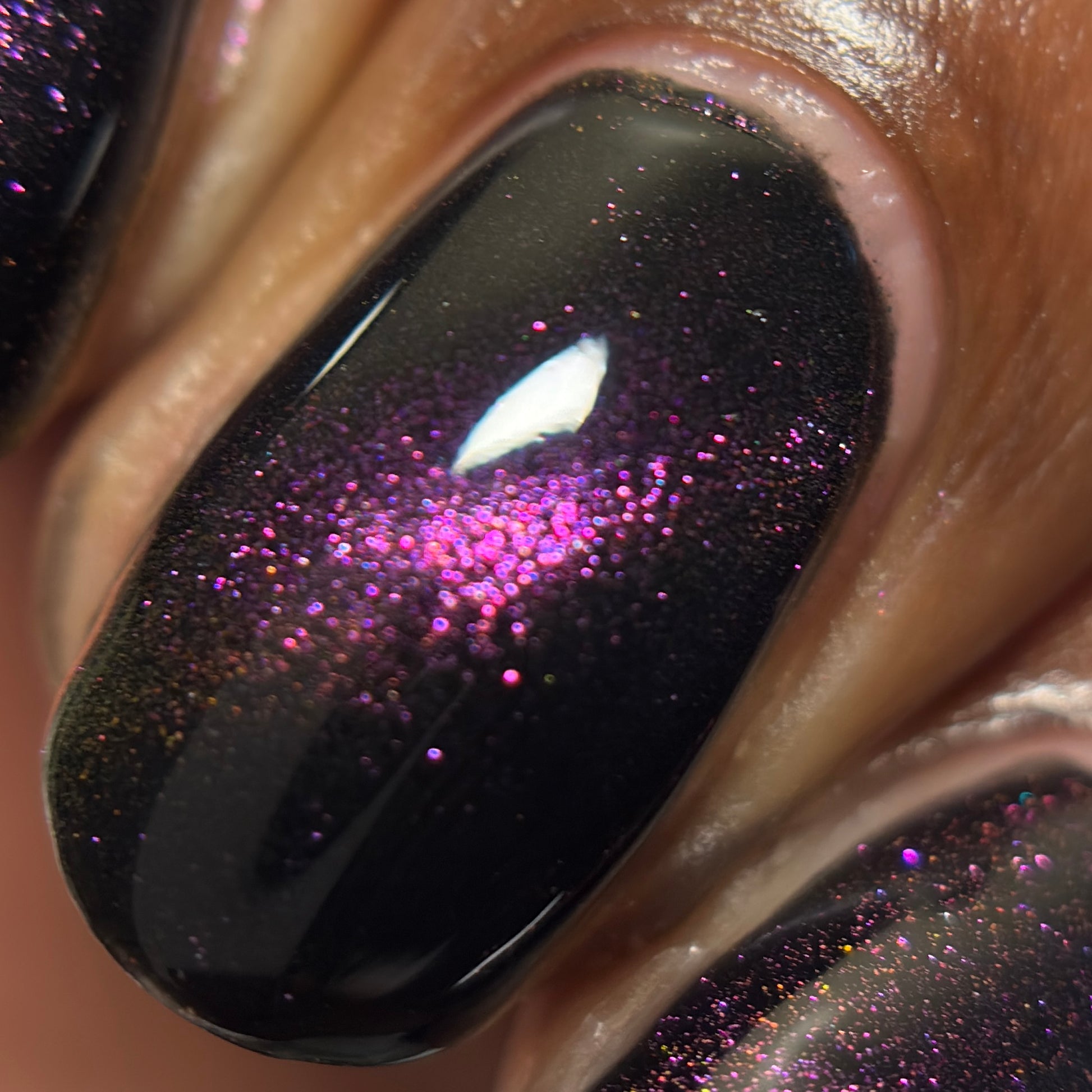 Petals On The Surface is a pink magnetic topper with a slight gold shift in extreme angles and a speckled peppery clear base. You’ll want to put this over everything, adding just the right amount of sparkle and magic to your favorite shades.