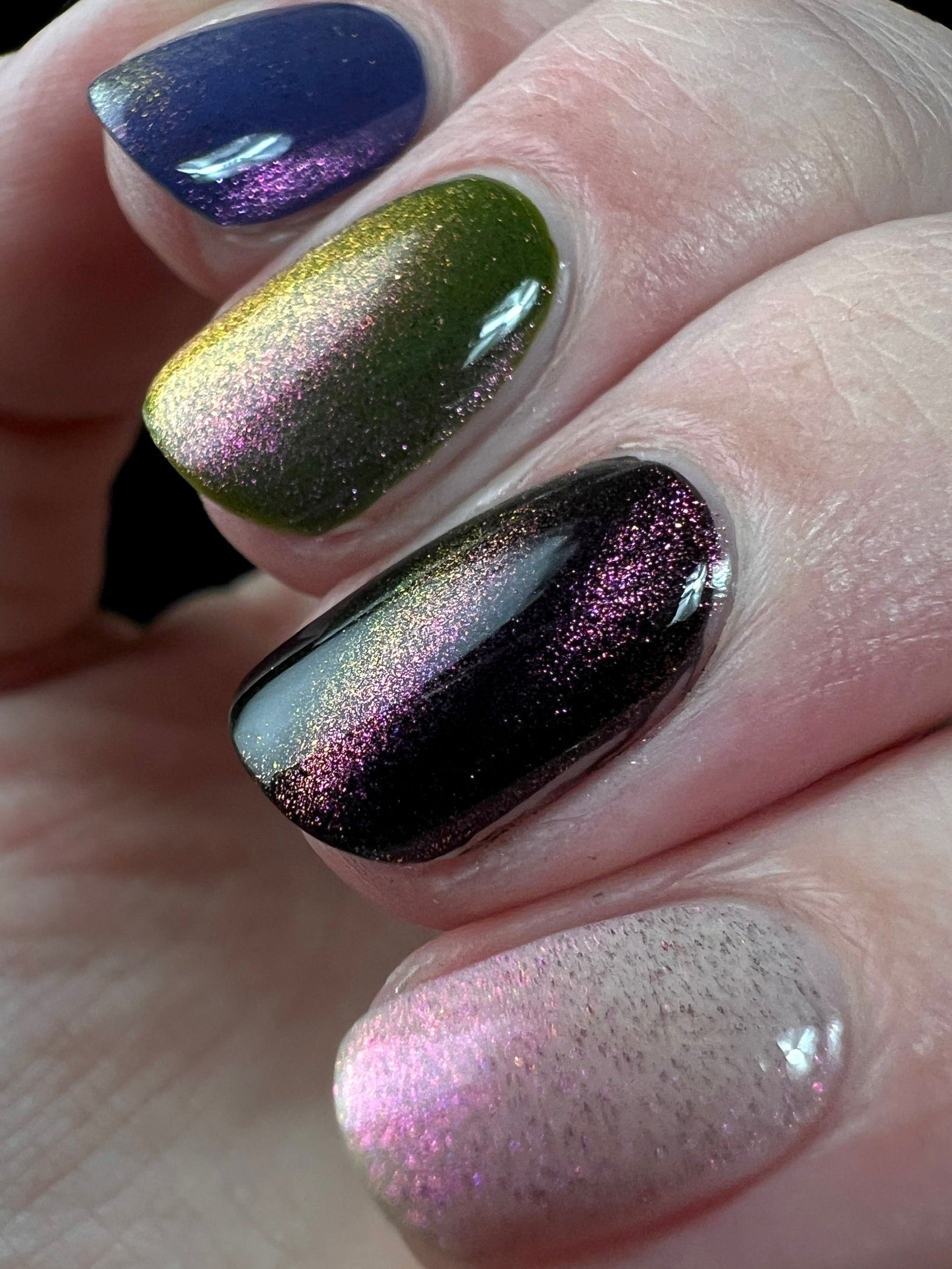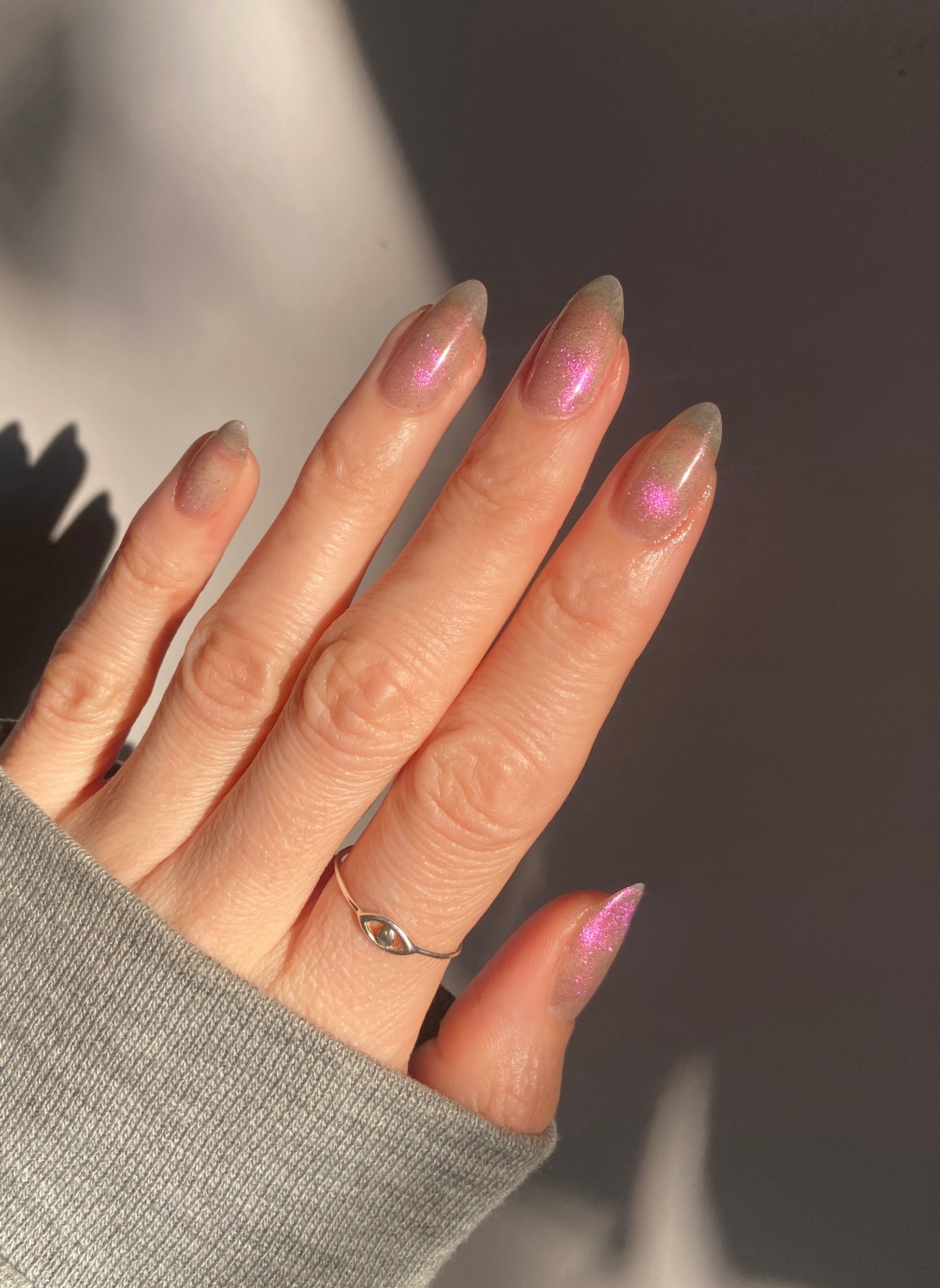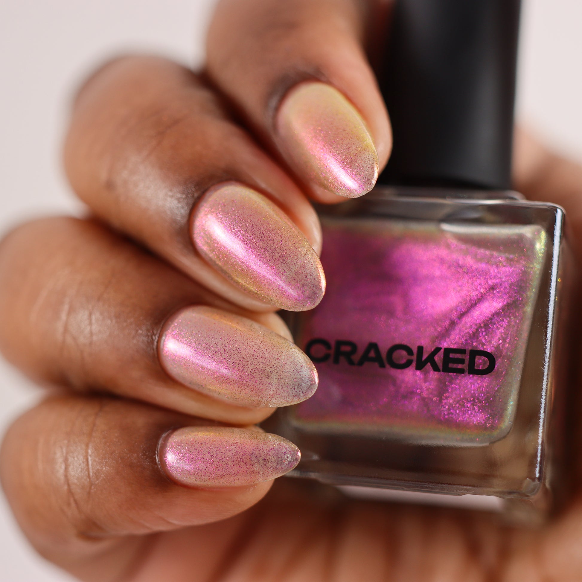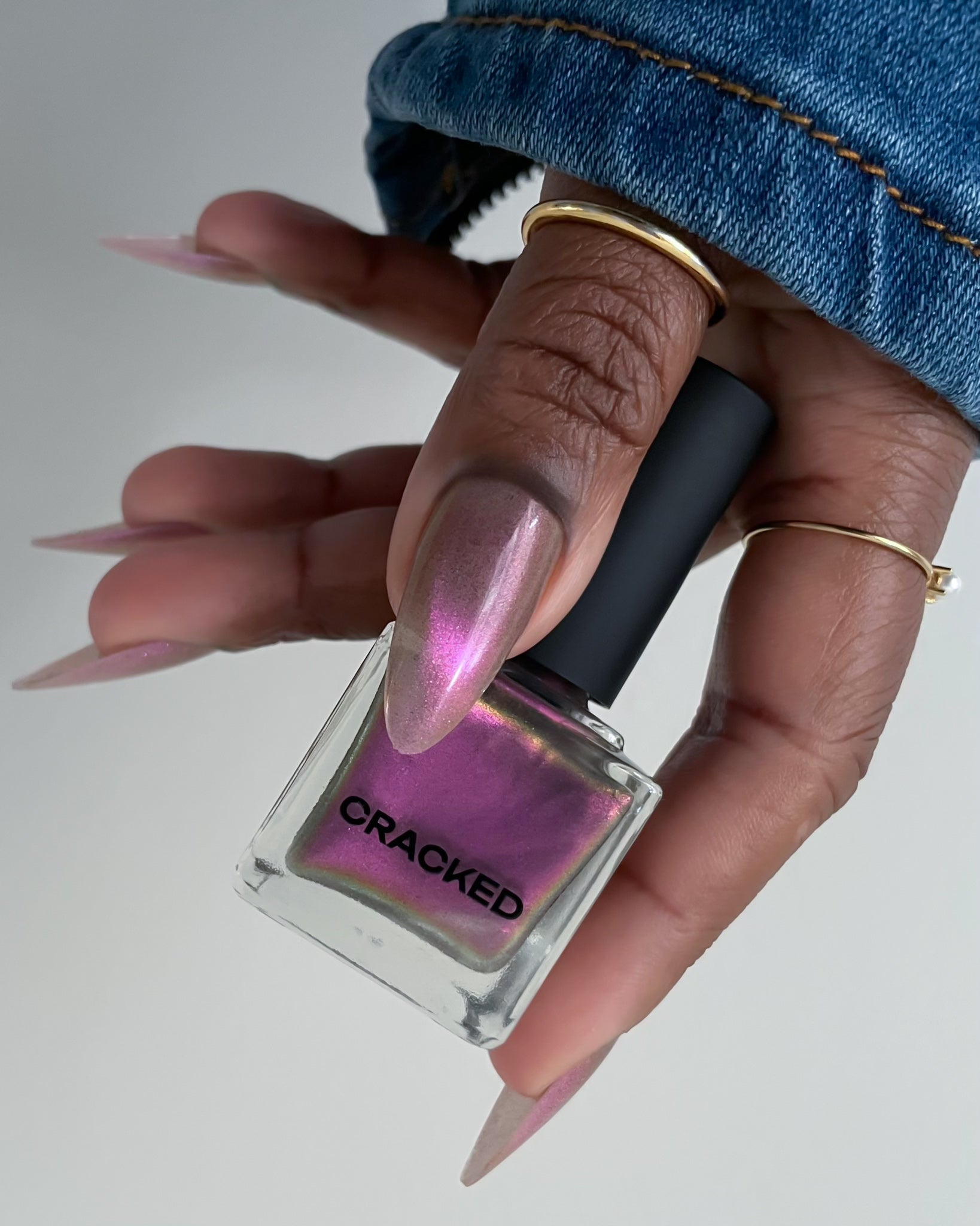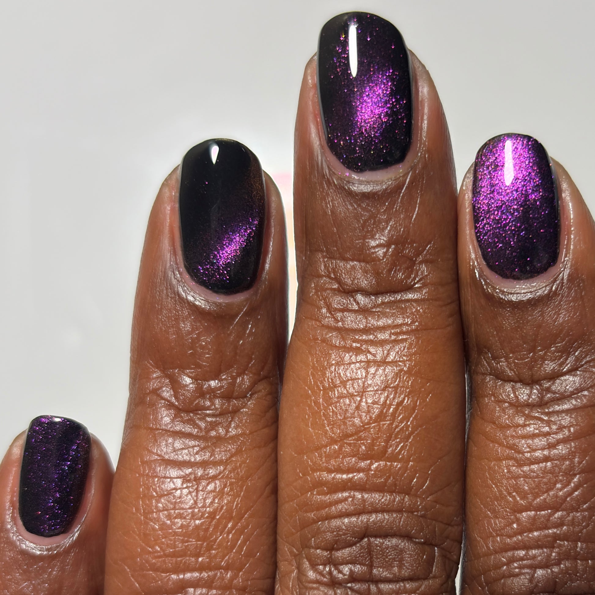 Petals On The Surface is a pink magnetic topper with a slight gold shift in extreme angles and a speckled peppery clear base. You’ll want to put this over everything, adding just the right amount of sparkle and magic to your favorite shades.