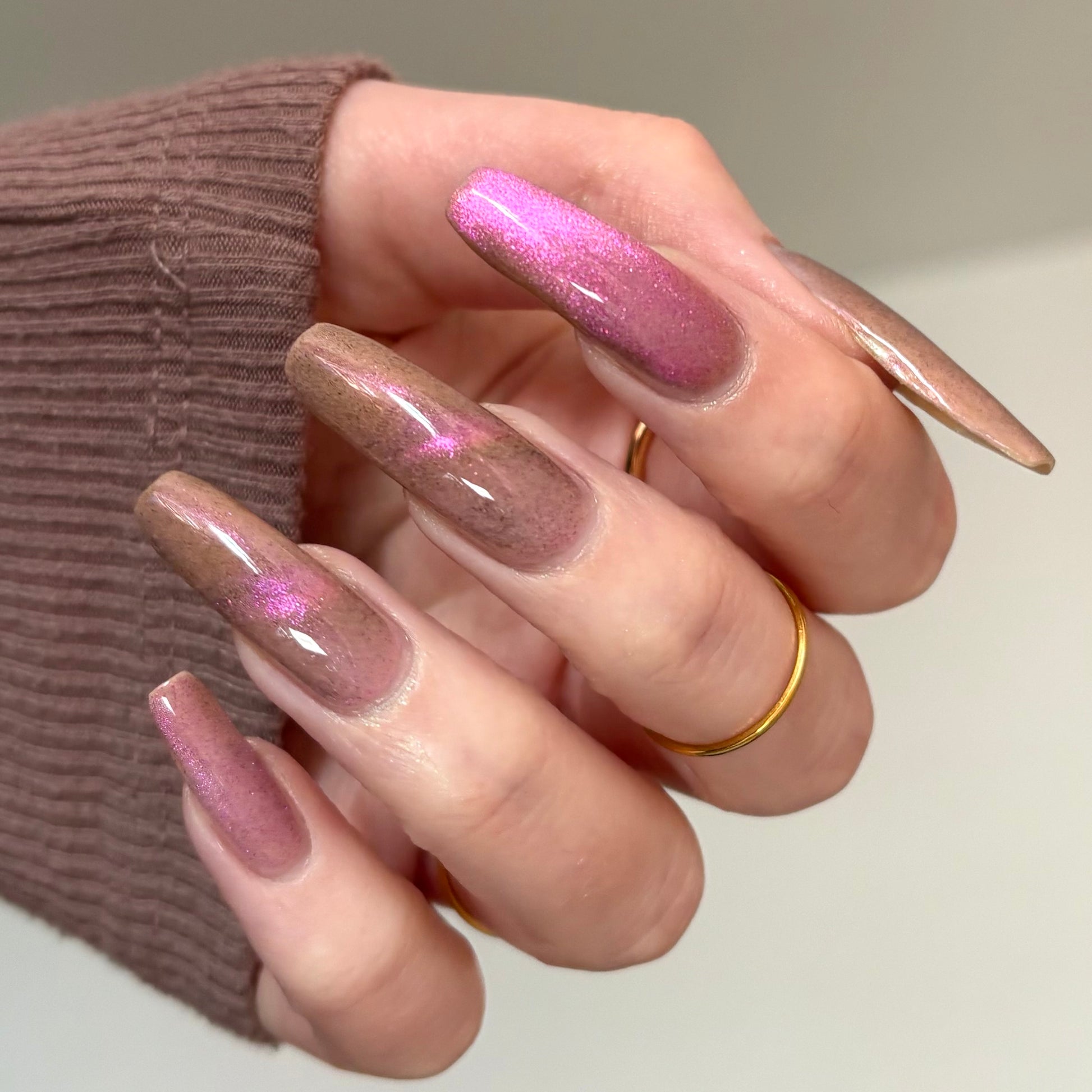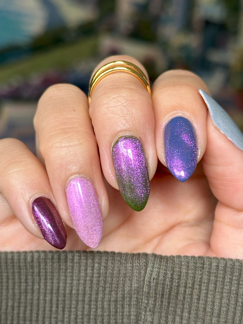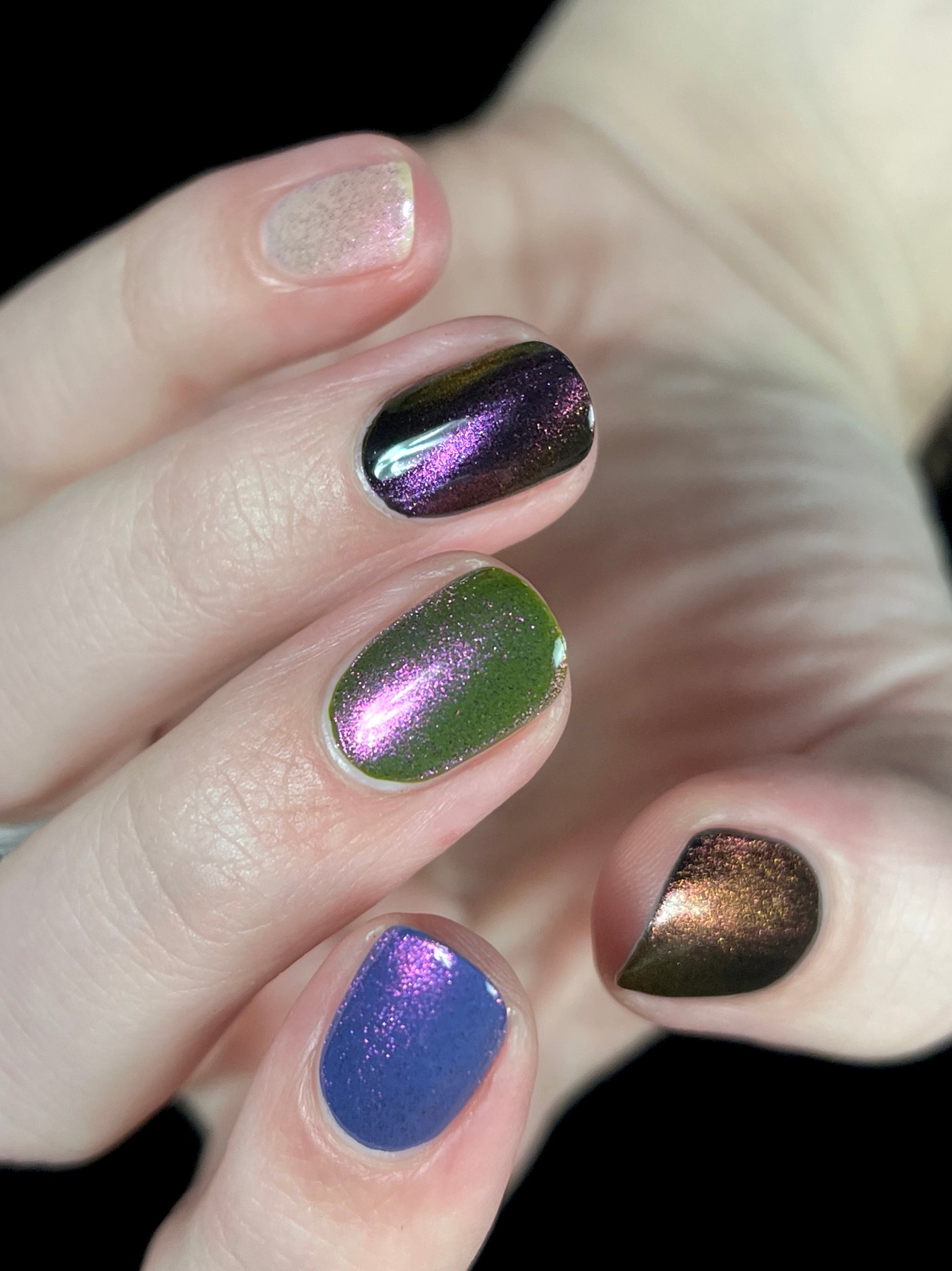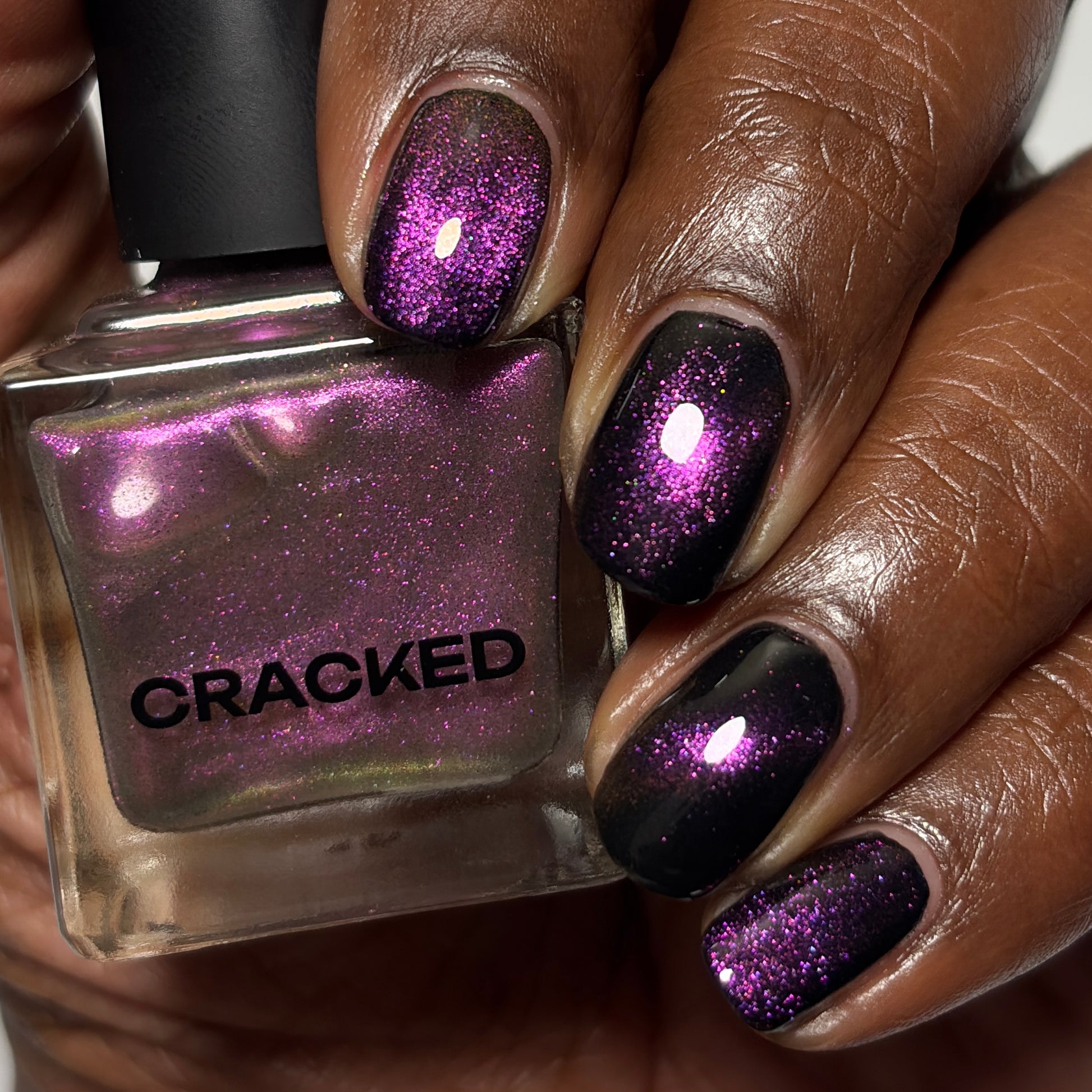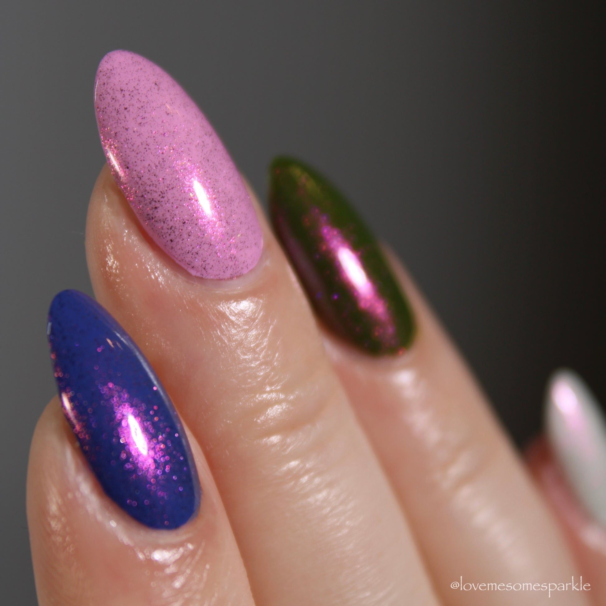 Petals On The Surface is a pink magnetic topper with a slight gold shift in extreme angles and a speckled peppery clear base. You’ll want to put this over everything, adding just the right amount of sparkle and magic to your favorite shades.