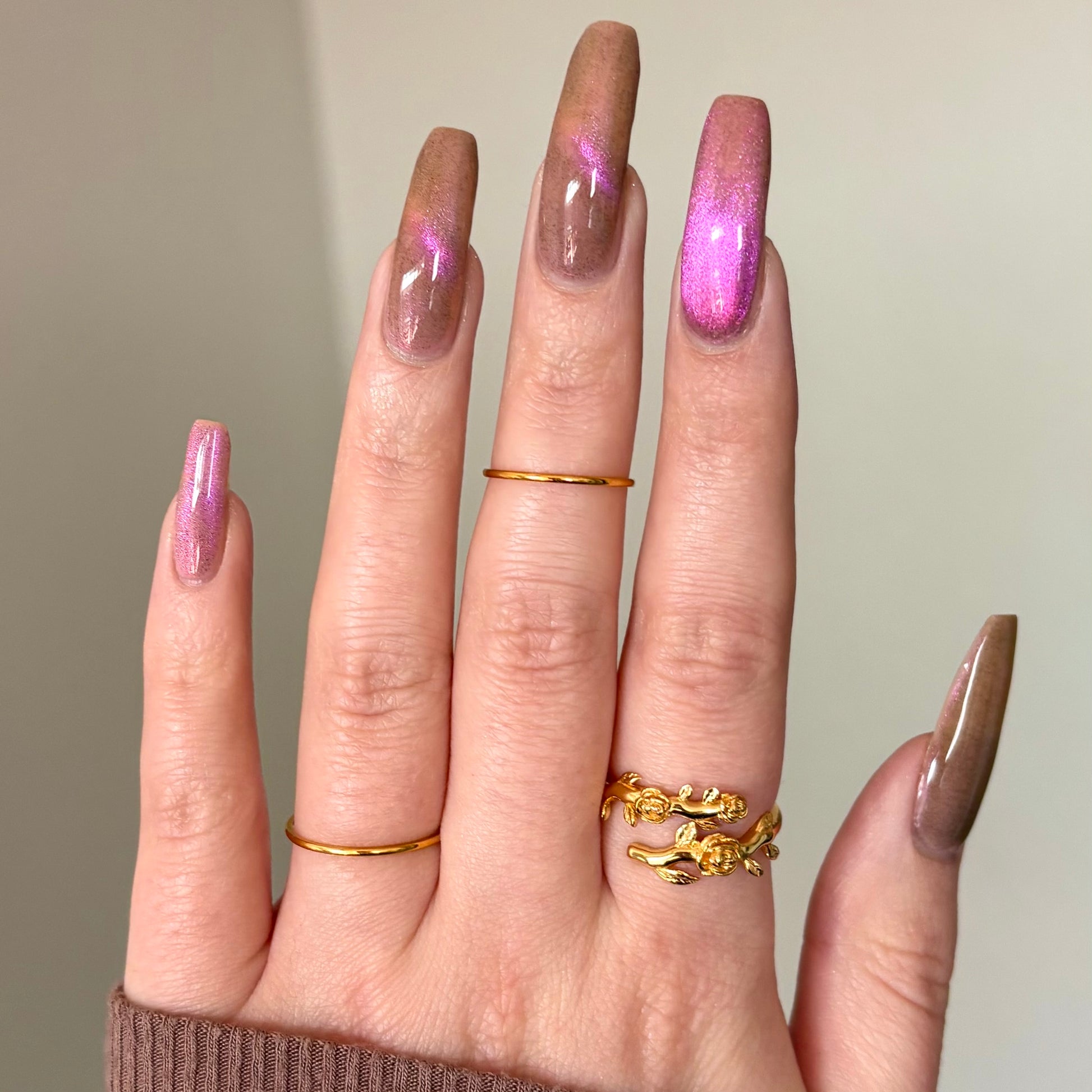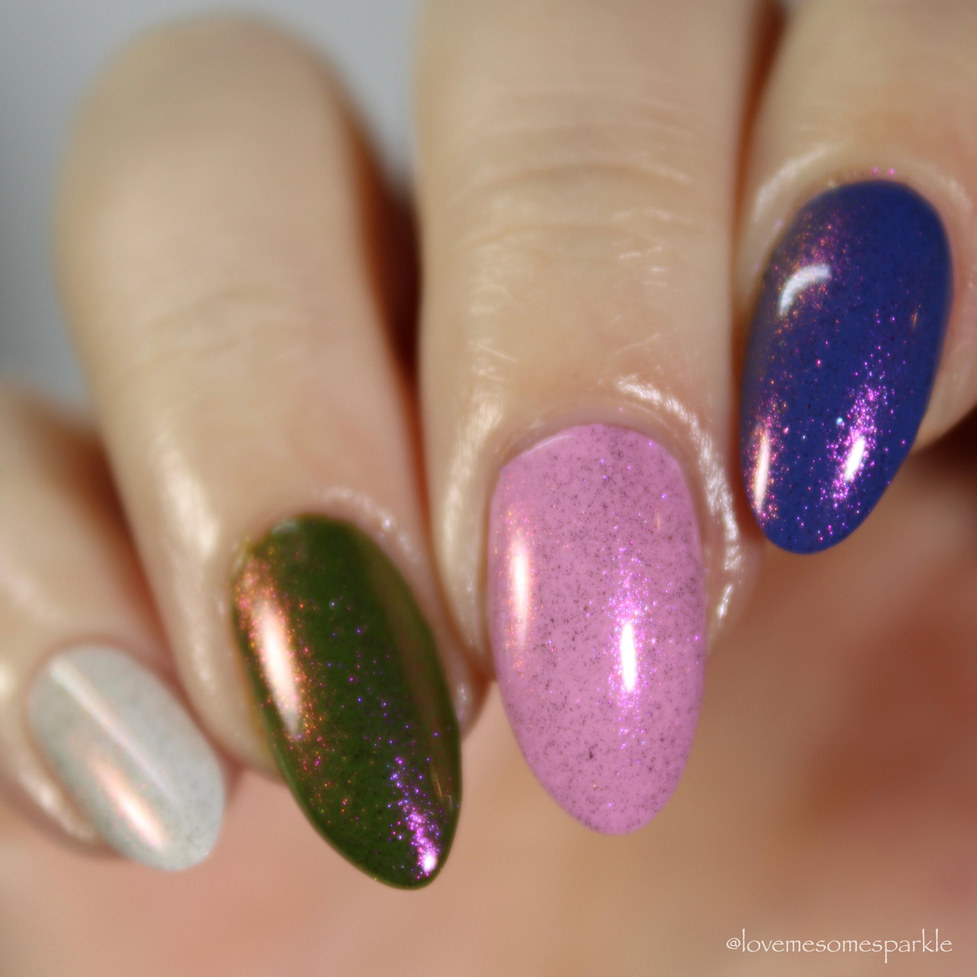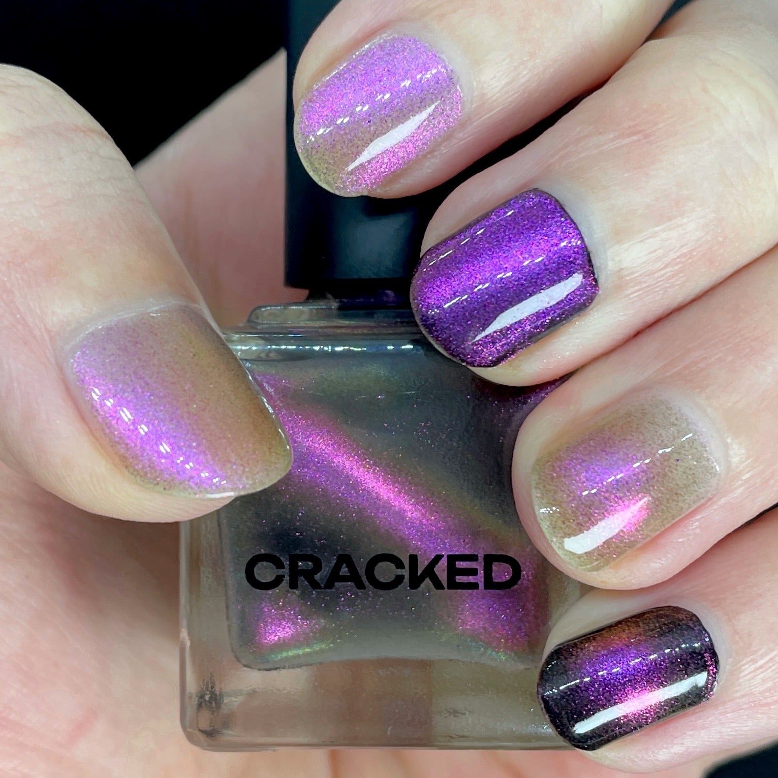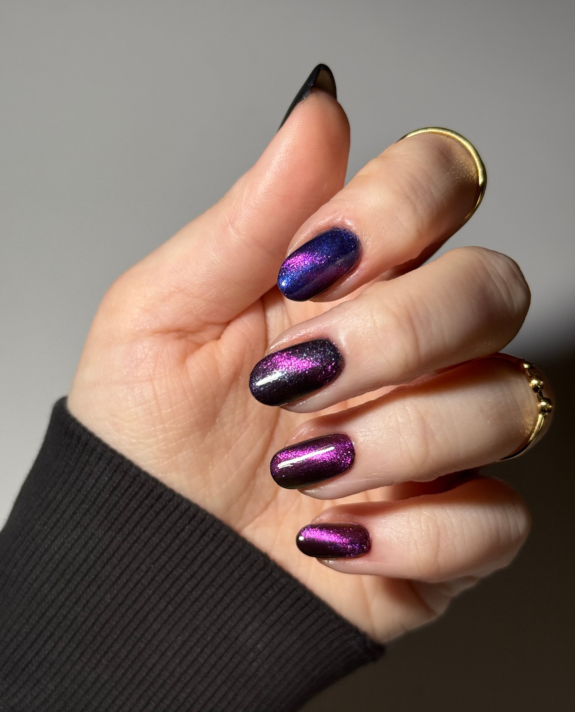 Petals On The Surface is a pink magnetic topper with a slight gold shift in extreme angles and a speckled peppery clear base. You’ll want to put this over everything, adding just the right amount of sparkle and magic to your favorite shades.