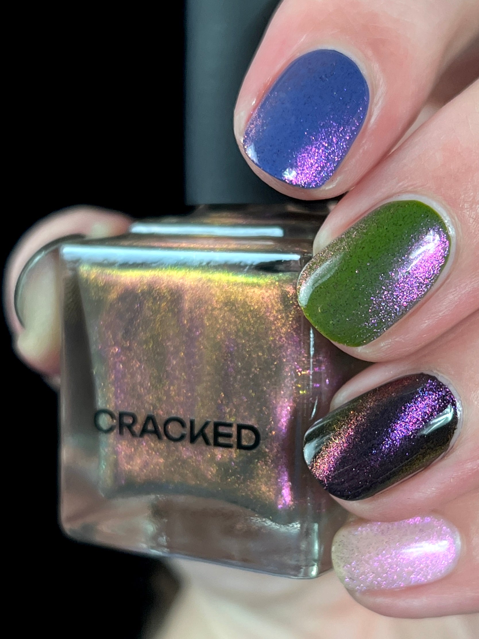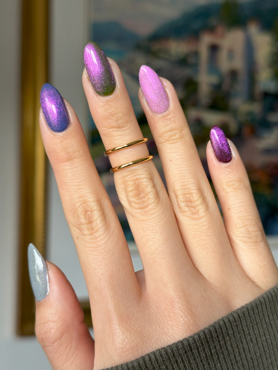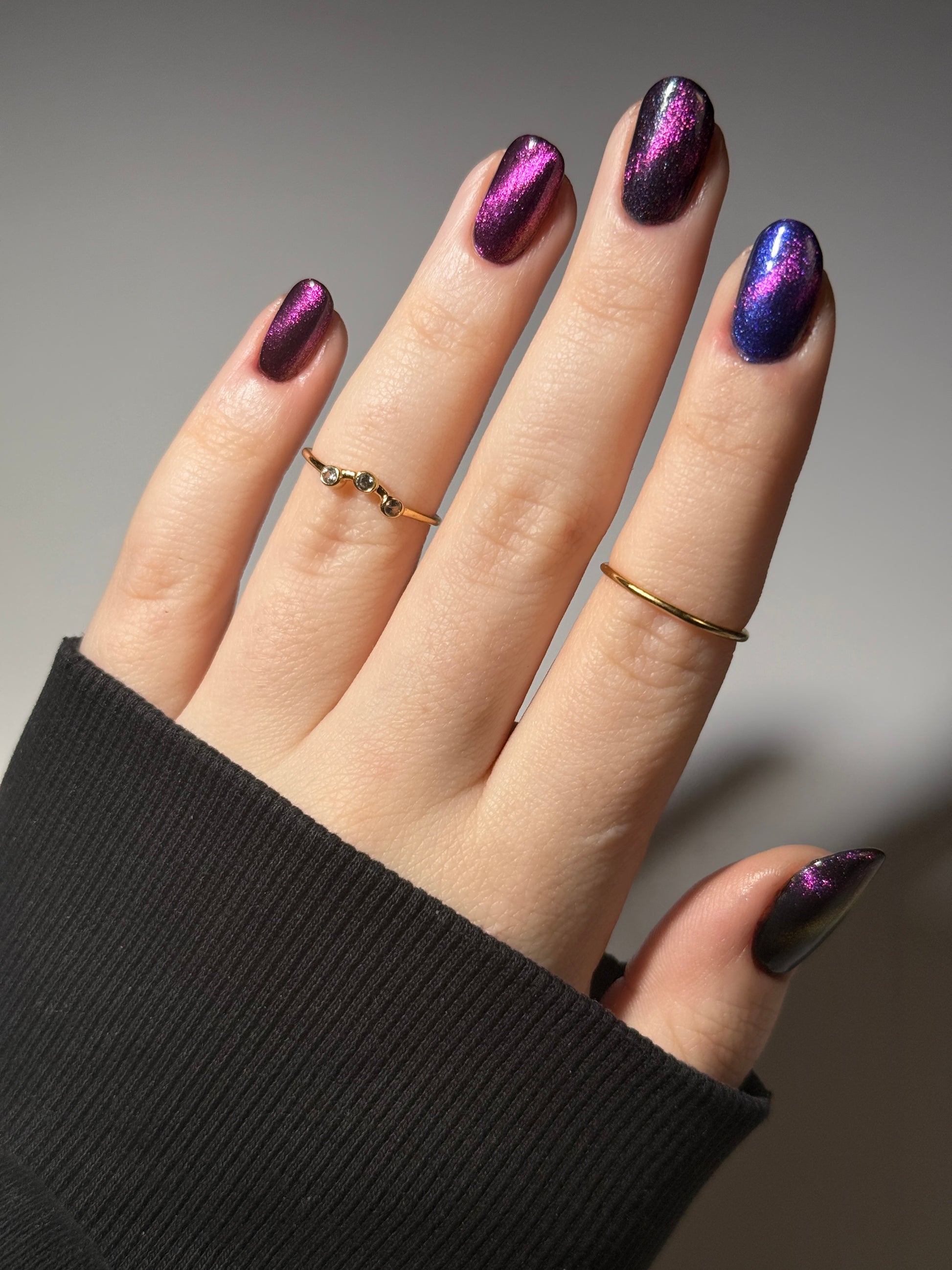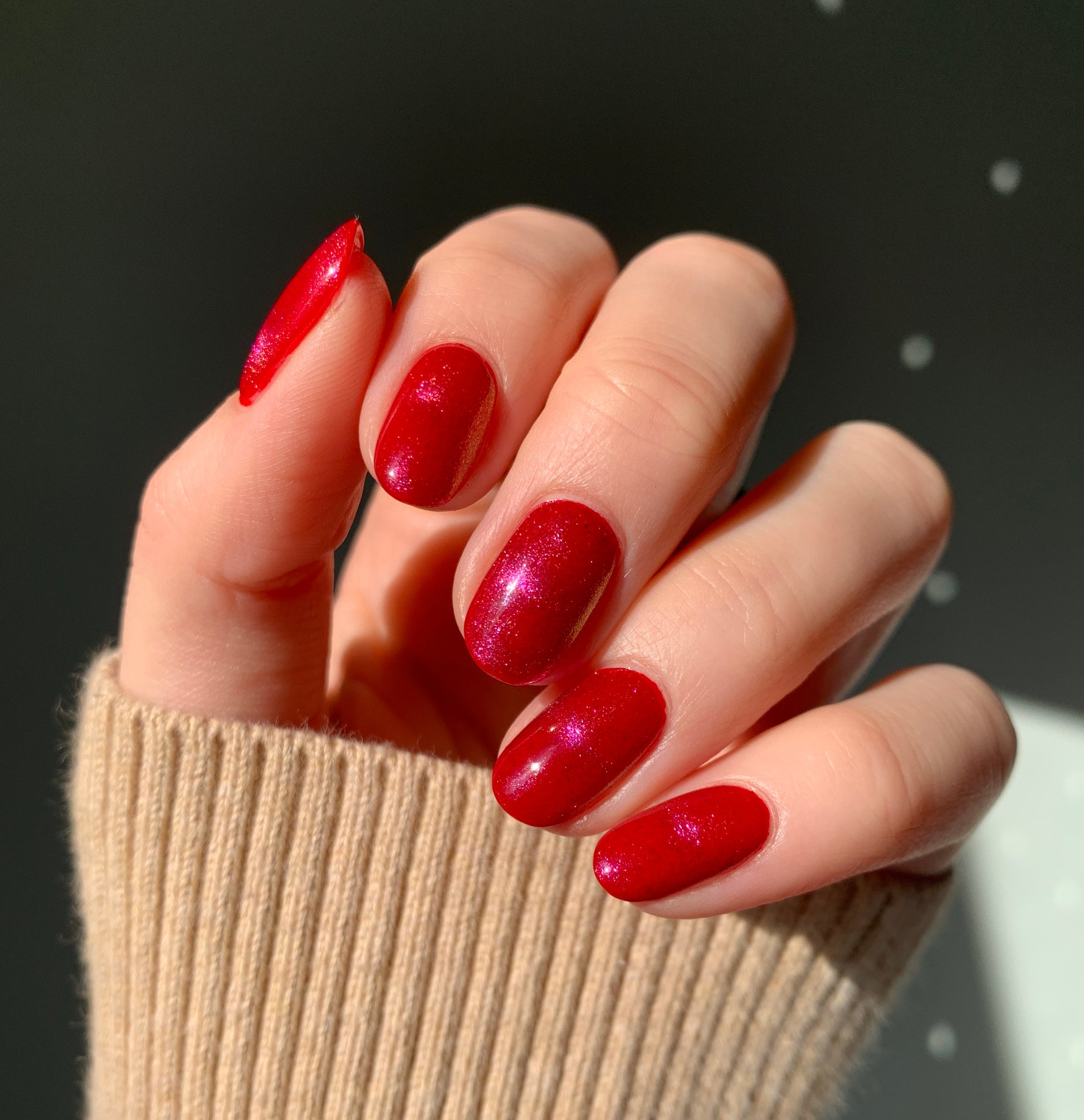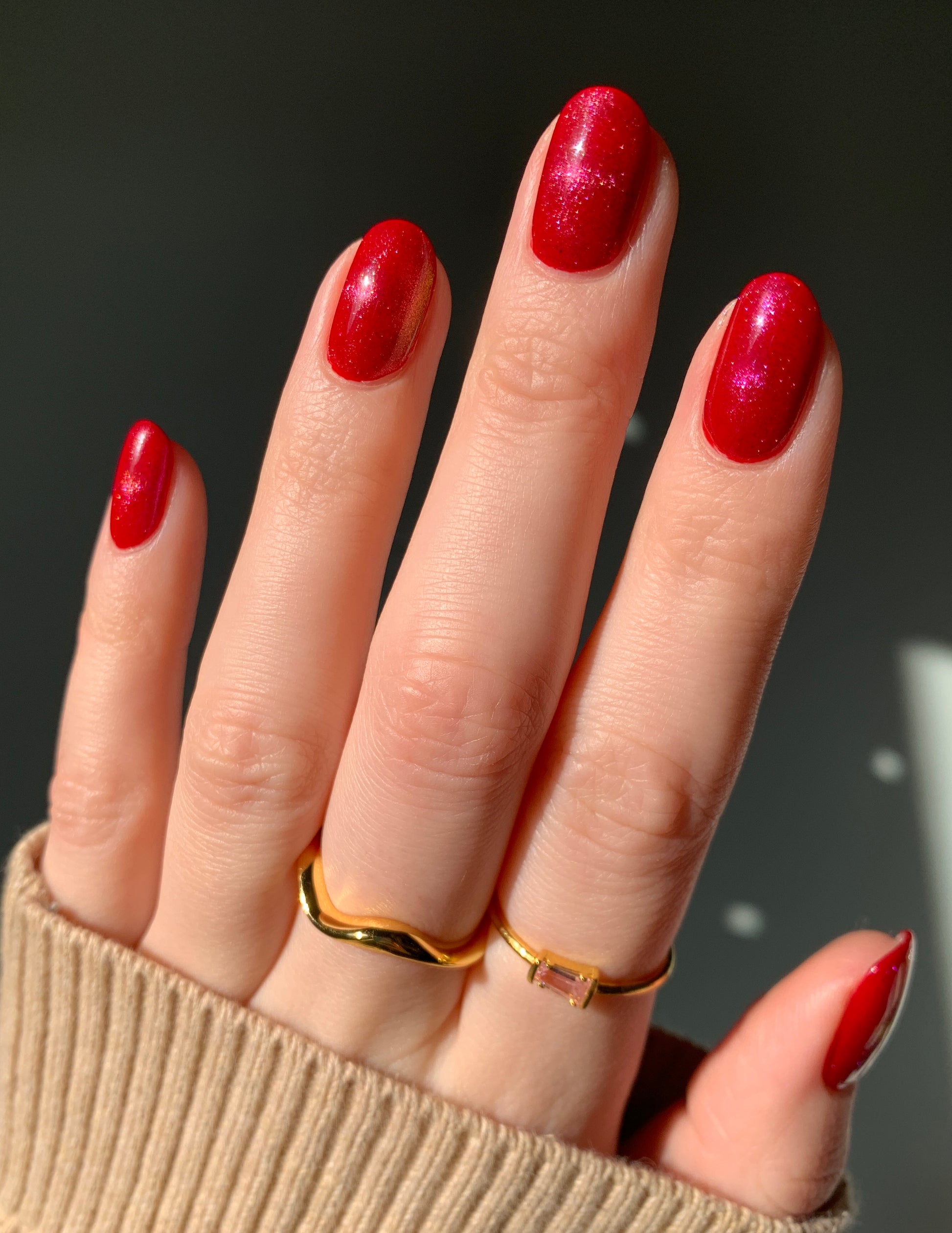Petals On The Surface is a pink magnetic topper with a slight gold shift in extreme angles and a speckled peppery clear base. You’ll want to put this over everything, adding just the right amount of sparkle and magic to your favorite shades.