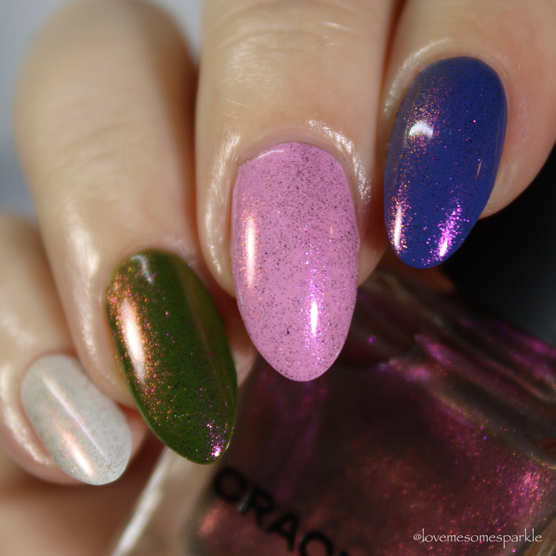 Fun Facts From Audrey: I have two cats, Juniper and Bramble. Speckles and pink shimmer are two of my fav things in nail polish. I have my BFA in studio art, and before nail art I did copperplate etching and gouache painting