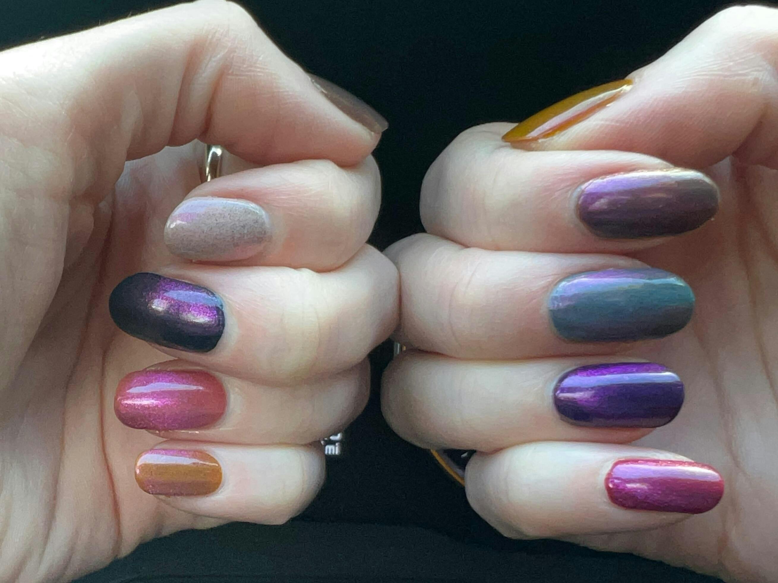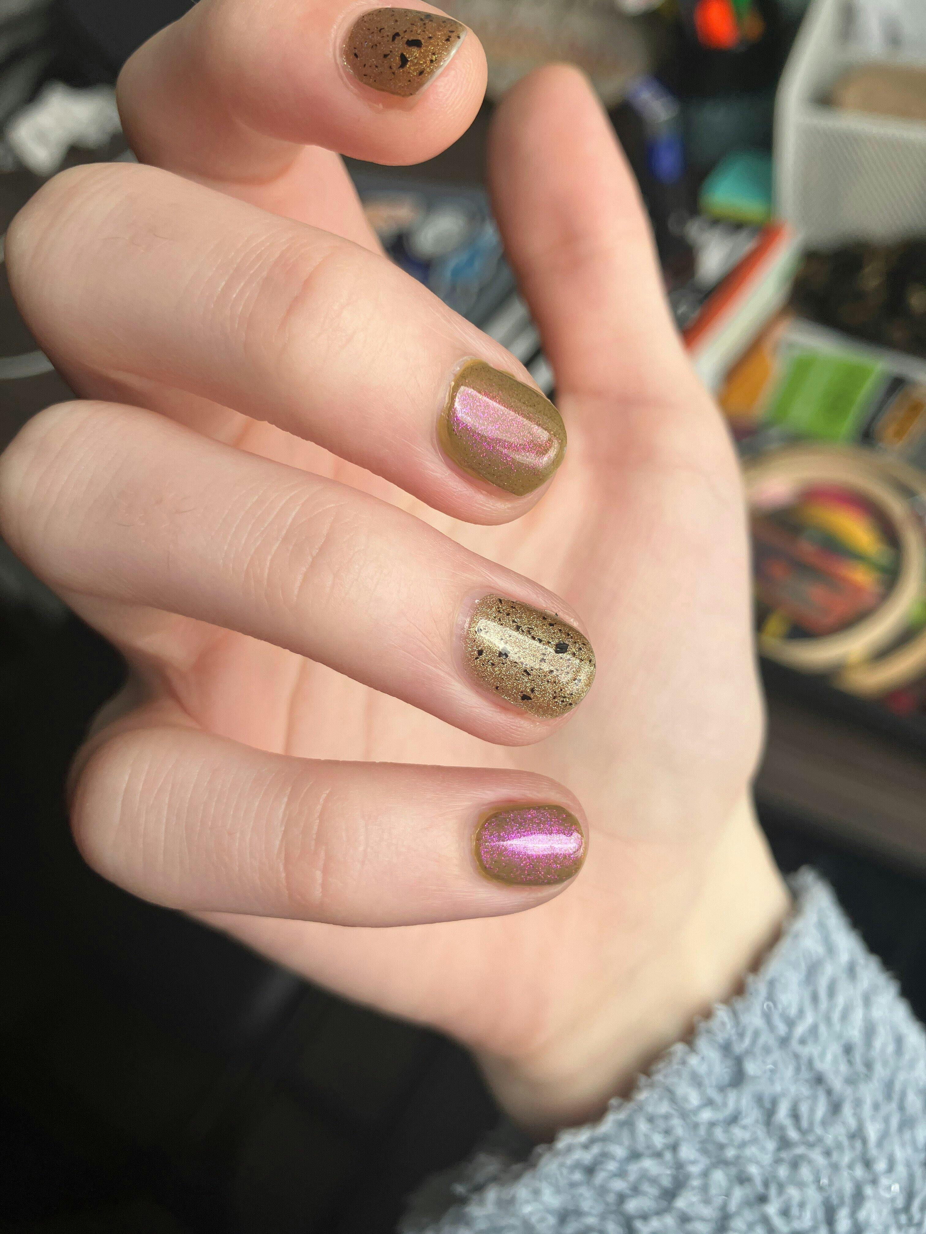 Fun Facts From Audrey: I have two cats, Juniper and Bramble. Speckles and pink shimmer are two of my fav things in nail polish. I have my BFA in studio art, and before nail art I did copperplate etching and gouache painting