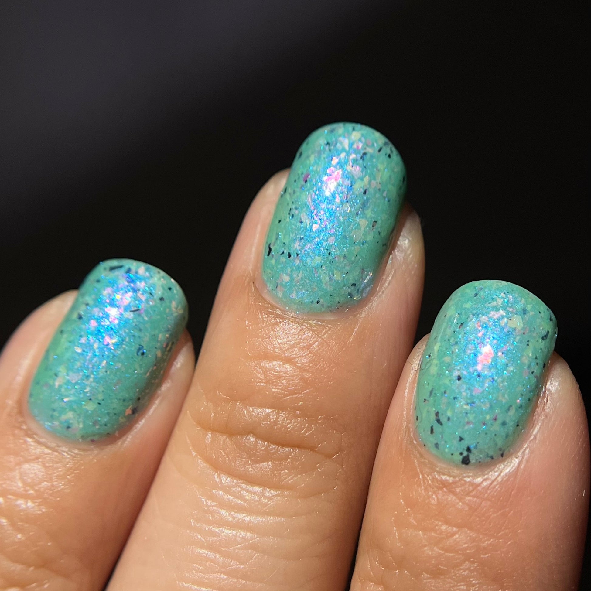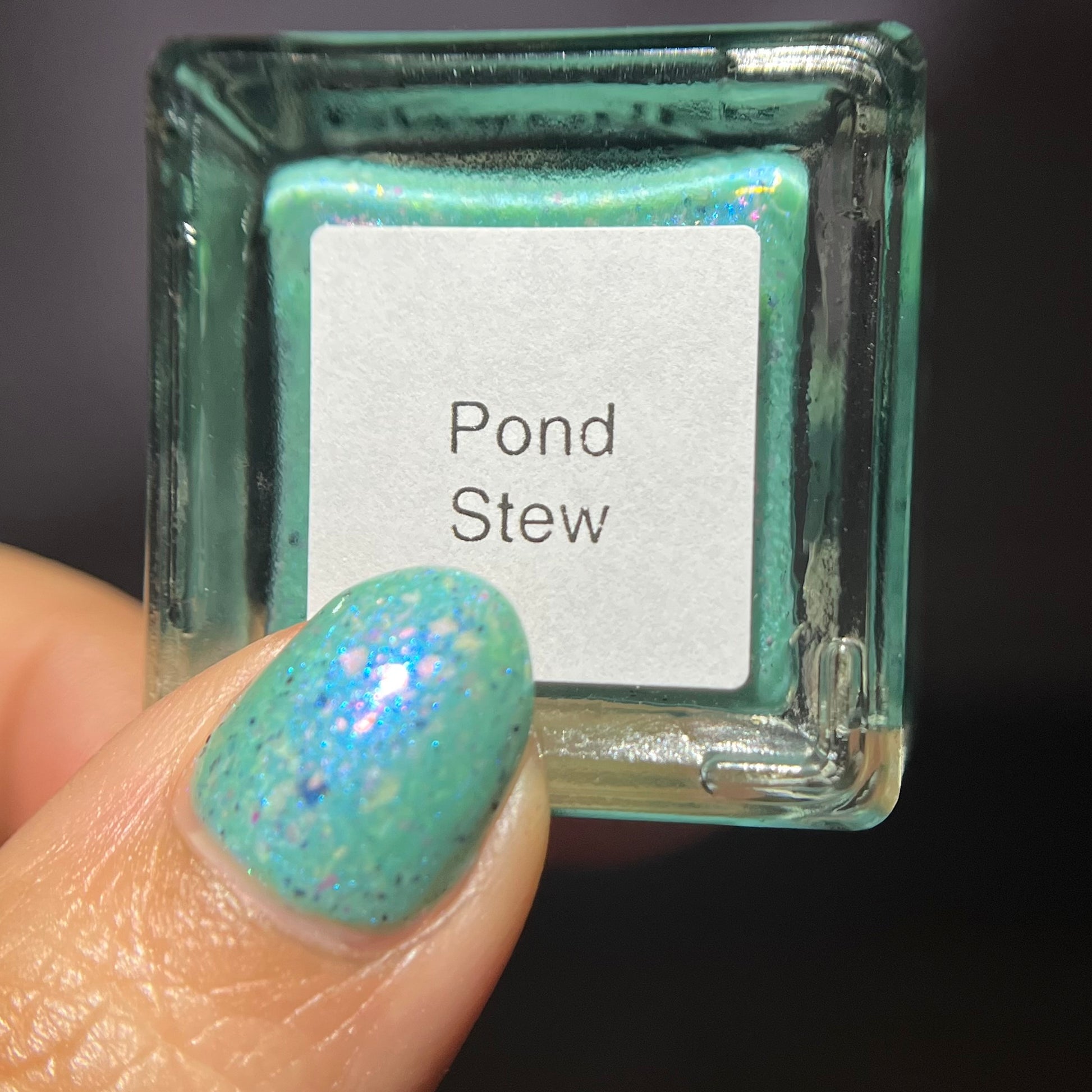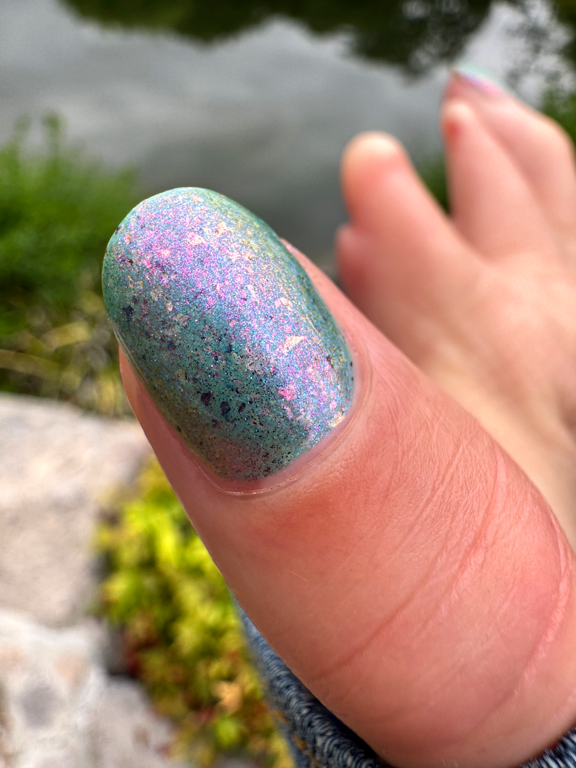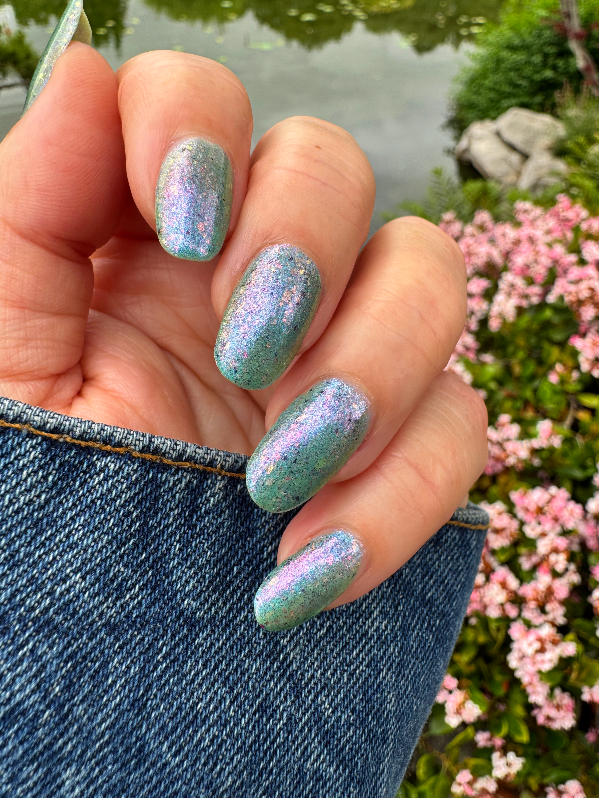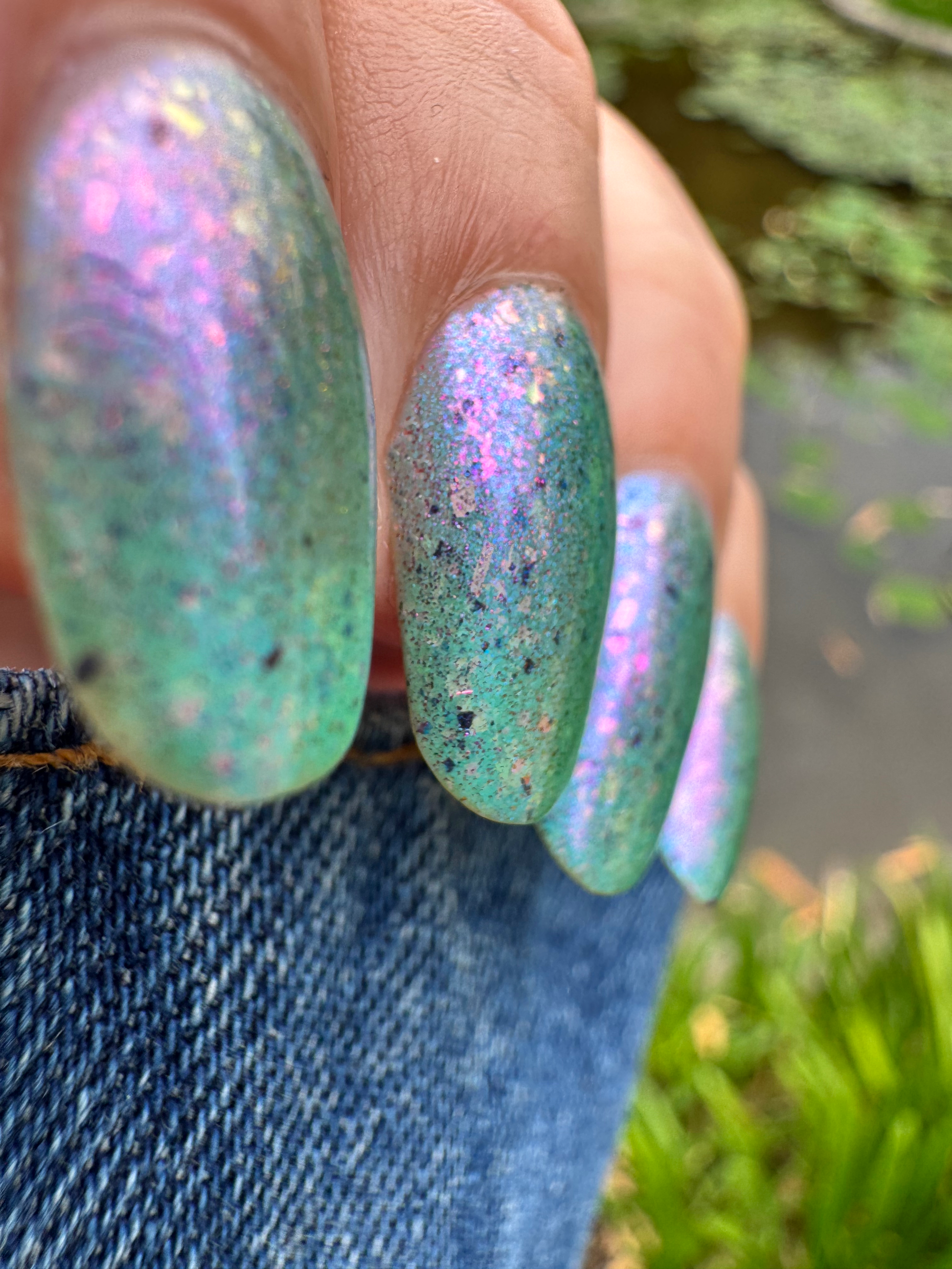Pond Stew is a lake green with black, iridescent flakes, large pink flakes and packed with blue aurora shimmers. To create this we took inspiration from a color Audrey made by mixing multiple polishes, and it came out perfectly!