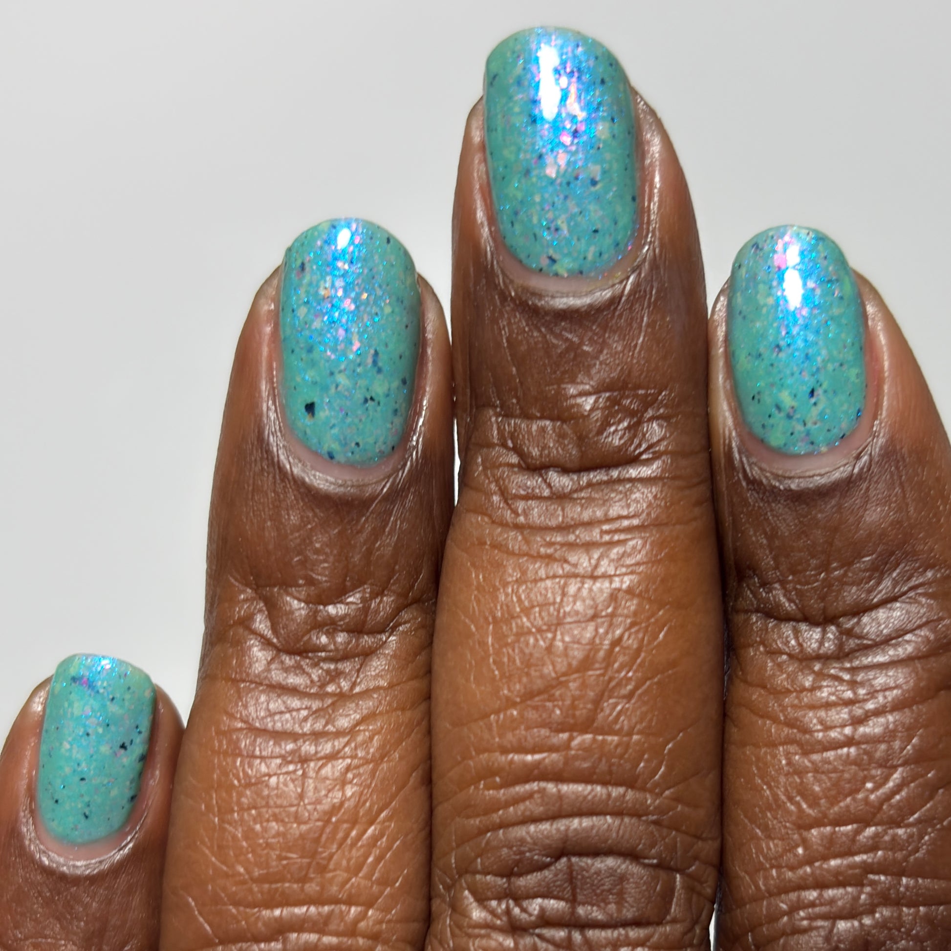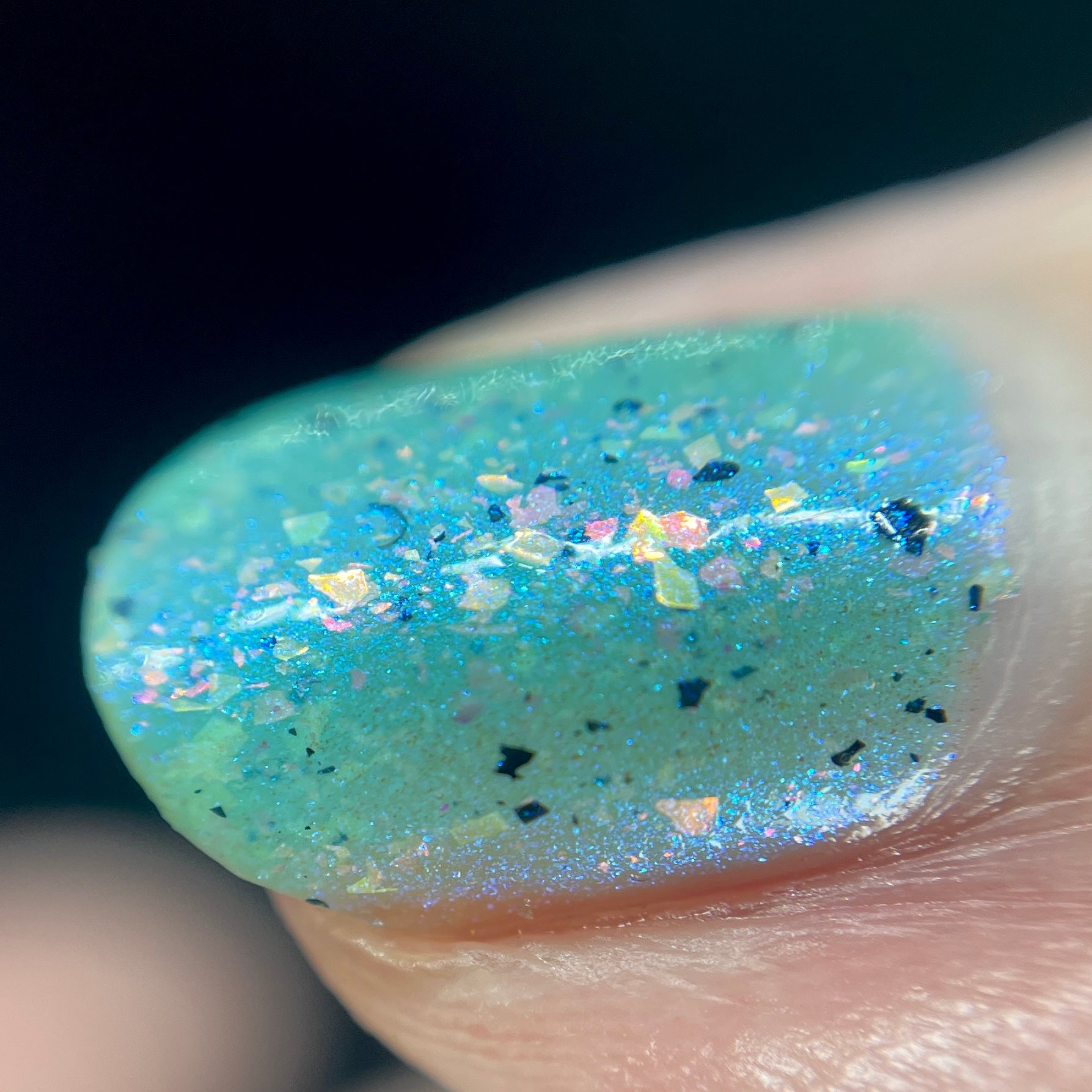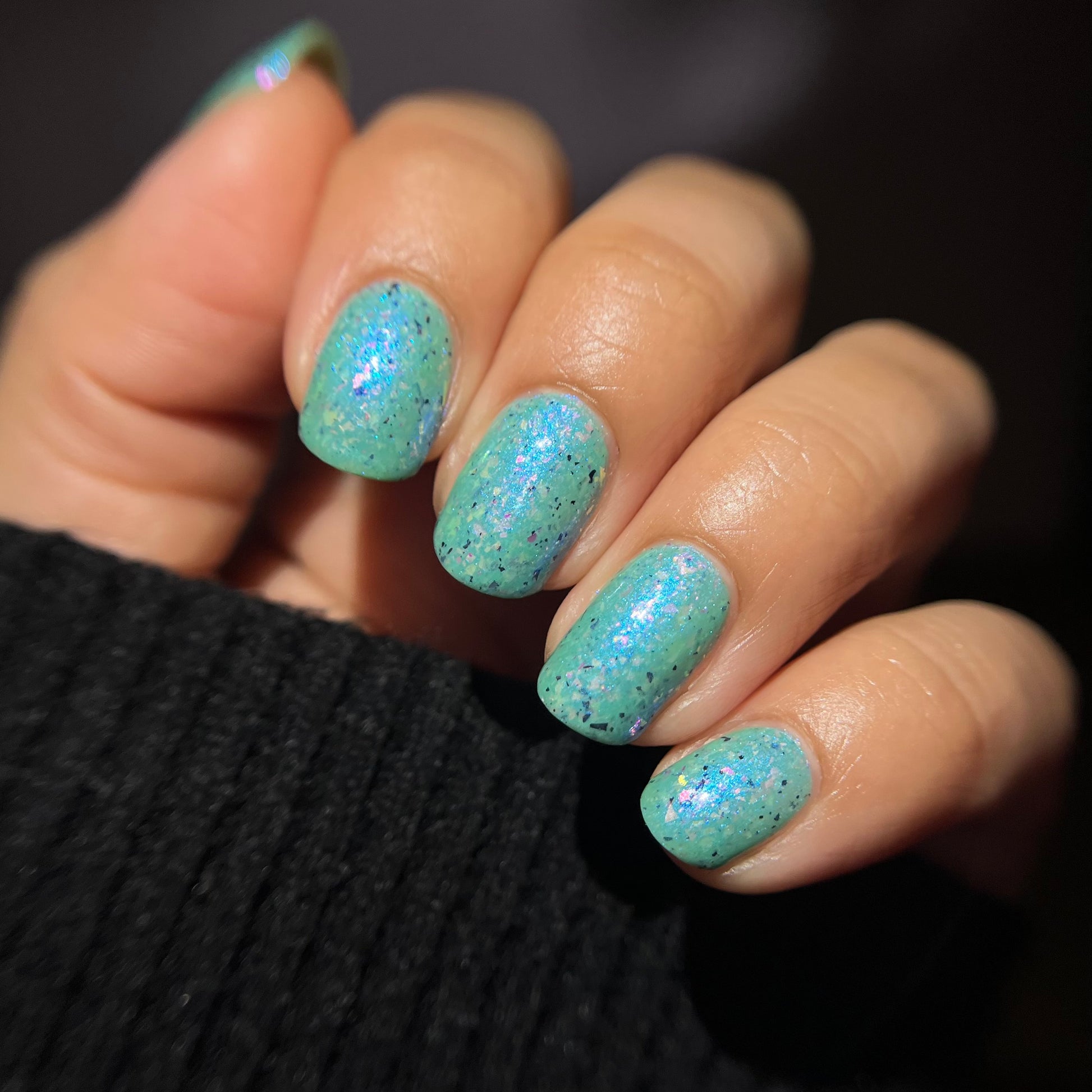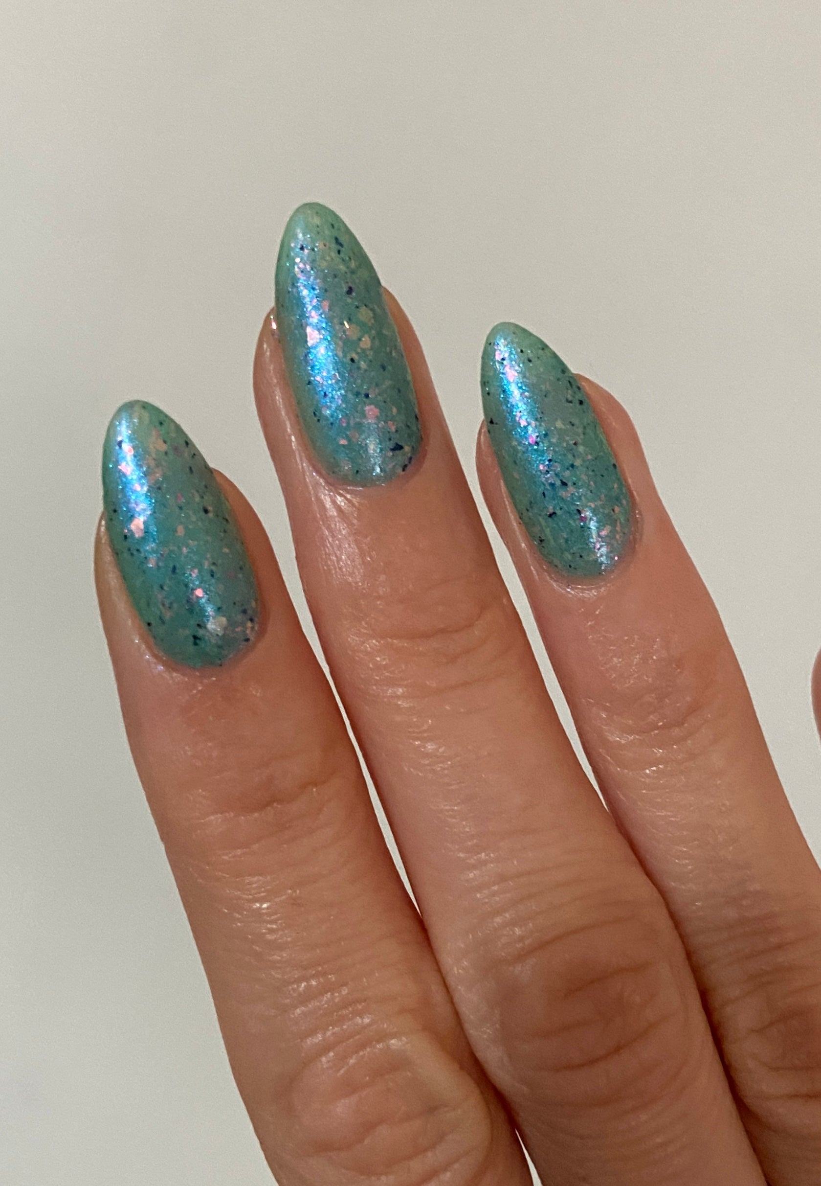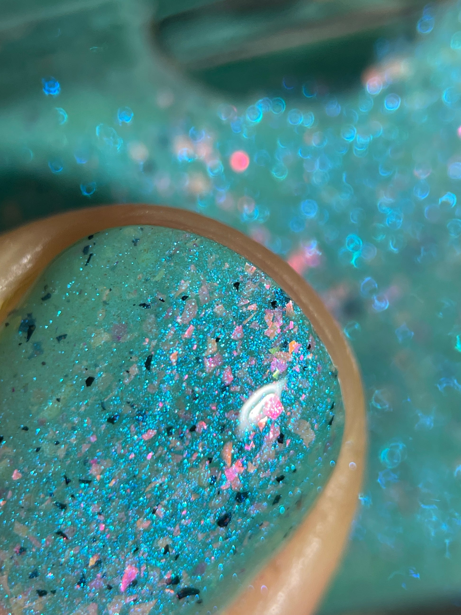 Pond Stew is a lake green with black, iridescent flakes, large pink flakes and packed with blue aurora shimmers. To create this we took inspiration from a color Audrey made by mixing multiple polishes, and it came out perfectly!