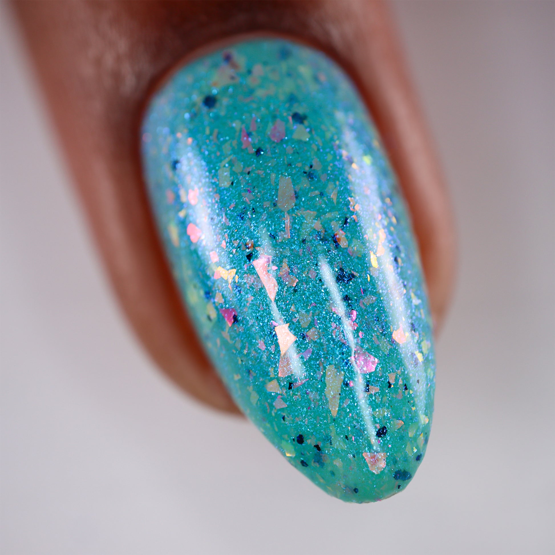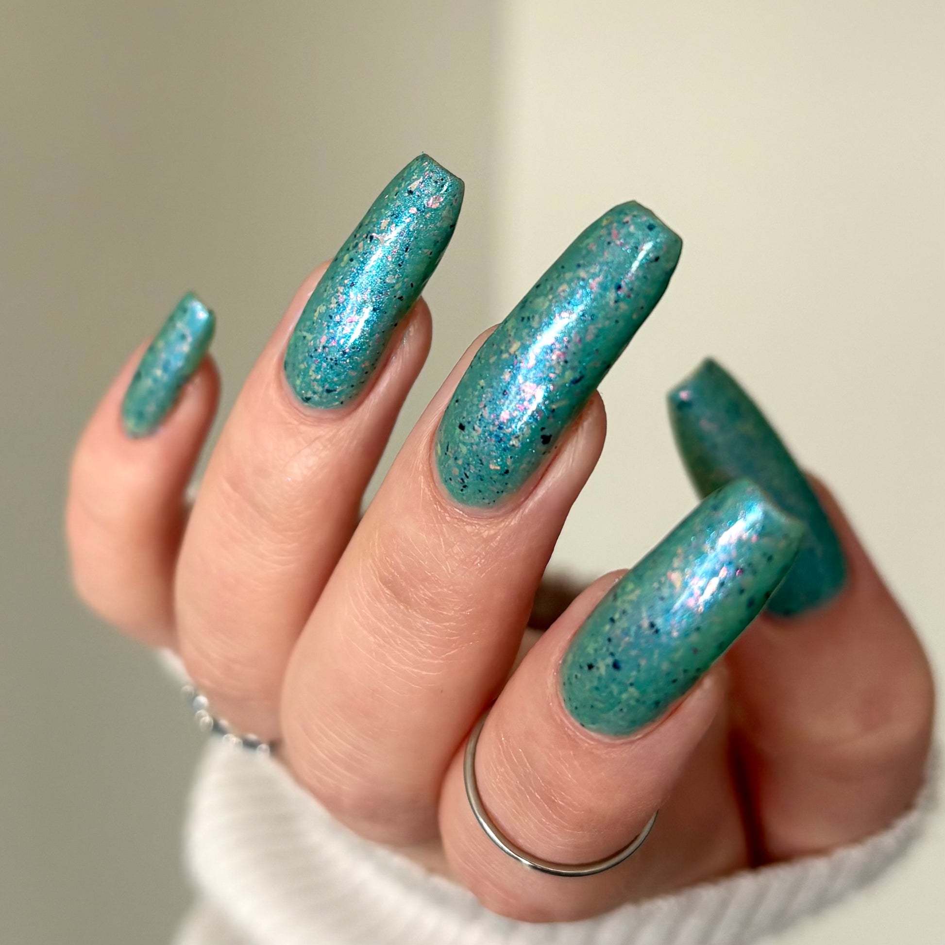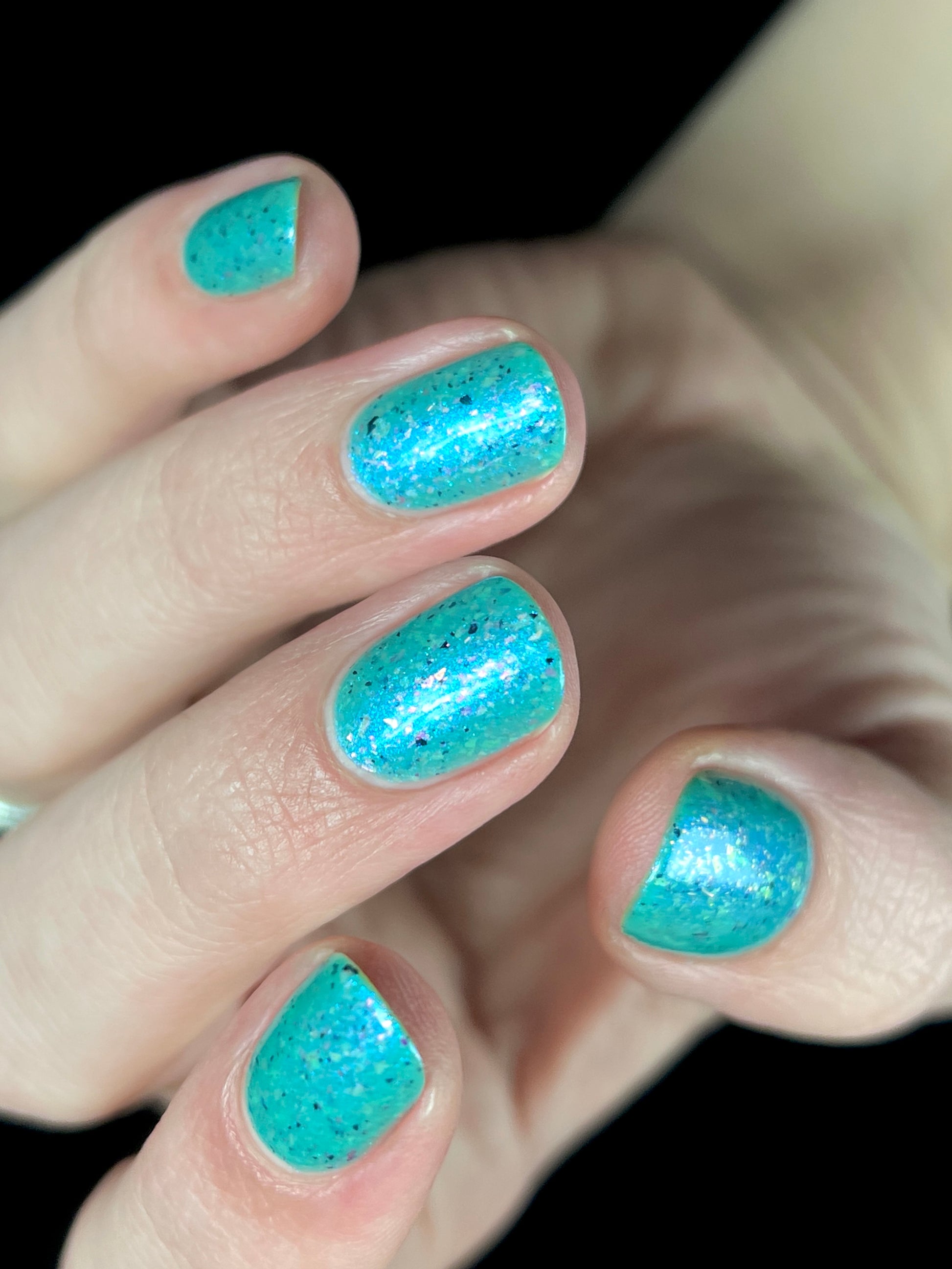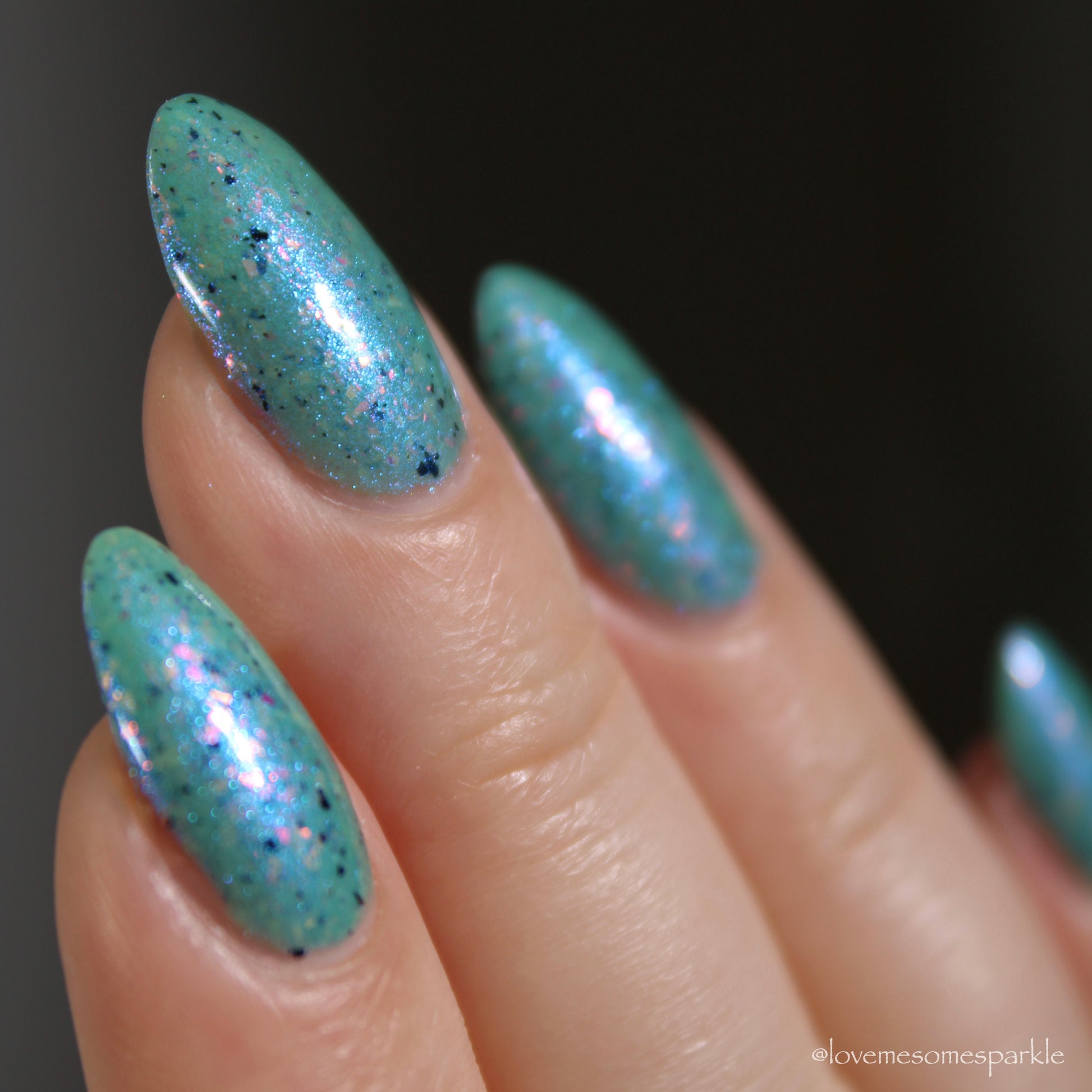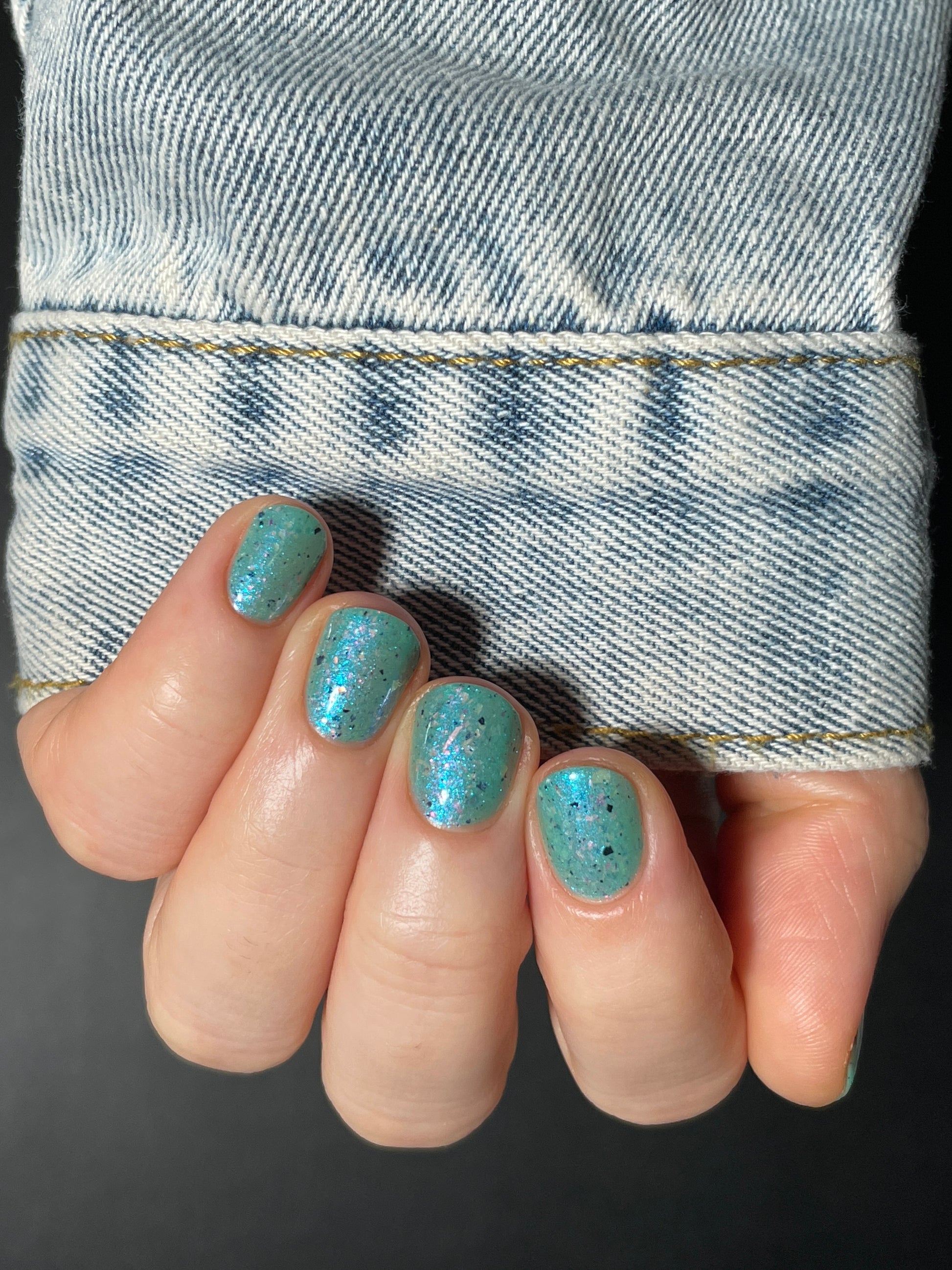 Pond Stew is a lake green with black, iridescent flakes, large pink flakes and packed with blue aurora shimmers. To create this we took inspiration from a color Audrey made by mixing multiple polishes, and it came out perfectly!