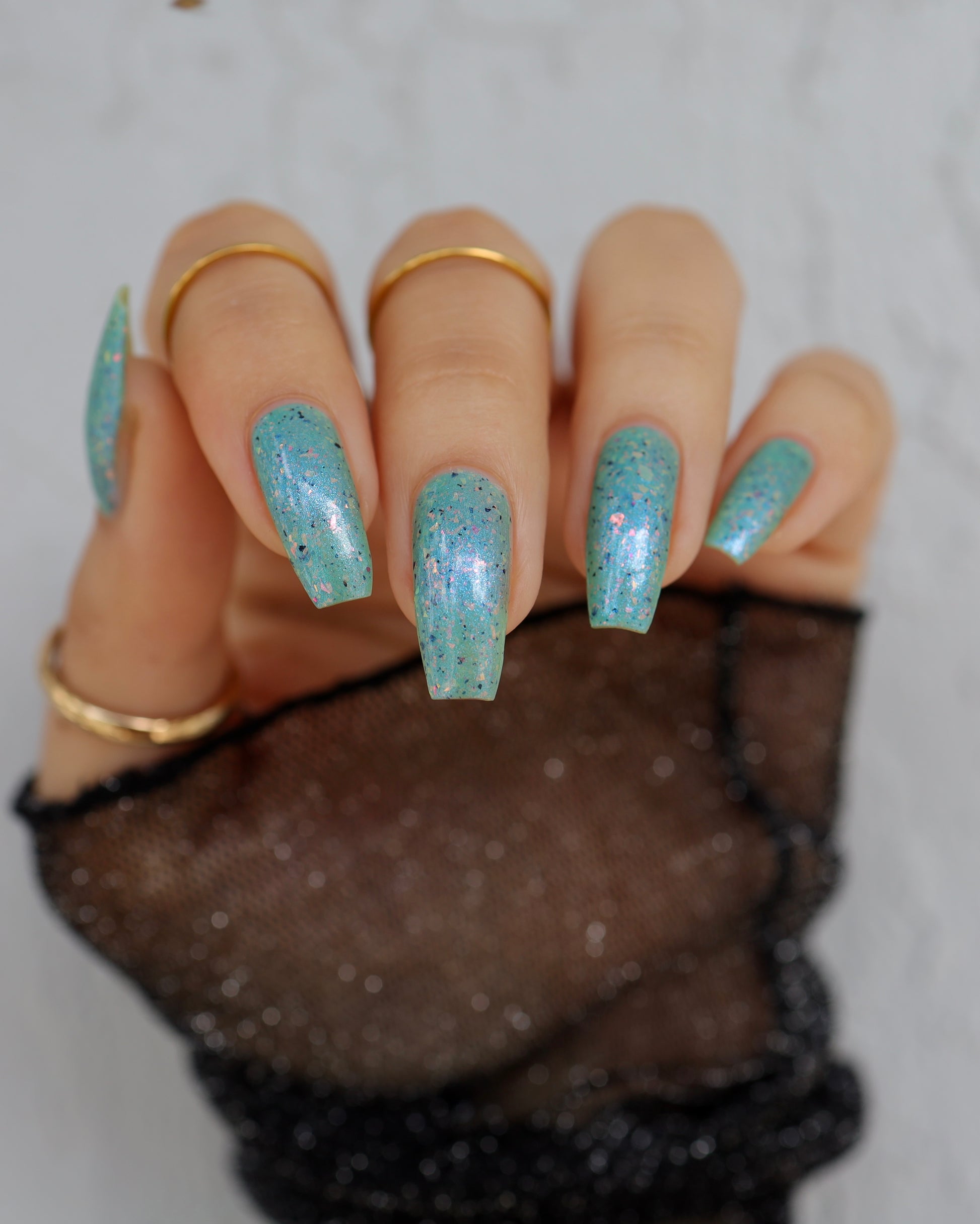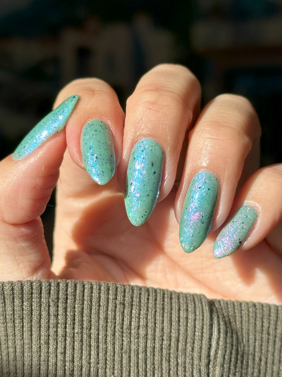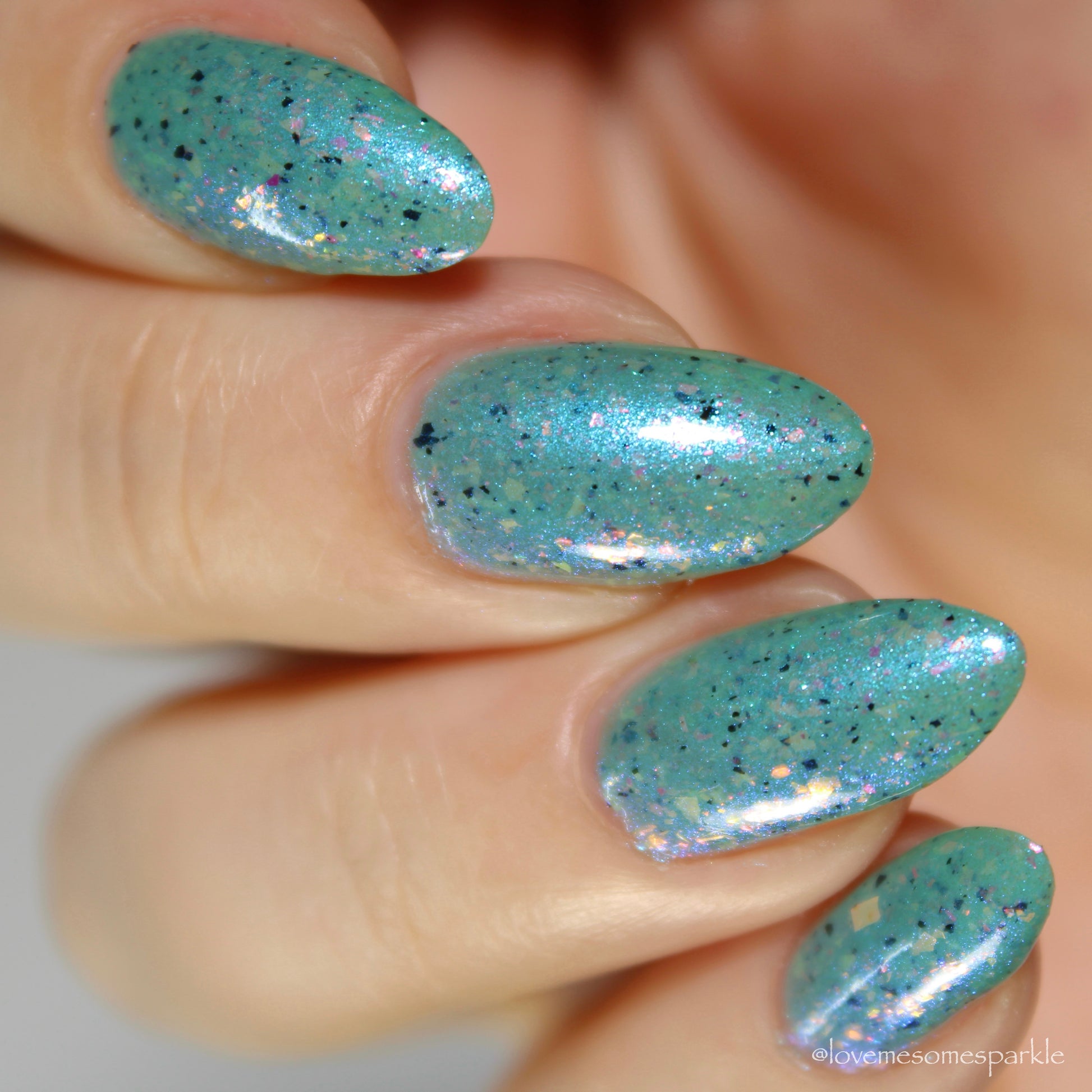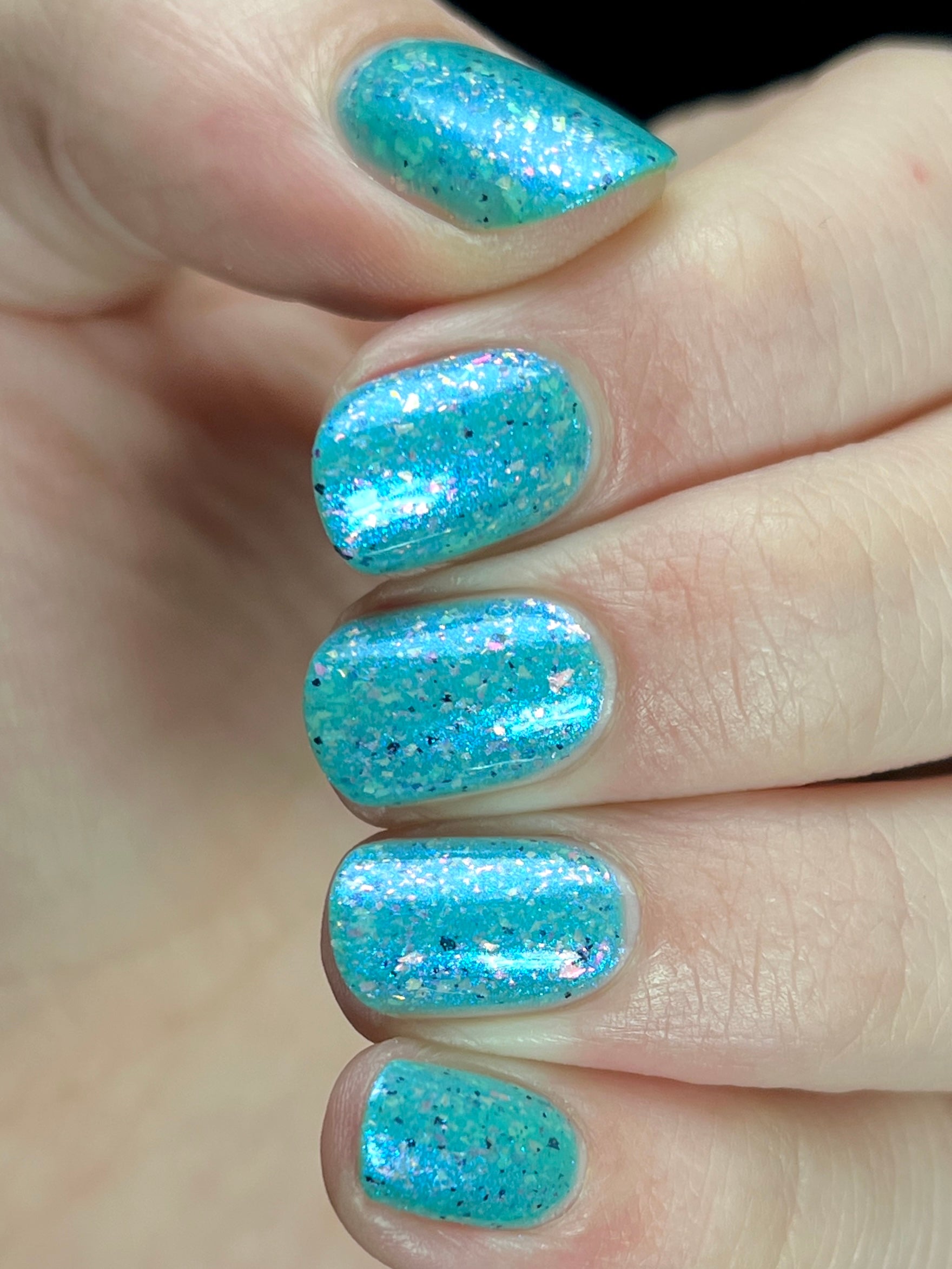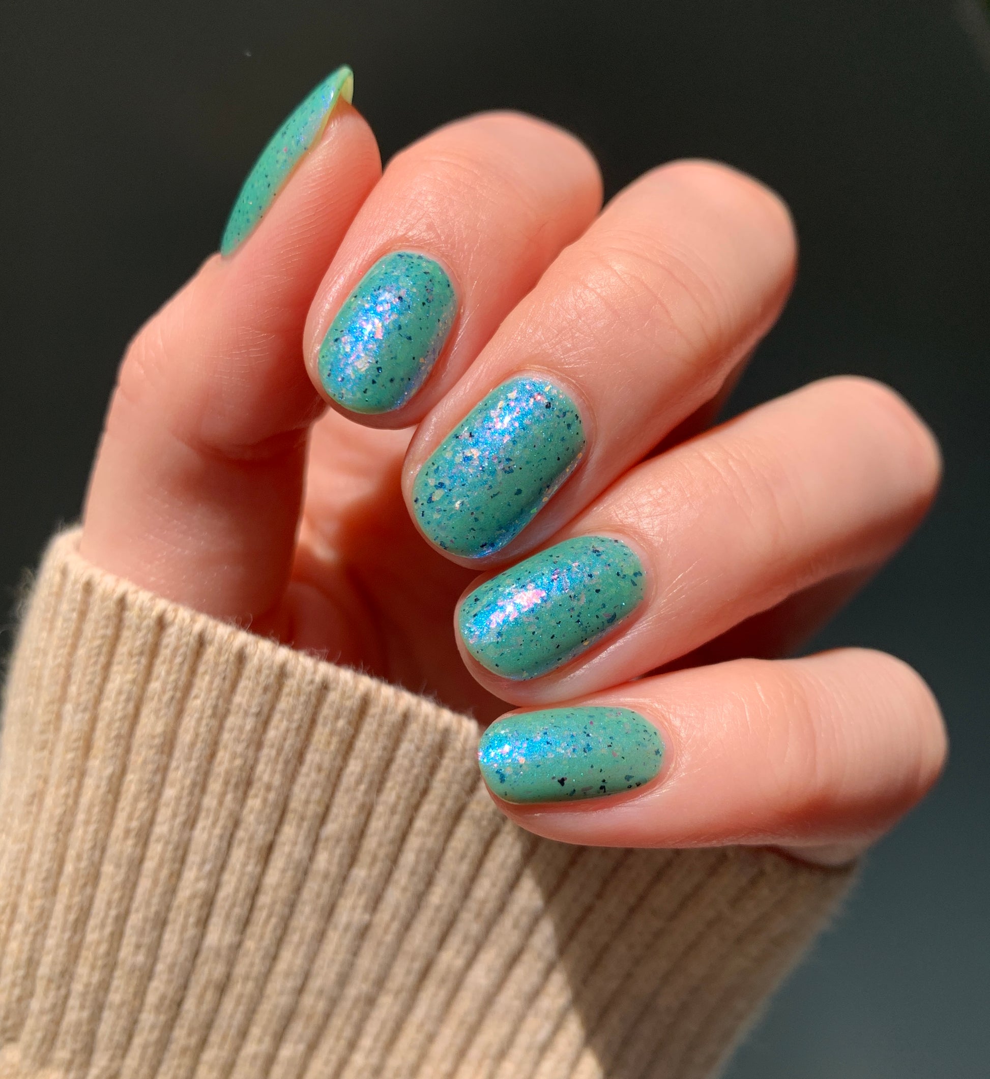 Pond Stew is a lake green with black, iridescent flakes, large pink flakes and packed with blue aurora shimmers. To create this we took inspiration from a color Audrey made by mixing multiple polishes, and it came out perfectly!