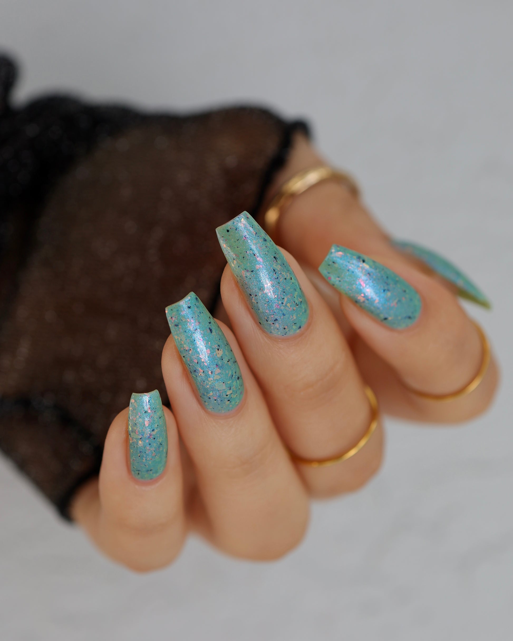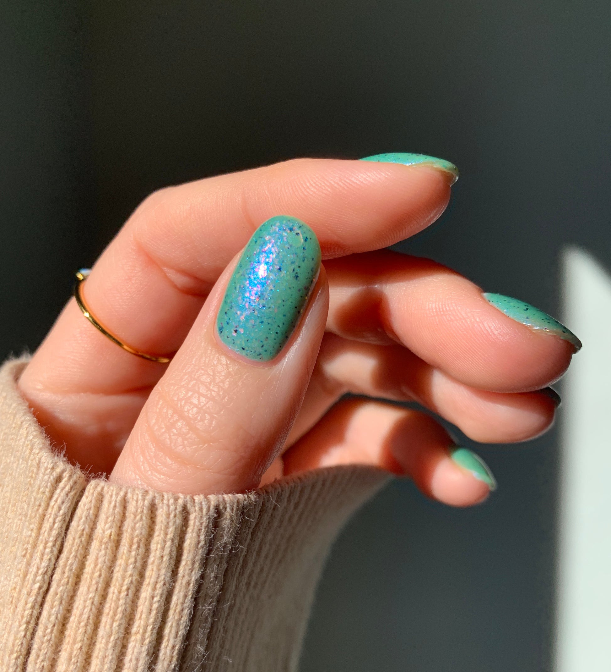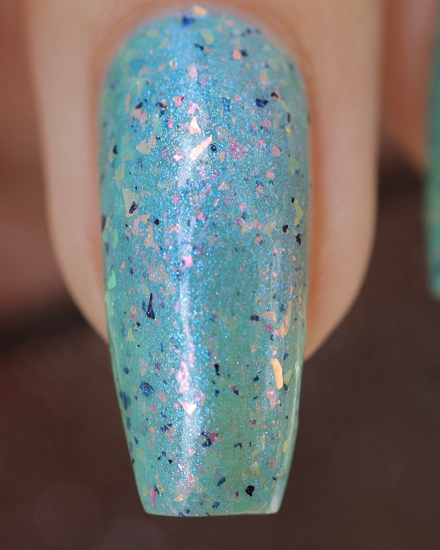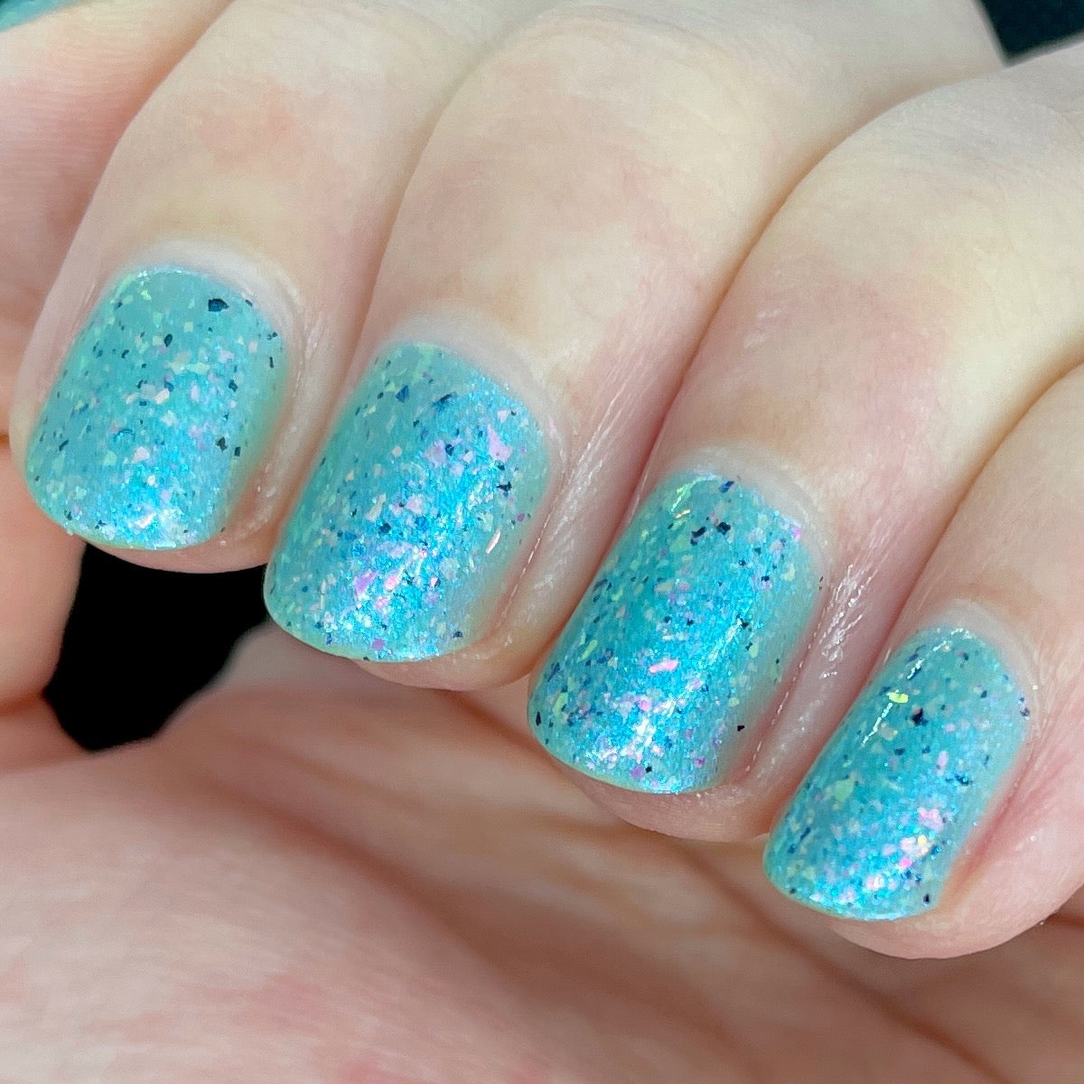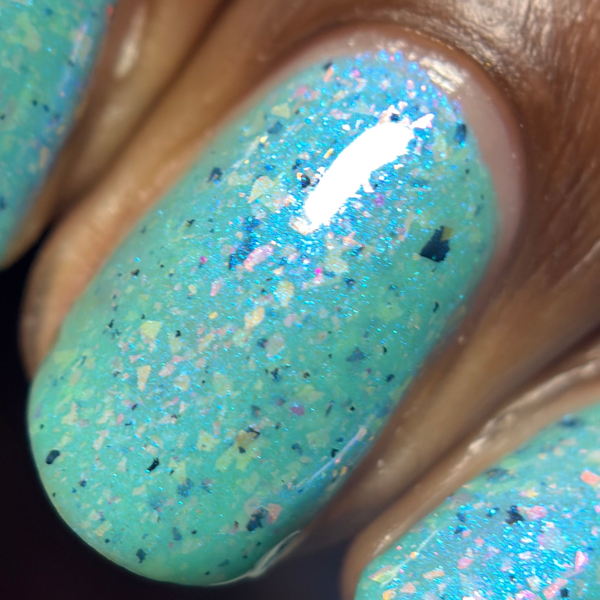 Pond Stew is a lake green with black, iridescent flakes, large pink flakes and packed with blue aurora shimmers. To create this we took inspiration from a color Audrey made by mixing multiple polishes, and it came out perfectly!