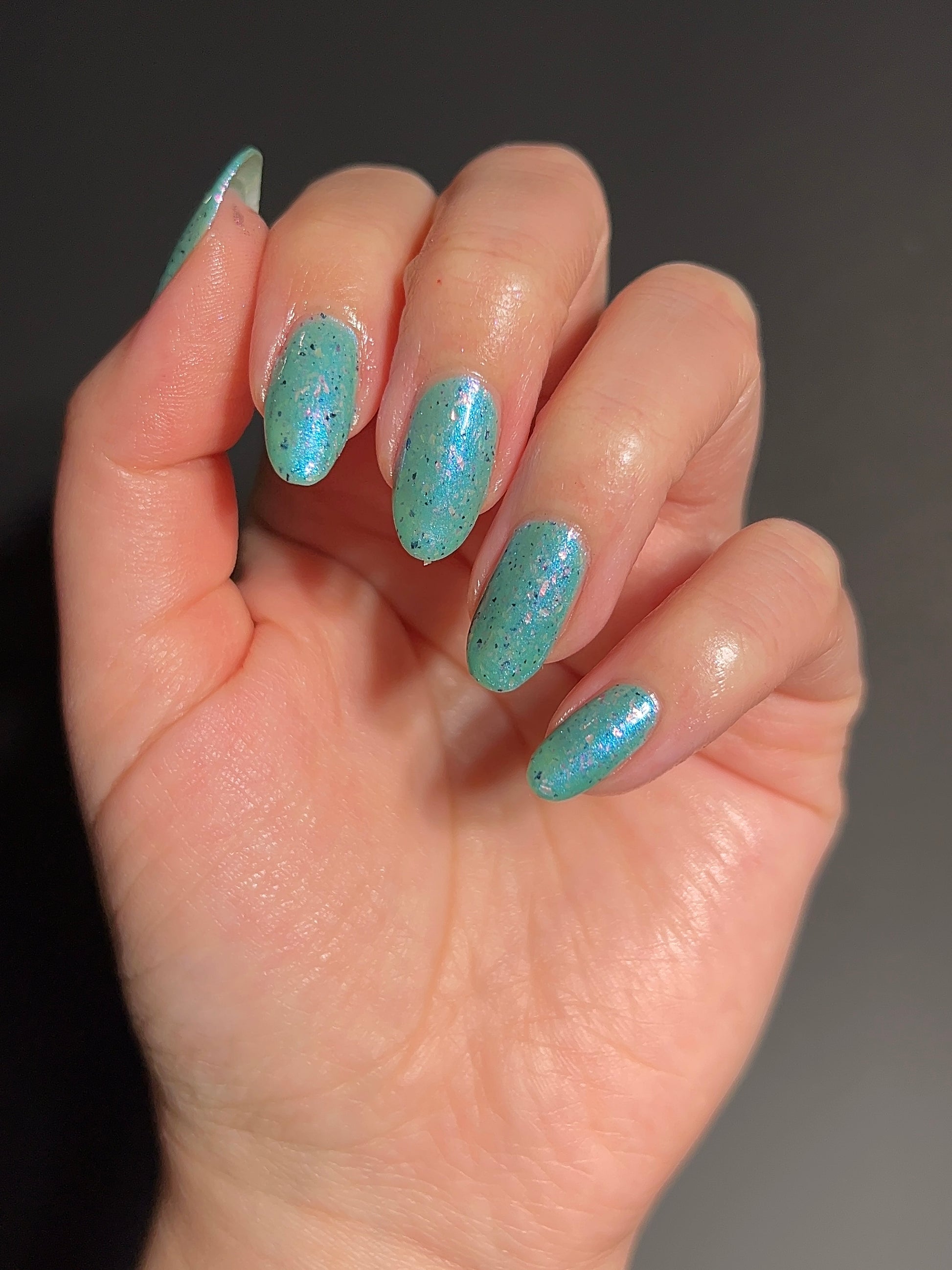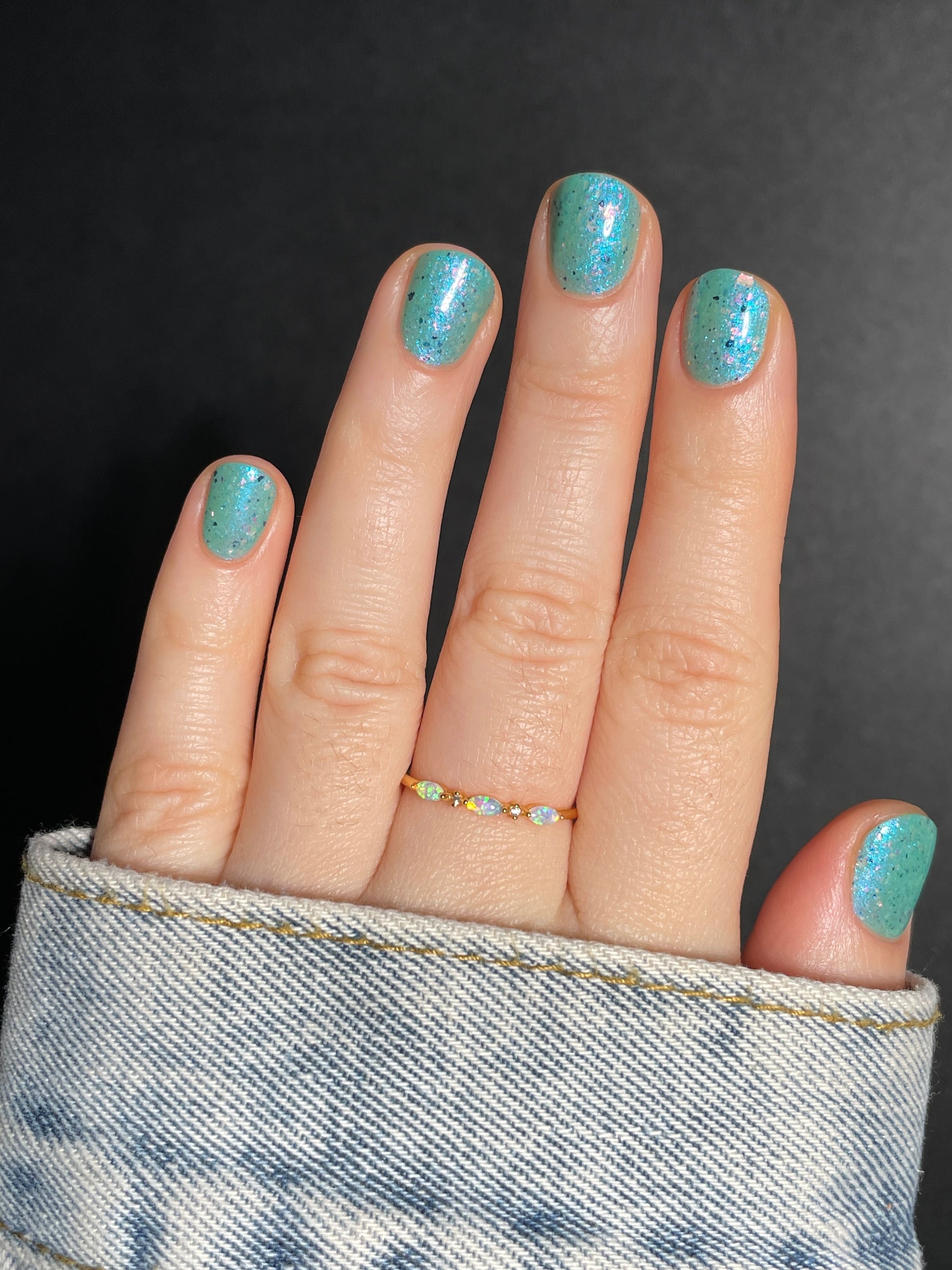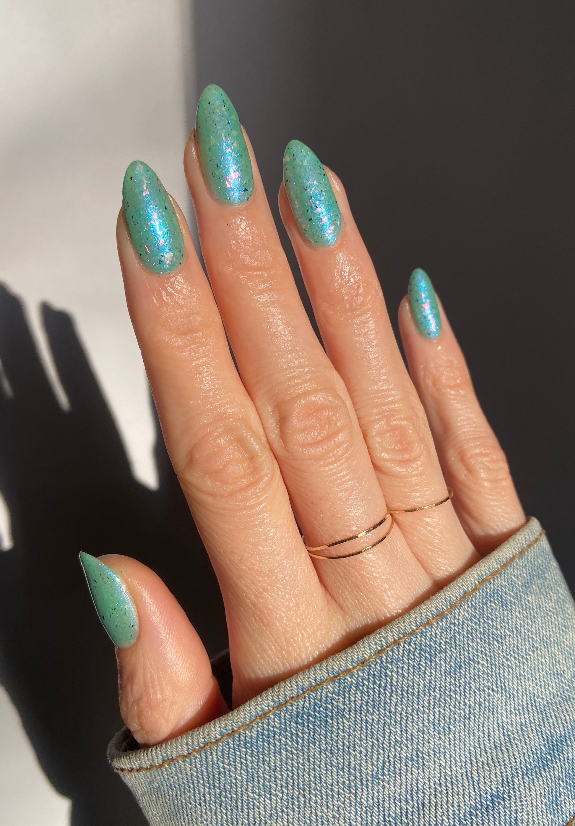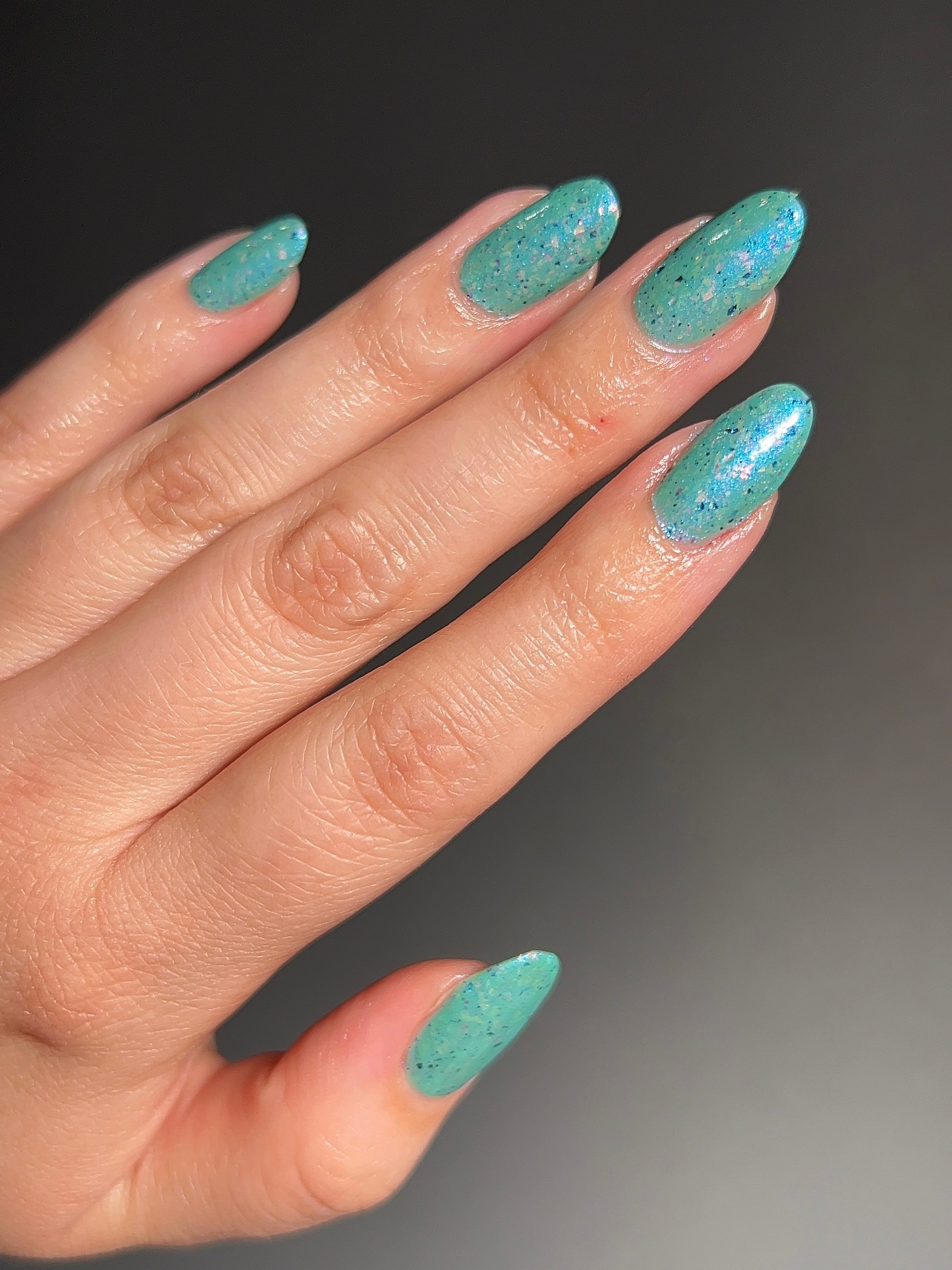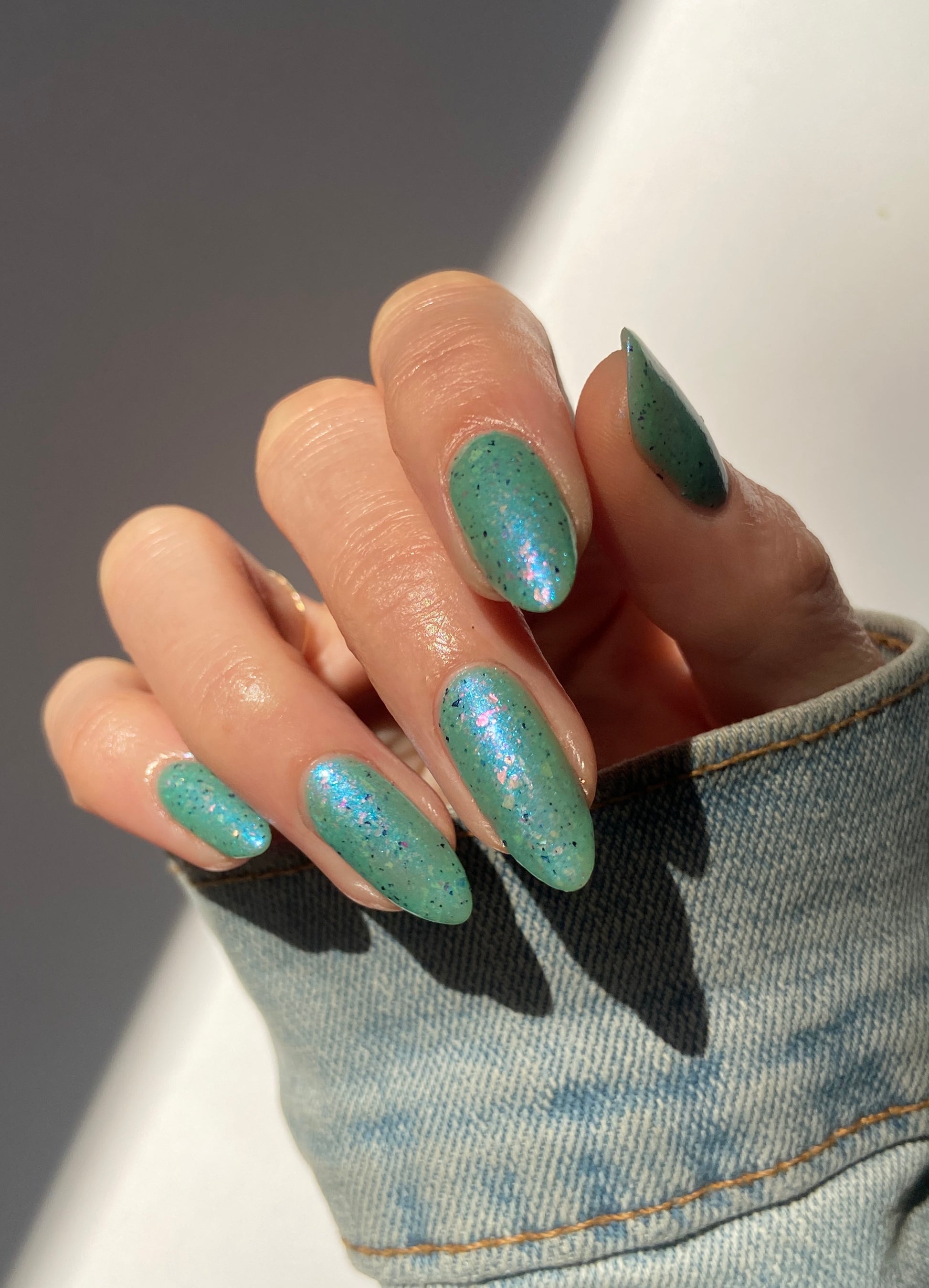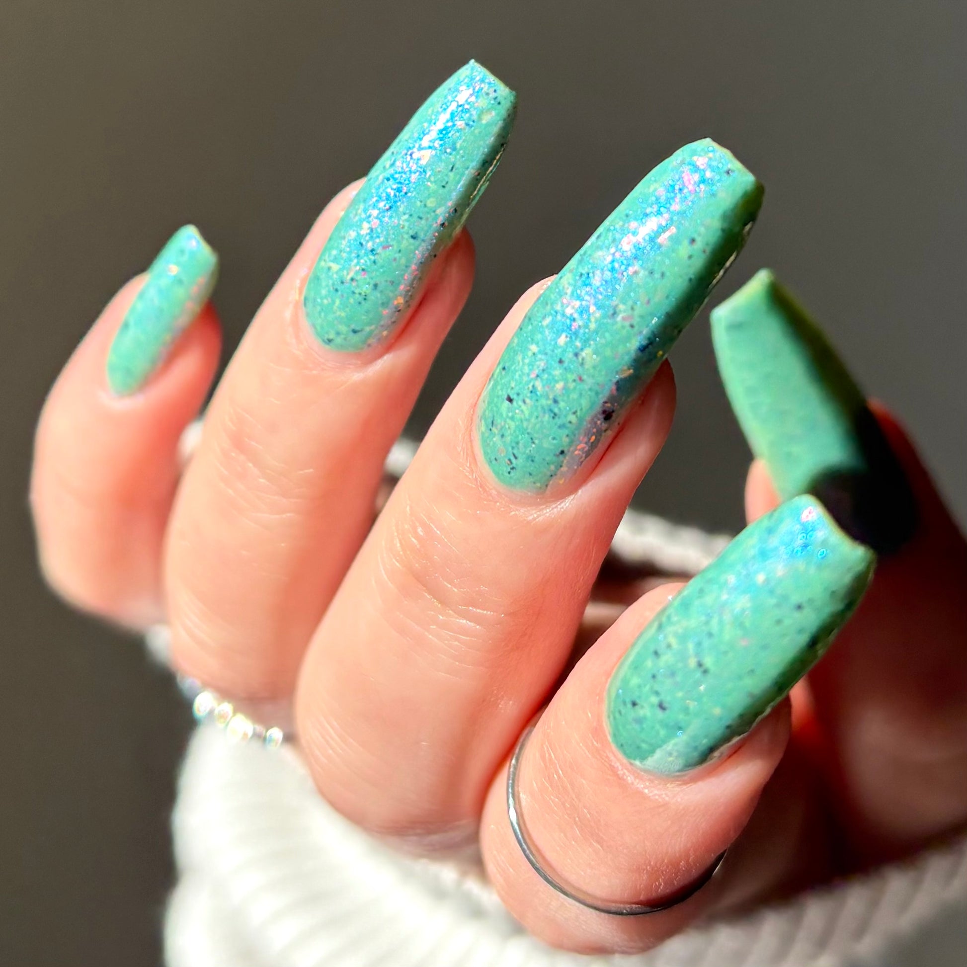 Pond Stew is a lake green with black, iridescent flakes, large pink flakes and packed with blue aurora shimmers. To create this we took inspiration from a color Audrey made by mixing multiple polishes, and it came out perfectly!