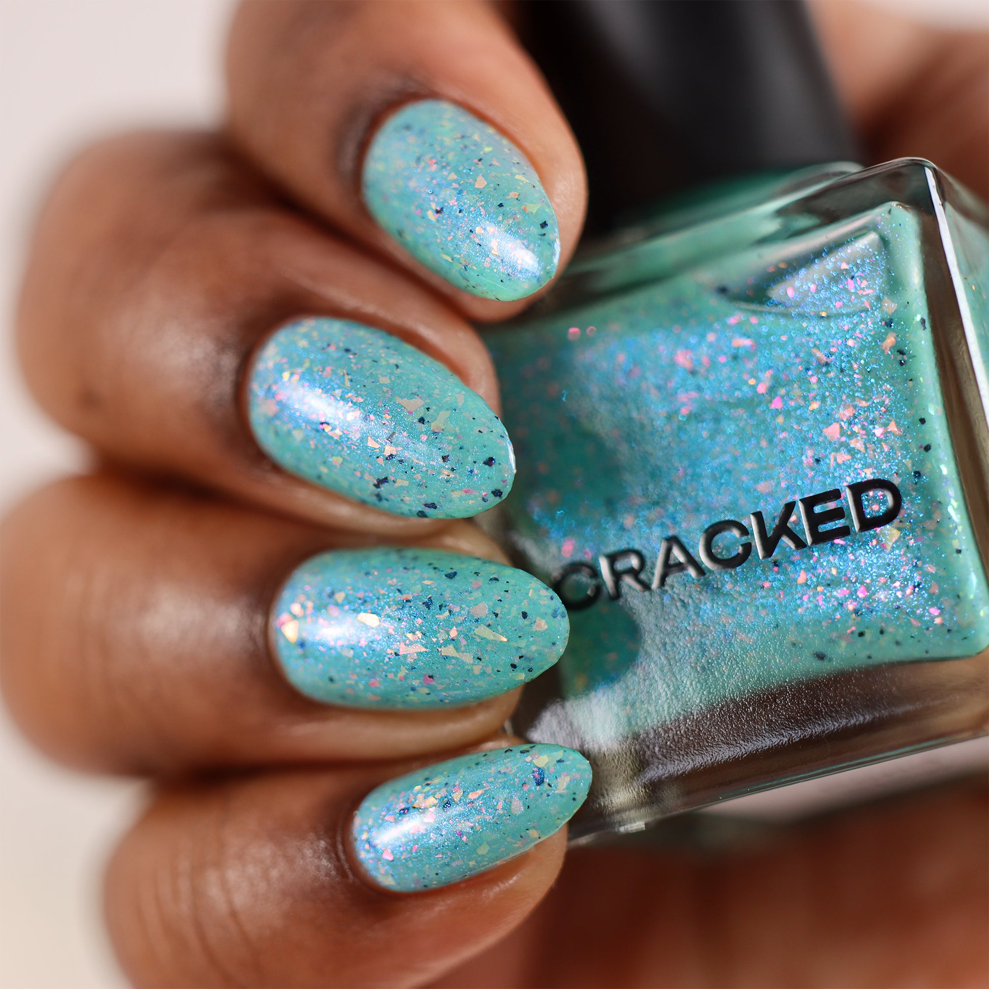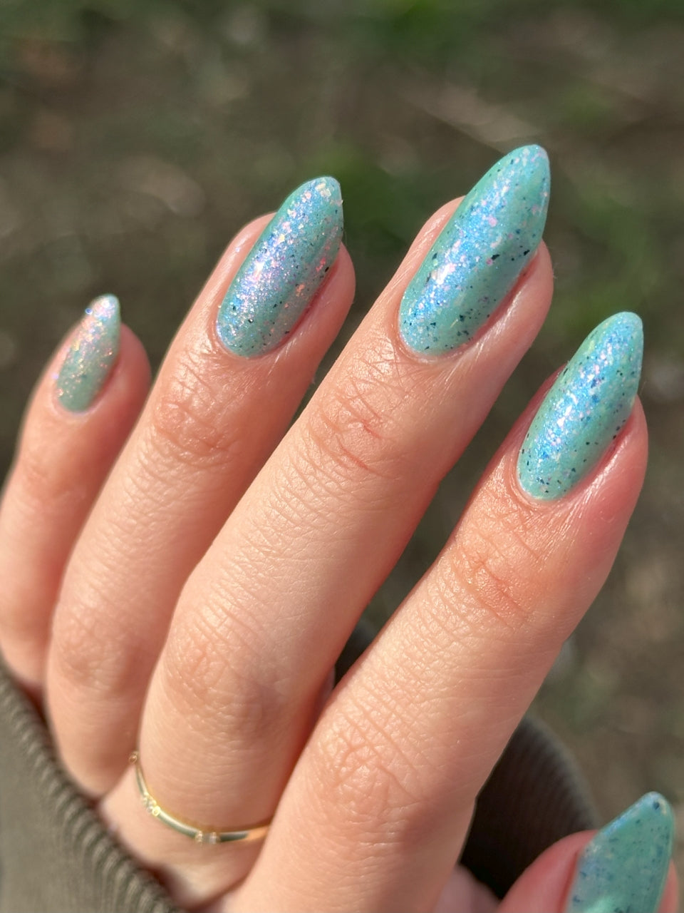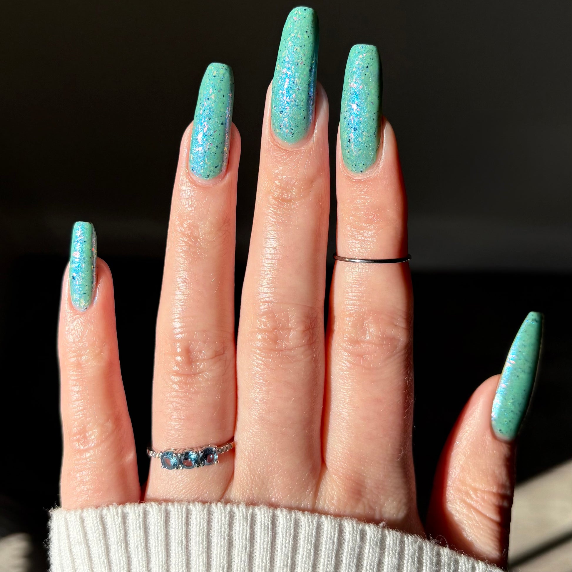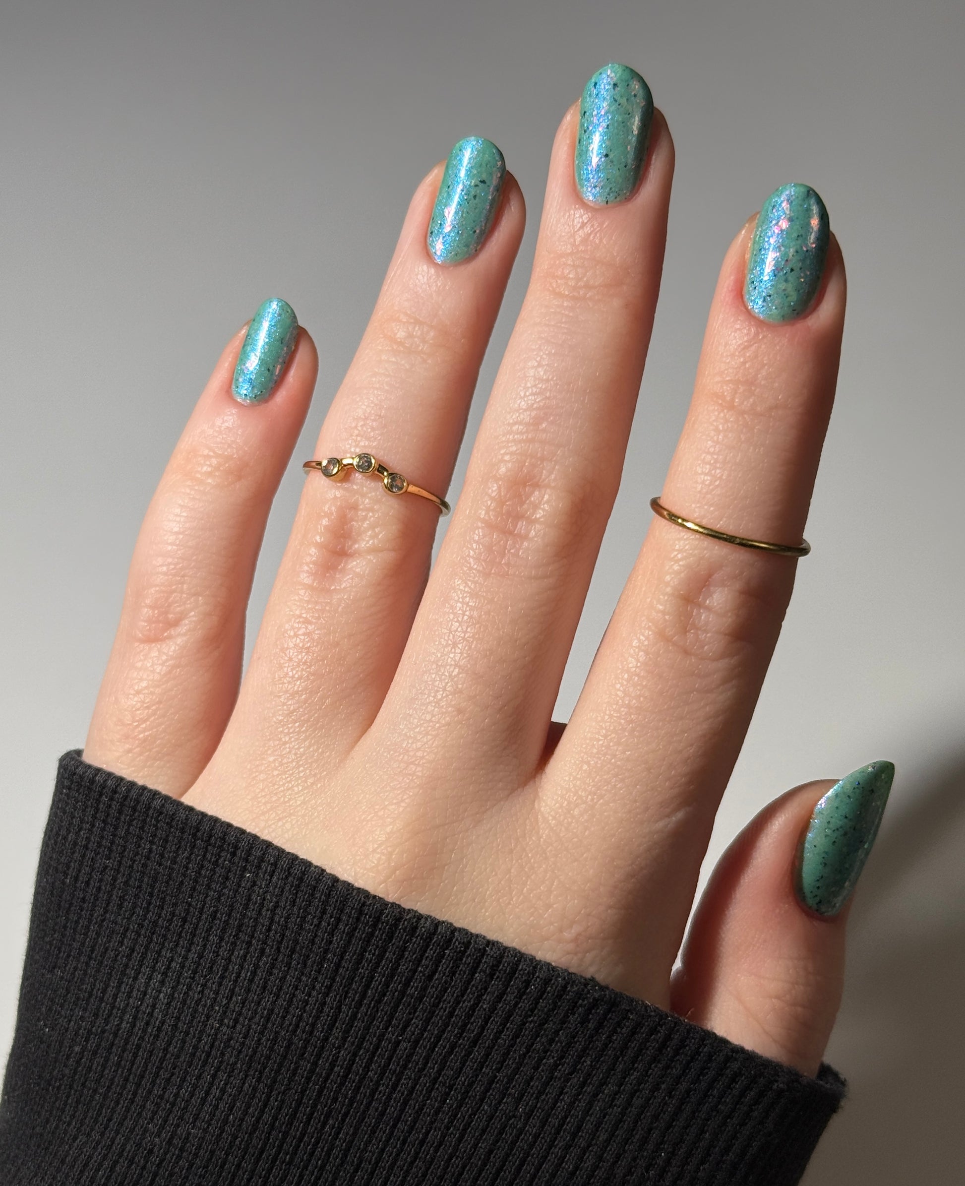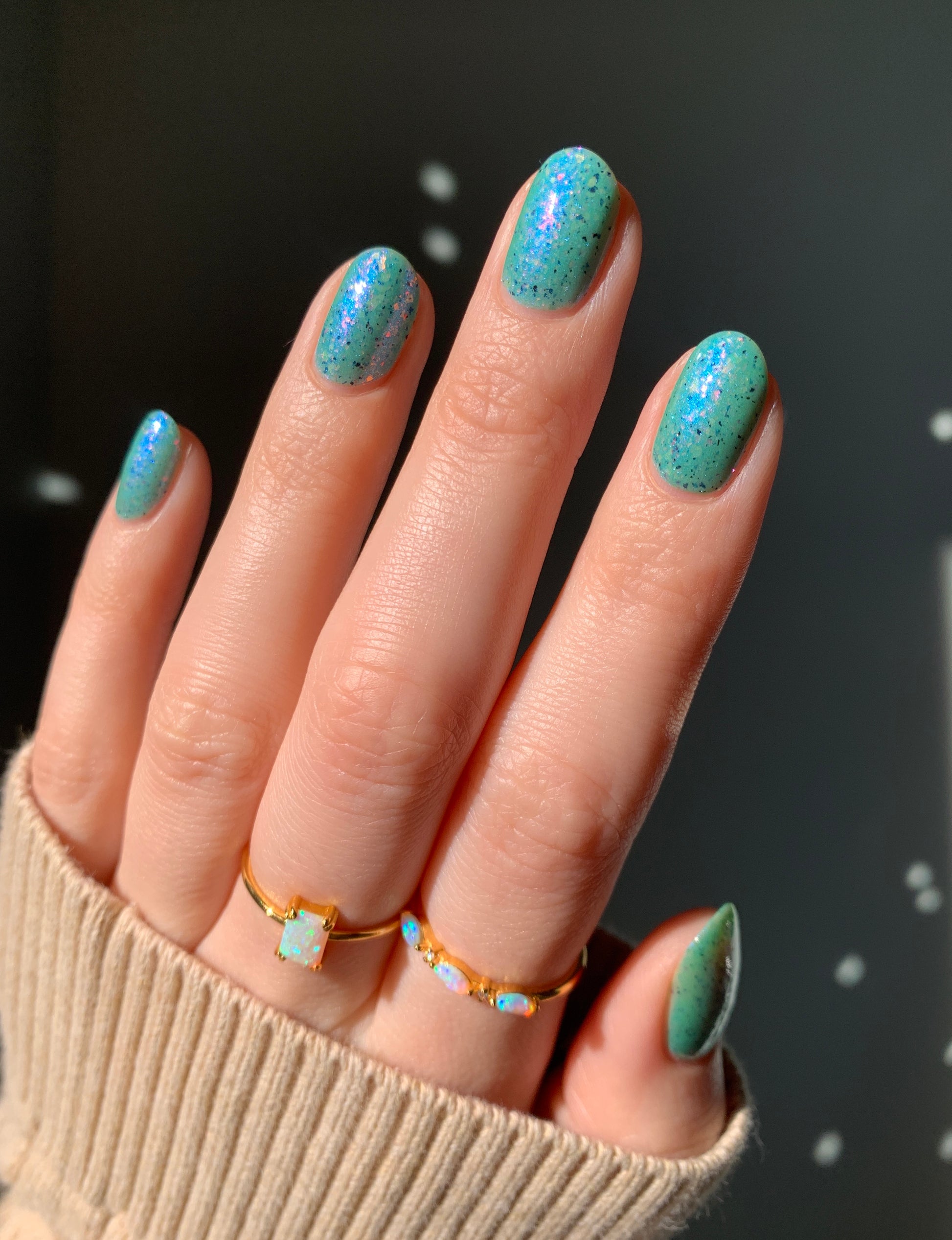 Pond Stew is a lake green with black, iridescent flakes, large pink flakes and packed with blue aurora shimmers. To create this we took inspiration from a color Audrey made by mixing multiple polishes, and it came out perfectly!