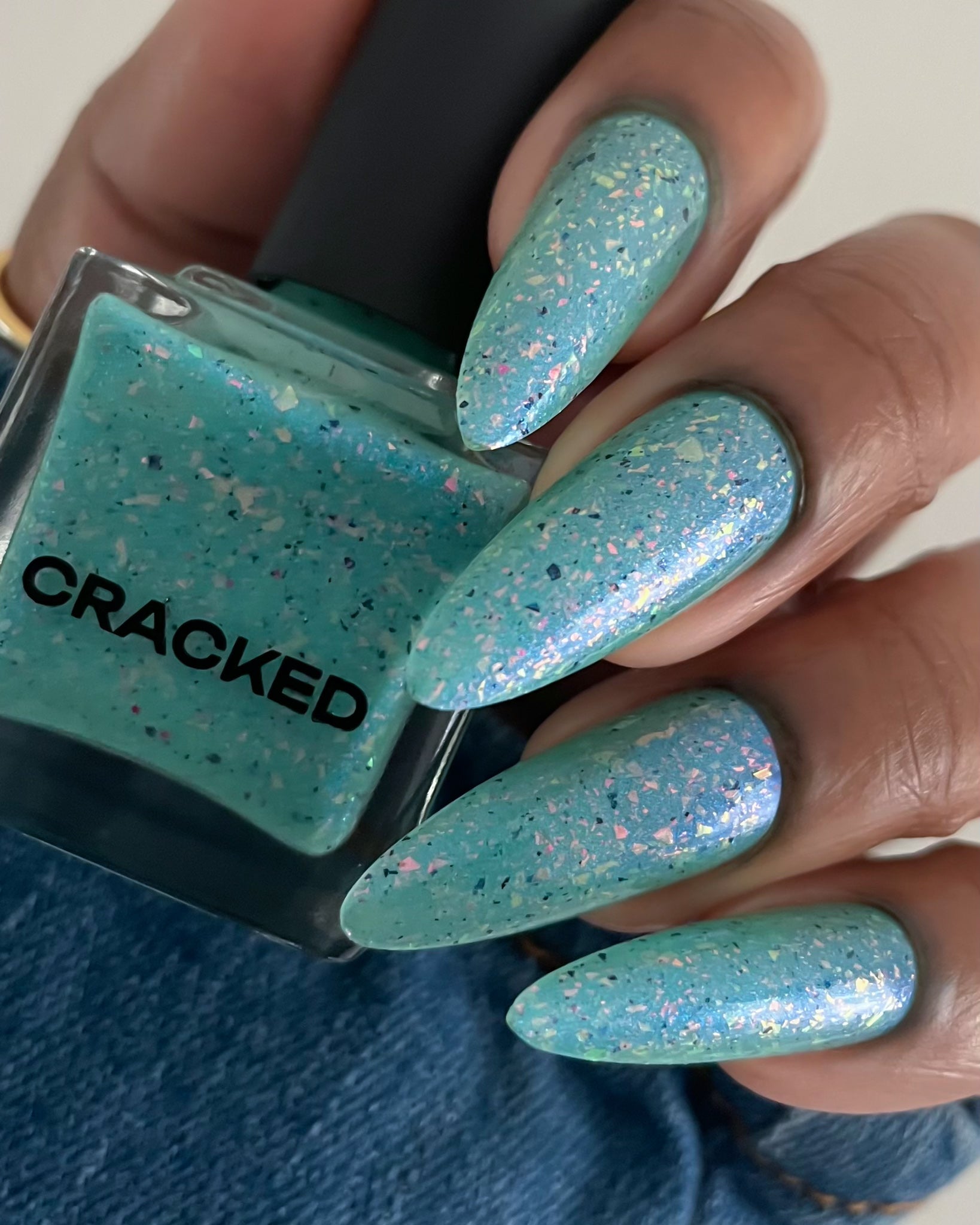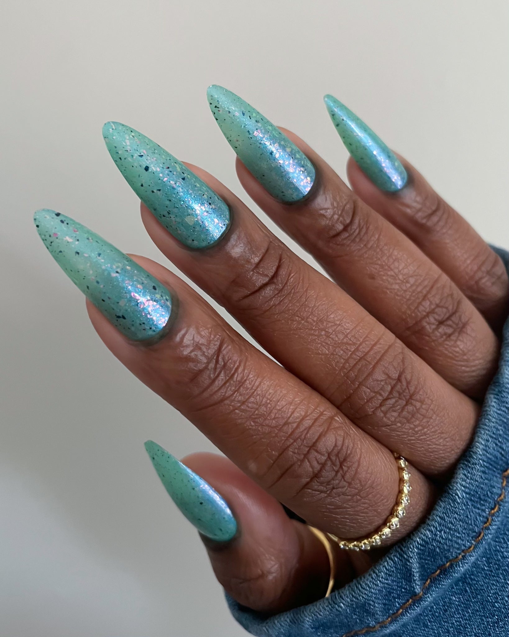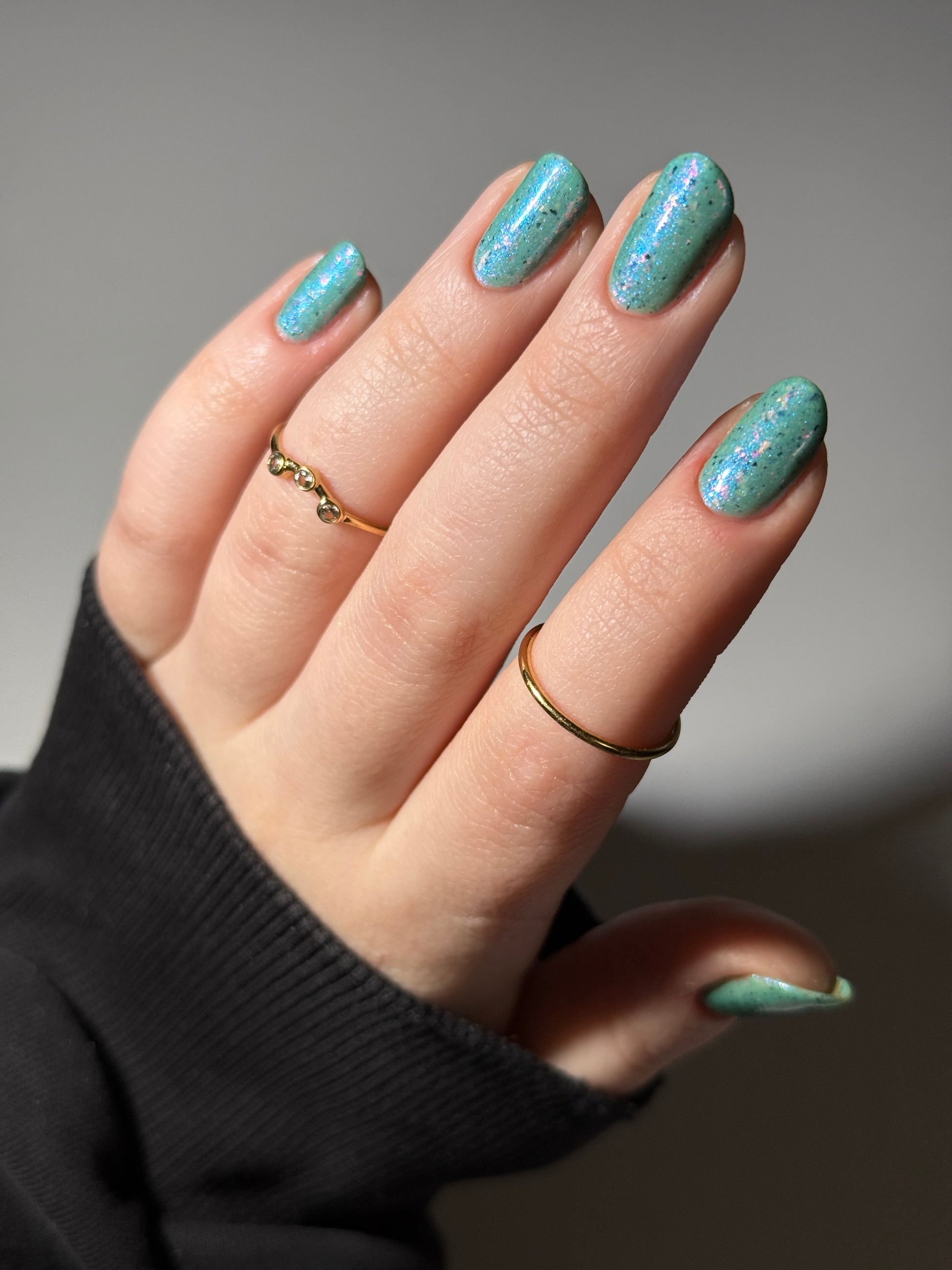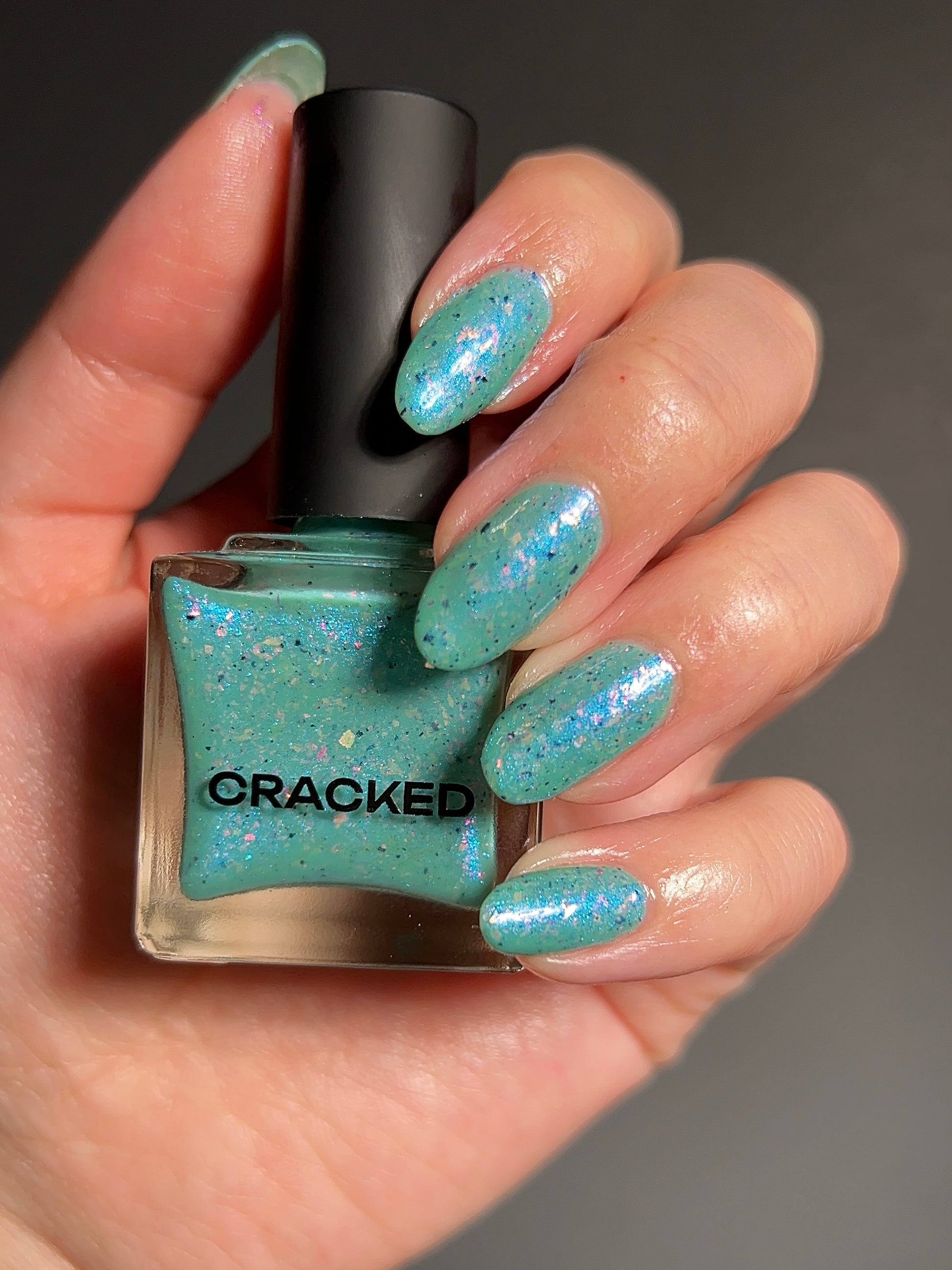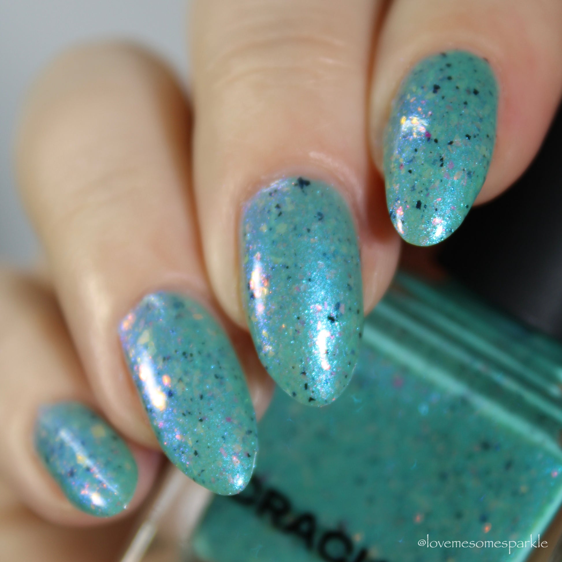 Pond Stew is a lake green with black, iridescent flakes, large pink flakes and packed with blue aurora shimmers. To create this we took inspiration from a color Audrey made by mixing multiple polishes, and it came out perfectly!