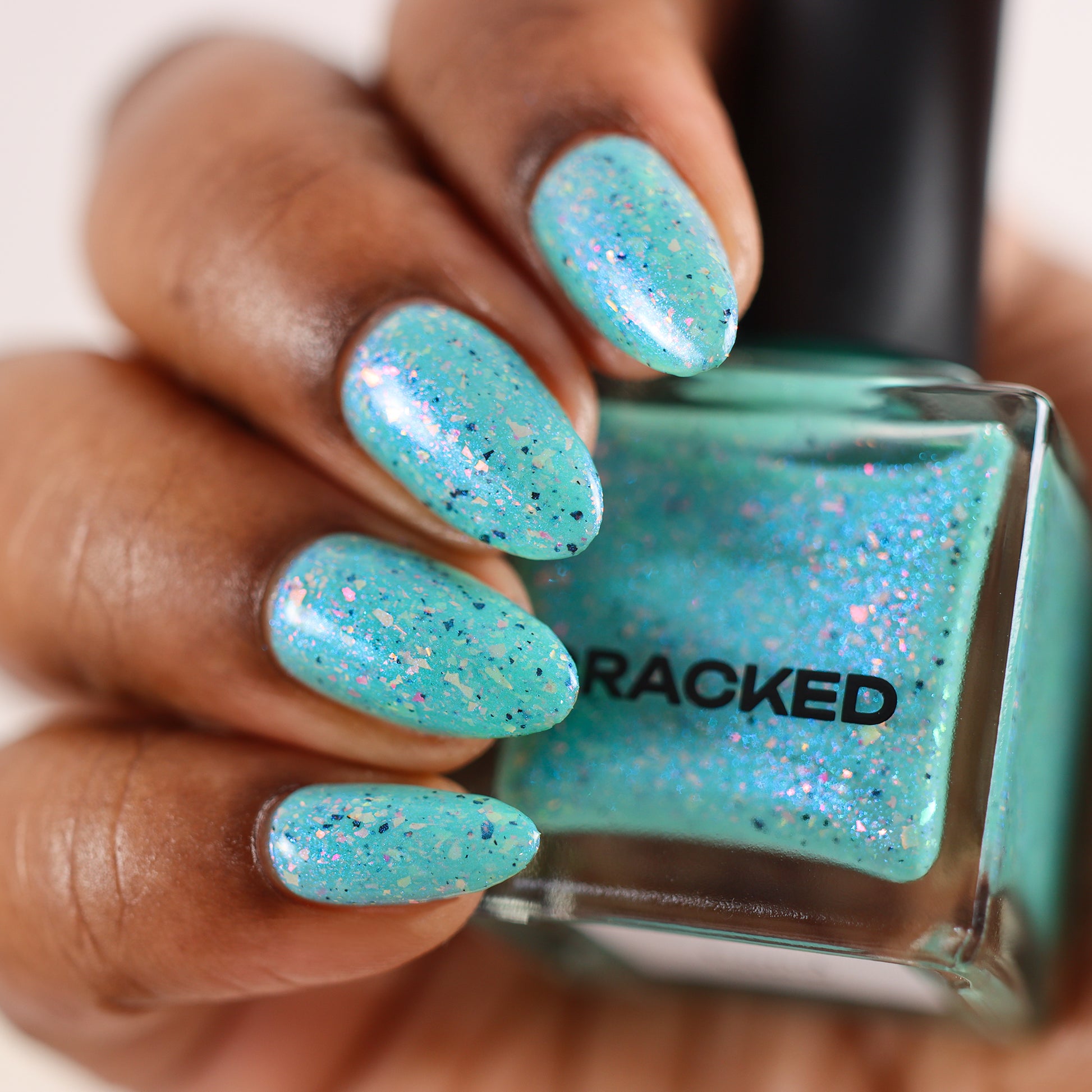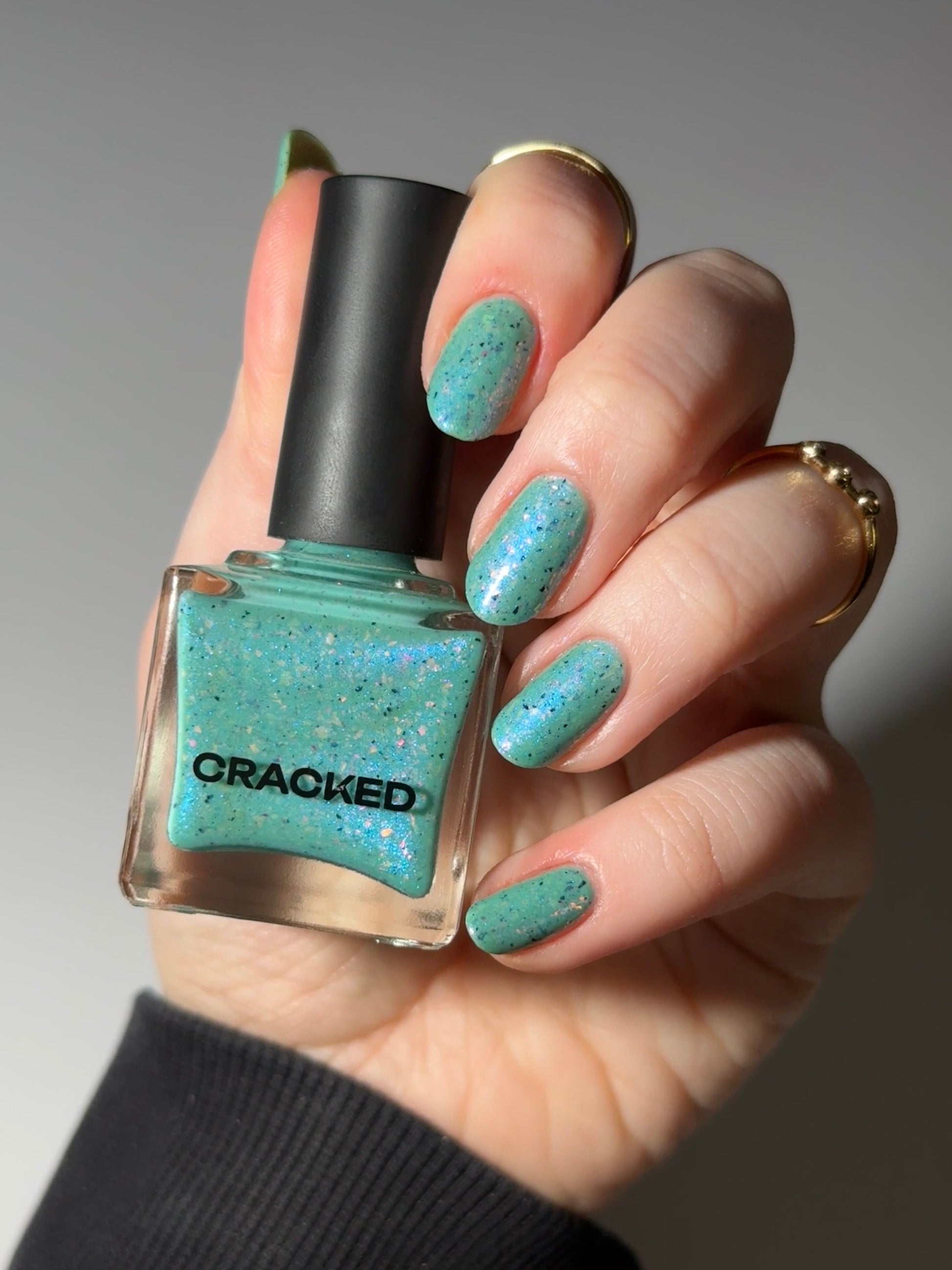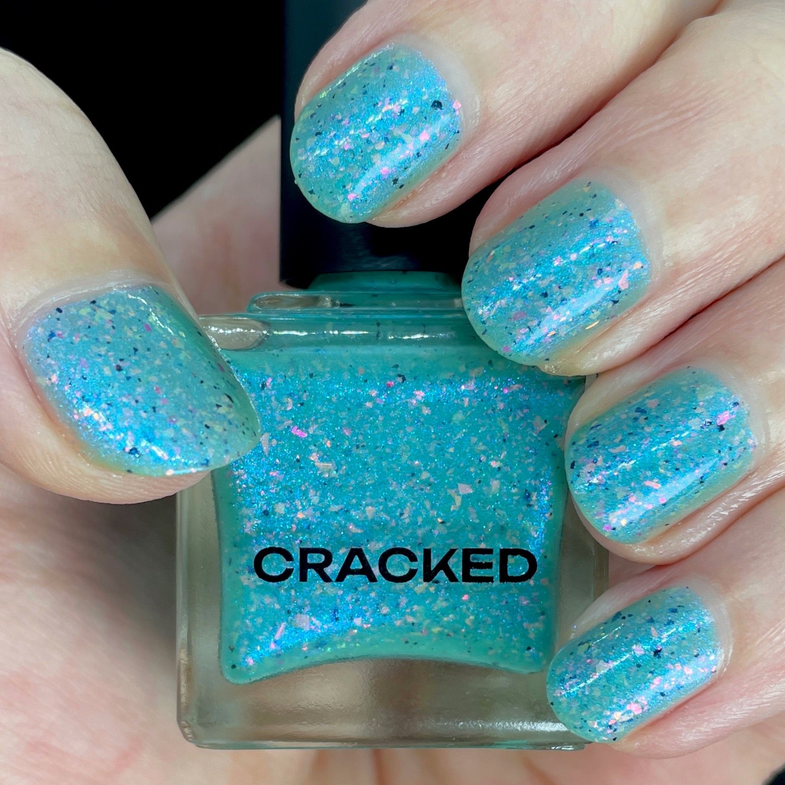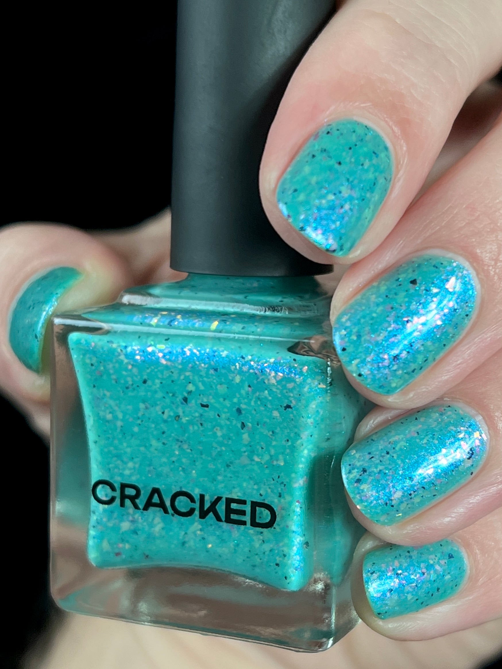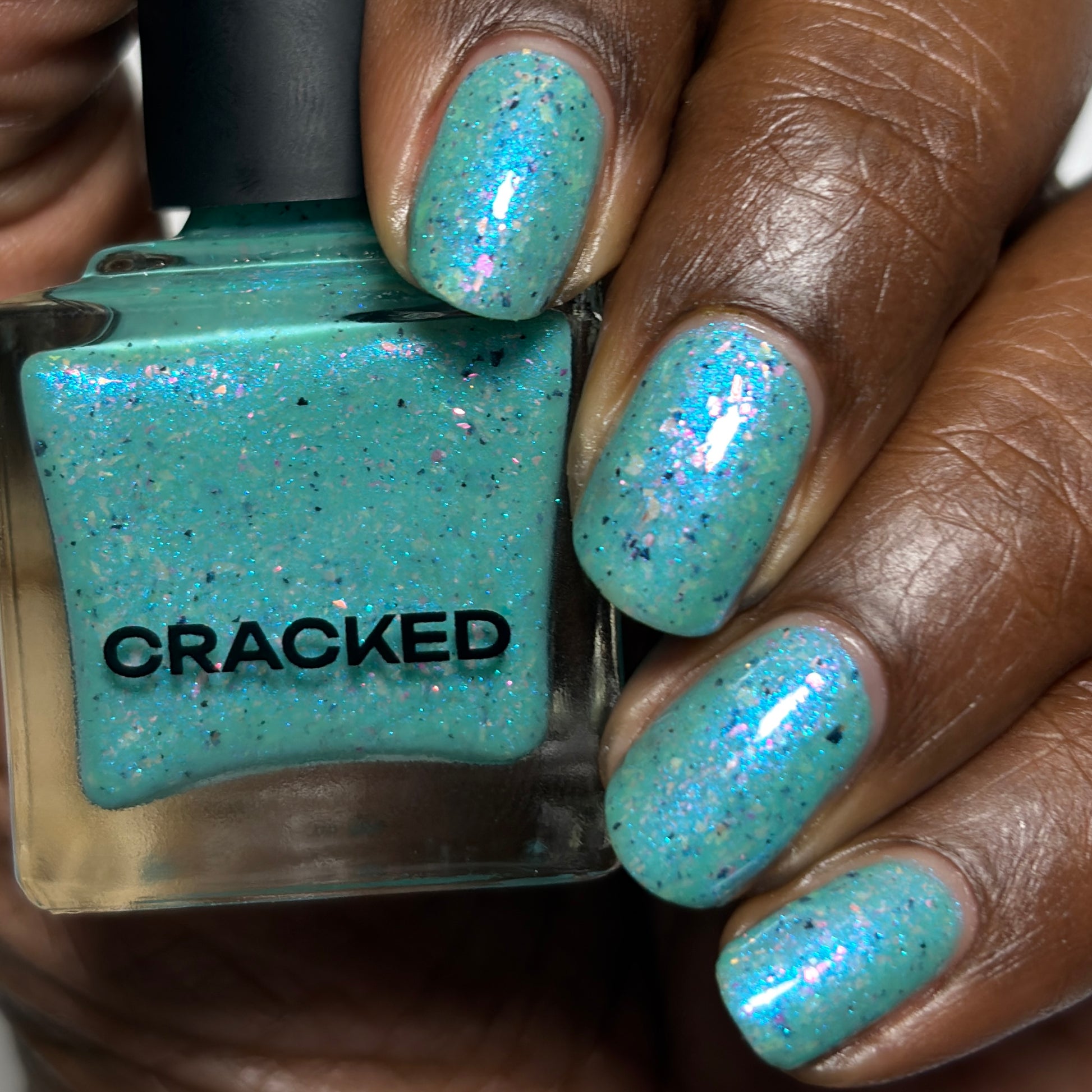 Pond Stew is a lake green with black, iridescent flakes, large pink flakes and packed with blue aurora shimmers. To create this we took inspiration from a color Audrey made by mixing multiple polishes, and it came out perfectly!