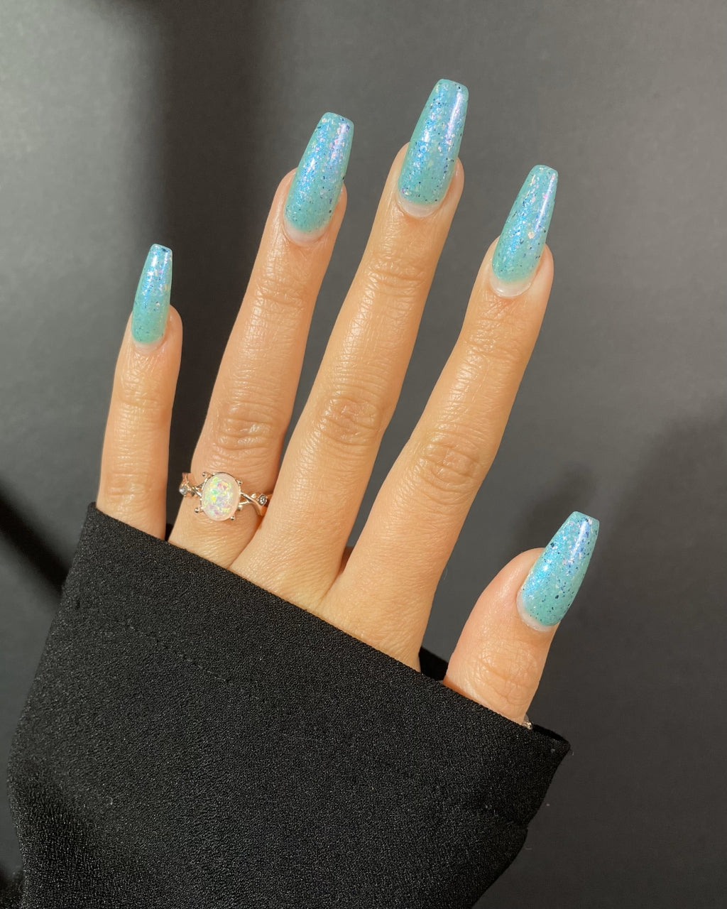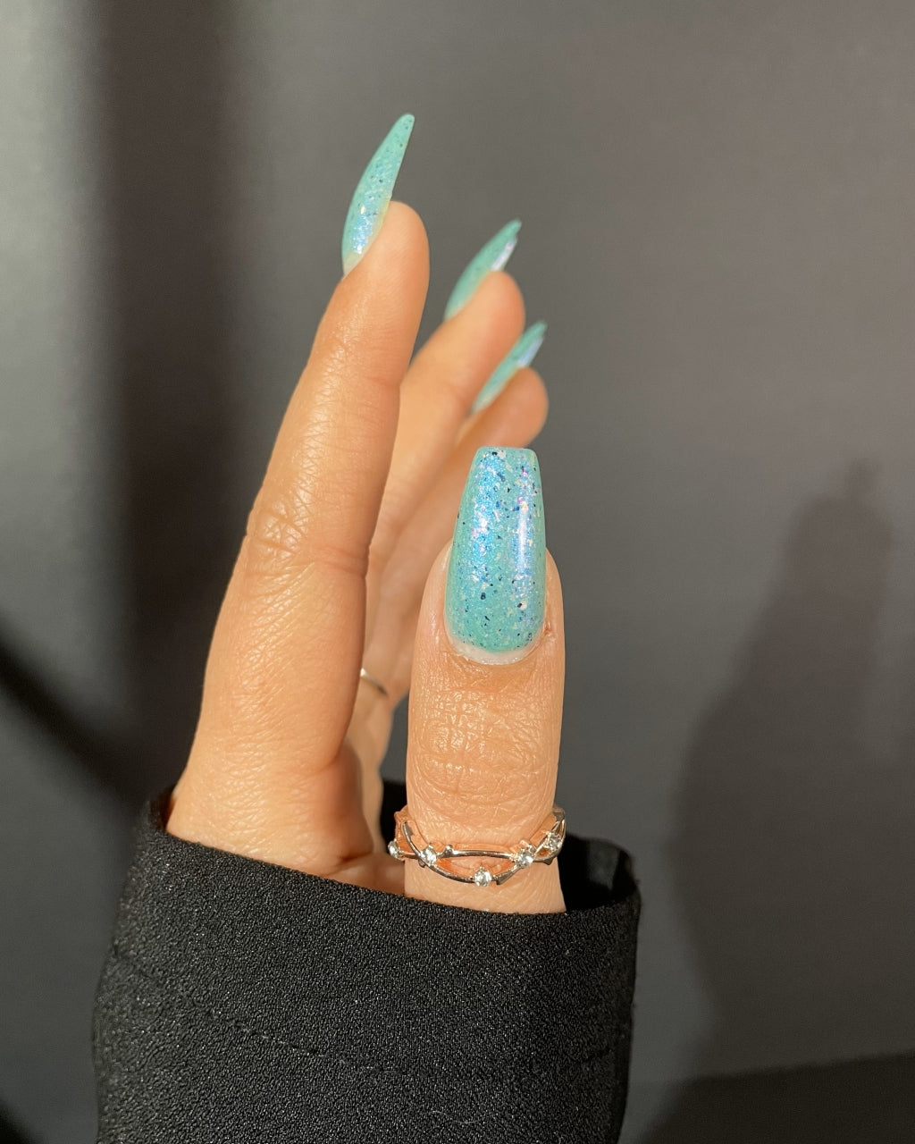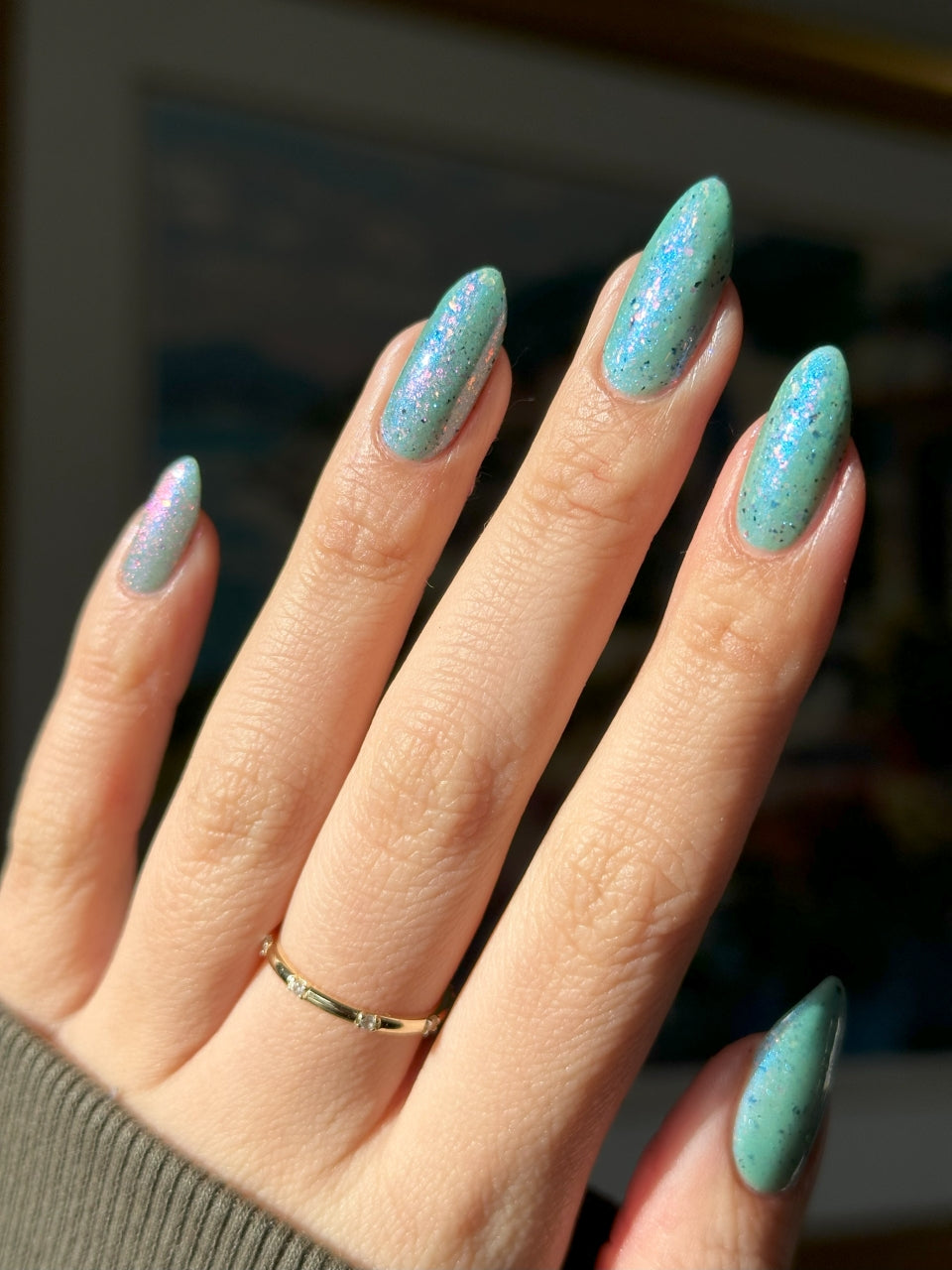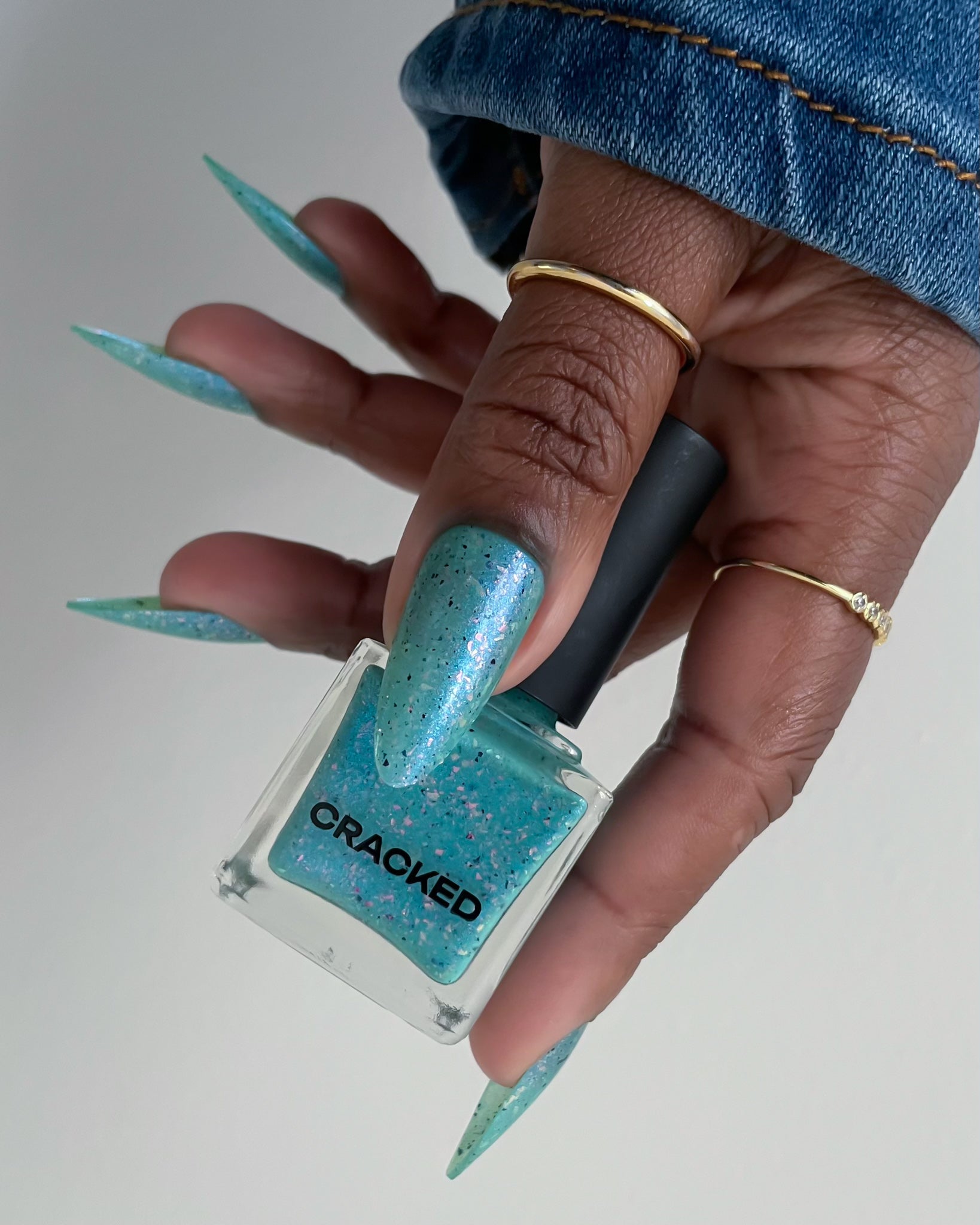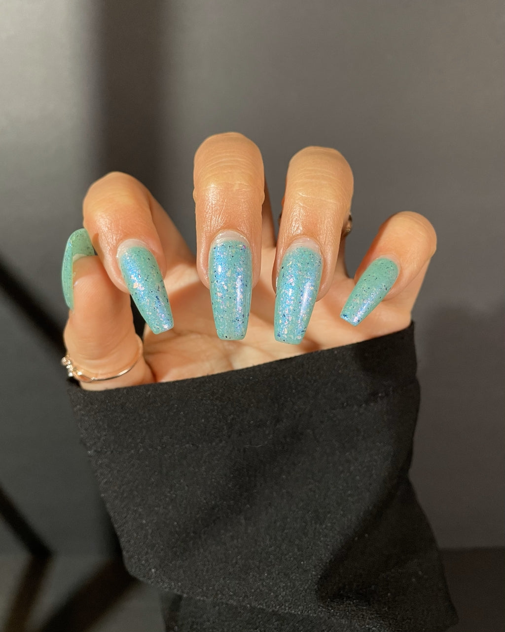 Pond Stew is a lake green with black, iridescent flakes, large pink flakes and packed with blue aurora shimmers. To create this we took inspiration from a color Audrey made by mixing multiple polishes, and it came out perfectly!